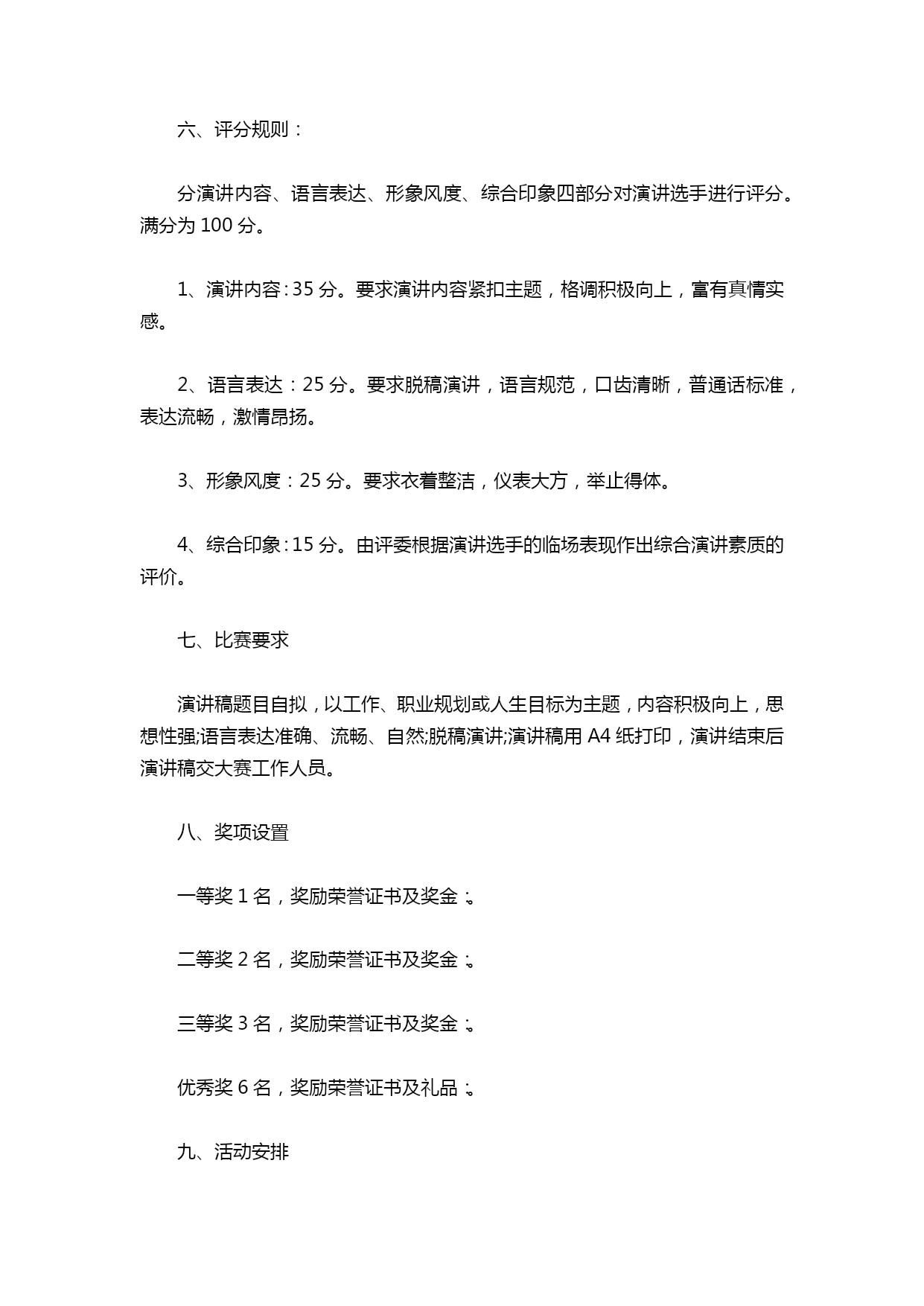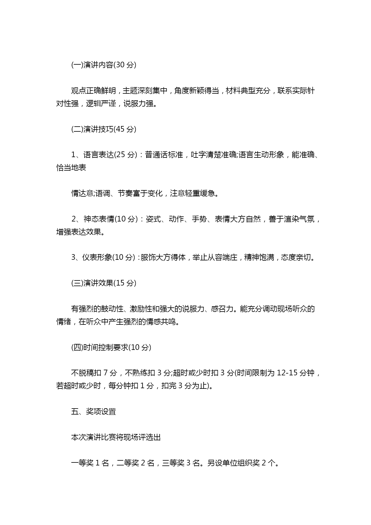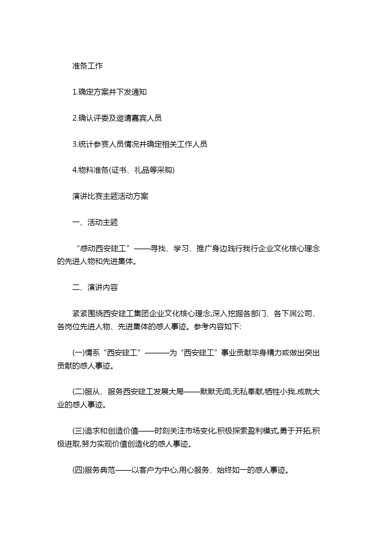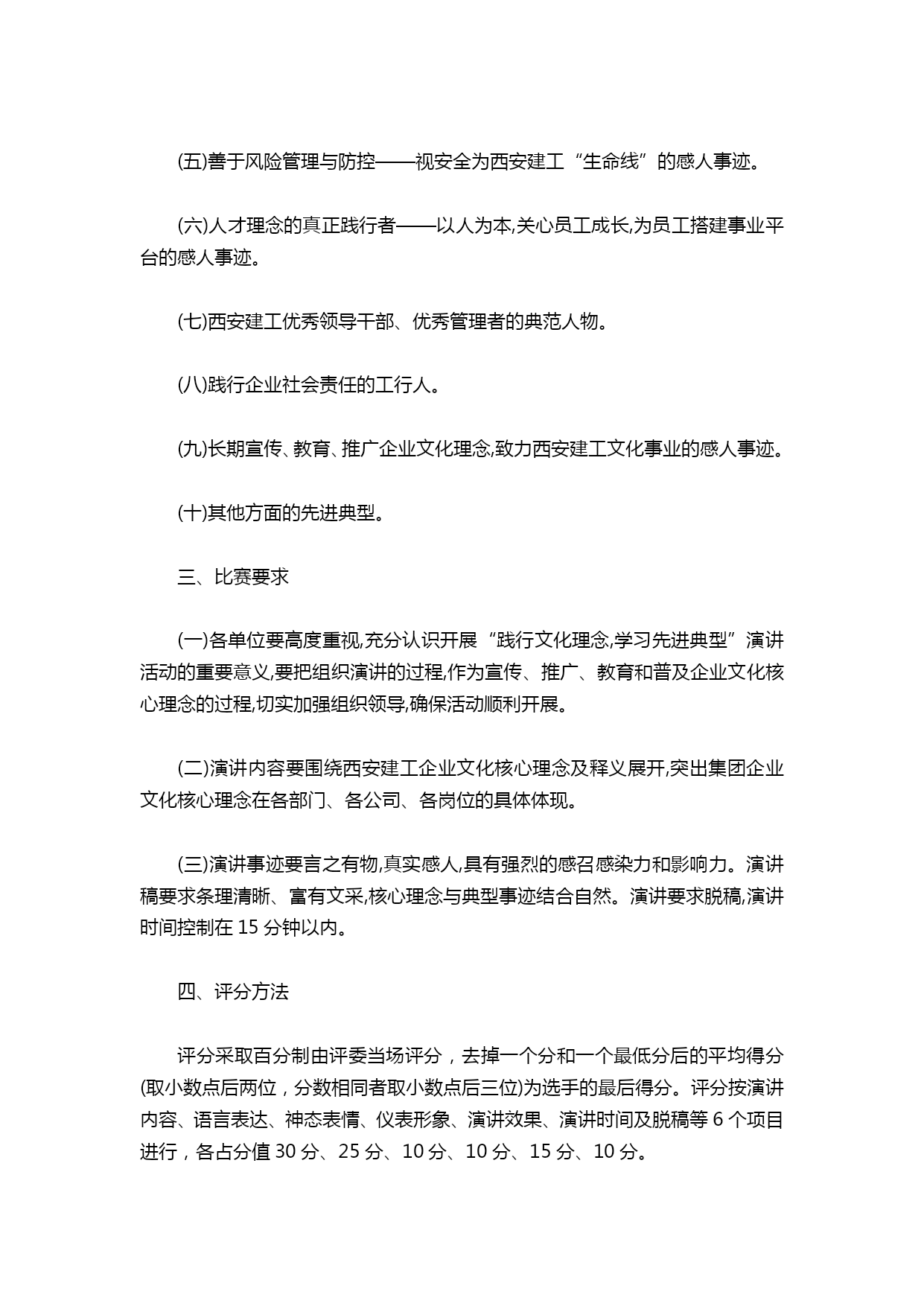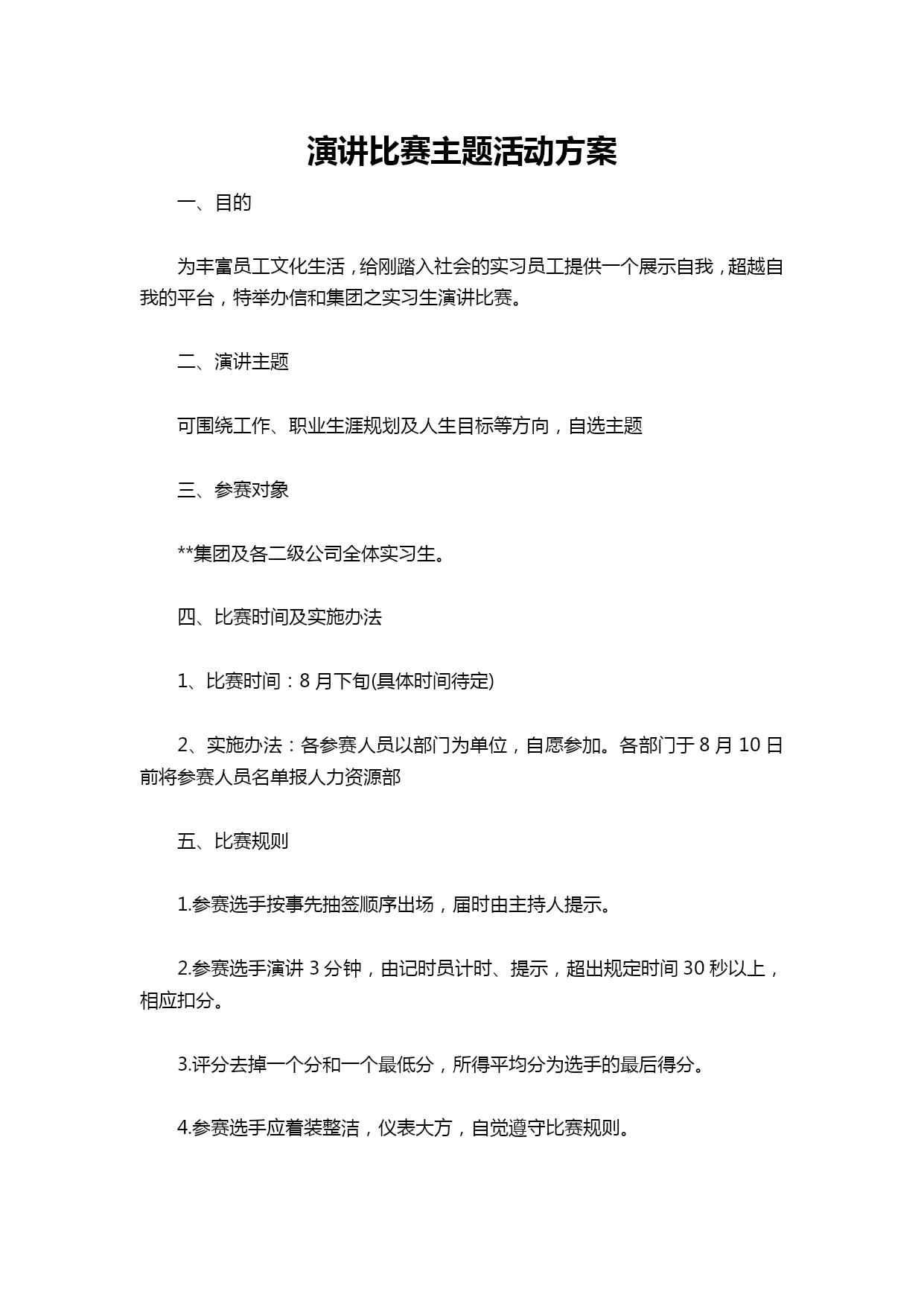 演讲比赛主题活动方案一、目的为丰富员工文化生活,给刚踏入社会的实习员工提供一个展示自我,超越自我的平台,特举办信和集团之实习生演讲比赛。二、演讲主题可围绕工作、职业生涯规划及人生目标等方向,自选主题三、参赛对象**集团及各二级公司全体实习生。四、比赛时间及实施办法1、比赛时间:8月下旬(具体时间待定)2、实施办法:各参赛人员以部门为单位,自愿参加。各部门于8月10日前将参赛人员名单报人力资源部五、比赛规则1.参赛选手按事先抽签顺序出场,届时由主持人提示。2.参赛选手演讲3分钟,由记时员计时、提示,超出规定时间30秒以上,相应扣分。3.评分去掉一个分和一个最低分,所得平均分为选手的最后得分。4.参赛选手应着装整洁,仪表大方,自觉遵守比赛规则。六、评分规则:分演讲内容、语言表达、形象风度、综合印象四部分对演讲选手进行评分。满分为100分。1、演讲内容:35分。要求演讲内容紧扣主题,格调积极向上,富有真情实感。2、语言表达:25分。要求脱稿演讲,语言规范,口齿清晰,普通话标准,表达流畅,激情昂扬。3、形象风度:25分。要求衣着整洁,仪表大方,举止得体。4、综合印象:15分。由评委根据演讲选手的临场表现作出综合演讲素质的评价。七、比赛要求演讲稿题目自拟,以工作、职业规划或人生目标为主题,内容积极向上,思想性强;语言表达准确、流畅、自然;脱稿演讲;演讲稿用A4纸打印,演讲结束后演讲稿交大赛工作人员。八、奖项设置一等奖1名,奖励荣誉证书及奖金:。二等奖2名,奖励荣誉证书及奖金:。三等奖3名,奖励荣誉证书及奖金:。优秀奖6名,奖励荣誉证书及礼品:。九、活动安排准备工作1.确定方案并下发通知2.确认评委及邀请嘉宾人员3.统计参赛人员情况并确定相关工作人员4.物料准备(证书、礼品等采购)演讲比赛主题活动方案一、活动主题“感动西安建工”——寻找、学习、推广身边践行我行企业文化核心理念的先进人物和先进集体。二、演讲内容紧紧围绕西安建工集团企业文化核心理念,深入挖掘各部门、各下属公司、各岗位先进人物、先进集体的感人事迹。参考内容如下:(一)情系“西安建工”———为“西安建工”事业贡献毕身精力或做出突出贡献的感人事迹。(二)服从、服务西安建工发展大局——默默无闻,无私奉献,牺牲小我,成就大业的感人事迹。(三)追求和创造价值——时刻关注市场变化,积极探索盈利模式,勇于开拓,积极进取,努力实现价值创造化的感人事迹。(四)服务典范——以客户为中心,用心服务、始终如一的感人事迹。(五)善于风险管理与防控——视安全为西安建工“生命线”的感人事迹。(六)人才理念的真正践行者——以人为本,关心员工成长,为员工搭建事业平台的感人事迹。(七)西安建工优秀领导干部、优秀管理者的典范人物。(八)践行企业社会责任的工行人。(九)长期宣传、教育、推广企业文化理念,致力西安建工文化事业的感人事迹。(十)其他方面的先进典型。三、比赛要求(一)各单位要高度重视,充分认识开展“践行文化理念,学习先进典型”演讲活动的重要意义,要把组织演讲的过程,作为宣传、推广、教育和普及企业文化核心理念的过程,切实加强组织领导,确保活动顺利开展。(二)演讲内容要围绕西安建工企业文化核心理念及释义展开,突出集团企业文化核心理念在各部门、各公司、各岗位的具体体现。(三)演讲事迹要言之有物,真实感人,具有强烈的感召感染力和影响力。演讲稿要求条理清晰、富有文采,核心理念与典型事迹结合自然。演讲要求脱稿,演讲时间控制在15分钟以内。四、评分方法评分采取百分制由评委当场评分,去掉一个分和一个最低分后的平均得分(取小数点后两位,分数相同者取小数点后三位)为选手的最后得分。评分按演讲内容、语言表达、神态表情、仪表形象、演讲效果、演讲时间及脱稿等6个项目进行,各占分值30分、25分、10分、10分、15分、10分。(一)演讲内容(30分)观点正确鲜明,主题深刻集中,角度新颖得当,材料典型充分,联系实际针对性强,逻辑严谨,说服力强。(二)演讲技巧(45分)1、语言表达(25分):普通话标准,吐字清楚准确;语言生动形象,能准确、恰当地表情达意;语调、节奏富于变化,注意轻重缓急。2、神态表情(10分):姿式、动作、手势、表情大方自然,善于渲染气氛,增强表达效果。3、仪表形象(10分):服饰大方得体,举止从容端庄,精神饱满,态度亲切。(三)演讲效果(15分)有强烈的鼓动性、激励性和强大的说服力、感召力。能充分调动现场听众的情绪,在听众中产生强烈的情感共鸣。(四)时间控制要求(10分)不脱稿扣7分,不熟练扣3分;超时或少时扣3分(时间限制为12-15分钟,若超时或少时,每分钟扣1分,扣完3分为止)。五、奖项设置本次演讲比赛将现场评选出一等奖1名,二等奖2名,三等奖3名。另设单位组织奖2个。六、组织领导为确保活动有序进行,成立演讲比