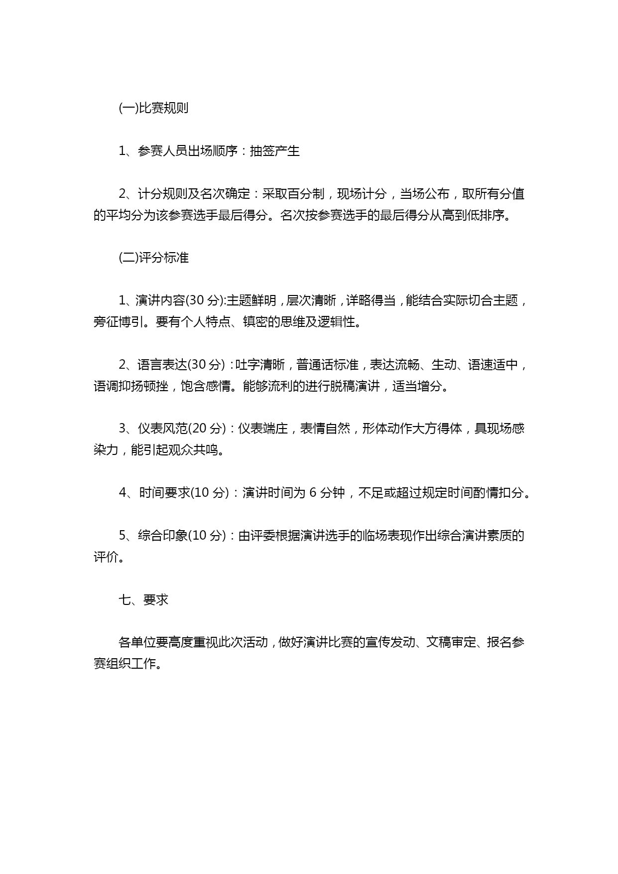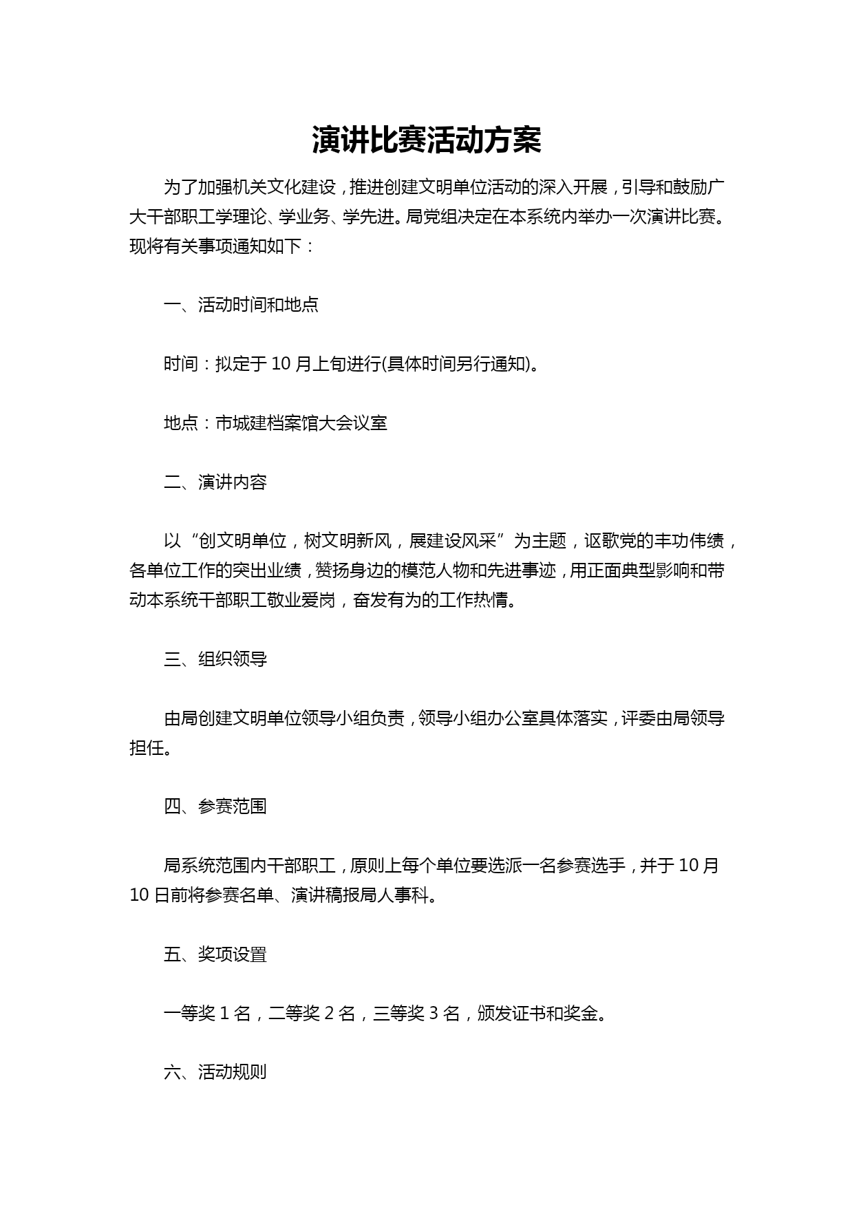 演讲比赛活动方案为了加强机关文化建设,推进创建文明单位活动的深入开展,引导和鼓励广大干部职工学理论、学业务、学先进。局党组决定在本系统内举办一次演讲比赛。现将有关事项通知如下:一、活动时间和地点时间:拟定于10月上旬进行(具体时间另行通知)。地点:市城建档案馆大会议室二、演讲内容以“创文明单位,树文明新风,展建设风采”为主题,讴歌党的丰功伟绩,各单位工作的突出业绩,赞扬身边的模范人物和先进事迹,用正面典型影响和带动本系统干部职工敬业爱岗,奋发有为的工作热情。三、组织领导由局创建文明单位领导小组负责,领导小组办公室具体落实,评委由局领导担任。四、参赛范围局系统范围内干部职工,原则上每个单位要选派一名参赛选手,并于10月10日前将参赛名单、演讲稿报局人事科。五、奖项设置一等奖1名,二等奖2名,三等奖3名,颁发证书和奖金。六、活动规则(一)比赛规则1、参赛人员出场顺序:抽签产生2、计分规则及名次确定:采取百分制,现场计分,当场公布,取所有分值的平均分为该参赛选手最后得分。名次按参赛选手的最后得分从高到低排序。(二)评分标准1、演讲内容(30分):主题鲜明,层次清晰,详略得当,能结合实际切合主题,旁征博引。要有个人特点、镇密的思维及逻辑性。2、语言表达(30分):吐字清晰,普通话标准,表达流畅、生动、语速适中,语调抑扬顿挫,饱含感情。能够流利的进行脱稿演讲,适当增分。3、仪表风范(20分):仪表端庄,表情自然,形体动作大方得体,具现场感染力,能引起观众共鸣。4、时间要求(10分):演讲时间为6分钟,不足或超过规定时间酌情扣分。5、综合印象(10分):由评委根据演讲选手的临场表现作出综合演讲素质的评价。七、要求各单位要高度重视此次活动,做好演讲比赛的宣传发动、文稿审定、报名参赛组织工作。