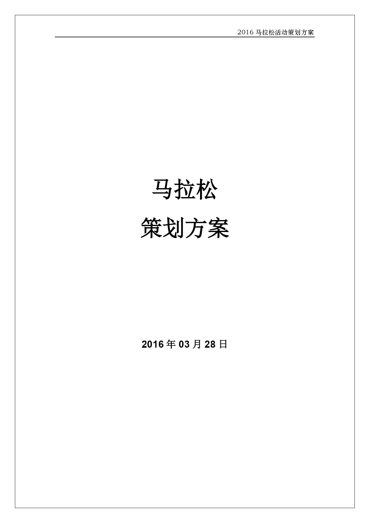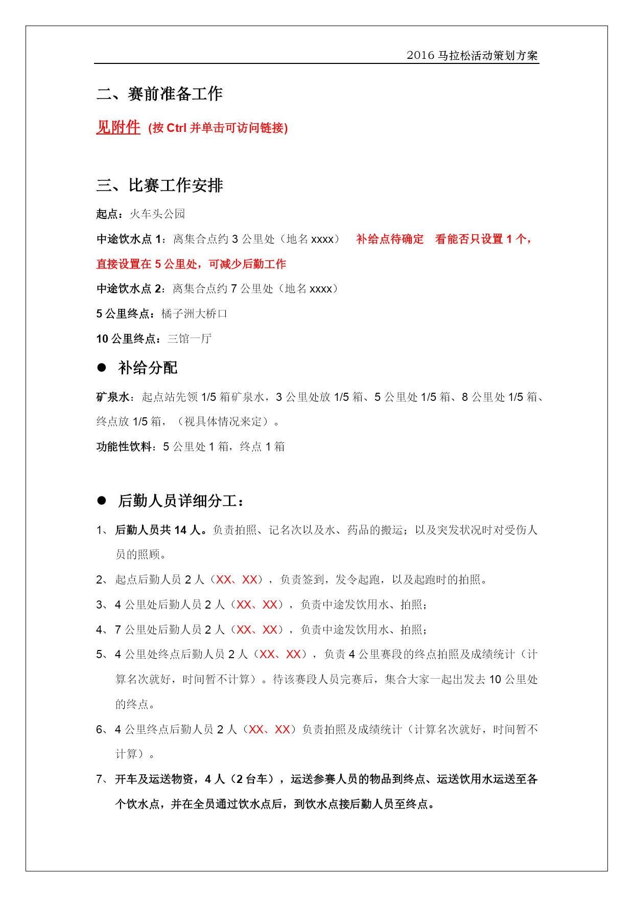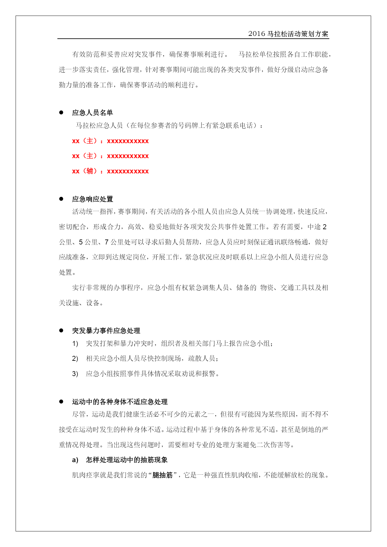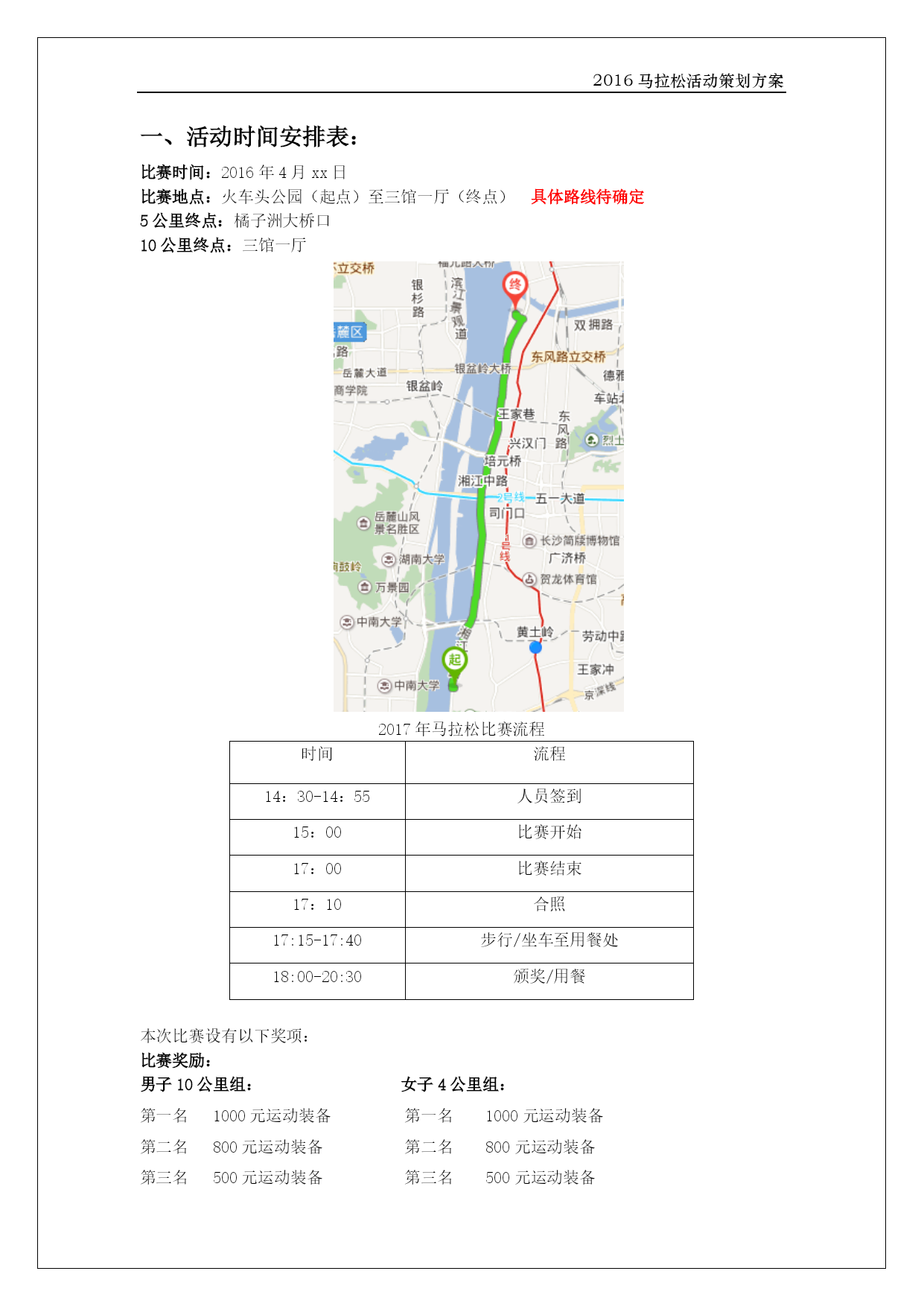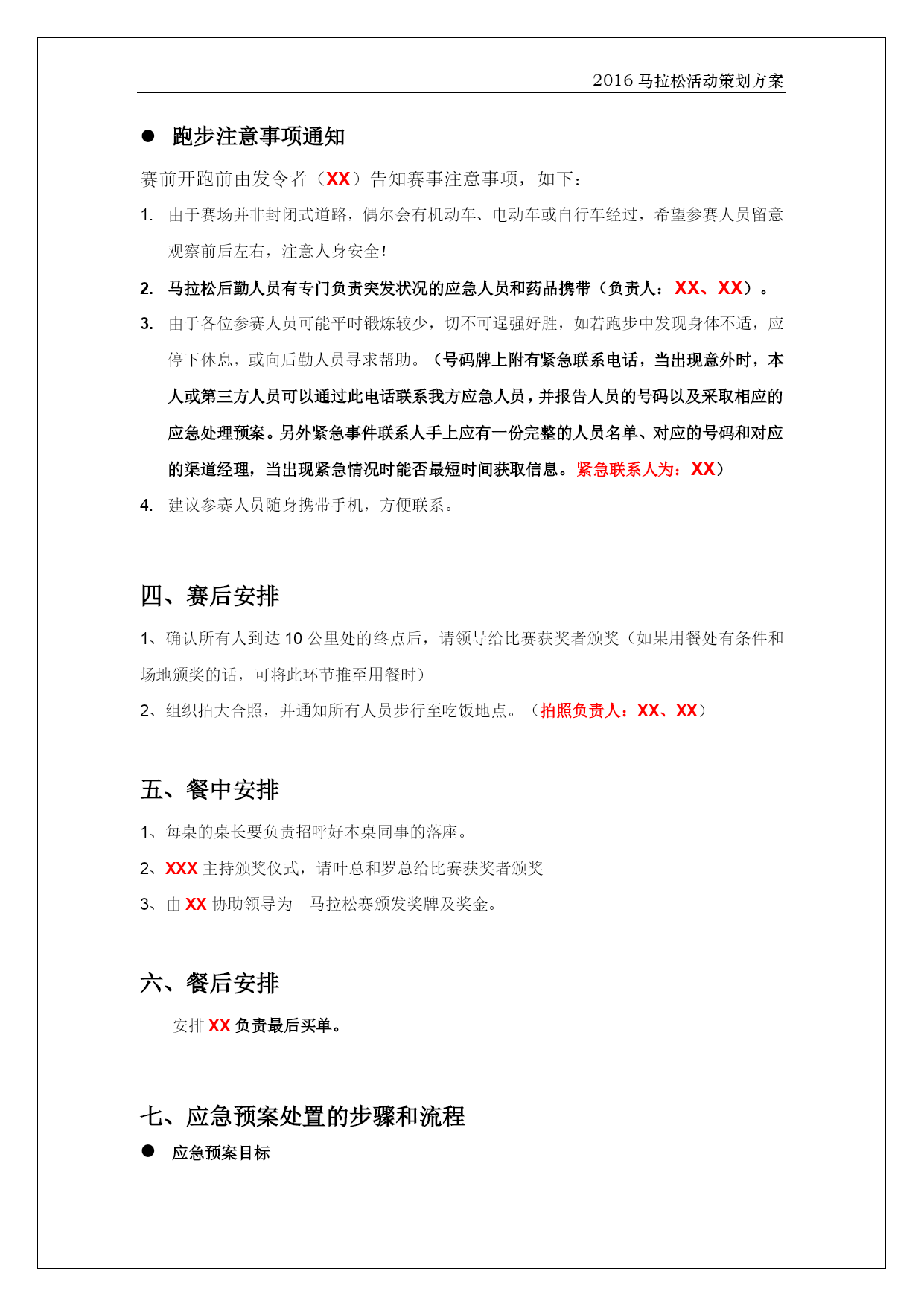 2016马拉松活动策划方案马拉松策划方案2016年03月28日一、活动时间安排表:比赛时间:2016年4月xx日比赛地点:火车头公园(起点)至三馆一厅(终点)具体路线待确定5公里终点:橘子洲大桥口10公里终点:三馆一厅2017年马拉松比赛流程时间流程14:30-14:55人员签到15:00比赛开始17:00比赛结束17:10合照17:15-17:40步行/坐车至用餐处18:00-20:30颁奖/用餐本次比赛设有以下奖项:比赛奖励:男子10公里组:女子4公里组:第一名1000元运动装备第一名1000元运动装备第二名800元运动装备第二名800元运动装备第三名500元运动装备第三名500元运动装备二、赛前准备工作HYPERLINK"盈高马拉松前期准备及相关预算.xlsx"见附件(按Ctrl并单击可访问链接)三、比赛工作安排起点:火车头公园中途饮水点1:离集合点约3公里处(地名xxxx)补给点待确定看能否只设置1个,直接设置在5公里处,可减少后勤工作中途饮水点2:离集合点约7公里处(地名xxxx)5公里终点:橘子洲大桥口10公里终点:三馆一厅补给分配矿泉水:起点站先领1/5箱矿泉水,3公里处放1/5箱、5公里处1/5箱、8公里处1/5箱、终点放1/5箱,(视具体情况来定)。功能性饮料:5公里处1箱,终点1箱后勤人员详细分工:后勤人员共14人。负责拍照、记名次以及水、药品的搬运;以及突发状况时对受伤人员的照顾。起点后勤人员2人(XX、XX),负责签到,发令起跑,以及起跑时的拍照。4公里处后勤人员2人(XX、XX),负责中途发饮用水、拍照;7公里处后勤人员2人(XX、XX),负责中途发饮用水、拍照;4公里处终点后勤人员2人(XX、XX),负责4公里赛段的终点拍照及成绩统计(计算名次就好,时间暂不计算)。待该赛段人员完赛后,集合大家一起出发去10公里处的终点。4公里终点后勤人员2人(XX、XX)负责拍照及成绩统计(计算名次就好,时间暂不计算)。开车及运送物资,4人(2台车),运送参赛人员的物品到终点、运送饮用水运送至各个饮水点,并在全员通过饮水点后,到饮水点接后勤人员至终点。跑步注意事项通知赛前开跑前由发令者(XX)告知赛事注意事项,如下:由于赛场并非封闭式道路,偶尔会有机动车、电动车或自行车经过,希望参赛人员留意观察前后左右,注意人身安全!马拉松后勤人员有专门负责突发状况的应急人员和药品携带(负责人:XX、XX)。由于各位参赛人员可能平时锻炼较少,切不可逞强好胜,如若跑步中发现身体不适,应停下休息,或向后勤人员寻求帮助。(号码牌上附有紧急联系电话,当出现意外时,本人或第三方人员可以通过此电话联系我方应急人员,并报告人员的号码以及采取相应的应急处理预案。另外紧急事件联系人手上应有一份完整的人员名单、对应的号码和对应的渠道经理,当出现紧急情况时能否最短时间获取信息。紧急联系人为:XX)建议参赛人员随身携带手机,方便联系。四、赛后安排1、确认所有人到达10公里处的终点后,请领导给比赛获奖者颁奖(如果用餐处有条件和场地颁奖的话,可将此环节推至用餐时)2、组织拍大合照,并通知所有人员步行至吃饭地点。(拍照负责人:XX、XX)五、餐中安排1、每桌的桌长要负责招呼好本桌同事的落座。2、XXX主持颁奖仪式,请叶总和罗总给比赛获奖者颁奖3、由XX协助领导为马拉松赛颁发奖牌及奖金。六、餐后安排安排XX负责最后买单。七、应急预案处置的步骤和流程应急预案目标有效防范和妥善应对突发事件,确保赛事顺利进行。马拉松单位按照各自工作职能,进一步落实责任,强化管理,针对赛事期间可能出现的各类突发事件,做好分级启动应急备勤力量的准备工作,确保赛事活动的顺利进行。应急人员名单马拉松应急人员(在每位参赛者的号码牌上有紧急联系电话):xx(主):xxxxxxxxxxxxx(主):xxxxxxxxxxxxx(辅):xxxxxxxxxxx应急响应处置活动统一指挥,赛事期间,有关活动的各小组人员由应急人员统一协调处理,快速反应,密切配合,形成合力,高效、稳妥地做好各项突发公共事件处置工作。若有需要,中途2公里、5公里、7公里处可以寻求后勤人员帮助,应急人员应时刻保证通讯联络畅通,做好应战准备,立即到达规定岗位,开展工作,紧急状况应及时联系以上应急小组人员进行应急处置。实行非常规的办事程序,应急小组有权紧急调集人员、储备的物资、交通工具以及相关设施、设备。突发暴力事件应急处理突发打架和暴力冲突时,组织者及相关部门马上报告应急小组;相关应急小组人员尽快控制现场,疏散人员;应急小组按照事件具体情况采取劝说和报警。运动中的各种身体不适应急处理尽管,运动是我们健康生活必不可少的元素之一,但很有可能因为某些原因,而不得不接受在运动时发生的种种身体不适。运动过程中基于身体的各种常见不适,甚至