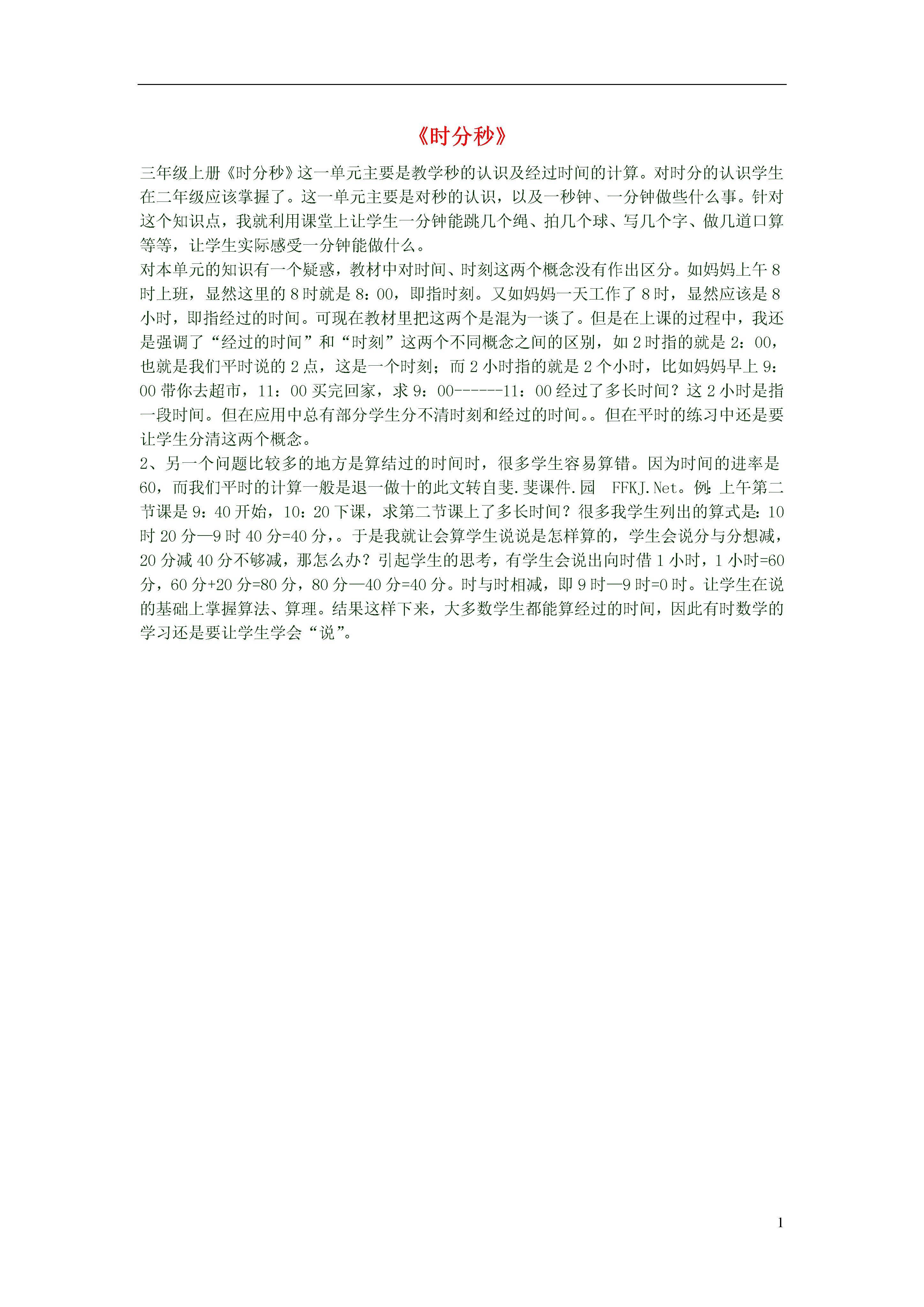 1《时分秒》三年级上册《时分秒》这一单元主要是教学秒的认识及经过时间的计算。对时分的认识学生在二年级应该掌握了。这一单元主要是对秒的认识,以及一秒钟、一分钟做些什么事。针对这个知识点,我就利用课堂上让学生一分钟能跳几个绳、拍几个球、写几个字、做几道口算等等,让学生实际感受一分钟能做什么。对本单元的知识有一个疑惑,教材中对时间、时刻这两个概念没有作出区分。如妈妈上午8时上班,显然这里的8时就是8:00,即指时刻。又如妈妈一天工作了8时,显然应该是8小时,即指经过的时间。可现在教材里把这两个是混为一谈了。但是在上课的过程中,我还是强调了“经过的时间”和“时刻”这两个不同概念之间的区别,如2时指的就是2:00,也就是我们平时说的2点,这是一个时刻;而2小时指的就是2个小时,比如妈妈早上9:00带你去超市,11:00买完回家,求9:00------11:00经过了多长时间?这2小时是指一段时间。但在应用中总有部分学生分不清时刻和经过的时间。。但在平时的练习中还是要让学生分清这两个概念。2、另一个问题比较多的地方是算结过的时间时,很多学生容易算错。因为时间的进率是60,而我们平时的计算一般是退一做十的此文转自斐.斐课件.园FFKJ.Net。例:上午第二节课是9:40开始,10:20下课,求第二节课上了多长时间?很多我学生列出的算式是:10时20分—9时40分=40分,。于是我就让会算学生说说是怎样算的,学生会说分与分想减,20分减40分不够减,那怎么办?引起学生的思考,有学生会说出向时借1小时,1小时=60分,60分+20分=80分,80分—40分=40分。时与时相减,即9时—9时=0时。让学生在说的基础上掌握算法、算理。结果这样下来,大多数学生都能算经过的时间,因此有时数学的学习还是要让学生学会“说”。