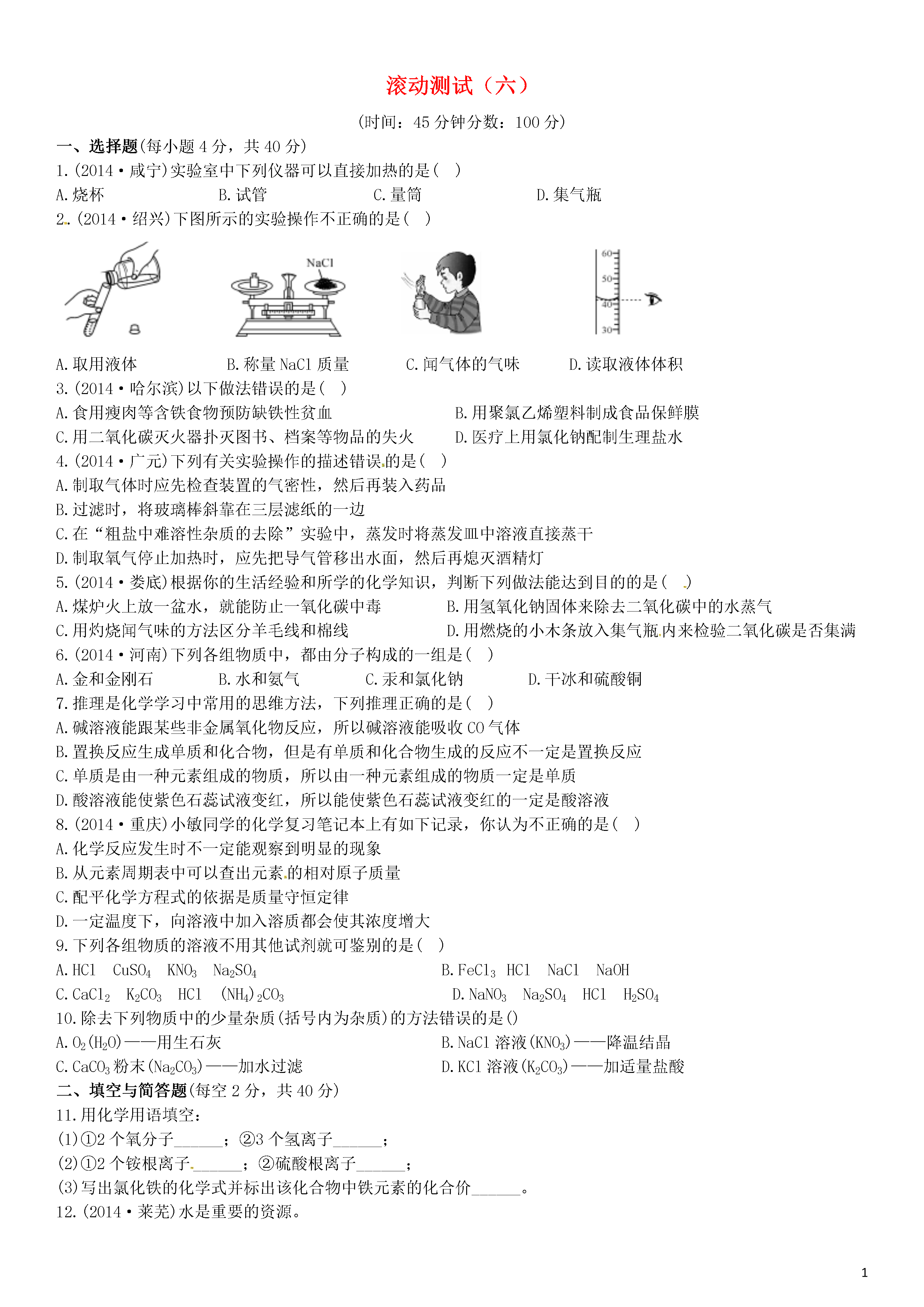 【火线100天】2015中考化学 滚动测试(六)综合测试.doc