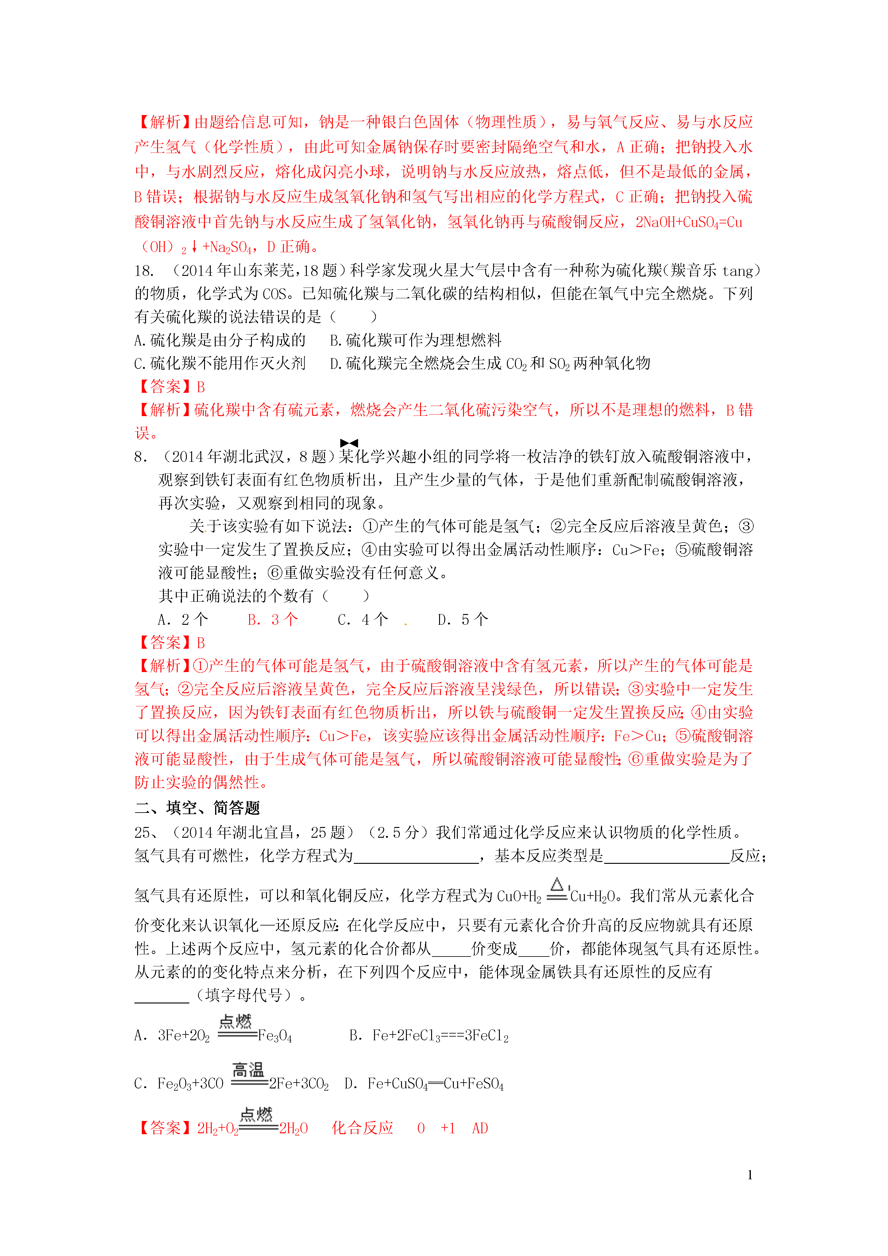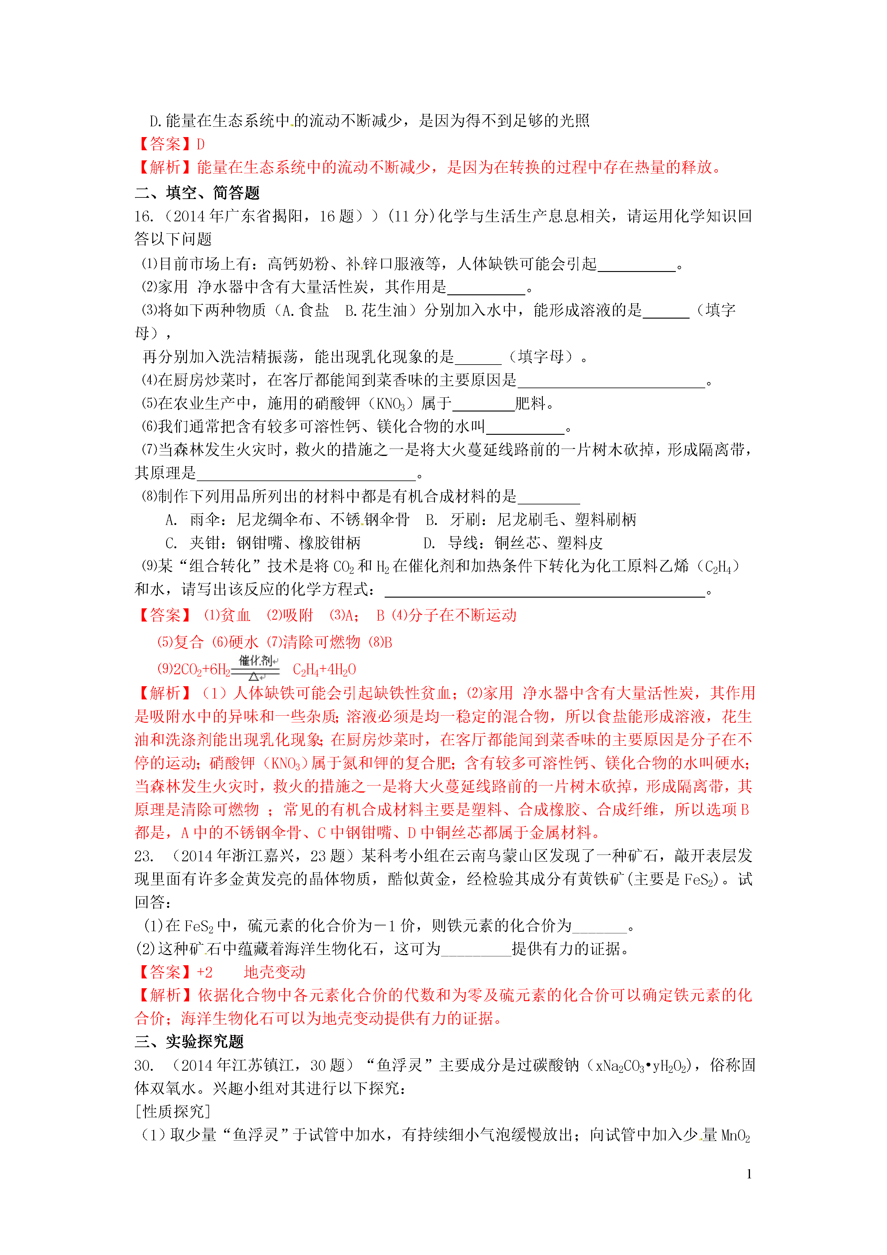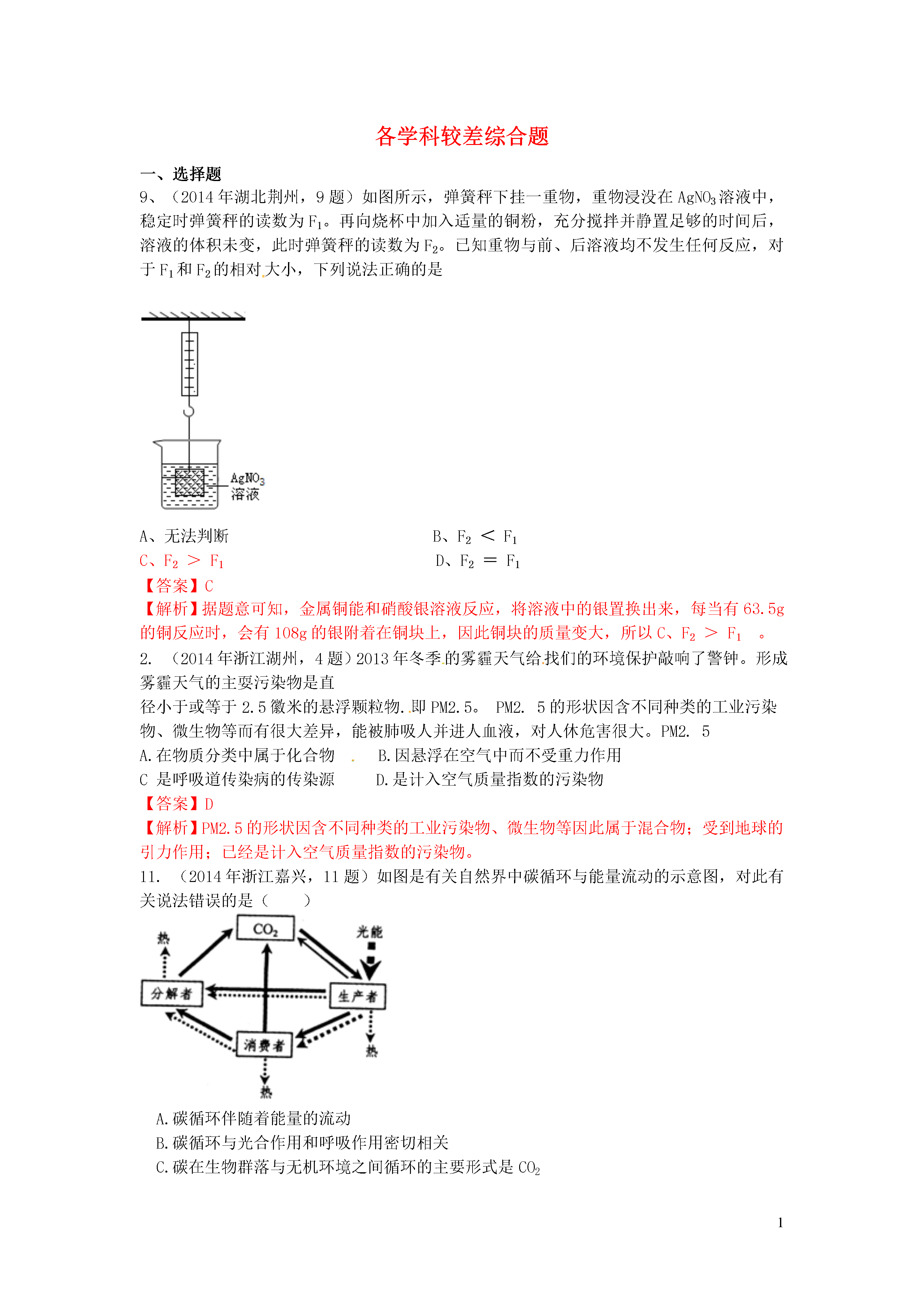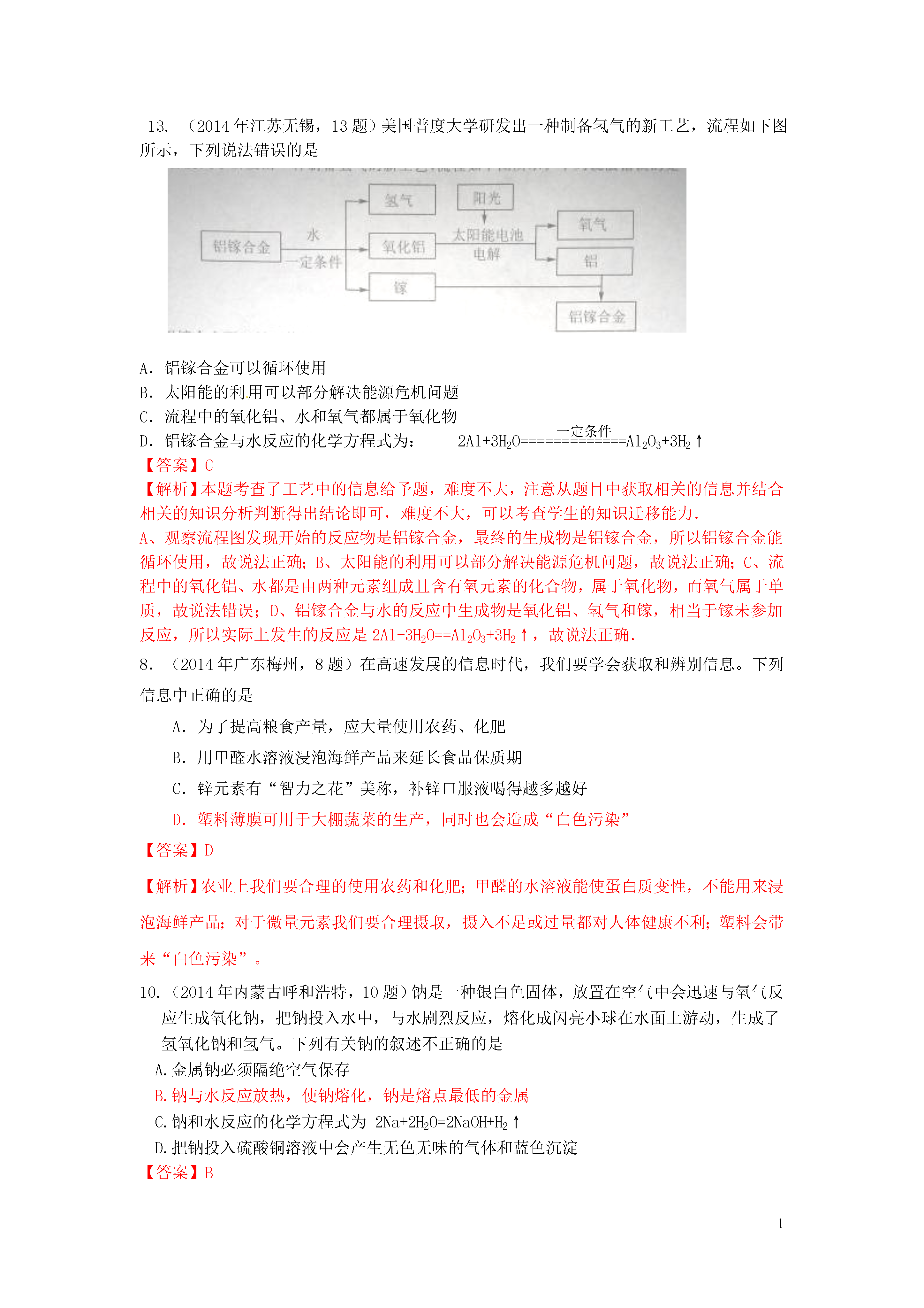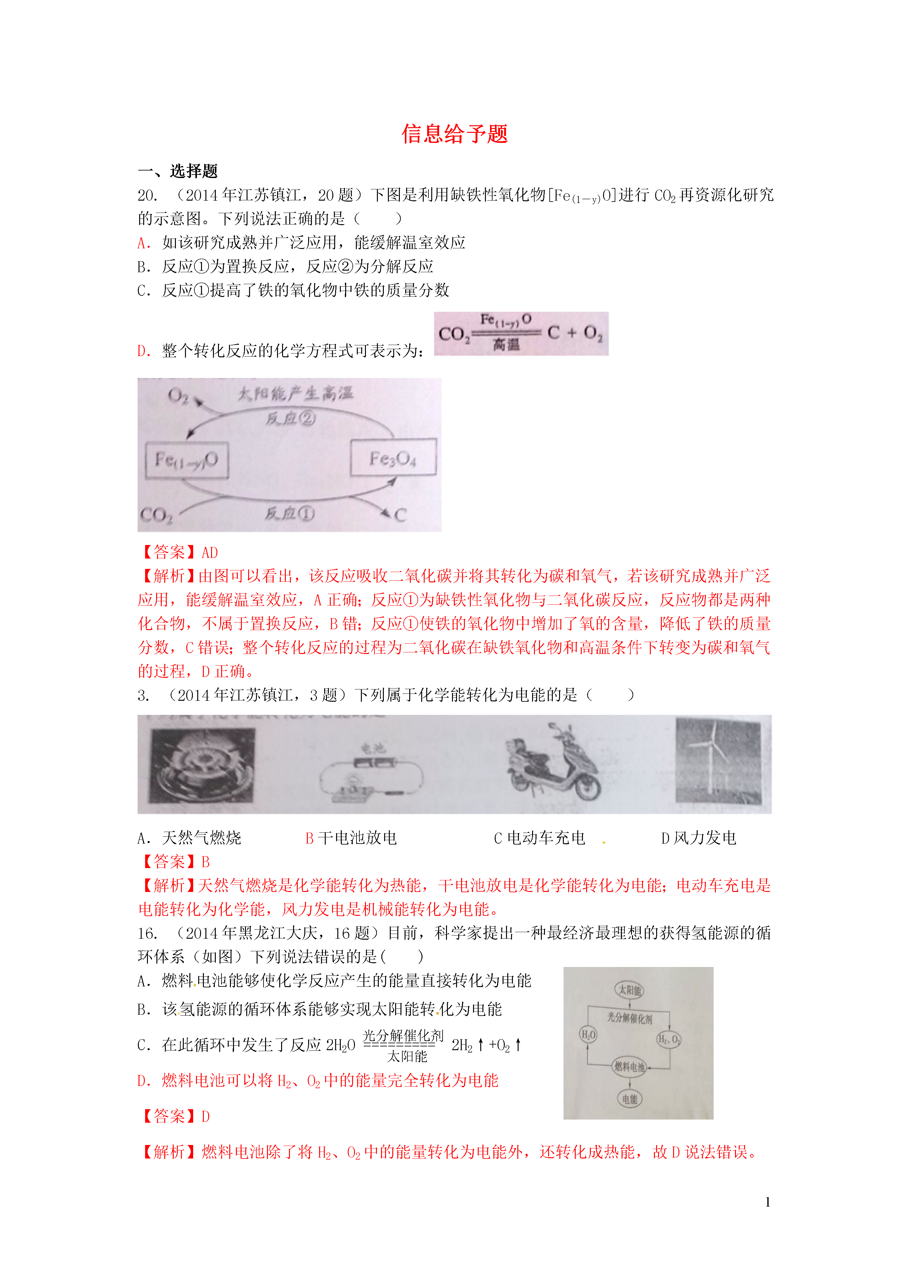1信息给予题一、选择题20.(2014年江苏镇江,20题)下图是利用缺铁性氧化物[Fe(1-y)O]进行CO2再资源化研究的示意图。下列说法正确的是()A.如该研究成熟并广泛应用,能缓解温室效应B.反应①为置换反应,反应②为分解反应C.反应①提高了铁的氧化物中铁的质量分数D.整个转化反应的化学方程式可表示为:【答案】AD【解析】由图可以看出,该反应吸收二氧化碳并将其转化为碳和氧气,若该研究成熟并广泛应用,能缓解温室效应,A正确;反应①为缺铁性氧化物与二氧化碳反应,反应物都是两种化合物,不属于置换反应,B错;反应①使铁的氧化物中增加了氧的含量,降低了铁的质量分数,C错误;整个转化反应的过程为二氧化碳在缺铁氧化物和高温条件下转变为碳和氧气的过程,D正确。3.(2014年江苏镇江,3题)下列属于化学能转化为电能的是()A.天然气燃烧B干电池放电C电动车充电D风力发电【答案】B【解析】天然气燃烧是化学能转化为热能,干电池放电是化学能转化为电能;电动车充电是电能转化为化学能,风力发电是机械能转化为电能。16.(2014年黑龙江大庆,16题)目前,科学家提出一种最经济最理想的获得氢能源的循环体系(如图)下列说法错误的是()A.燃料电池能够使化学反应产生的能量直接转化为电能光分解催化剂B.该氢能源的循环体系能够实现太阳能转化为电能太阳能C.在此循环中发生了反应2H2O=========2H2↑+O2↑D.燃料电池可以将H2、O2中的能量完全转化为电能【答案】D【解析】燃料电池除了将H2、O2中的能量转化为电能外,还转化成热能,故D说法错误。13.(2014年江苏无锡,13题)美国普度大学研发出一种制备氢气的新工艺,流程如下图所示,下列说法错误的是A.铝镓合金可以循环使用B.太阳能的利用可以部分解决能源危机问题一定条件C.流程中的氧化铝、水和氧气都属于氧化物D.铝镓合金与水反应的化学方程式为:2Al+3H2O=============Al2O3+3H2↑【答案】C【解析】本题考查了工艺中的信息给予题,难度不大,注意从题目中获取相关的信息并结合相关的知识分析判断得出结论即可,难度不大,可以考查学生的知识迁移能力.A、观察流程图发现开始的反应物是铝镓合金,最终的生成物是铝镓合金,所以铝镓合金能循环使用,故说法正确;B、太阳能的利用可以部分解决能源危机问题,故说法正确;C、流程中的氧化铝、水都是由两种元素组成且含有氧元素的化合物,属于氧化物,而氧气属于单质,故说法错误;D、铝镓合金与水的反应中生成物是氧化铝、氢气和镓,相当于镓未参加反应,所以实际上发生的反应是2Al+3H2O==Al2O3+3H2↑,故说法正确.8.(2014年广东梅州,8题)在高速发展的信息时代,我们要学会获取和辨别信息。下列信息中正确的是A.为了提高粮食产量,应大量使用农药、化肥B.用甲醛水溶液浸泡海鲜产品来延长食品保质期C.锌元素有“智力之花”美称,补锌口服液喝得越多越好D.塑料薄膜可用于大棚蔬菜的生产,同时也会造成“白色污染”【答案】D【解析】农业上我们要合理的使用农药和化肥;甲醛的水溶液能使蛋白质变性,不能用来浸泡海鲜产品;对于微量元素我们要合理摄取,摄入不足或过量都对人体健康不利;塑料会带来“白色污染”。10.(2014年内蒙古呼和浩特,10题)钠是一种银白色固体,放置在空气中会迅速与氧气反应生成氧化钠,把钠投入水中,与水剧烈反应,熔化成闪亮小球在水面上游动,生成了氢氧化钠和氢气。下列有关钠的叙述不正确的是A.金属钠必须隔绝空气保存B.钠与水反应放热,使钠熔化,钠是熔点最低的金属C.钠和水反应的化学方程式为2Na+2H2O=2NaOH+H2↑D.把钠投入硫酸铜溶液中会产生无色无味的气体和蓝色沉淀【答案】B【解析】由题给信息可知,钠是一种银白色固体(物理性质),易与氧气反应、易与水反应产生氢气(化学性质),由此可知金属钠保存时要密封隔绝空气和水,A正确;把钠投入水中,与水剧烈反应,熔化成闪亮小球,说明钠与水反应放热,熔点低,但不是最低的金属,B错误;根据钠与水反应生成氢氧化钠和氢气写出相应的化学方程式,C正确;把钠投入硫酸铜溶液中首先钠与水反应生成了氢氧化钠,氢氧化钠再与硫酸铜反应,2NaOH+CuSO4=Cu(OH)2↓+Na2SO4,D正确。18.(2014年山东莱芜,18题)科学家发现火星大气层中含有一种称为硫化羰(羰音乐tang)的物质,化学式为COS。已知硫化羰与二氧化碳的结构相似,但能在氧气中完全燃烧。下列有关硫化羰的说法错误的是()A.硫化羰是由分子构成的B.硫化羰可作为理想燃料C.硫化羰不能用作灭火剂D.硫化羰完全燃烧会生成C
