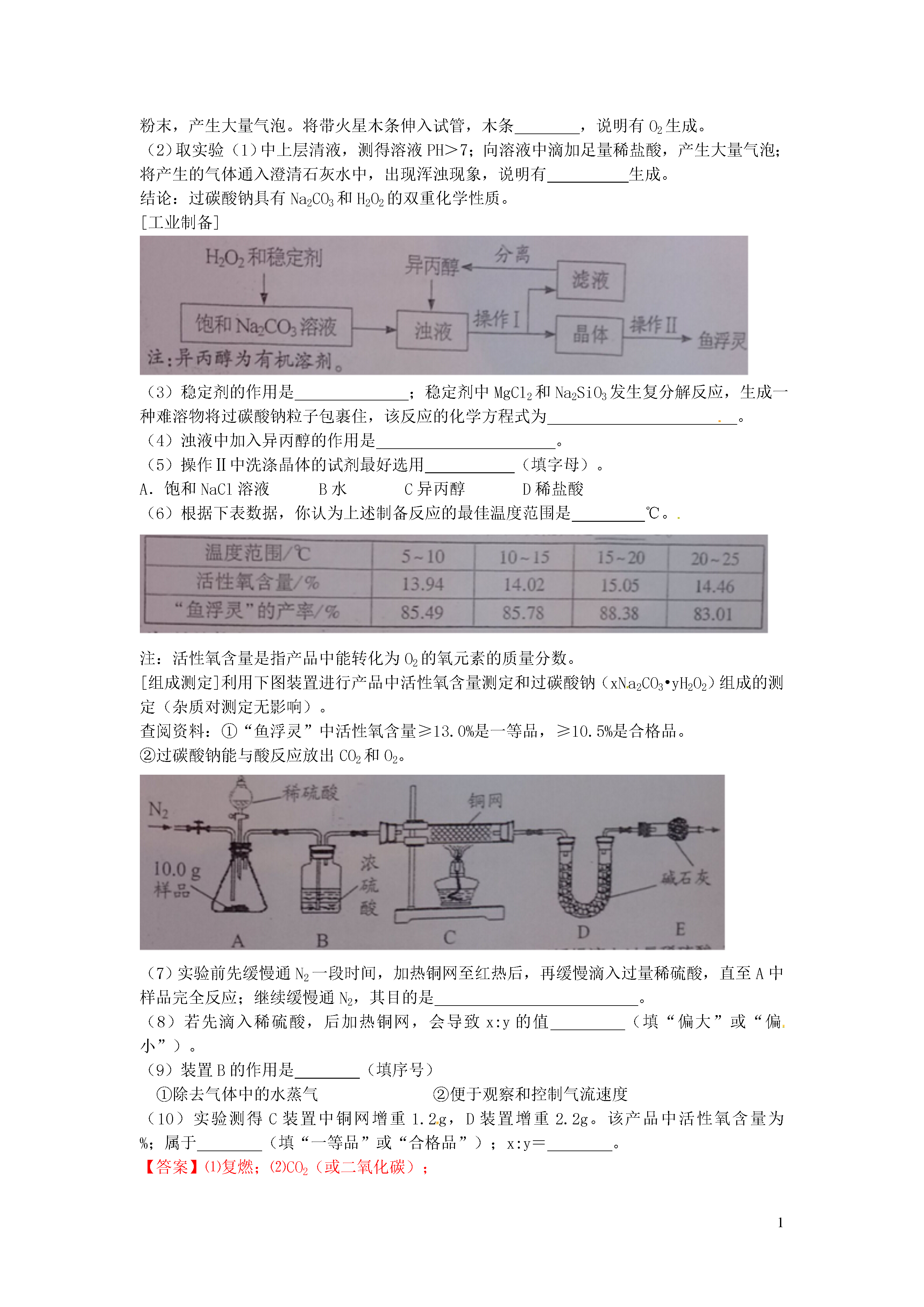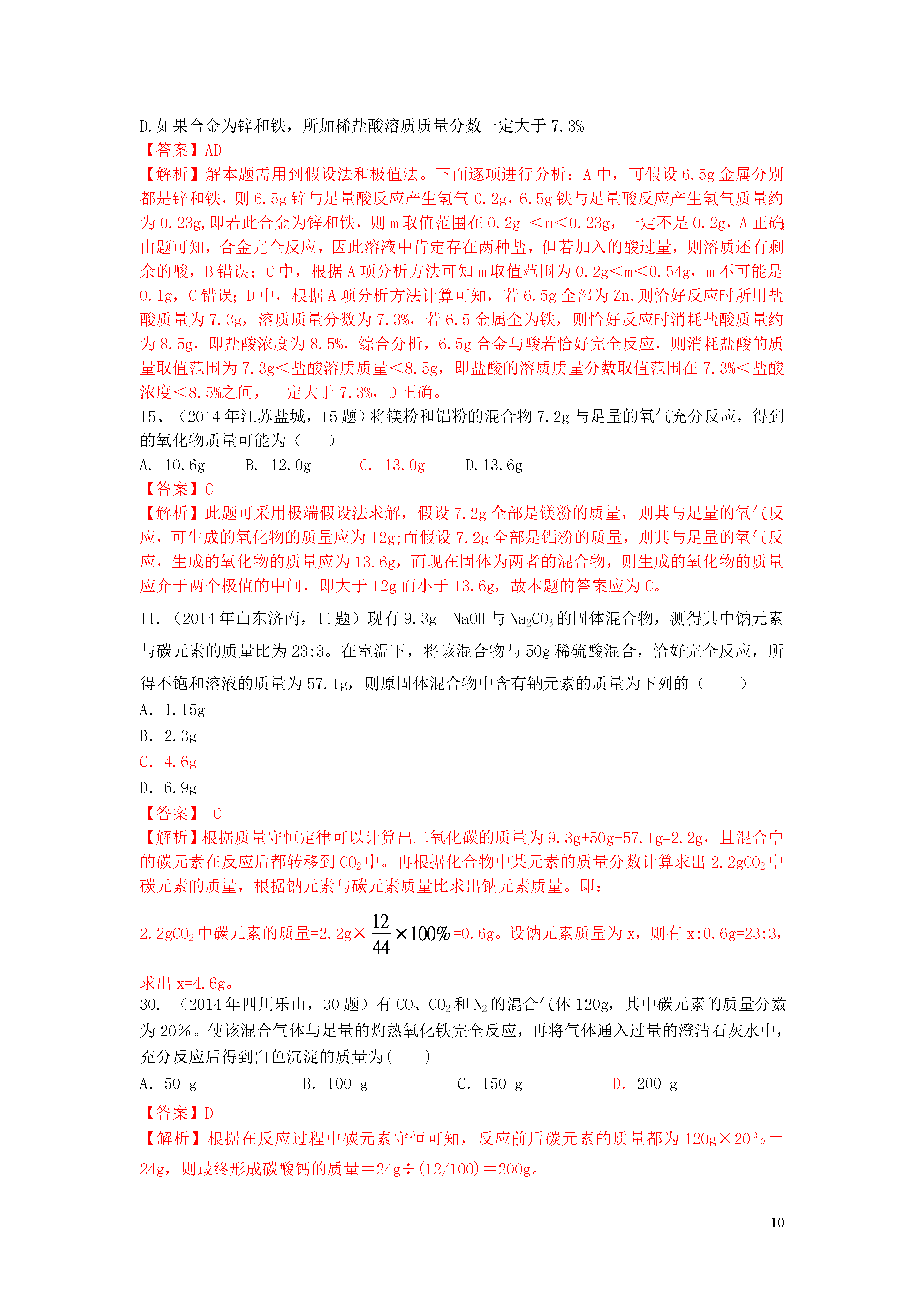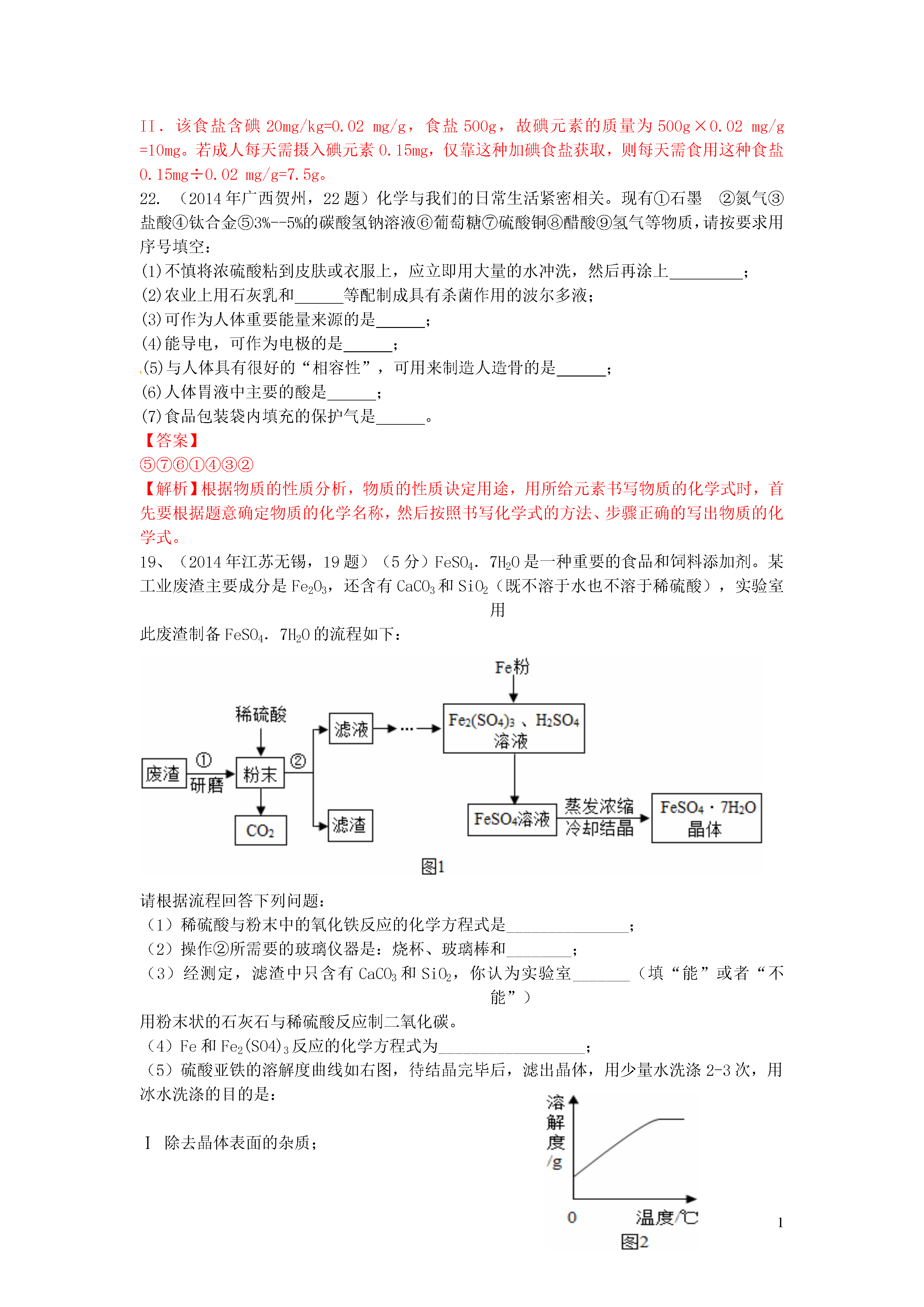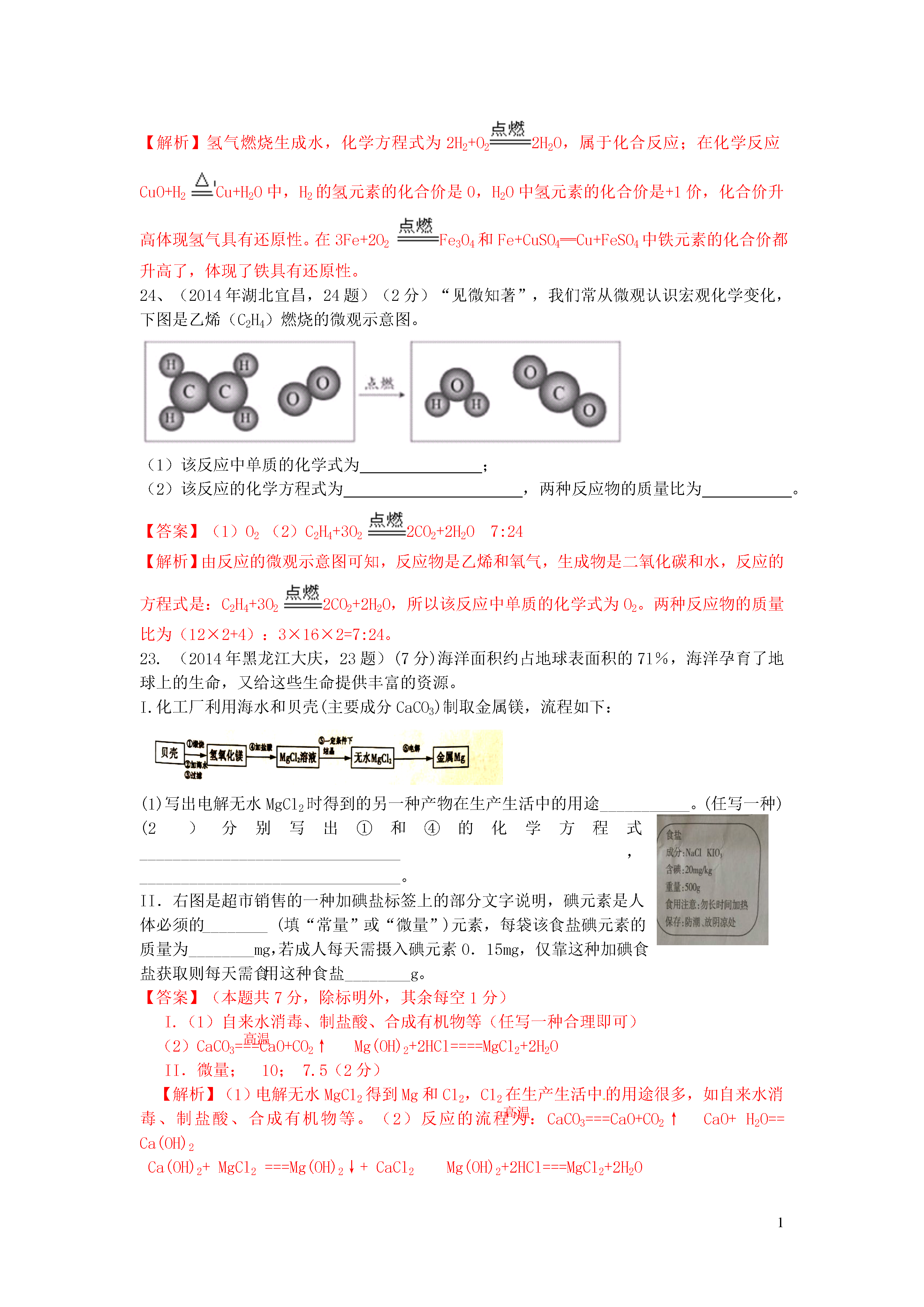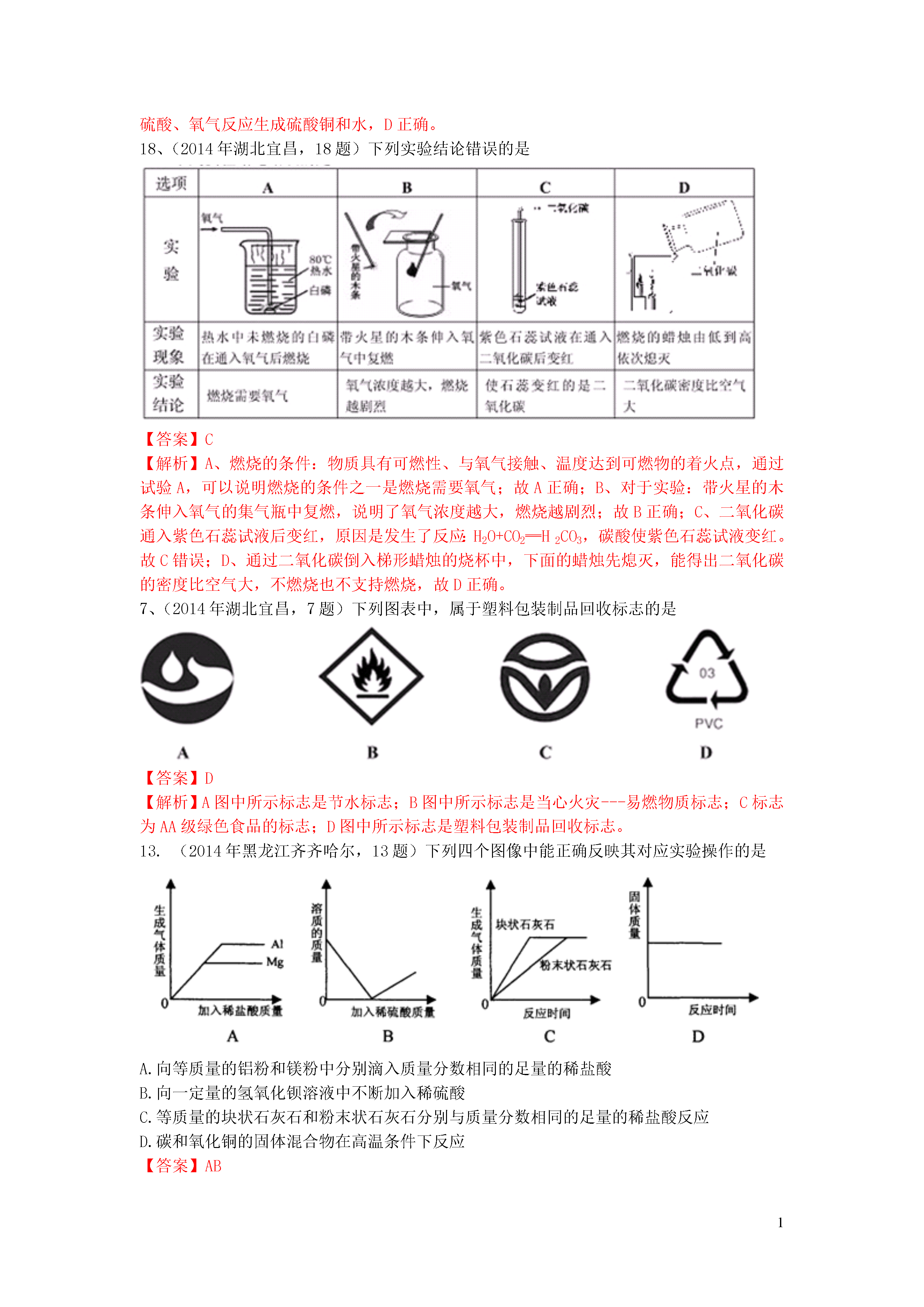 1信息给予题一、选择题20.(2014年江苏镇江,20题)下图是利用缺铁性氧化物[Fe(1-y)O]进行CO2再资源化研究的示意图。下列说法正确的是()A.如该研究成熟并广泛应用,能缓解温室效应B.反应①为置换反应,反应②为分解反应C.反应①提高了铁的氧化物中铁的质量分数D.整个转化反应的化学方程式可表示为:【答案】AD【解析】由图可以看出,该反应吸收二氧化碳并将其转化为碳和氧气,若该研究成熟并广泛应用,能缓解温室效应,A正确;反应①为缺铁性氧化物与二氧化碳反应,反应物都是两种化合物,不属于置换反应,B错;反应①使铁的氧化物中增加了氧的含量,降低了铁的质量分数,C错误;整个转化反应的过程为二氧化碳在缺铁氧化物和高温条件下转变为碳和氧气的过程,D正确。3.(2014年江苏镇江,3题)下列属于化学能转化为电能的是()A.天然气燃烧B干电池放电C电动车充电D风力发电【答案】B【解析】天然气燃烧是化学能转化为热能,干电池放电是化学能转化为电能;电动车充电是电能转化为化学能,风力发电是机械能转化为电能。16.(2014年黑龙江大庆,16题)目前,科学家提出一种最经济最理想的获得氢能源的循环体系(如图)下列说法错误的是()A.燃料电池能够使化学反应产生的能量直接转化为电能光分解催化剂B.该氢能源的循环体系能够实现太阳能转化为电能太阳能C.在此循环中发生了反应2H2O=========2H2↑+O2↑D.燃料电池可以将H2、O2中的能量完全转化为电能【答案】D【解析】燃料电池除了将H2、O2中的能量转化为电能外,还转化成热能,故D说法错误。13.(2014年江苏无锡,13题)美国普度大学研发出一种制备氢气的新工艺,流程如下图所示,下列说法错误的是A.铝镓合金可以循环使用B.太阳能的利用可以部分解决能源危机问题一定条件C.流程中的氧化铝、水和氧气都属于氧化物D.铝镓合金与水反应的化学方程式为:2Al+3H2O=============Al2O3+3H2↑【答案】C【解析】本题考查了工艺中的信息给予题,难度不大,注意从题目中获取相关的信息并结合相关的知识分析判断得出结论即可,难度不大,可以考查学生的知识迁移能力.A、观察流程图发现开始的反应物是铝镓合金,最终的生成物是铝镓合金,所以铝镓合金能循环使用,故说法正确;B、太阳能的利用可以部分解决能源危机问题,故说法正确;C、流程中的氧化铝、水都是由两种元素组成且含有氧元素的化合物,属于氧化物,而氧气属于单质,故说法错误;D、铝镓合金与水的反应中生成物是氧化铝、氢气和镓,相当于镓未参加反应,所以实际上发生的反应是2Al+3H2O==Al2O3+3H2↑,故说法正确.8.(2014年广东梅州,8题)在高速发展的信息时代,我们要学会获取和辨别信息。下列信息中正确的是A.为了提高粮食产量,应大量使用农药、化肥B.用甲醛水溶液浸泡海鲜产品来延长食品保质期C.锌元素有“智力之花”美称,补锌口服液喝得越多越好D.塑料薄膜可用于大棚蔬菜的生产,同时也会造成“白色污染”【答案】D【解析】农业上我们要合理的使用农药和化肥;甲醛的水溶液能使蛋白质变性,不能用来浸泡海鲜产品;对于微量元素我们要合理摄取,摄入不足或过量都对人体健康不利;塑料会带来“白色污染”。10.(2014年内蒙古呼和浩特,10题)钠是一种银白色固体,放置在空气中会迅速与氧气反应生成氧化钠,把钠投入水中,与水剧烈反应,熔化成闪亮小球在水面上游动,生成了氢氧化钠和氢气。下列有关钠的叙述不正确的是A.金属钠必须隔绝空气保存B.钠与水反应放热,使钠熔化,钠是熔点最低的金属C.钠和水反应的化学方程式为2Na+2H2O=2NaOH+H2↑D.把钠投入硫酸铜溶液中会产生无色无味的气体和蓝色沉淀【答案】B【解析】由题给信息可知,钠是一种银白色固体(物理性质),易与氧气反应、易与水反应产生氢气(化学性质),由此可知金属钠保存时要密封隔绝空气和水,A正确;把钠投入水中,与水剧烈反应,熔化成闪亮小球,说明钠与水反应放热,熔点低,但不是最低的金属,B错误;根据钠与水反应生成氢氧化钠和氢气写出相应的化学方程式,C正确;把钠投入硫酸铜溶液中首先钠与水反应生成了氢氧化钠,氢氧化钠再与硫酸铜反应,2NaOH+CuSO4=Cu(OH)2↓+Na2SO4,D正确。18.(2014年山东莱芜,18题)科学家发现火星大气层中含有一种称为硫化羰(羰音乐tang)的物质,化学式为COS。已知硫化羰与二氧化碳的结构相似,但能在氧气中完全燃烧。下列有关硫化羰的说法错误的是()A.硫化羰是由分子构成的B.硫化羰可作为理想燃料C.硫化羰不能用作灭火剂D.硫化羰完全燃烧会生成C