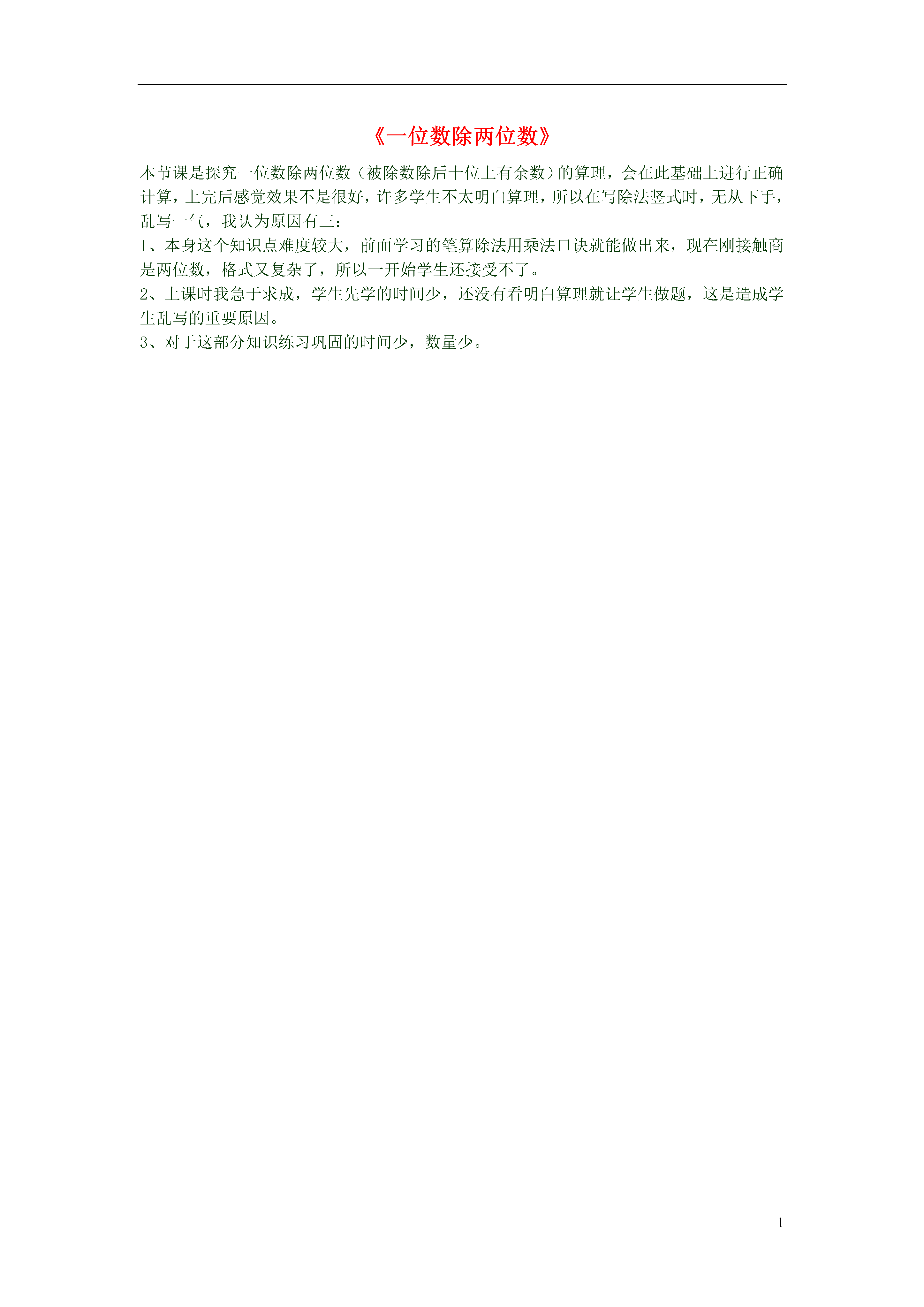 1《一位数除两位数》本节课是探究一位数除两位数(被除数除后十位上有余数)的算理,会在此基础上进行正确计算,上完后感觉效果不是很好,许多学生不太明白算理,所以在写除法竖式时,无从下手,乱写一气,我认为原因有三:1、本身这个知识点难度较大,前面学习的笔算除法用乘法口诀就能做出来,现在刚接触商是两位数,格式又复杂了,所以一开始学生还接受不了。2、上课时我急于求成,学生先学的时间少,还没有看明白算理就让学生做题,这是造成学生乱写的重要原因。3、对于这部分知识练习巩固的时间少,数量少。
