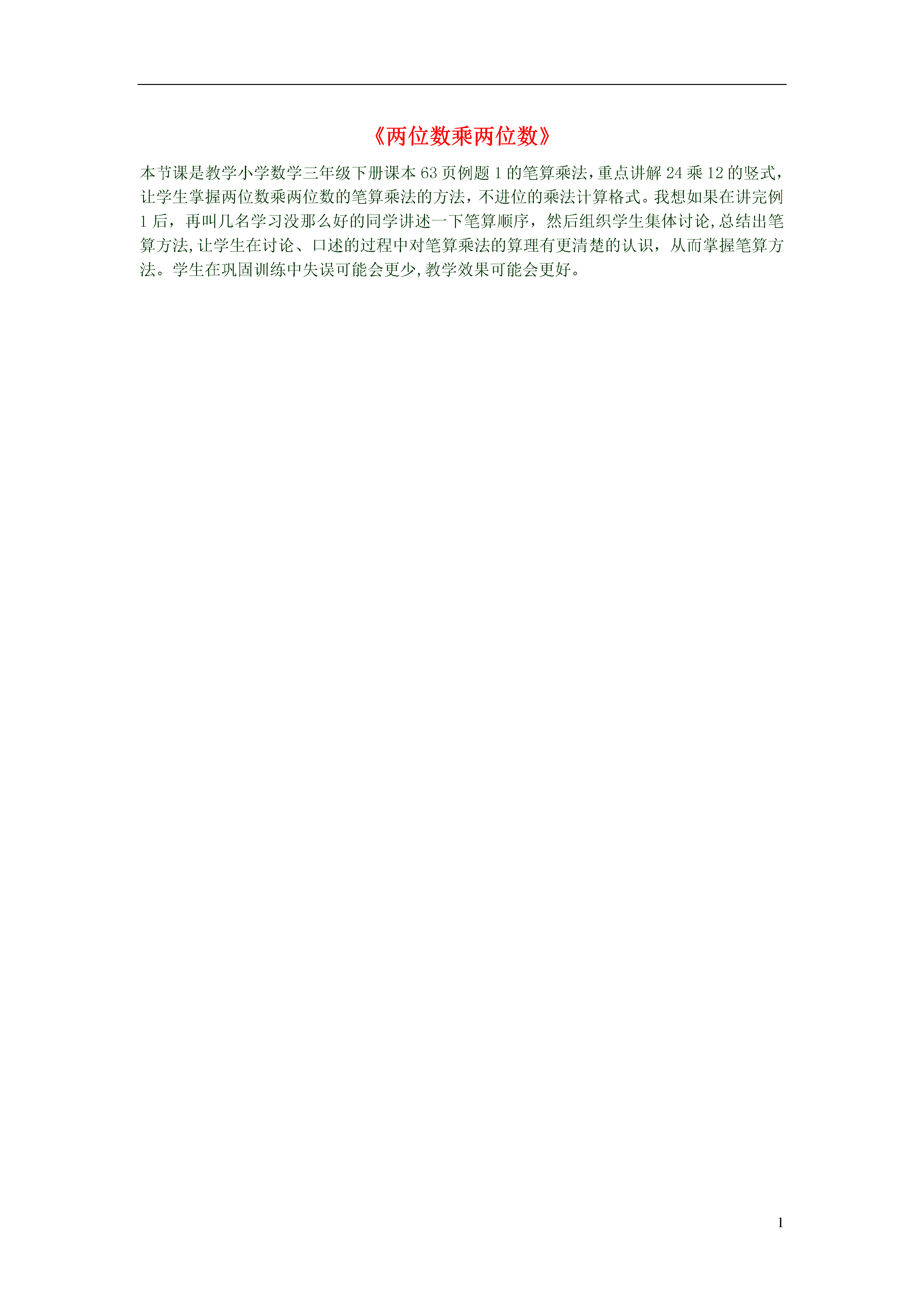 1《两位数乘两位数》本节课是教学小学数学三年级下册课本63页例题1的笔算乘法,重点讲解24乘12的竖式,让学生掌握两位数乘两位数的笔算乘法的方法,不进位的乘法计算格式。我想如果在讲完例1后,再叫几名学习没那么好的同学讲述一下笔算顺序,然后组织学生集体讨论,总结出笔算方法,让学生在讨论、口述的过程中对笔算乘法的算理有更清楚的认识,从而掌握笔算方法。学生在巩固训练中失误可能会更少,教学效果可能会更好。