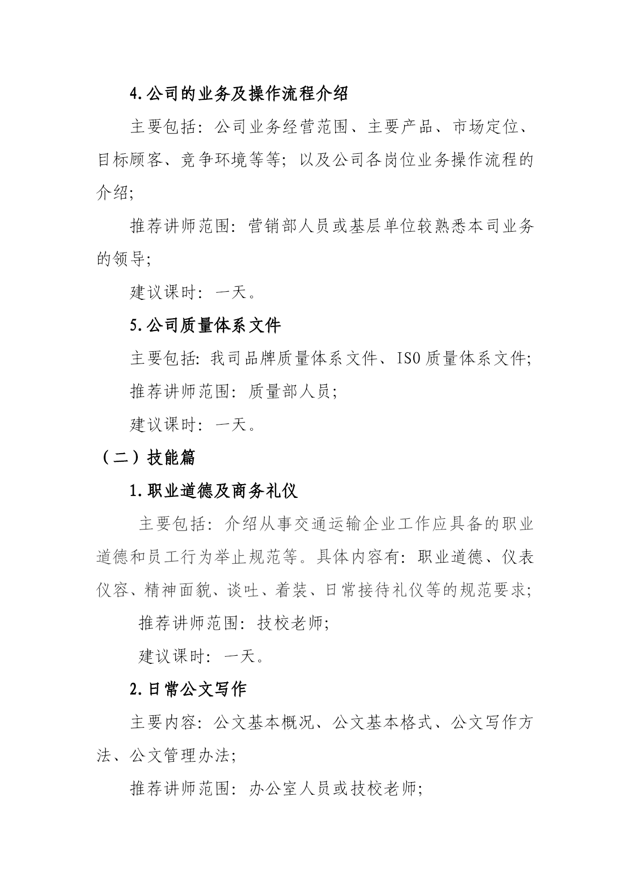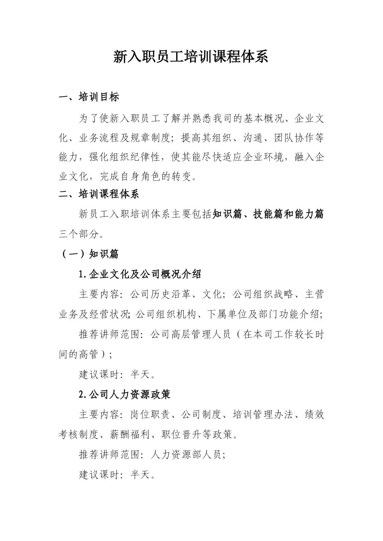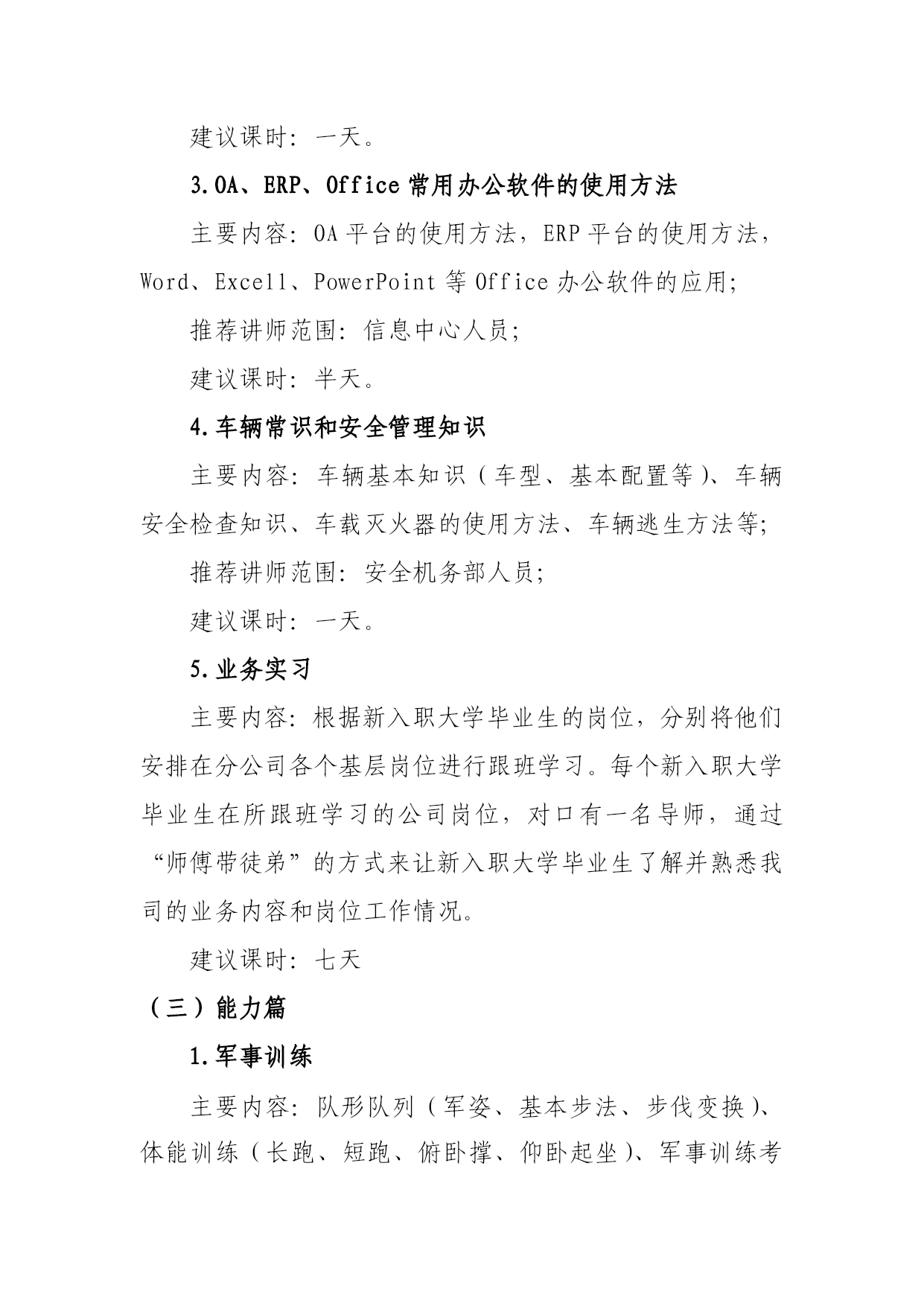 新入职员工培训课程体系一、培训目标为了使新入职员工了解并熟悉我司的基本概况、企业文化、业务流程及规章制度;提高其组织、沟通、团队协作等能力,强化组织纪律性,使其能尽快适应企业环境,融入企业文化,完成自身角色的转变。二、培训课程体系新员工入职培训体系主要包括知识篇、技能篇和能力篇三个部分。(一)知识篇1.企业文化及公司概况介绍主要内容:公司历史沿革、文化;公司组织战略、主营业务及经营状况;公司组织机构、下属单位及部门功能介绍;推荐讲师范围:公司高层管理人员(在本司工作较长时间的高管);建议课时:半天。2.公司人力资源政策主要内容:岗位职责、公司制度、培训管理办法、绩效考核制度、薪酬HYPERLINK"http://wiki.mbalib.com/wiki/%E7%A6%8F%E5%88%A9"\o"福利"福利、职位晋升等政策。推荐讲师范围:人力资源部人员;建议课时:半天。4.公司的业务及操作流程介绍主要包括:公司业务经营范围、主要产品、HYPERLINK"http://wiki.mbalib.com/wiki/%E5%B8%82%E5%9C%BA%E5%AE%9A%E4%BD%8D"\o"市场定位"市场定位、HYPERLINK"http://wiki.mbalib.com/wiki/%E7%9B%AE%E6%A0%87%E9%A1%BE%E5%AE%A2"\o"目标顾客"目标顾客、HYPERLINK"http://wiki.mbalib.com/wiki/%E7%AB%9E%E4%BA%89%E7%8E%AF%E5%A2%83"\o"竞争环境"竞争环境等等;以及公司各岗位业务操作流程的介绍;推荐讲师范围:营销部人员或基层单位较熟悉本司业务的领导;建议课时:一天。5.公司质量体系文件主要包括:我司品牌质量体系文件、ISO质量体系文件;推荐讲师范围:质量部人员;建议课时:一天。(二)技能篇1.职业道德及商务礼仪主要包括:介绍从事交通运输企业工作应具备的职业道德和员工行为举止规范等。具体内容有:HYPERLINK"http://wiki.mbalib.com/wiki/%E8%81%8C%E4%B8%9A%E9%81%93%E5%BE%B7"\o"职业道德"职业道德、仪表仪容、精神面貌、谈吐、着装、日常接待礼仪等的规范要求;推荐讲师范围:技校老师;建议课时:一天。2.日常公文写作主要内容:公文基本概况、公文基本格式、公文写作方法、公文管理办法;推荐讲师范围:办公室人员或技校老师;建议课时:一天。3.OA、ERP、Office常用办公软件的使用方法主要内容:OA平台的使用方法,ERP平台的使用方法,Word、Excell、PowerPoint等Office办公软件的应用;推荐讲师范围:信息中心人员;建议课时:半天。4.车辆常识和安全管理知识主要内容:车辆基本知识(车型、基本配置等)、车辆安全检查知识、车载灭火器的使用方法、车辆逃生方法等;推荐讲师范围:安全机务部人员;建议课时:一天。5.业务实习主要内容:根据新入职大学毕业生的岗位,分别将他们安排在分公司各个基层岗位进行跟班学习。每个新入职大学毕业生在所跟班学习的公司岗位,对口有一名导师,通过“师傅带徒弟”的方式来让新入职大学毕业生了解并熟悉我司的业务内容和岗位工作情况。建议课时:七天(三)能力篇1.军事训练主要内容:队形队列(军姿、基本步法、步伐变换)、体能训练(长跑、短跑、俯卧撑、仰卧起坐)、军事训练考核(以上训练项目的集体考核);建议课时:七天2.素质拓展主要内容:通过素质拓展游戏,锻炼新员工组织协调、沟通、信任度、团队协作能力(附件:游戏库);建议课时:一天3.团队任务主要内容:通过给培训团队布置某一项任务,团队通过协作,在指定时间内完成某一项具有一定难度的任务。团队任务的主要形式有:(1)情景模拟给成员发放一个我司工作中常见的问题,让成员以团队在指定时间内,对问题作出分析,并将分析的内容以情景模拟表演的形式进行展示。例子:如果你是客运办的一个工作人员,一位乘客向你投诉:由于车辆晚点造成他可能无法赶上他预定的航班,你该怎么处理?(2)营销任务组织一次营销比赛,对我司的某一项业务进行营销,例如:发展“会员”业务。为小组提供一些必要的现金和物资,让其在特定时间内完成某项营销任务,通过最后的结果对优秀小组进行奖励。建议课时:一天