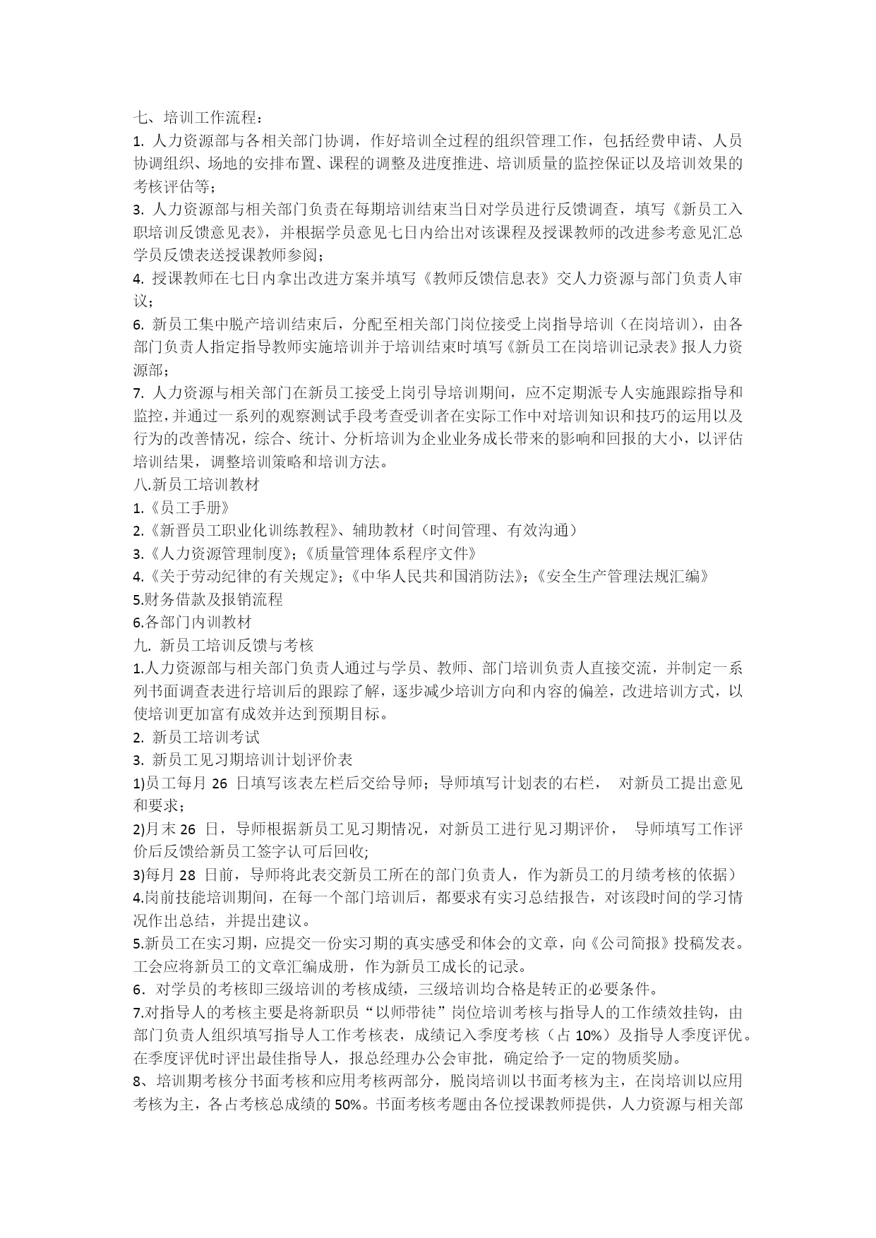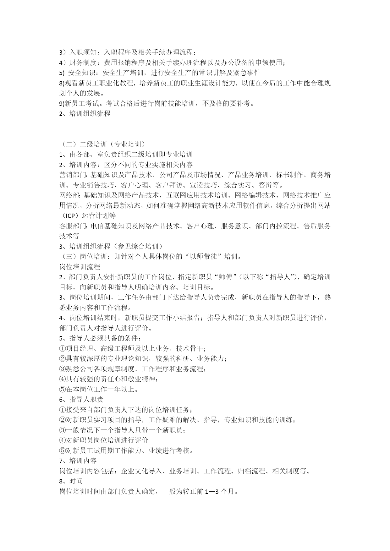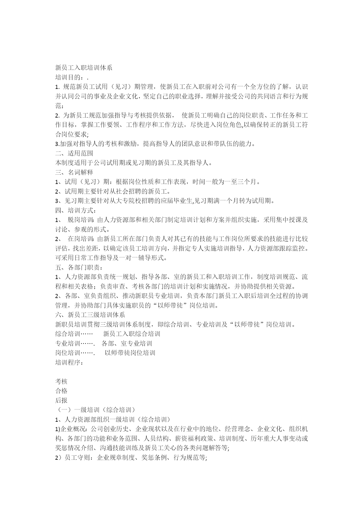 新员工入职培训体系培训目的:.1.规范新员工试用(见习)期管理,使新员工在入职前对公司有一个全方位的了解,认识并认同公司的事业及企业文化,坚定自己的职业选择,理解并接受公司的共同语言和行为规范;2.为新员工规范加强指导与考核提供依据,使新员工明确自己的岗位职责、工作任务和工作目标,掌握工作要领、工作程序和工作方法,尽快进入岗位角色,以确保转正的新员工符合岗位要求;3.加强对指导人的考核和激励,提高指导人的团队意识和带队伍的能力。二、适用范围本制度适用于公司试用期或见习期的新员工及其指导人。三、名词解释1、试用(见习)期:根据岗位性质和工作表现,时间一般为一至三个月。2、试用期主要针对从社会招聘的新员工。3、见习期主要针对从大专院校招聘的应届毕业生,见习期满一个月转为试用期。四、培训方式:1、脱岗培训:由人力资源部和相关部门制定培训计划和方案并组织实施,采用集中授课及讨论、参观的形式。2、在岗培训:由新员工所在部门负责人对其已有的技能与工作岗位所要求的技能进行比较评估,找出差距,以确定该员工培训方向,并指定专人实施培训指导,人力资源部跟踪监控。可采用日常工作指导及一对一辅导形式。五、各部门职责:1、人力资源部负责统一规划、指导各部、室的新员工和入职培训工作,制度培训规范、流程和相关表格;负责审查、考核各部门的培训计划和实施情况,并协助提供相关资源。2、各部、室负责组织、推动新职员专业培训,负责本部门新员工入职后培训全过程的协调管理,并协助部门具体实施职员的“以师带徒”岗位培训。六、新员工三级培训体系新职员培训贯彻三级培训体系制度,即综合培训、专业培训及“以师带徒”岗位培训。综合培训……新员工入职综合培训专业培训…….各部、室专业培训岗位培训…….以师带徒岗位培训培训程序:考核合格后报(一)一级培训(综合培训)1、人力资源部组织一级培训(综合培训)1)企业概况:公司创业历史、企业现状以及在行业中的地位、经营理念、企业文化、组织机构、各部门的功能和业务范围、人员结构、薪资福利政策、培训制度、历年重大人事变动或奖惩情况介绍、沟通技能训练及新员工关心的各类问题解答等;2)员工守则:企业规章制度、奖惩条例、行为规范等;3)入职须知:入职程序及相关手续办理流程;4)财务制度:费用报销程序及相关手续办理流程以及办公设备的申领使用;5)安全知识:安全生产培训,进行安全生产的常识讲解及紧急事件8)观看新员工职业化教程,培养新员工的职业生涯设计能力,以便在今后的工作中能合理规划个人的发展。9)新员工考试。考试合格后进行岗前技能培训,不及格的要补考。2、培训组织流程(二)二级培训(专业培训)1、由各部、室负责组织二级培训即专业培训2、培训内容:区分不同的专业实施相关内容营销部门:基础知识及产品技术、公司产品及市场情况、产品业务培训、标书制作、商务培训、专业销售技巧、客户心理、客户拜访、宣读技巧、综合实习、答辩等。网络部:基础知识及网络产品技术、互联网应用技术培训、网络编辑技术、网络技术推广应用情况,分析网络最新动态,如何准确掌握网络高新技术应用软件信息,综合分析提出网站(ICP)运营计划等客服部门:电信基础知识及网络产品技术、客户心理、服务意识、部门内控流程、售后服务技术等3、培训组织流程(参见综合培训)(三)岗位培训:即针对个人具体岗位的“以师带徒”培训。岗位培训流程2、部门负责人安排新职员的工作岗位,指定新职员“师傅”(以下称“指导人”),确定培训目标,向新职员和指导人明确培训内容、培训目标。3、岗位培训期间,工作任务由部门下达给指导人负责完成,新职员在指导人的指导下,熟悉业务内容和工作流程。4、岗位培训结束时,新职员提交工作小结报告;指导人和部门负责人对新职员进行评价,部门负责人对指导人进行评价。5、指导人必须具备的条件:①项目经理、高级工程师及以上业务、技术骨干;②具有较深厚的专业理论知识,较强的科研、业务能力;③熟悉公司各项规章制度、工作程序和业务流程;④具有较强的责任心和敬业精神;⑤在本岗位工作一年以上。6、指导人职责①接受来自部门负责人下达的岗位培训任务;②对新职员实习项目的指导,工作疑难的解决、指导,专业知识和技能的训练;③一般情况下一个指导人只带一个新职员;④对新职员岗位培训进行评价⑤对新员工试用期工作能力、业绩进行考核。7、培训内容岗位培训内容包括:企业文化导入、业务培训、工作流程、归档流程、相关制度等。8、时间岗位培训时间由部门负责人确定,一般为转正前1—3个月。七、培训工作流程:1.人力资源部与各相关部门协调,作好培训全过程的组织管理工作,包括经费申请、人员协调组织、场地的安排布置、课程的调整及进度推进、培训质量的监控保证以及培训效果的考核评估等;3.人力资源部与相关部门负责在每期培训结束当日对学员进行反馈调查,填写《新员工入