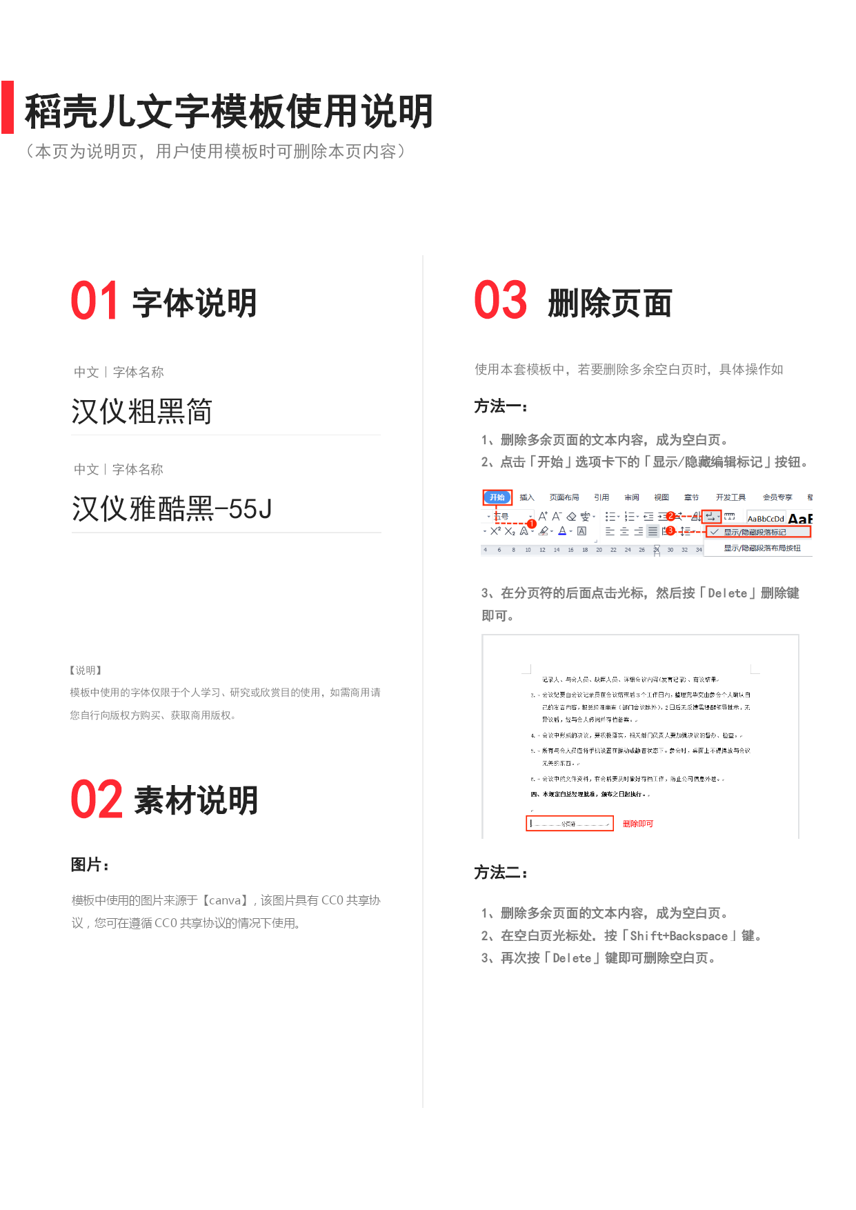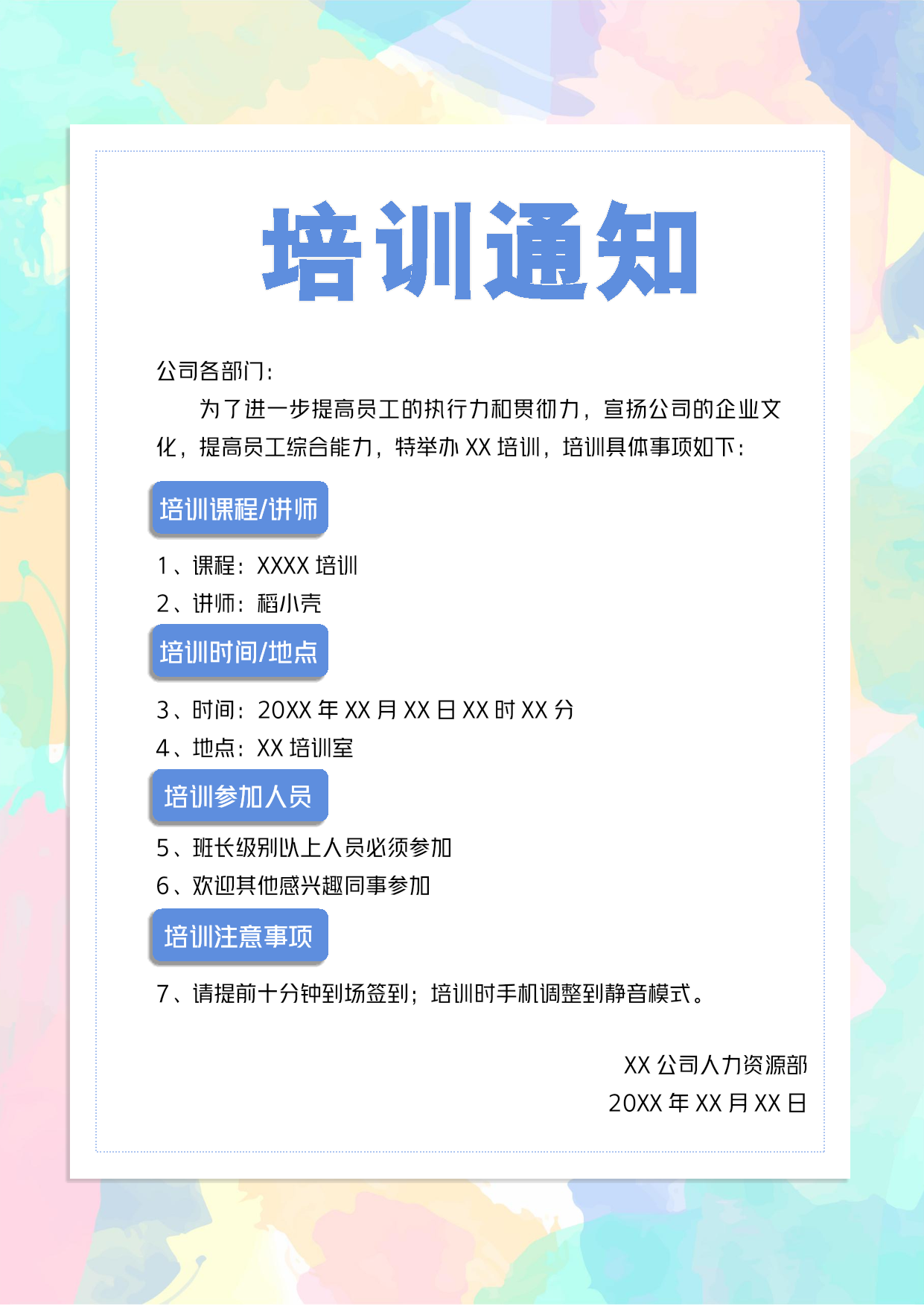 培训通知XX公司人力资源部20XX年XX月XX日培训注意事项培训参加人员培训时间/地点培训课程/讲师公司各部门:为了进一步提高员工的执行力和贯彻力,宣扬公司的企业文化,提高员工综合能力,特举办XX培训,培训具体事项如下:1、课程:XXXX培训2、讲师:稻小壳3、时间:20XX年XX月XX日XX时XX分4、地点:XX培训室5、班长级别以上人员必须参加6、欢迎其他感兴趣同事参加7、请提前十分钟到场签到;培训时手机调整到静音模式。中文|字体名称汉仪雅酷黑-55J中文|字体名称汉仪粗黑简01字体说明02素材说明图片:模板中使用的图片来源于【canva】,该图片具有CC0共享协议,您可在遵循CC0共享协议的情况下使用。稻壳儿文字模板使用说明(本页为说明页,用户使用模板时可删除本页内容)03删除页面使用本套模板中,若要删除多余空白页时,具体操作如下:2、点击「开始」选项卡下的「显示/隐藏编辑标记」按钮。在分页符的后面点击光标,然后按「Delete」删除键即可。1、删除多余页面的文本内容,成为空白页。方法一:3、再次按「Delete」键即可删除空白页。2、在空白页光标处,按「Shift+Backspace」键。1、删除多余页面的文本内容,成为空白页。方法二:【说明】模板中使用的字体仅限于个人学习、研究或欣赏目的使用,如需商用请您自行向版权方购买、获取商用版权。