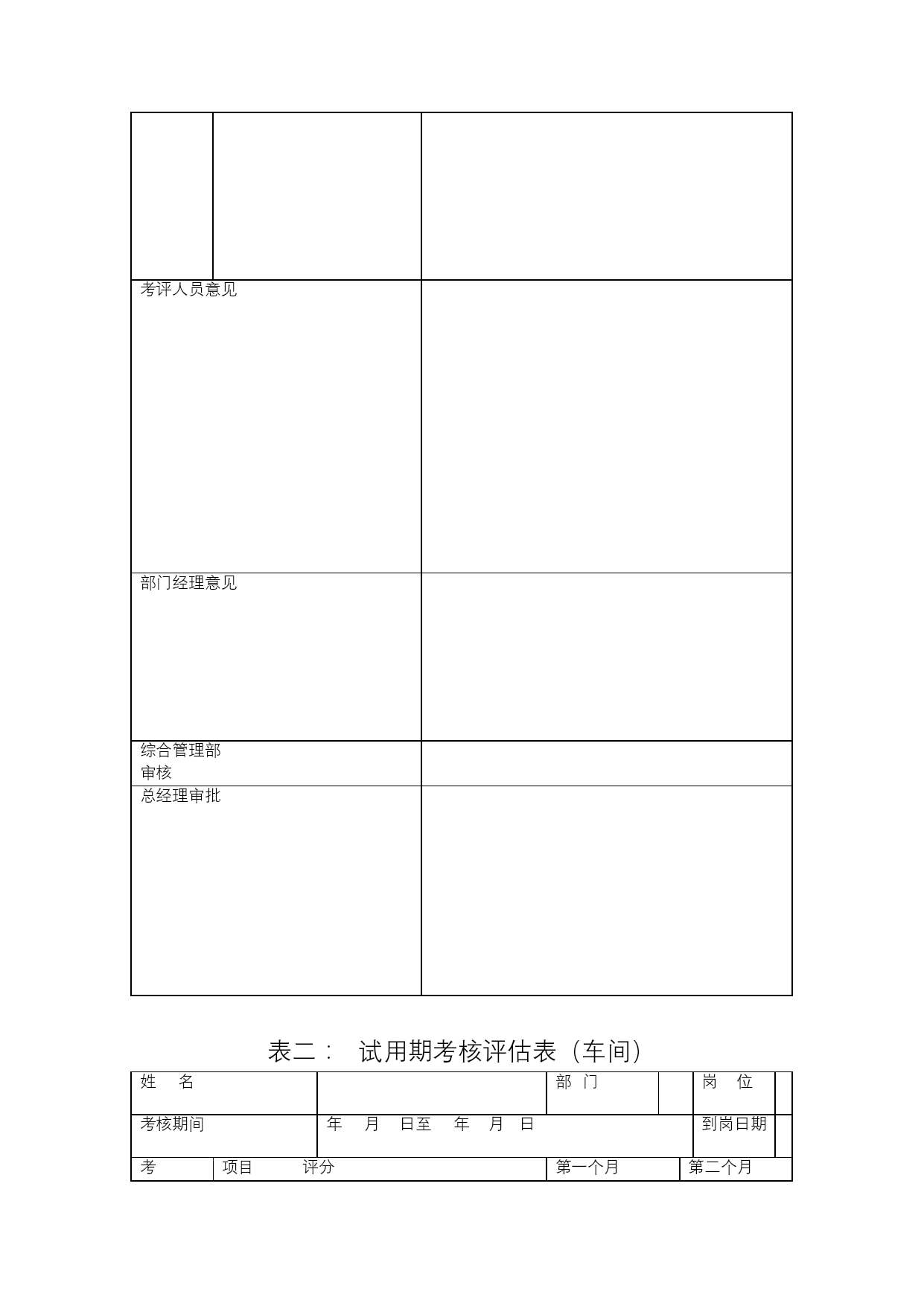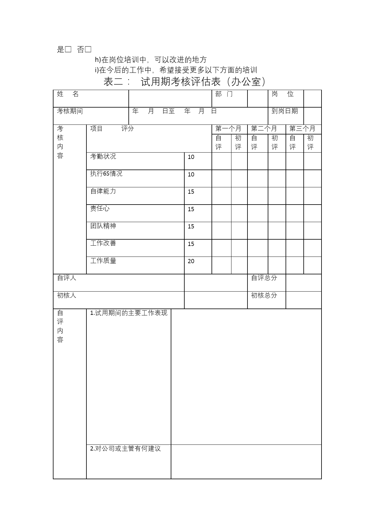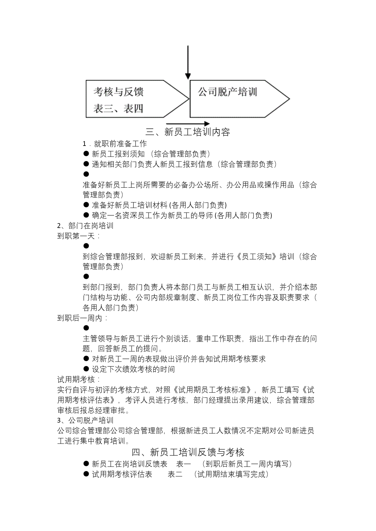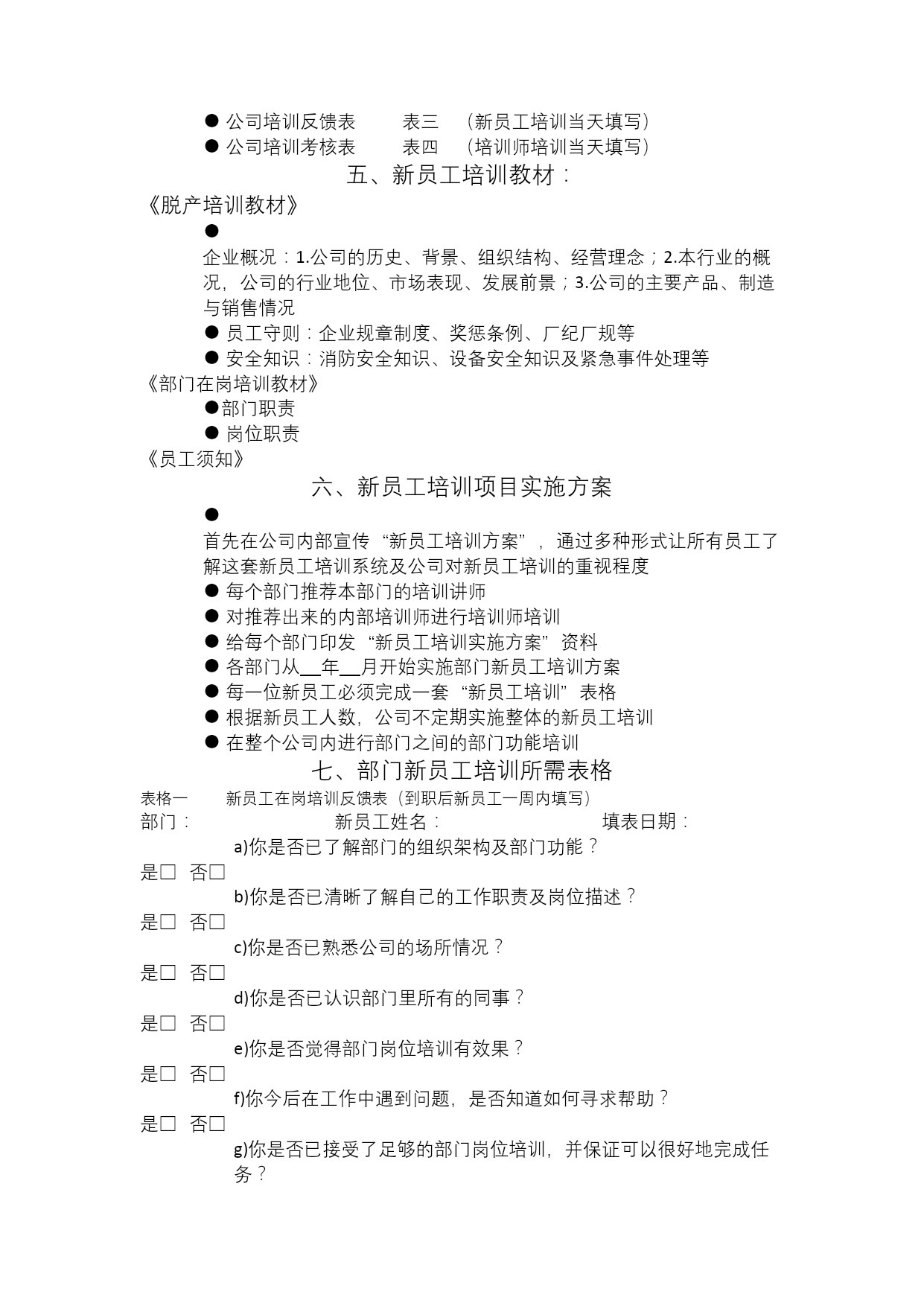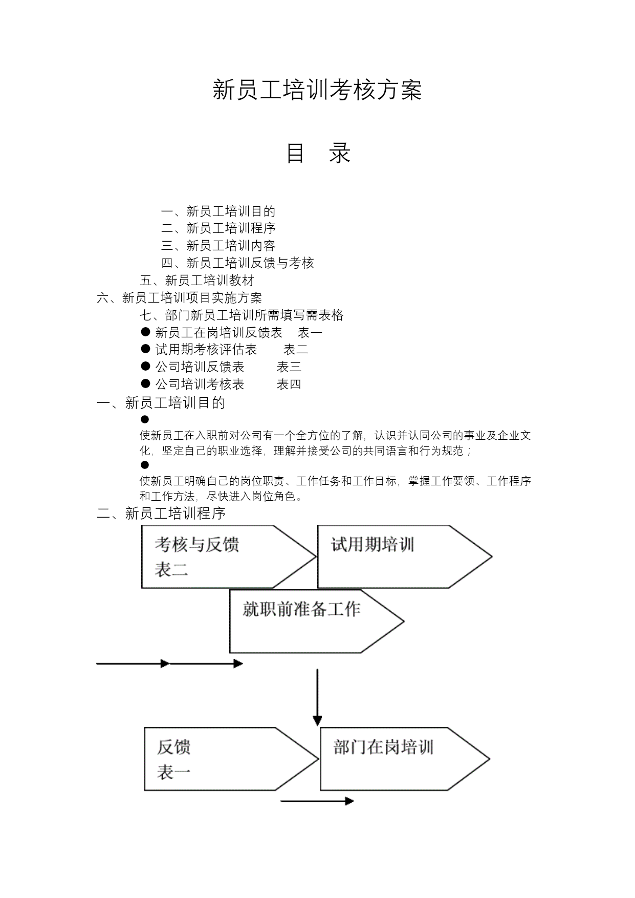 新员工培训考核方案目录一、新员工培训目的二、新员工培训程序三、新员工培训内容四、新员工培训反馈与考核五、新员工培训教材六、新员工培训项目实施方案七、部门新员工培训所需填写需表格●新员工在岗培训反馈表表一●试用期考核评估表表二●公司培训反馈表表三●公司培训考核表表四一、新员工培训目的●使新员工在入职前对公司有一个全方位的了解,认识并认同公司的事业及企业文化,坚定自己的职业选择,理解并接受公司的共同语言和行为规范;●使新员工明确自己的岗位职责、工作任务和工作目标,掌握工作要领、工作程序和工作方法,尽快进入岗位角色。二、新员工培训程序三、新员工培训内容1.就职前准备工作●新员工报到须知(综合管理部负责)●通知相关部门负责人新员工报到信息(综合管理部负责)●准备好新员工上岗所需要的必备办公场所、办公用品或操作用品(综合管理部负责)●准备好新员工培训材料(各用人部门负责)●确定一名资深员工作为新员工的导师(各用人部门负责)2、部门在岗培训到职第一天:●到综合管理部报到,欢迎新员工到来,并进行《员工须知》培训(综合管理部负责)●到部门报到,部门负责人将本部门员工与新员工相互认识,并介绍本部门结构与功能、公司内部规章制度、新员工岗位工作内容及职责要求(各用人部门负责)到职后一周内:●主管领导与新员工进行个别谈话,重申工作职责,指出工作中存在的问题,回答新员工的提问。●对新员工一周的表现做出评价并告知试用期考核要求●设定下次绩效考核的时间试用期考核:实行自评与初评的考核方式,对照《试用期员工考核标准》,新员工填写《试用期考核评估表》,考评人员进行考核,部门经理提出录用建议,综合管理部审核后报总经理审批。3、公司脱产培训公司综合管理部公司综合管理部,根据新进员工人数情况不定期对公司新进员工进行集中教育培训。四、新员工培训反馈与考核●新员工在岗培训反馈表表一(到职后新员工一周内填写)●试用期考核评估表表二(试用期结束填写完成)●公司培训反馈表表三(新员工培训当天填写)●公司培训考核表表四(培训师培训当天填写)五、新员工培训教材:《脱产培训教材》●企业概况:1.公司的历史、背景、组织结构、经营理念;2.本行业的概况,公司的行业地位、市场表现、发展前景;3.公司的主要产品、制造与销售情况●员工守则:企业规章制度、奖惩条例、厂纪厂规等●安全知识:消防安全知识、设备安全知识及紧急事件处理等《部门在岗培训教材》●部门职责●岗位职责《员工须知》六、新员工培训项目实施方案●首先在公司内部宣传“新员工培训方案”,通过多种形式让所有员工了解这套新员工培训系统及公司对新员工培训的重视程度●每个部门推荐本部门的培训讲师●对推荐出来的内部培训师进行培训师培训●给每个部门印发“新员工培训实施方案”资料●各部门从年月开始实施部门新员工培训方案●每一位新员工必须完成一套“新员工培训”表格●根据新员工人数,公司不定期实施整体的新员工培训●在整个公司内进行部门之间的部门功能培训七、部门新员工培训所需表格表格一新员工在岗培训反馈表(到职后新员工一周内填写)部门:新员工姓名:填表日期:a)你是否已了解部门的组织架构及部门功能?是□否□b)你是否已清晰了解自己的工作职责及岗位描述?是□否□c)你是否已熟悉公司的场所情况?是□否□d)你是否已认识部门里所有的同事?是□否□e)你是否觉得部门岗位培训有效果?是□否□f)你今后在工作中遇到问题,是否知道如何寻求帮助?是□否□g)你是否已接受了足够的部门岗位培训,并保证可以很好地完成任务?是□否□h)在岗位培训中,可以改进的地方i)在今后的工作中,希望接受更多以下方面的培训表二:试用期考核评估表(办公室)姓名部门岗位考核期间年月日至年月日到岗日期考核内容项目评分第一个月第二个月第三个月自评初评自评初评自评初评考勤状况10执行6S情况10自律能力15责任心15团队精神15工作改善15工作质量20自评人自评总分初核人初核总分自评内容1.试用期间的主要工作表现2.对公司或主管有何建议考评人员意见部门经理意见综合管理部审核总经理审批表二:试用期考核评估表(车间)姓名部门岗位考核期间年月日至年月日到岗日期考核内容项目评分第一个月第二个月自评初评自评初评考勤状况10执行6S情况10自律能力15责任心15成本意识15报废次数15规范操作20自评人自评总分初核人初核总分自评内容1.试用期间的主要工作表现2.对公司或主管有何建议考评人员意见部门经理意见综合管理部审核总经理审批表二:试用期员工转正考核标准考核内容权重评分说明合格分数共性考核内容考勤状况10%满勤(10分)请假1天扣0.2分;迟到、早退1次扣1分;旷工1次扣2分6分执行6S情况10%严格按照6S规定执行(10分)未按照6S标准一次扣1分6分自律能力15%能够严格遵守公司的规定及制度,忠于职守,无窜岗