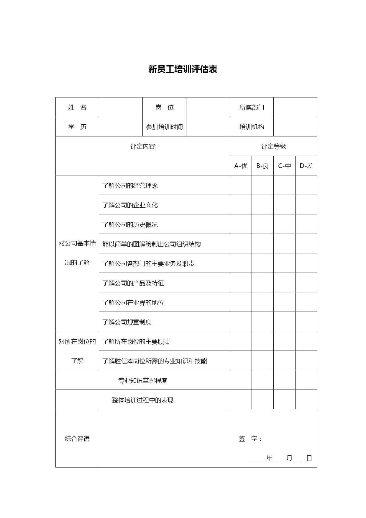 新员工培训评估表姓名岗位所属部门学历参加培训时间培训机构评定内容评定等级A-优B-良C-中D-差对公司基本情况的了解了解公司的经营理念了解公司的企业文化了解公司的历史概况能以简单的图解绘制出公司组织结构了解公司各部门的主要业务及职责了解公司的产品及特征了解公司在业界的地位了解公司规章制度对所在岗位的了解了解所在岗位的主要职责了解胜任本岗位所需的专业知识和技能专业知识掌握程度整体培训过程中的表现综合评语签字:______年_____月_____日