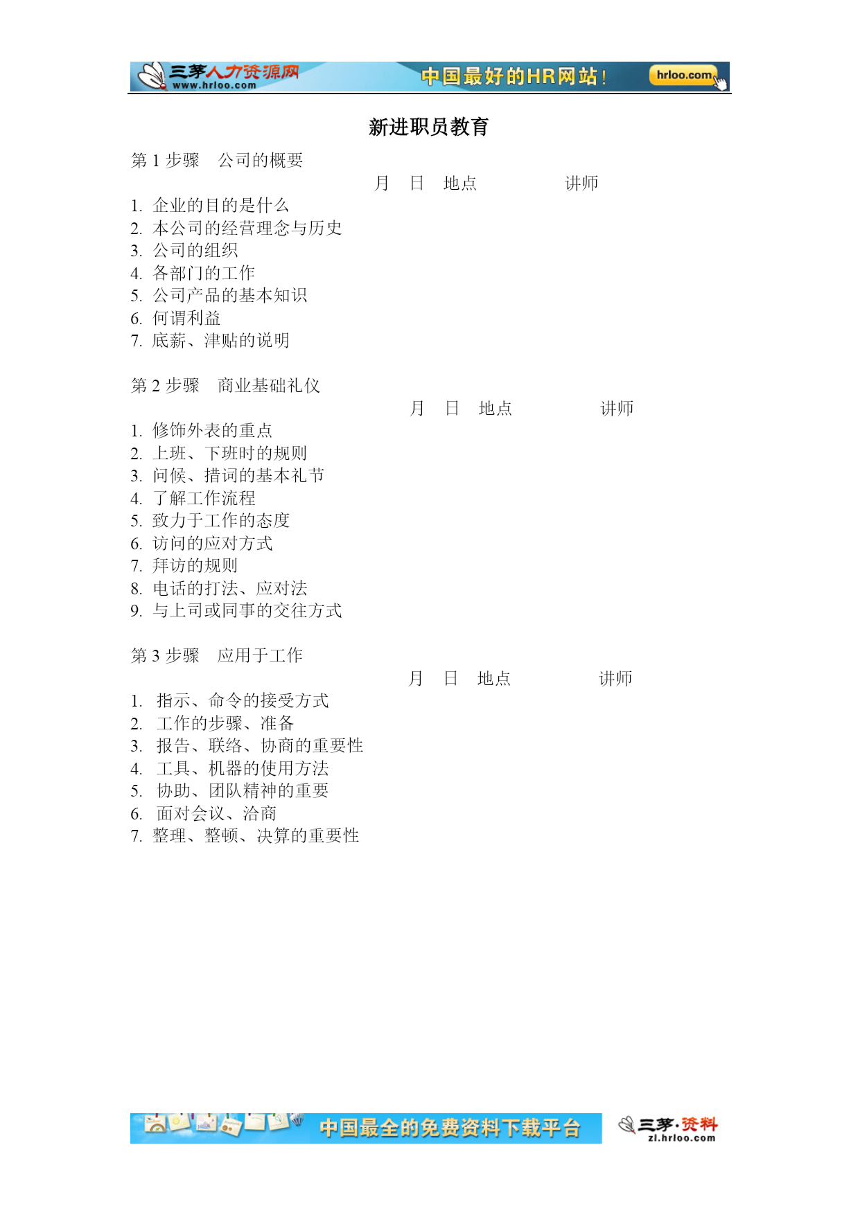 新进职员教育第1步骤公司的概要月日地点讲师1.企业的目的是什么2.本公司的经营理念与历史3.公司的组织4.各部门的工作5.公司产品的基本知识6.何谓利益7.底薪、津贴的说明第2步骤商业基础礼仪月日地点讲师1.修饰外表的重点2.上班、下班时的规则3.问候、措词的基本礼节4.了解工作流程5.致力于工作的态度6.访问的应对方式7.拜访的规则8.电话的打法、应对法9.与上司或同事的交往方式第3步骤应用于工作月日地点讲师指示、命令的接受方式工作的步骤、准备报告、联络、协商的重要性工具、机器的使用方法协助、团队精神的重要面对会议、洽商7.整理、整顿、决算的重要性