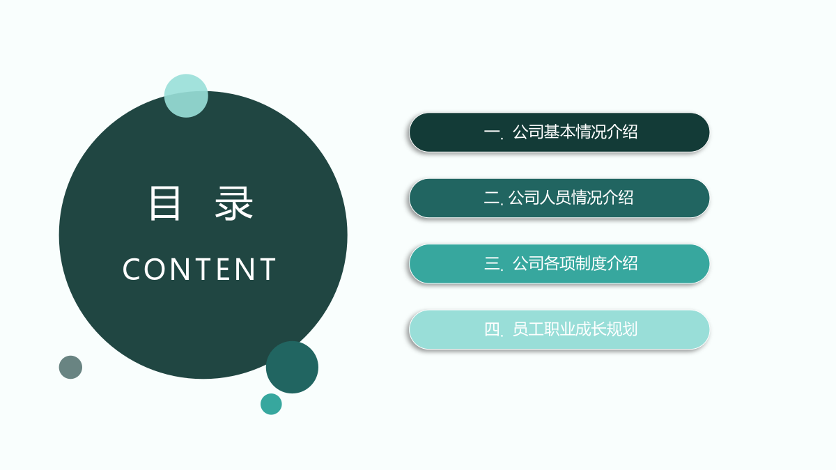 新员工入职培训PPT目录公司基本情况介绍公司简介发展历程公司理念公司人员情况介绍公司结构企业领导层公司团队活动公司各项制度介绍考勤管理请假流程试用期管理员工职业成长规划准确认清自己自我评价增加职业竞争力谢谢您的聆听!