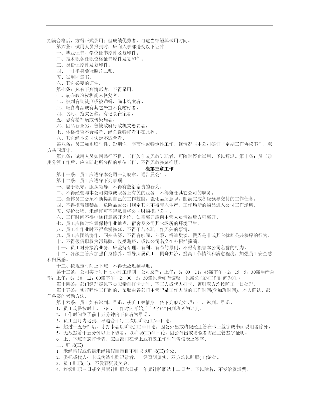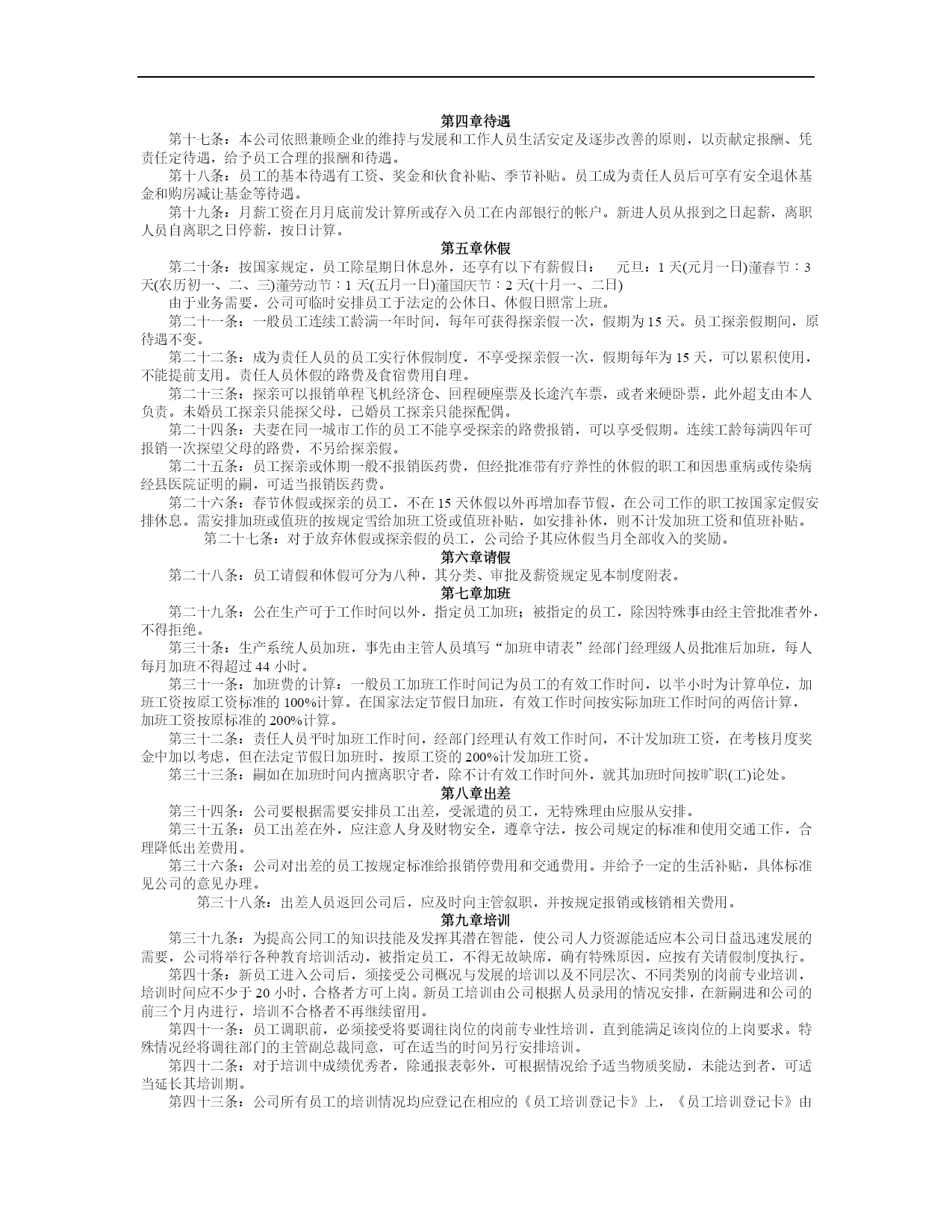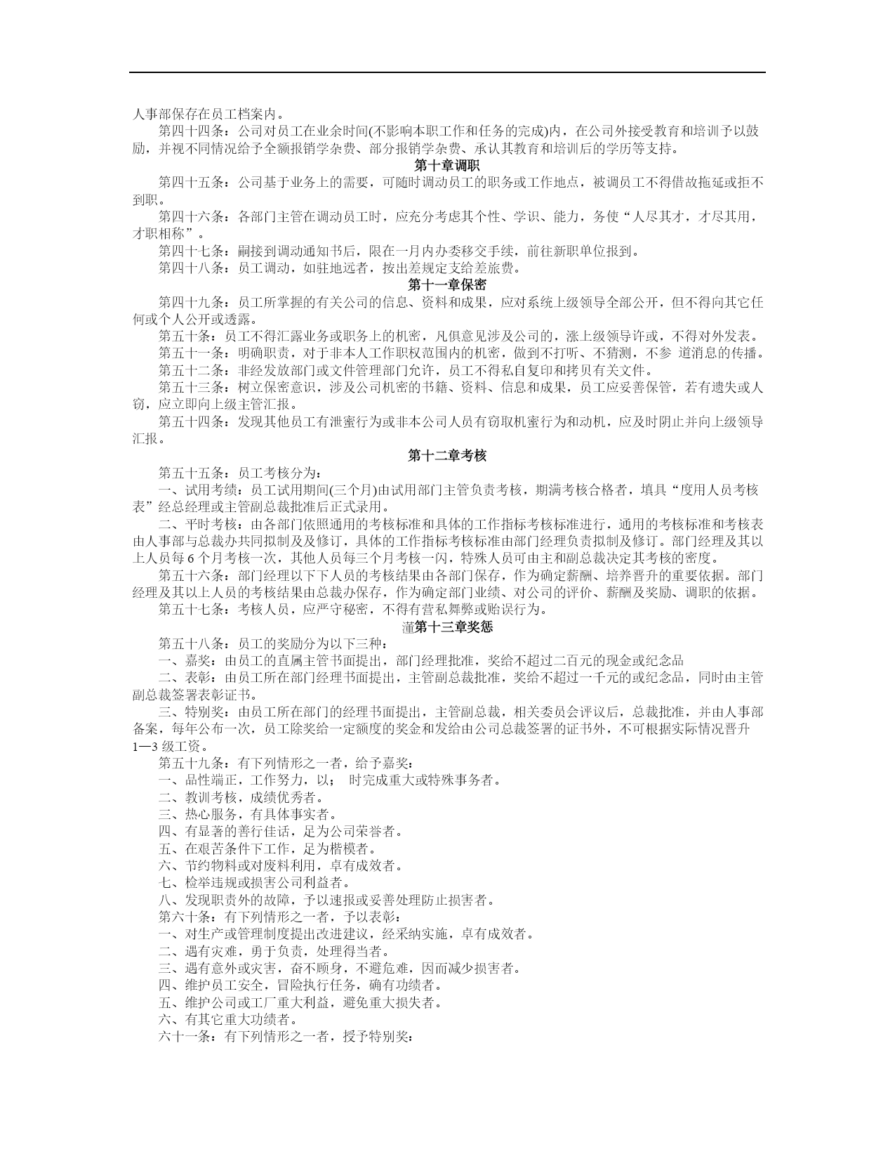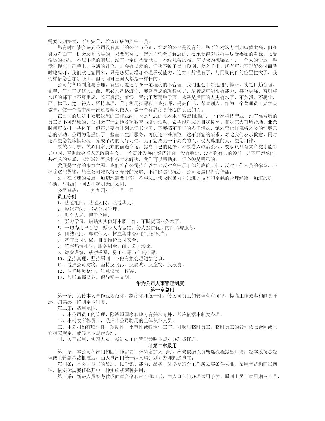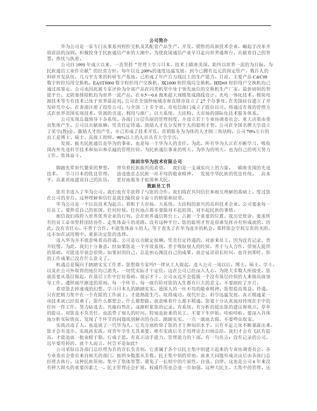 公司简介华为公司是一家专门从事系列程控交机及其配套产品生产、开发、销售的高新技术企业,崛起于改革开放前沿的深圳,积极投身于民族通信产业的大潮中,为使我国通信产业早日走向世界通舞台,贡献着自己的智慧、热忱与执着。公司自1998年成立以来,一直坚持“管理上学习日本,技术上瞄准美国,始终以世界一流的为目标,为民族通信工业作贡献”的经营方针,每年以近200%的速度迅猛发展,到今已拥有近元的固定资产,数百人的科研开发队伍,几万平方米的科研生产基地,已形成了年产百万线以上的生产能力。目前,主要产品C&C08数字程控局用交换机、EAST8000数字程控用户交换机、JK1000程控端局交换机、HJD48程控用户交换机均已通过部鉴定,公司也因此被专家评价为全部产品在同类机型中处于领先地位的交换机生产厂家,最新研制的智能平台、无阴塞排除机均为世界一流产品,在0.5—0.6微米超大规模集成路线设计、光电一体化技术、模块电源技术等专有技术已处于世界最前列。公司在全国秒地城市和直辖市设立了27个办事处,在美国硅谷建立了开发研究中心,在香港注册了投资公司,与全国二十多个省、市电信部门成立了股份以司。将通过有效的管理方式在世界范围实现技术、资源的引进、利用与推广,以大系统、大结构、大市场的国际化技术服务体系。公司实现总裁领导下各系统、各部门分层负丽的管理制度,并设立若干专业协调委员会,重大决策由委员集体产生。公司以贡献报酬,凭责任定待遇,鼓励人才充分发挥个人的聪明才智。公司在全国名牌大学设立了奖学(教)金,激励人才的产生,并已形成了技术开发、营销服务为为体的人才倒三角结构,公司70%左右的员工是博士、硕士、高级工程师,90%以上的人员具有大学学历。发展、振光民族通信是华为的事业,也是每一个华为人的责任。为此,所有华为人正在不断学习、吸收国内外先进科学技术和知识和卓越的管理经验,为民族通信事业的明天,为华为的明天,也为自己的明天努力工作、集体奋斗。深圳市华为技术有限公司脚踏先辈世代繁荣的梦想,背负着民族振兴的希望,我们是一支诚实向上的力量。瞄准美国的先进技术,学习日本的优良管理,溶进德意志民族一丝不苟的敬业精神,发展中华民族的优良传统。高水平,高素质地建设自己的队伍,更好地服务于祖国和人民。致新员工书您有幸进入了华为公司。我们也有幸获得了与您的合作。我们将在共同信任和相互理解的基础上,度过您在公司的岁月。这种理解和信任是我们愉快奋斗奋斗的桥梁和纽带。华为公司是一个以高技术为起点,着眼于大市场、大系统、大结构的新兴的高科技术企业。公司要求每一位员工,要热爱自己的祖国,任何时候、任何地点都不要做对不起祖国、对不起民族的事情。相信我们将跨入世界优秀企业的行列,会在世界通信舞台上,占据一个重要的位置。我历史使命,要求所有的员工必须坚持团结协作,走集体奋斗的道路。没有这种平台,您的聪明才智是很难发挥并有所成就的。因此,没有责任心,不善于合作,不能集体奋斗的人,等于丧失了在华为进步的机会。那样您会空耗宝贵的光阴,还不如在试用期中,重新决定您的选择。进入华为并不就意味着高待遇,公司是以贡献定报酬,凭责任定待遇的,对新来员工,因为没有记录,晋升较慢,为此,我们十分兼意。但如果您是一个开放系统,善于吸取别人的经验,善于与人合作,借别人提供的基础,可能进步就会很快。如果封闭自己,总是担心淹没自己的成果,就会延误很长时间,也许到那时,你的工作成果已没有什么意义了。机遇总是偏向于踏踏实实工作者。您想做专家吗?一律从工人做起,进入公司一周以后,博士、硕士、学士,以及在公司外取得的地位均已消失,一切凭实际才干定位,这在公司已经深入人心,为绝大多数人所接受。您就需要从基层做起,在基层工作中打好基础、展示才干。公司永远不会提拔一个没有基层经验的人来做高级领导工作。遵照循序渐进的原则,每一个环节、每一级台阶对您的人生都有巨大的意义。不要蹉跎了岁月。希望您丢掉速成的幻想,学习日本人的踏踏实实,德国人的一丝不苟的敬业精神。您想提高效益、待遇,只有把精力集中在一个有限的工作面上,才能熟能生巧,取得成功。现代社会,科学迅猛发展,真正精通某一项技术就已经很难了,您什么都想会、什么都想做,就意味着什么都不精通。您要十分认真地对待现在手中的任何一件工作,努力钻进去,兴趣自然在。逐渐积累您的记录。有系统、有分析的提出您的建议和观点。草率的提议,对您是不负责任,也浪费了别人的时间,特别是新来的员工,不要下车伊始,哇啦哇啦。要深入具体地分析实际情况,发现了个环节的问题找到解决的办法,踏踏实实、一点一滴地去做,不要哗众取宠。实践改造了人,也造就了一代华为人,它充分地检验了您的才干和知识水平。只有不足之处不断暴露出来,您才会有进步。实践再实践,对青年学生尤其重要。唯有实践后关于用理论去归纳总结,我们
