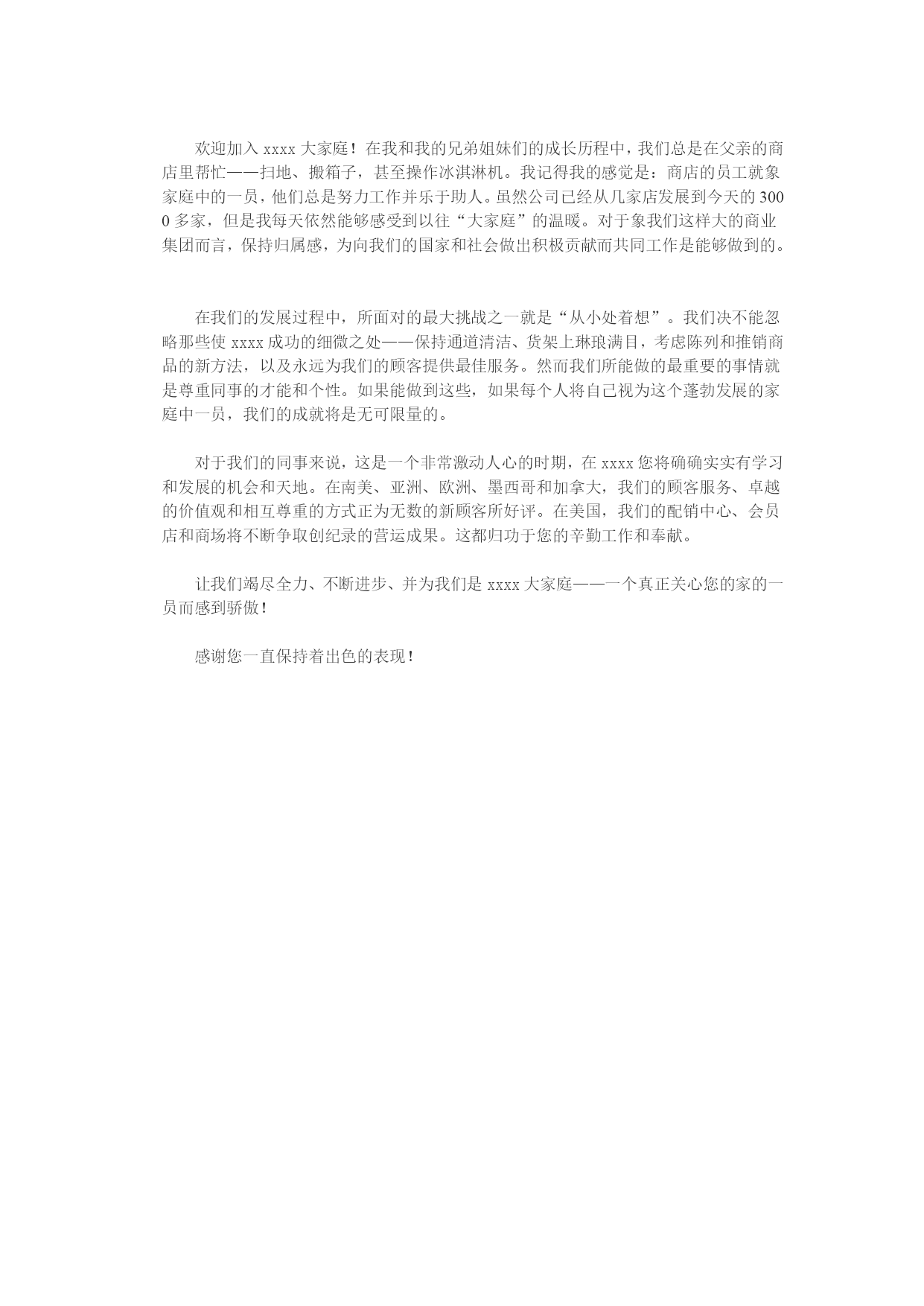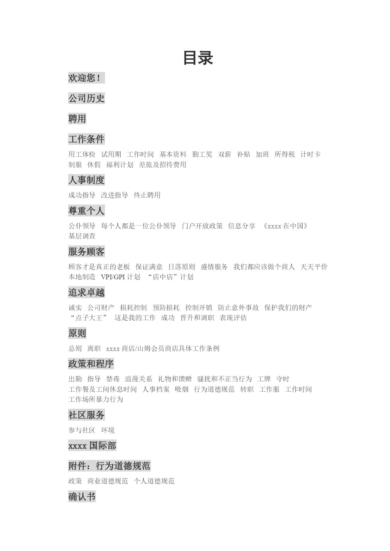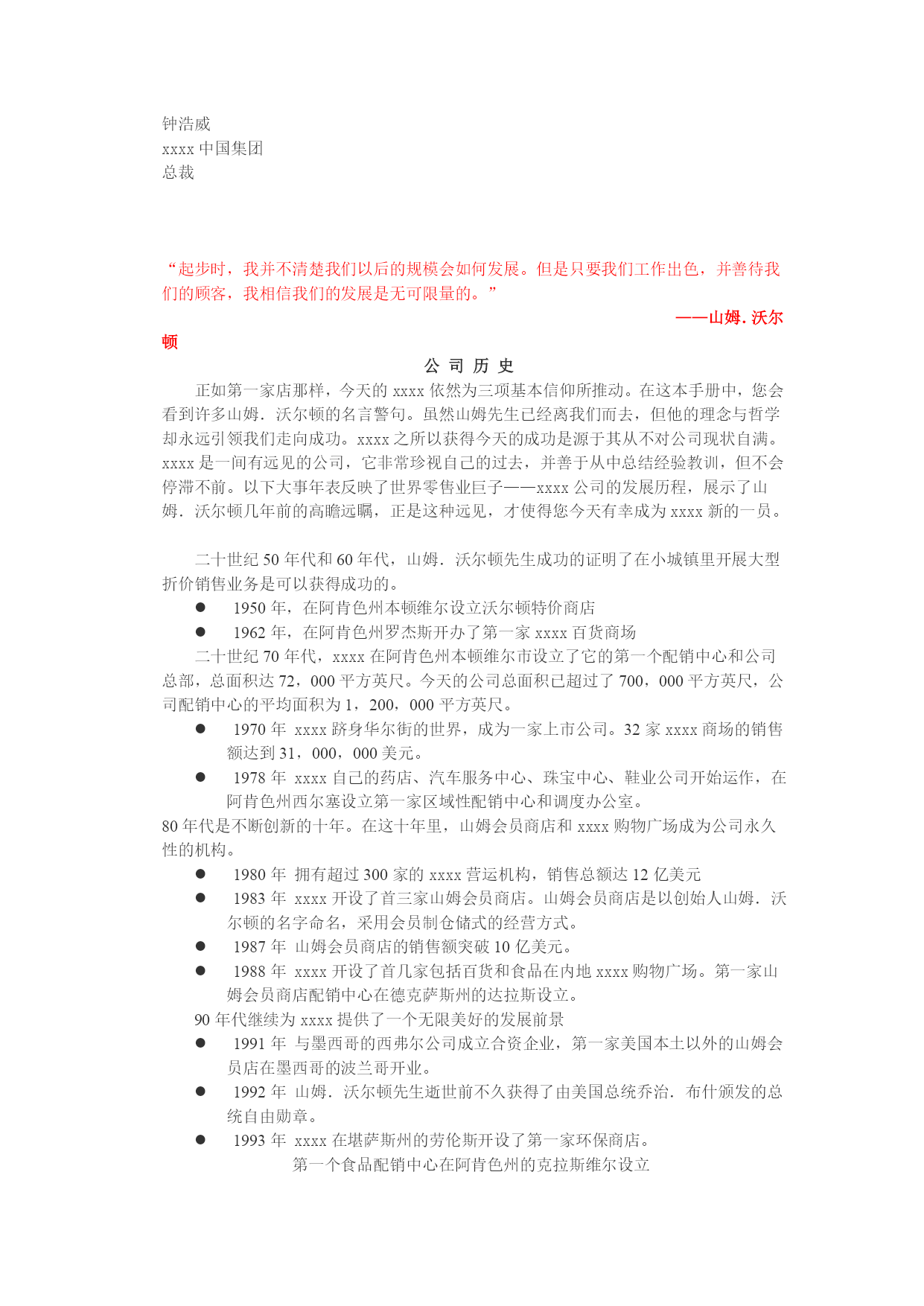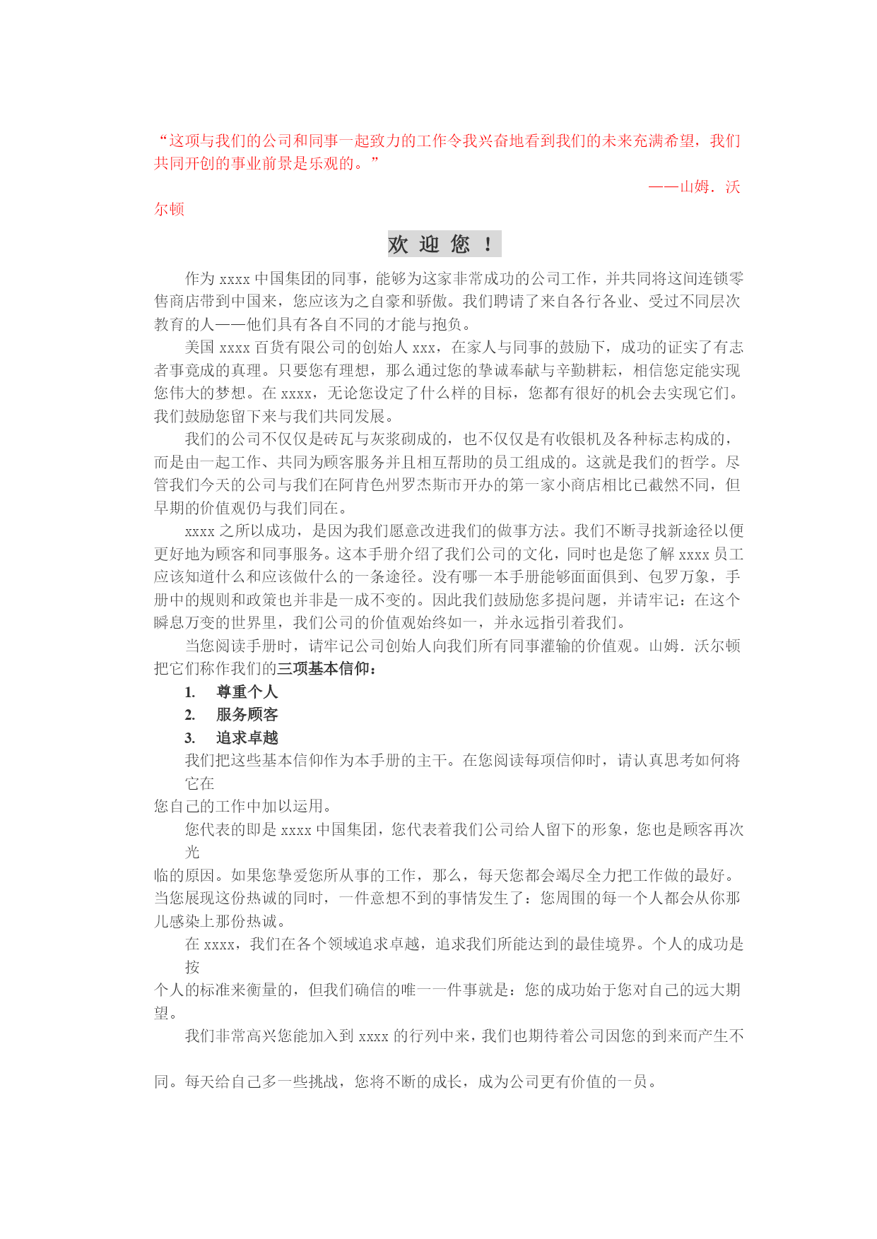 xxxx中国集团xxx员工手册(全职员工)欢迎加入xxxx大家庭!在我和我的兄弟姐妹们的成长历程中,我们总是在父亲的商店里帮忙——扫地、搬箱子,甚至操作冰淇淋机。我记得我的感觉是:商店的员工就象家庭中的一员,他们总是努力工作并乐于助人。虽然公司已经从几家店发展到今天的3000多家,但是我每天依然能够感受到以往“大家庭”的温暖。对于象我们这样大的商业集团而言,保持归属感,为向我们的国家和社会做出积极贡献而共同工作是能够做到的。在我们的发展过程中,所面对的最大挑战之一就是“从小处着想”。我们决不能忽略那些使xxxx成功的细微之处——保持通道清洁、货架上琳琅满目,考虑陈列和推销商品的新方法,以及永远为我们的顾客提供最佳服务。然而我们所能做的最重要的事情就是尊重同事的才能和个性。如果能做到这些,如果每个人将自己视为这个蓬勃发展的家庭中一员,我们的成就将是无可限量的。对于我们的同事来说,这是一个非常激动人心的时期,在xxxx您将确确实实有学习和发展的机会和天地。在南美、亚洲、欧洲、墨西哥和加拿大,我们的顾客服务、卓越的价值观和相互尊重的方式正为无数的新顾客所好评。在美国,我们的配销中心、会员店和商场将不断争取创纪录的营运成果。这都归功于您的辛勤工作和奉献。让我们竭尽全力、不断进步、并为我们是xxxx大家庭——一个真正关心您的家的一员而感到骄傲!感谢您一直保持着出色的表现!目录欢迎您!公司历史聘用工作条件用工体检试用期工作时间基本资料勤工奖双薪补贴加班所得税计时卡制服休假福利计划差旅及招待费用人事制度成功指导改进指导终止聘用尊重个人公仆领导每个人都是一位公仆领导门户开放政策信息分享《xxxx在中国》基层调查服务顾客顾客才是真正的老板保证满意日落原则盛情服务我们都应该做个商人天天平价本地制造VPI/GPI计划“店中店”计划追求卓越诚实公司财产损耗控制预防损耗控制开销防止意外事故保护我们的财产“点子大王”这是我的工作成功晋升和调职表现评估原则总则离职xxxx商店/山姆会员商店具体工作条例政策和程序出勤指导禁毒浪漫关系礼物和馈赠骚扰和不正当行为工牌守时工作餐及工间休息时间人事档案吸烟行为道德规范转职工作服工作时间工作场所暴力行为社区服务参与社区环境xxxx国际部附件:行为道德规范政策商业道德规范个人道德规范确认书“这项与我们的公司和同事一起致力的工作令我兴奋地看到我们的未来充满希望,我们共同开创的事业前景是乐观的。”——山姆.沃尔顿欢迎您!作为xxxx中国集团的同事,能够为这家非常成功的公司工作,并共同将这间连锁零售商店带到中国来,您应该为之自豪和骄傲。我们聘请了来自各行各业、受过不同层次教育的人——他们具有各自不同的才能与抱负。美国xxxx百货有限公司的创始人xxx,在家人与同事的鼓励下,成功的证实了有志者事竟成的真理。只要您有理想,那么通过您的挚诚奉献与辛勤耕耘,相信您定能实现您伟大的梦想。在xxxx,无论您设定了什么样的目标,您都有很好的机会去实现它们。我们鼓励您留下来与我们共同发展。我们的公司不仅仅是砖瓦与灰浆砌成的,也不仅仅是有收银机及各种标志构成的,而是由一起工作、共同为顾客服务并且相互帮助的员工组成的。这就是我们的哲学。尽管我们今天的公司与我们在阿肯色州罗杰斯市开办的第一家小商店相比已截然不同,但早期的价值观仍与我们同在。xxxx之所以成功,是因为我们愿意改进我们的做事方法。我们不断寻找新途径以便更好地为顾客和同事服务。这本手册介绍了我们公司的文化,同时也是您了解xxxx员工应该知道什么和应该做什么的一条途径。没有哪一本手册能够面面俱到、包罗万象,手册中的规则和政策也并非是一成不变的。因此我们鼓励您多提问题,并请牢记:在这个瞬息万变的世界里,我们公司的价值观始终如一,并永远指引着我们。当您阅读手册时,请牢记公司创始人向我们所有同事灌输的价值观。山姆.沃尔顿把它们称作我们的三项基本信仰:1.尊重个人2.服务顾客3.追求卓越我们把这些基本信仰作为本手册的主干。在您阅读每项信仰时,请认真思考如何将它在您自己的工作中加以运用。您代表的即是xxxx中国集团,您代表着我们公司给人留下的形象,您也是顾客再次光临的原因。如果您挚爱您所从事的工作,那么,每天您都会竭尽全力把工作做的最好。当您展现这份热诚的同时,一件意想不到的事情发生了:您周围的每一个人都会从你那儿感染上那份热诚。在xxxx,我们在各个领域追求卓越,追求我们所能达到的最佳境界。个人的成功是按个人的标准来衡量的,但我们确信的唯一一件事就是:您的成功始于您对自己的远大期望。我们非常高兴您能加入到xxxx的行列中来,我们也期待着公司因您的到来而产生不同。每天给自己多一些挑战,您将不断的成长,成为公司更有价值的一员。钟浩威xxxx中国集团总裁“起步时,我并不清楚我们以后的规模会如何发展。但是