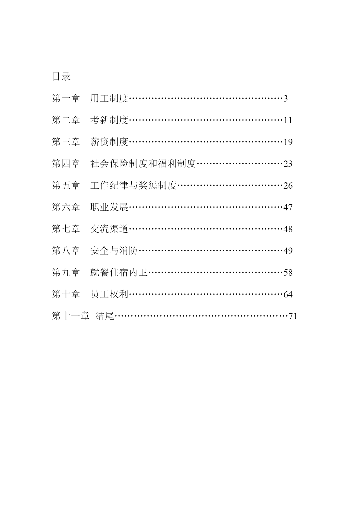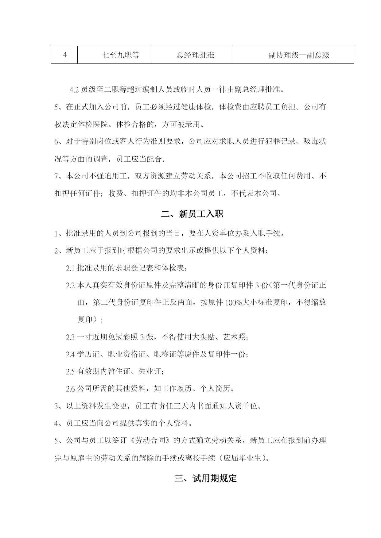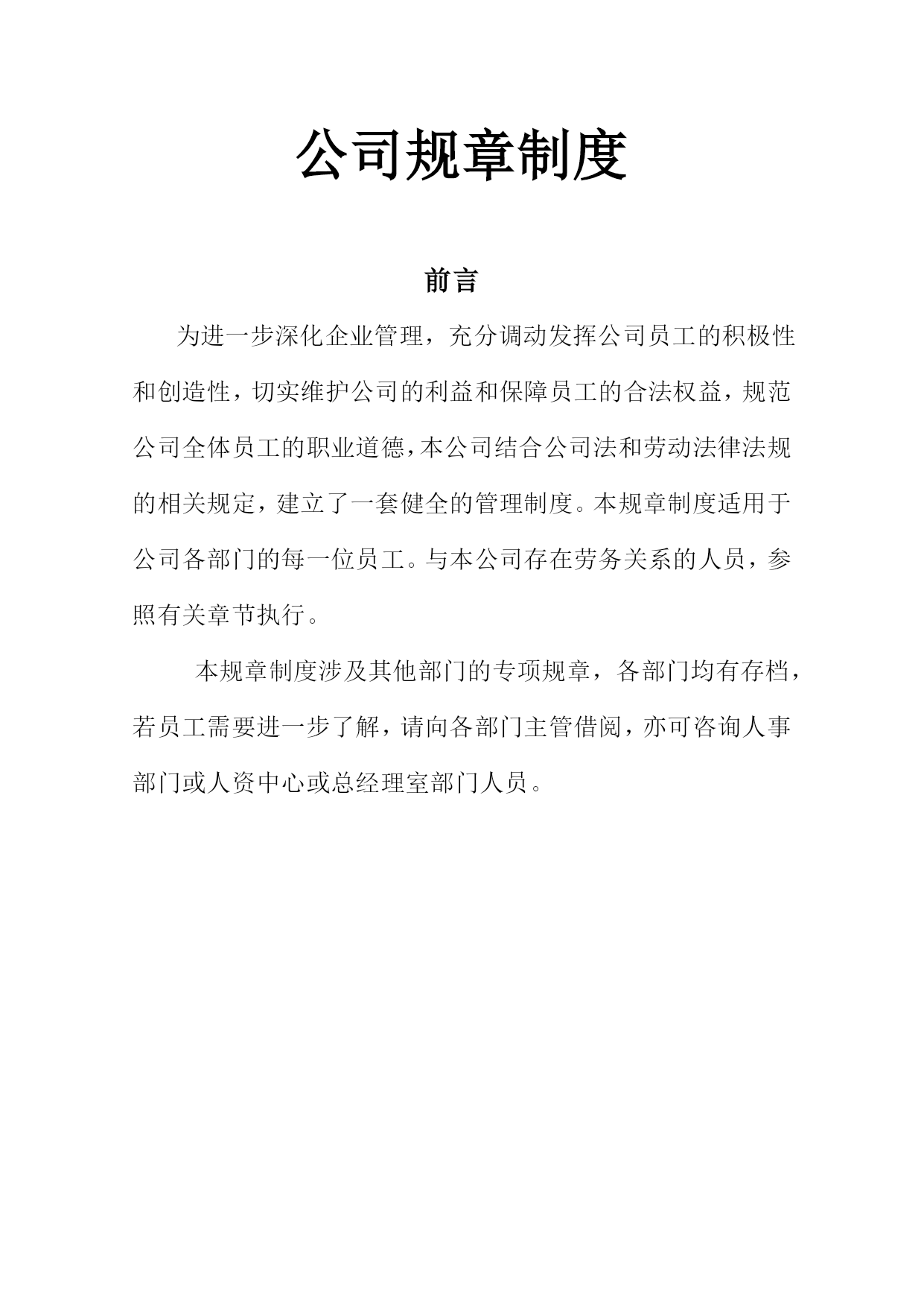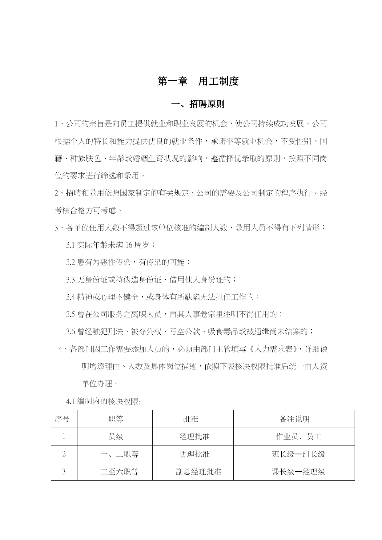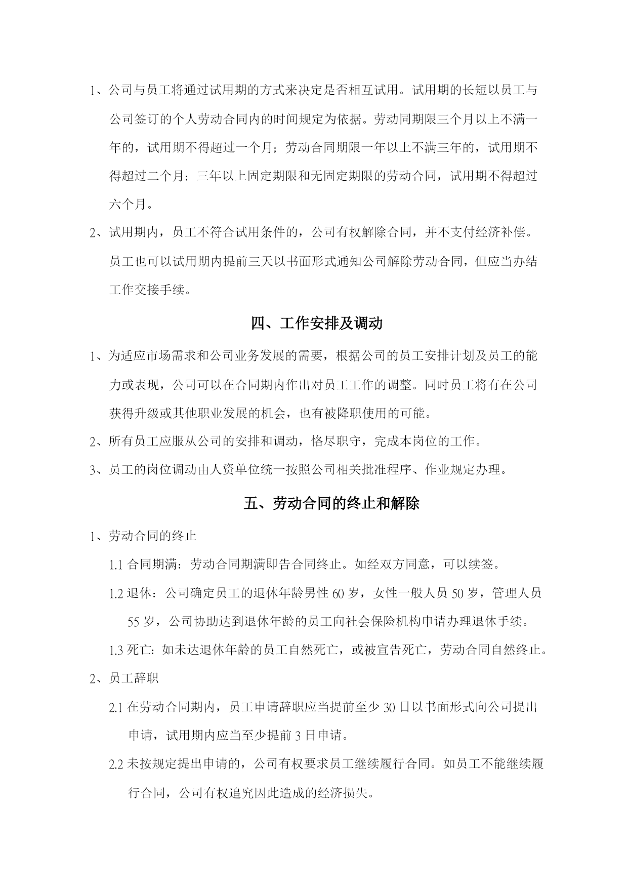 公司规章制度前言为进一步深化企业管理,充分调动发挥公司员工的积极性和创造性,切实维护公司的利益和保障员工的合法权益,规范公司全体员工的职业道德,本公司结合公司法和劳动法律法规的相关规定,建立了一套健全的管理制度。本规章制度适用于公司各部门的每一位员工。与本公司存在劳务关系的人员,参照有关章节执行。本规章制度涉及其他部门的专项规章,各部门均有存档,若员工需要进一步了解,请向各部门主管借阅,亦可咨询人事部门或人资中心或总经理室部门人员。目录用工制度…………………………………………3考新制度…………………………………………11薪资制度…………………………………………19社会保险制度和福利制度………………………23工作纪律与奖惩制度……………………………26职业发展…………………………………………47交流渠道…………………………………………48安全与消防………………………………………49就餐住宿内卫……………………………………58员工权利…………………………………………64结尾………………………………………………71第一章用工制度一、招聘原则1、公司的宗旨是向员工提供就业和职业发展的机会,使公司持续成功发展,公司根据个人的特长和能力提供优良的就业条件,承诺平等就业机会,不受性别、国籍、种族肤色、年龄或婚姻生育状况的影响,遵循择优录取的原则,按照不同岗位的要求进行筛选和录用。2、招聘和录用依照国家制定的有关规定、公司的需要及公司制定的程序执行。经考核合格方可考虑。3、各单位任用人数不得超过该单位核准的编制人数,录用人员不得有下列情形:3.1实际年龄未满16周岁;3.2患有为恶性传染,有传染的可能;3.3无身份证或持伪造身份证、借用他人身份证的;3.4精神或心理不健全,或身体有所缺陷无法担任工作的;3.5曾在公司服务之离职人员,再其人事卷宗里注明不得任用的;3.6曾经触犯刑法、被夺公权、亏空公款、吸食毒品或被通缉尚未结案的;4、各部门因工作需要添加人员的,必须由部门主管填写《人力需求表》,详细说明增添理由、人数及具体岗位描述,依照下表核决权限批准后统一由人资单位办理。4.1编制内的核决权限:序号职等批准备注说明1员级经理批准作业员、员工2一、二职等协理批准班长级—组长级3三至六职等副总经理批准课长级—经理级4七至九职等总经理批准副协理级—副总级4.2员级至二职等超过编制人员或临时人员一律由副总经理批准。5、在正式加入公司前,员工必须经过健康体检,体检费由应聘员工负担。公司有权决定体检医院。体检合格的,方可被录用。6、对于特别岗位或客人行为准则要求,公司应对求职人员进行犯罪记录、吸毒状况等方面的调查,员工应当配合。7、本公司不强迫用工,双方资源建立劳动关系,本公司招工不收取任何费用、不扣押任何证件;收费、扣押证件的均非本公司员工,不代表本公司。二、新员工入职1、批准录用的人员到公司报到的当日,要在人资单位办妥入职手续。2、新员工应于报到时根据公司的要求出示或提供以下个人资料:2.1批准录用的求职登记表和体检表;2.2本人真实有效身份证原件及完整清晰的身份证复印件3份(第一代身份证正面,第二代身份证复印件正反两面,按原件100%大小标准复印,不得缩放复印);2.3一寸近期免冠彩照3张,不得使用大头贴、艺术照;2.4学历证、职业资格证、职称证等原件及复印件一份;2.5有效期内暂住证、失业证;2.6公司所需的其他资料,如工作履历、个人简历。3、以上资料发生变更,员工有责任三天内书面通知人资单位。4、员工应当向公司提供真实的个人资料。5、公司与员工以签订《劳动合同》的方式确立劳动关系。新员工应在报到前办理完与原雇主的劳动关系的解除的手续或离校手续(应届毕业生)。三、试用期规定1、公司与员工将通过试用期的方式来决定是否相互试用。试用期的长短以员工与公司签订的个人劳动合同内的时间规定为依据。劳动同期限三个月以上不满一年的,试用期不得超过一个月;劳动合同期限一年以上不满三年的,试用期不得超过二个月;三年以上固定期限和无固定期限的劳动合同,试用期不得超过六个月。2、试用期内,员工不符合试用条件的,公司有权解除合同,并不支付经济补偿。员工也可以试用期内提前三天以书面形式通知公司解除劳动合同,但应当办结工作交接手续。四、工作安排及调动1、为适应市场需求和公司业务发展的需要,根据公司的员工安排计划及员工的能力或表现,公司可以在合同期内作出对员工工作的调整。同时员工将有在公司获得升级或其他职业发展的机会,也有被降职使用的可能。2、所有员工应服从公司的安排和调动,恪尽职守,完成本岗位的工作。3、员工的岗位调动由人资单位统一按照公司相关批准程序、作业规定办理。五、劳动合同的终止和解除1、劳动合同的终止1.1合同期满:劳动合同期满即告合同终止。如经双方同意,可以续签。1