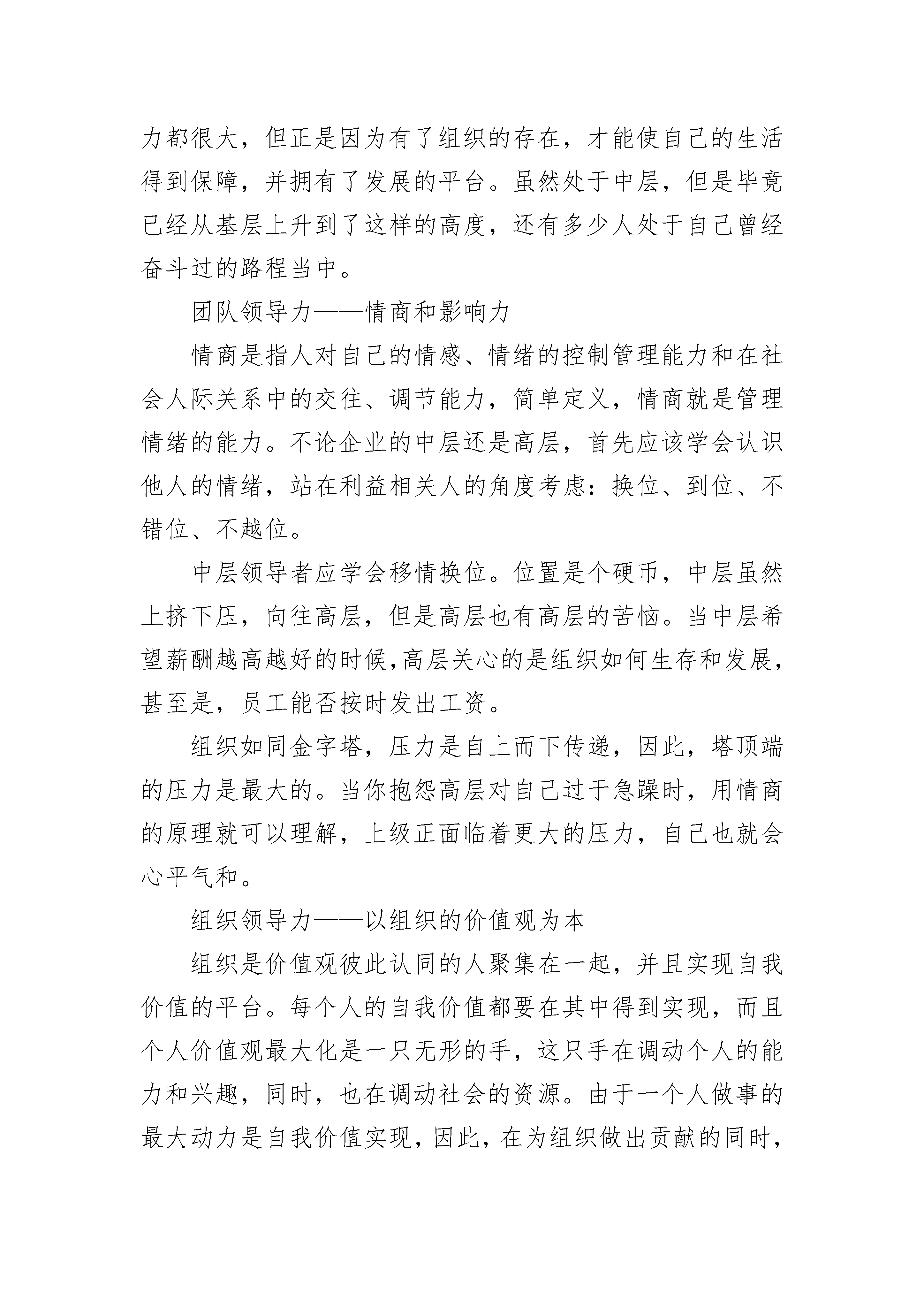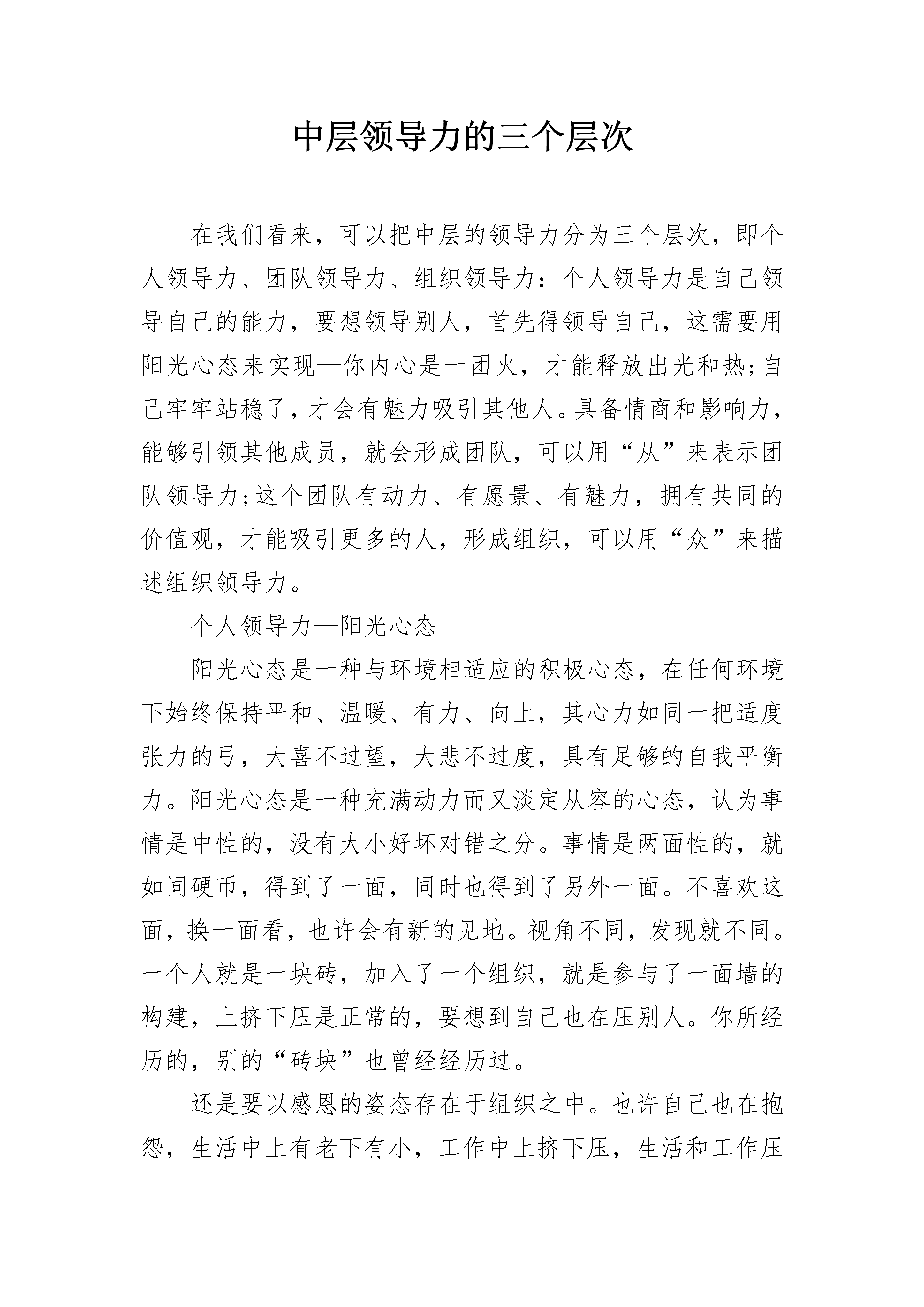 中层领导力的三个层次在我们看来,可以把中层的领导力分为三个层次,即个人领导力、团队领导力、组织领导力:个人领导力是自己领导自己的能力,要想领导别人,首先得领导自己,这需要用阳光心态来实现—你内心是一团火,才能释放出光和热;自己牢牢站稳了,才会有魅力吸引其他人。具备情商和影响力,能够引领其他成员,就会形成团队,可以用“从”来表示团队领导力;这个团队有动力、有愿景、有魅力,拥有共同的价值观,才能吸引更多的人,形成组织,可以用“众”来描述组织领导力。个人领导力—阳光心态阳光心态是一种与环境相适应的积极心态,在任何环境下始终保持平和、温暖、有力、向上,其心力如同一把适度张力的弓,大喜不过望,大悲不过度,具有足够的自我平衡力。阳光心态是一种充满动力而又淡定从容的心态,认为事情是中性的,没有大小好坏对错之分。事情是两面性的,就如同硬币,得到了一面,同时也得到了另外一面。不喜欢这面,换一面看,也许会有新的见地。视角不同,发现就不同。一个人就是一块砖,加入了一个组织,就是参与了一面墙的构建,上挤下压是正常的,要想到自己也在压别人。你所经历的,别的“砖块”也曾经经历过。还是要以感恩的姿态存在于组织之中。也许自己也在抱怨,生活中上有老下有小,工作中上挤下压,生活和工作压力都很大,但正是因为有了组织的存在,才能使自己的生活得到保障,并拥有了发展的平台。虽然处于中层,但是毕竟已经从基层上升到了这样的高度,还有多少人处于自己曾经奋斗过的路程当中。团队领导力——情商和影响力情商是指人对自己的情感、情绪的控制管理能力和在社会人际关系中的交往、调节能力,简单定义,情商就是管理情绪的能力。不论企业的中层还是高层,首先应该学会认识他人的情绪,站在利益相关人的角度考虑:换位、到位、不错位、不越位。中层领导者应学会移情换位。位置是个硬币,中层虽然上挤下压,向往高层,但是高层也有高层的苦恼。当中层希望薪酬越高越好的时候,高层关心的是组织如何生存和发展,甚至是,员工能否按时发出工资。组织如同金字塔,压力是自上而下传递,因此,塔顶端的压力是最大的。当你抱怨高层对自己过于急躁时,用情商的原理就可以理解,上级正面临着更大的压力,自己也就会心平气和。组织领导力——以组织的价值观为本组织是价值观彼此认同的人聚集在一起,并且实现自我价值的平台。每个人的自我价值都要在其中得到实现,而且个人价值观最大化是一只无形的手,这只手在调动个人的能力和兴趣,同时,也在调动社会的资源。由于一个人做事的最大动力是自我价值实现,因此,在为组织做出贡献的同时,自己也在直接或间接地,利用组织来实现自我价值。你能走多远,取决于与谁同行。通俗地说,就是“跟着狼吃肉,跟着狗喝汤”。与组织的价值观一致,才会获得高层的信任,才能获得更多任务委派,能力才会得到提升。如果能力和价值观符合组织和高层的要求,自然就会晋升到高层的位置—这是在一个规范的组织中升迁的路径。