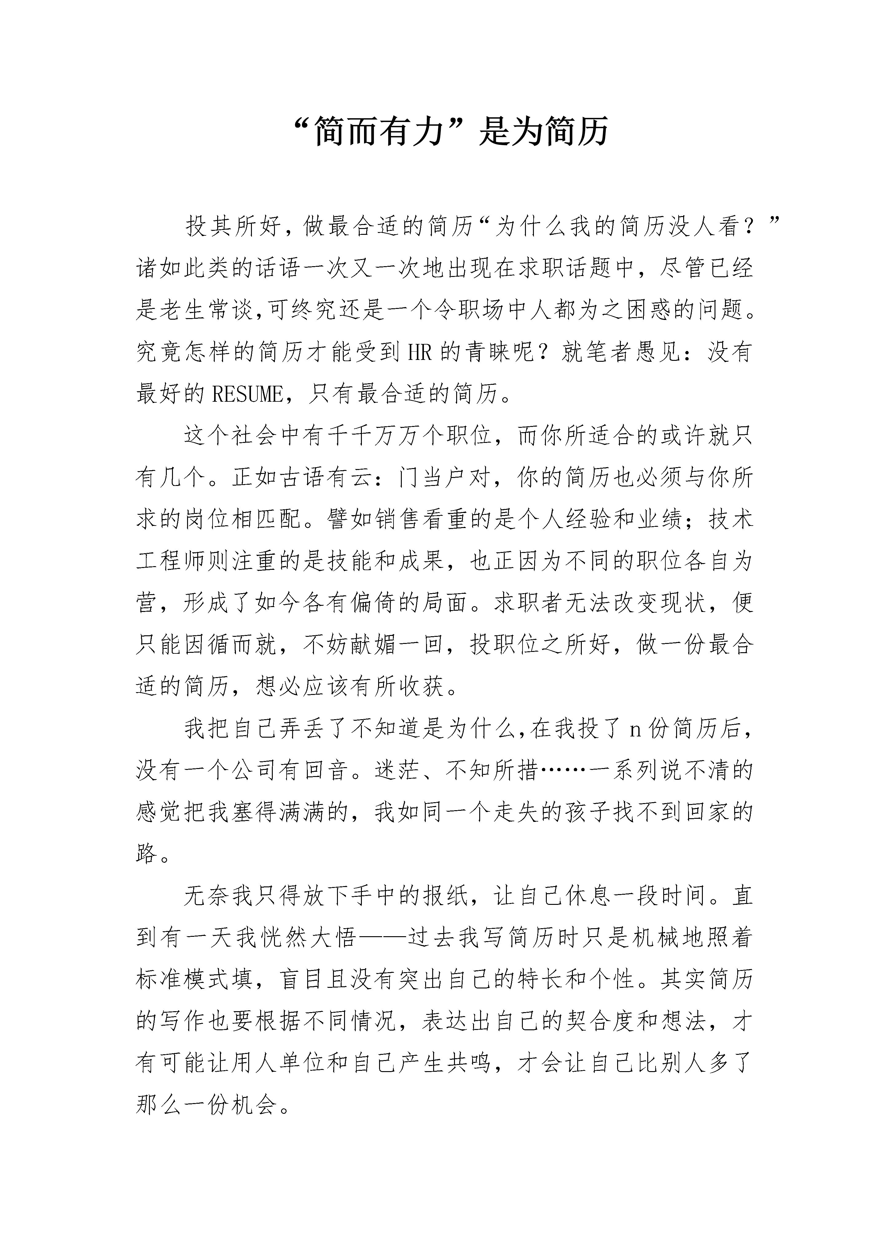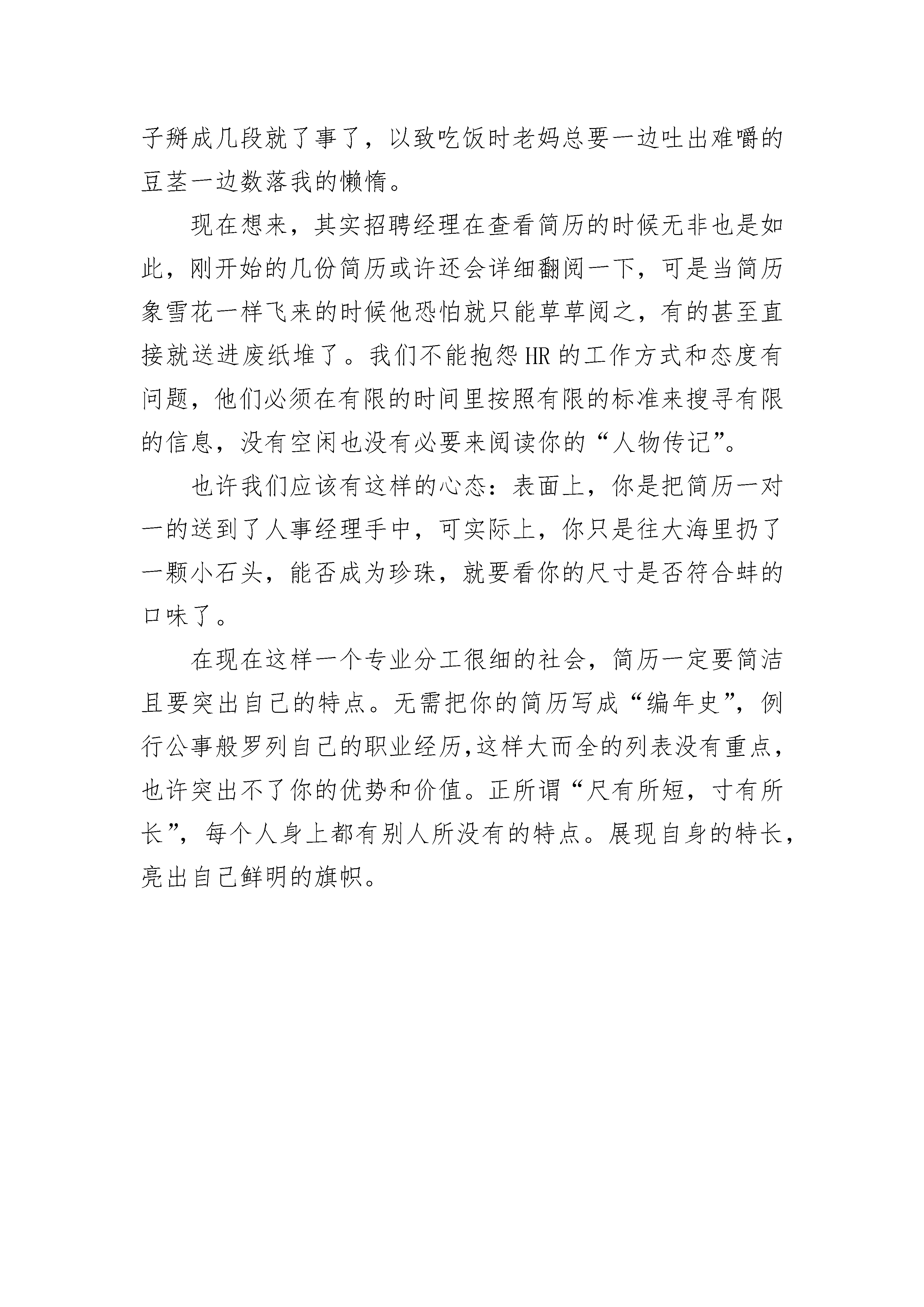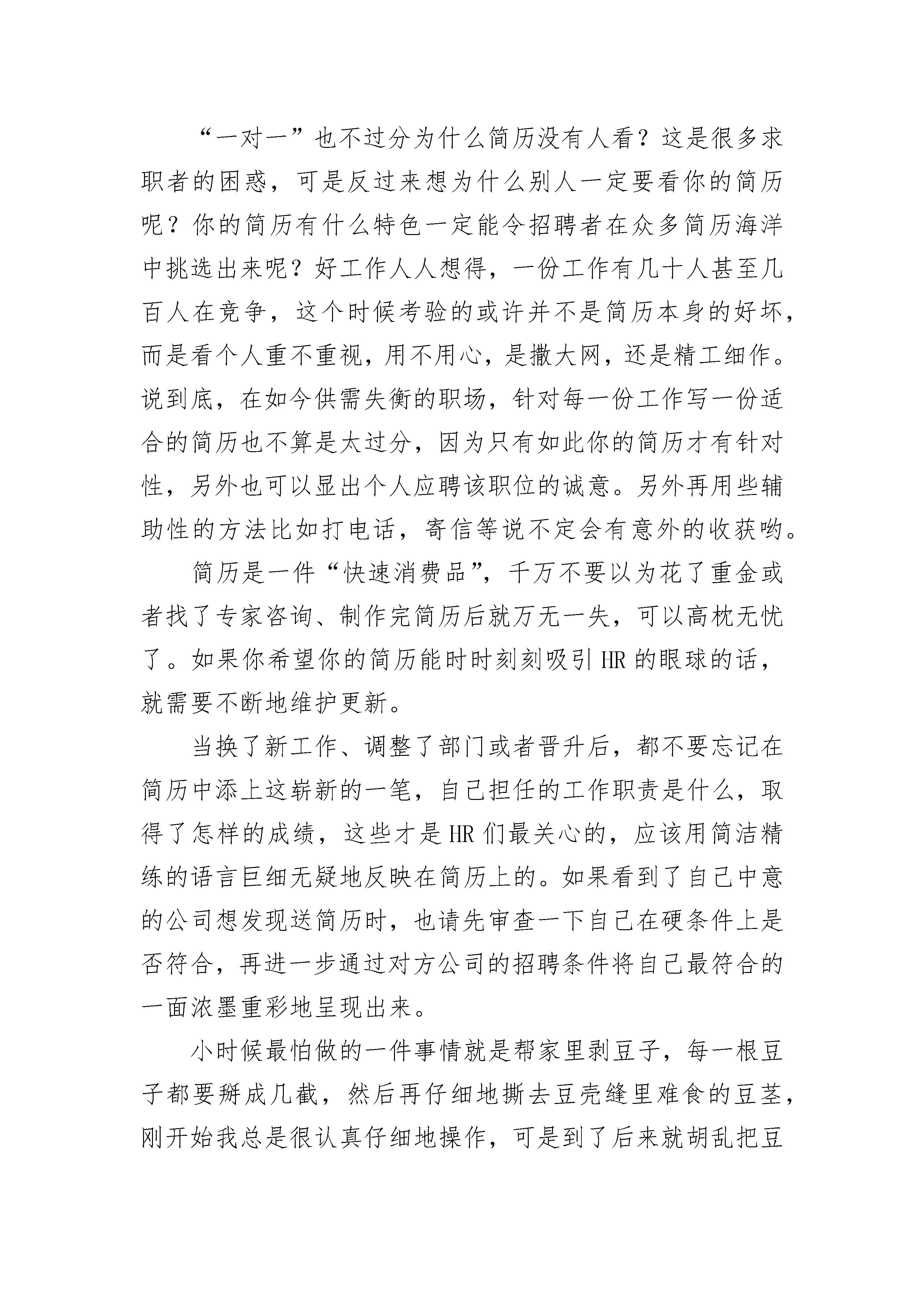 “简而有力”是为简历投其所好,做最合适的简历“为什么我的简历没人看?”诸如此类的话语一次又一次地出现在求职话题中,尽管已经是老生常谈,可终究还是一个令职场中人都为之困惑的问题。究竟怎样的简历才能受到HR的青睐呢?就笔者愚见:没有最好的RESUME,只有最合适的简历。这个社会中有千千万万个职位,而你所适合的或许就只有几个。正如古语有云:门当户对,你的简历也必须与你所求的岗位相匹配。譬如销售看重的是个人经验和业绩;技术工程师则注重的是技能和成果,也正因为不同的职位各自为营,形成了如今各有偏倚的局面。求职者无法改变现状,便只能因循而就,不妨献媚一回,投职位之所好,做一份最合适的简历,想必应该有所收获。我把自己弄丢了不知道是为什么,在我投了n份简历后,没有一个公司有回音。迷茫、不知所措……一系列说不清的感觉把我塞得满满的,我如同一个走失的孩子找不到回家的路。无奈我只得放下手中的报纸,让自己休息一段时间。直到有一天我恍然大悟——过去我写简历时只是机械地照着标准模式填,盲目且没有突出自己的特长和个性。其实简历的写作也要根据不同情况,表达出自己的契合度和想法,才有可能让用人单位和自己产生共鸣,才会让自己比别人多了那么一份机会。“一对一”也不过分为什么简历没有人看?这是很多求职者的困惑,可是反过来想为什么别人一定要看你的简历呢?你的简历有什么特色一定能令招聘者在众多简历海洋中挑选出来呢?好工作人人想得,一份工作有几十人甚至几百人在竞争,这个时候考验的或许并不是简历本身的好坏,而是看个人重不重视,用不用心,是撒大网,还是精工细作。说到底,在如今供需失衡的职场,针对每一份工作写一份适合的简历也不算是太过分,因为只有如此你的简历才有针对性,另外也可以显出个人应聘该职位的诚意。另外再用些辅助性的方法比如打电话,寄信等说不定会有意外的收获哟。简历是一件“快速消费品”,千万不要以为花了重金或者找了专家咨询、制作完简历后就万无一失,可以高枕无忧了。如果你希望你的简历能时时刻刻吸引HR的眼球的话,就需要不断地维护更新。当换了新工作、调整了部门或者晋升后,都不要忘记在简历中添上这崭新的一笔,自己担任的工作职责是什么,取得了怎样的成绩,这些才是HR们最关心的,应该用简洁精练的语言巨细无疑地反映在简历上的。如果看到了自己中意的公司想发现送简历时,也请先审查一下自己在硬条件上是否符合,再进一步通过对方公司的招聘条件将自己最符合的一面浓墨重彩地呈现出来。小时候最怕做的一件事情就是帮家里剥豆子,每一根豆子都要掰成几截,然后再仔细地撕去豆壳缝里难食的豆茎,刚开始我总是很认真仔细地操作,可是到了后来就胡乱把豆子掰成几段就了事了,以致吃饭时老妈总要一边吐出难嚼的豆茎一边数落我的懒惰。现在想来,其实招聘经理在查看简历的时候无非也是如此,刚开始的几份简历或许还会详细翻阅一下,可是当简历象雪花一样飞来的时候他恐怕就只能草草阅之,有的甚至直接就送进废纸堆了。我们不能抱怨HR的工作方式和态度有问题,他们必须在有限的时间里按照有限的标准来搜寻有限的信息,没有空闲也没有必要来阅读你的“人物传记”。也许我们应该有这样的心态:表面上,你是把简历一对一的送到了人事经理手中,可实际上,你只是往大海里扔了一颗小石头,能否成为珍珠,就要看你的尺寸是否符合蚌的口味了。在现在这样一个专业分工很细的社会,简历一定要简洁且要突出自己的特点。无需把你的简历写成“编年史”,例行公事般罗列自己的职业经历,这样大而全的列表没有重点,也许突出不了你的优势和价值。正所谓“尺有所短,寸有所长”,每个人身上都有别人所没有的特点。展现自身的特长,亮出自己鲜明的旗帜。