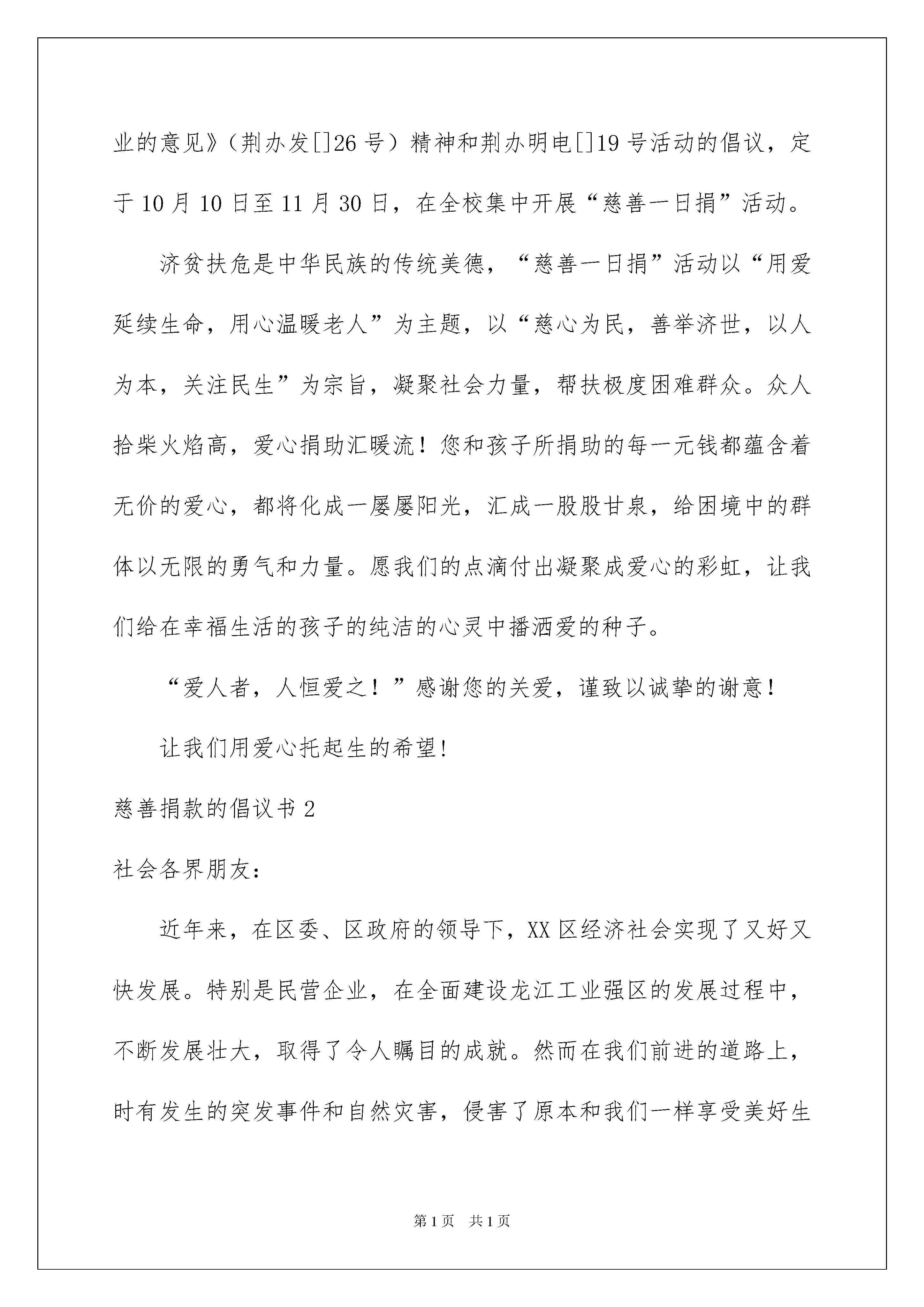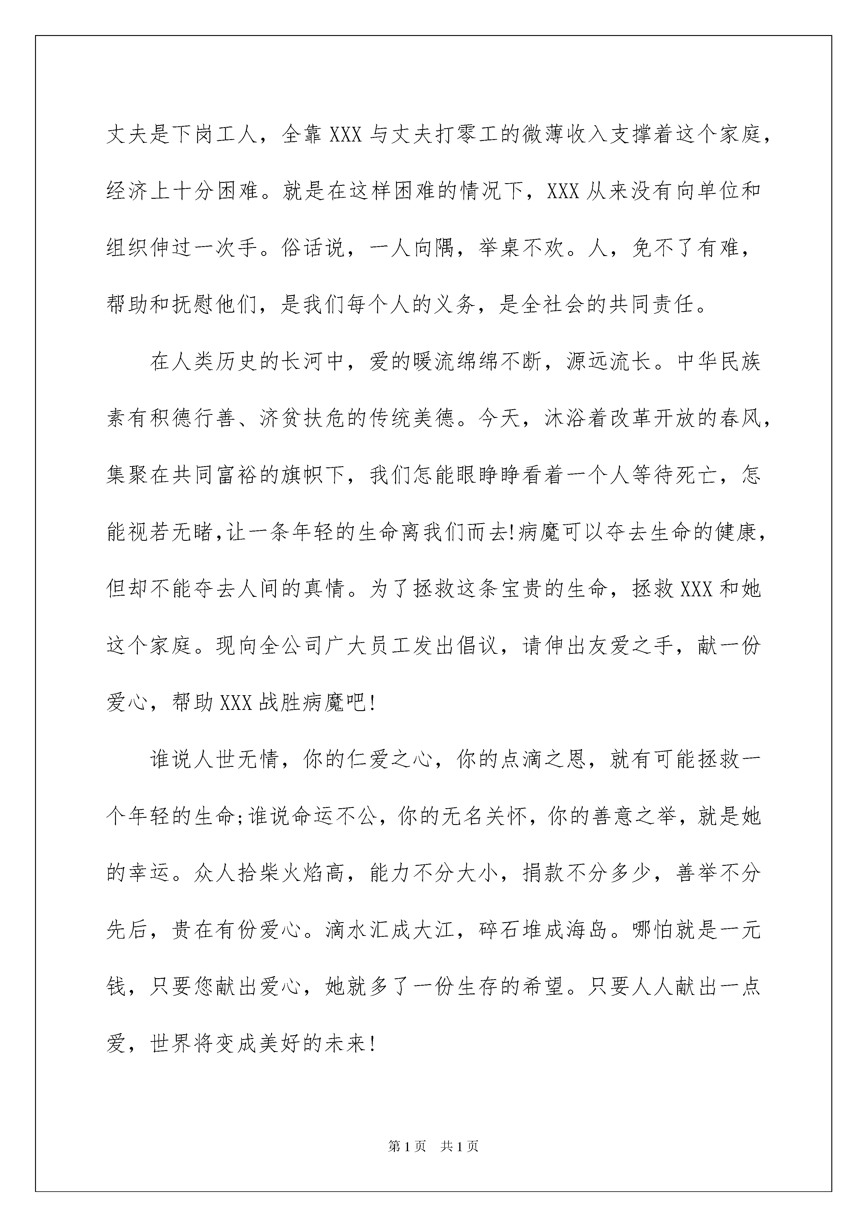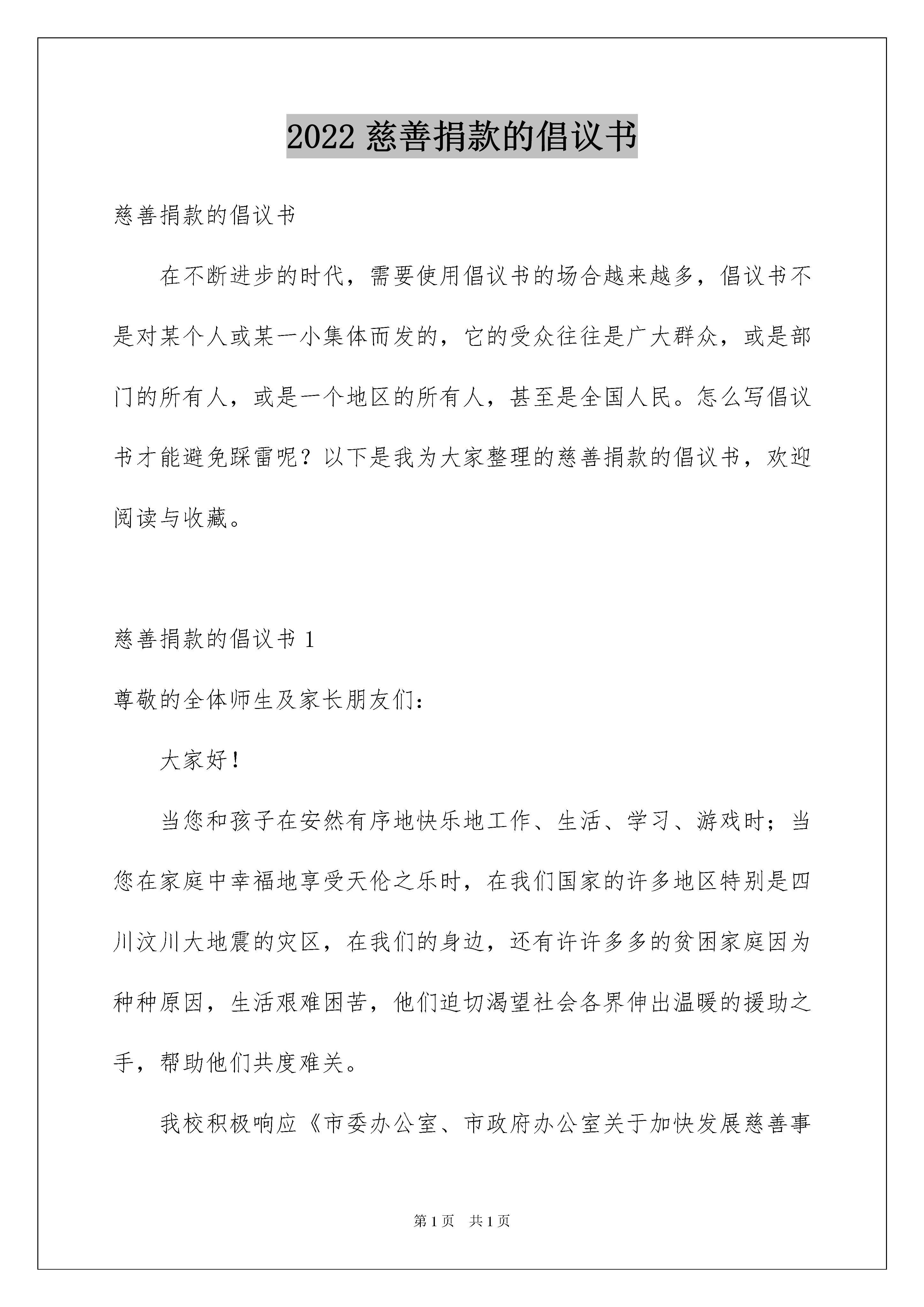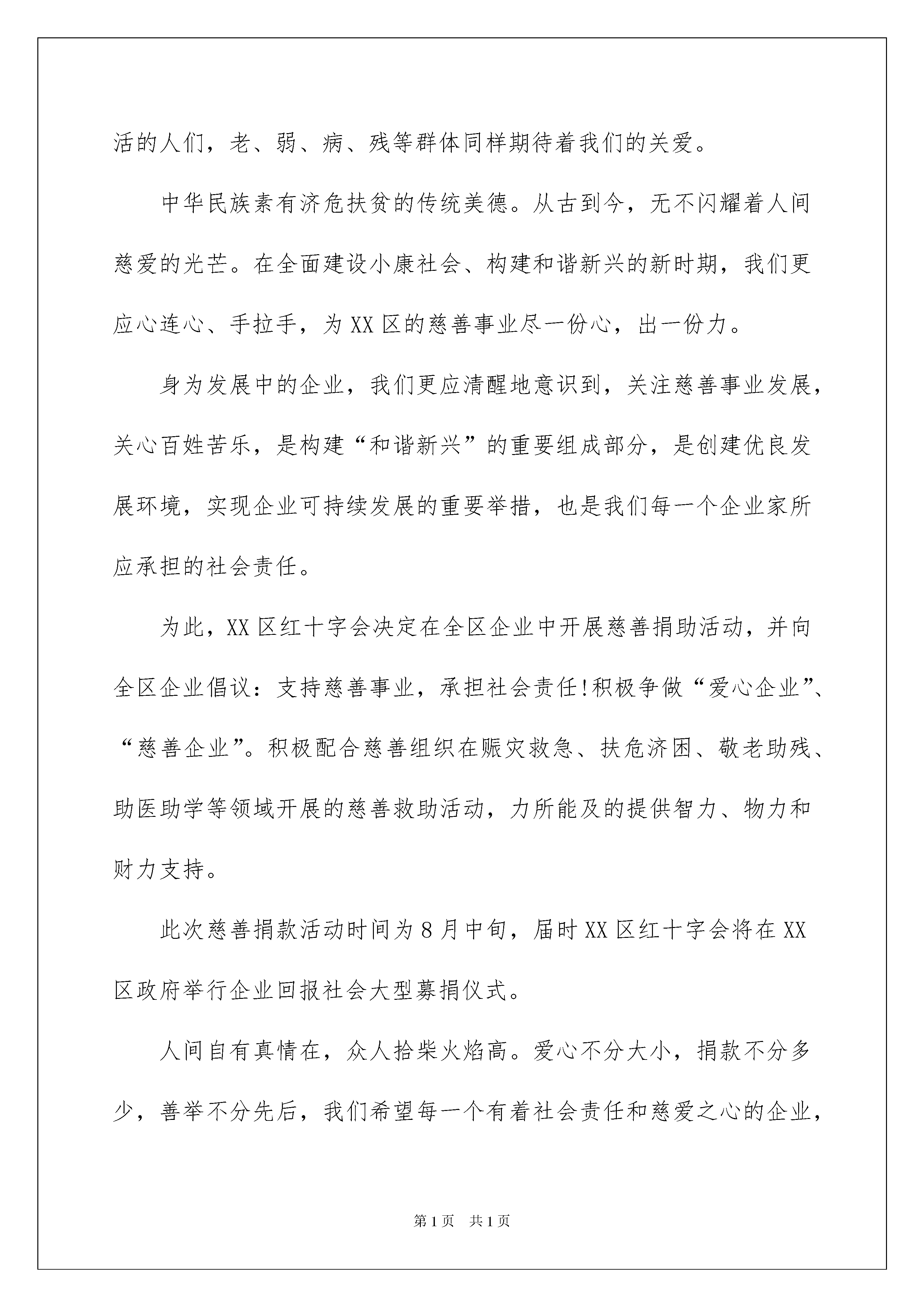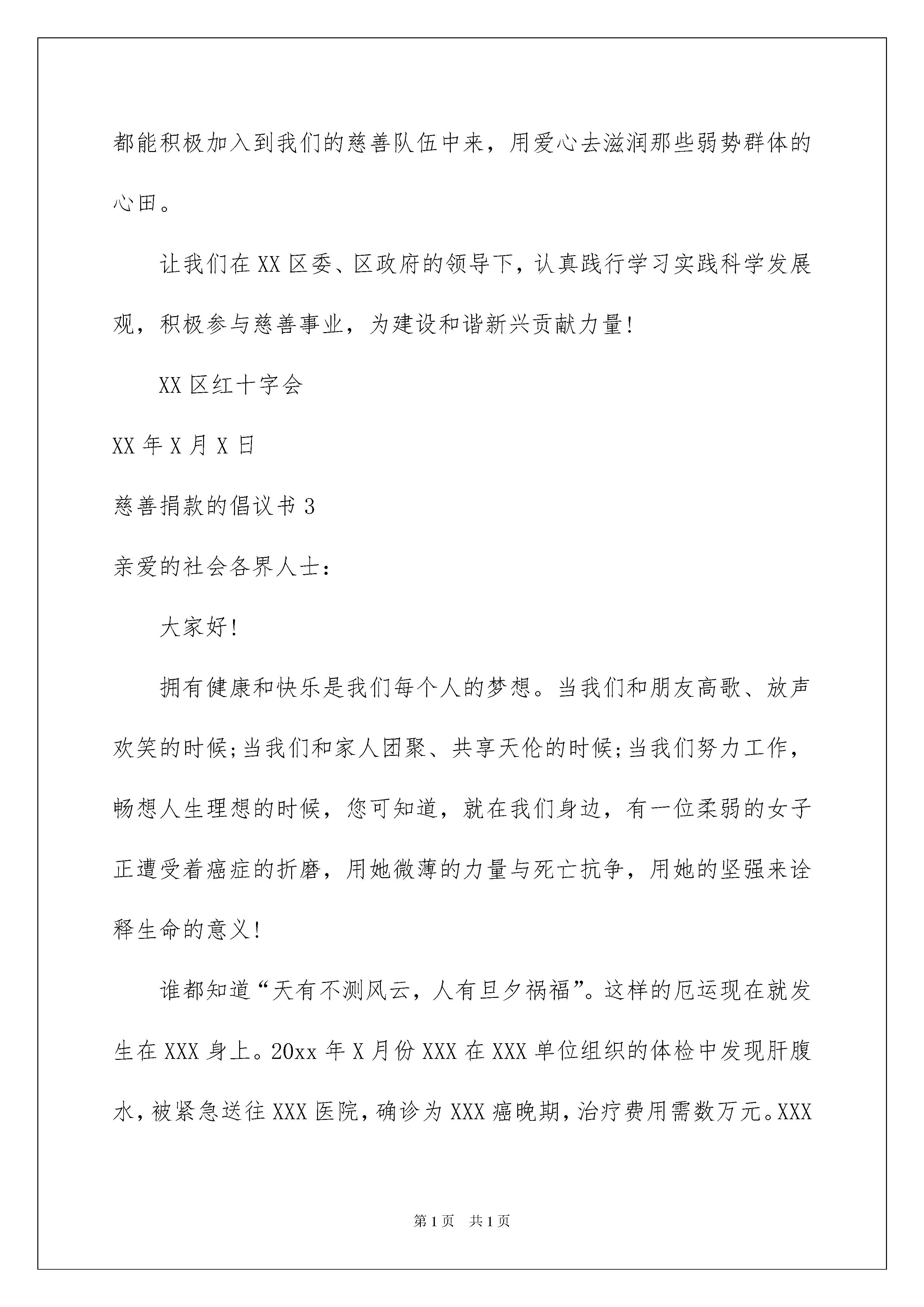 2022慈善捐款的倡议书慈善捐款的倡议书在不断进步的时代,需要使用倡议书的场合越来越多,倡议书不是对某个人或某一小集体而发的,它的受众往往是广大群众,或是部门的所有人,或是一个地区的所有人,甚至是全国人民。怎么写倡议书才能避免踩雷呢?以下是我为大家整理的慈善捐款的倡议书,欢迎阅读与收藏。慈善捐款的倡议书1尊敬的全体师生及家长朋友们:大家好!当您和孩子在安然有序地快乐地工作、生活、学习、游戏时;当您在家庭中幸福地享受天伦之乐时,在我们国家的许多地区特别是四川汶川大地震的灾区,在我们的身边,还有许许多多的贫困家庭因为种种原因,生活艰难困苦,他们迫切渴望社会各界伸出温暖的援助之手,帮助他们共度难关。我校积极响应《市委办公室、市政府办公室关于加快发展慈善事业的意见》(荆办发[]26号)精神和荆办明电[]19号活动的倡议,定于10月10日至11月30日,在全校集中开展“慈善一日捐”活动。济贫扶危是中华民族的传统美德,“慈善一日捐”活动以“用爱延续生命,用心温暖老人”为主题,以“慈心为民,善举济世,以人为本,关注民生”为宗旨,凝聚社会力量,帮扶极度困难群众。众人拾柴火焰高,爱心捐助汇暖流!您和孩子所捐助的每一元钱都蕴含着无价的爱心,都将化成一屡屡阳光,汇成一股股甘泉,给困境中的群体以无限的勇气和力量。愿我们的点滴付出凝聚成爱心的彩虹,让我们给在幸福生活的孩子的纯洁的心灵中播洒爱的种子。“爱人者,人恒爱之!”感谢您的关爱,谨致以诚挚的谢意!让我们用爱心托起生的希望!慈善捐款的倡议书2社会各界朋友:近年来,在区委、区政府的领导下,XX区经济社会实现了又好又快发展。特别是民营企业,在全面建设龙江工业强区的发展过程中,不断发展壮大,取得了令人瞩目的成就。然而在我们前进的道路上,时有发生的突发事件和自然灾害,侵害了原本和我们一样享受美好生活的人们,老、弱、病、残等群体同样期待着我们的关爱。中华民族素有济危扶贫的传统美德。从古到今,无不闪耀着人间慈爱的光芒。在全面建设小康社会、构建和谐新兴的新时期,我们更应心连心、手拉手,为XX区的慈善事业尽一份心,出一份力。身为发展中的企业,我们更应清醒地意识到,关注慈善事业发展,关心百姓苦乐,是构建“和谐新兴”的重要组成部分,是创建优良发展环境,实现企业可持续发展的重要举措,也是我们每一个企业家所应承担的社会责任。为此,XX区红十字会决定在全区企业中开展慈善捐助活动,并向全区企业倡议:支持慈善事业,承担社会责任!积极争做“爱心企业”、“慈善企业”。积极配合慈善组织在赈灾救急、扶危济困、敬老助残、助医助学等领域开展的慈善救助活动,力所能及的提供智力、物力和财力支持。此次慈善捐款活动时间为8月中旬,届时XX区红十字会将在XX区政府举行企业回报社会大型募捐仪式。人间自有真情在,众人拾柴火焰高。爱心不分大小,捐款不分多少,善举不分先后,我们希望每一个有着社会责任和慈爱之心的企业,都能积极加入到我们的慈善队伍中来,用爱心去滋润那些弱势群体的心田。让我们在XX区委、区政府的领导下,认真践行学习实践科学发展观,积极参与慈善事业,为建设和谐新兴贡献力量!XX区红十字会XX年X月X日慈善捐款的倡议书3亲爱的社会各界人士:大家好!拥有健康和快乐是我们每个人的梦想。当我们和朋友高歌、放声欢笑的时候;当我们和家人团聚、共享天伦的时候;当我们努力工作,畅想人生理想的时候,您可知道,就在我们身边,有一位柔弱的女子正遭受着癌症的折磨,用她微薄的力量与死亡抗争,用她的坚强来诠释生命的意义!谁都知道“天有不测风云,人有旦夕祸福”。这样的厄运现在就发生在XXX身上。20xx年X月份XXX在XXX单位组织的体检中发现肝腹水,被紧急送往XXX医院,确诊为XXX癌晚期,治疗费用需数万元。XXX丈夫是下岗工人,全靠XXX与丈夫打零工的微薄收入支撑着这个家庭,经济上十分困难。就是在这样困难的情况下,XXX从来没有向单位和组织伸过一次手。俗话说,一人向隅,举桌不欢。人,免不了有难,帮助和抚慰他们,是我们每个人的义务,是全社会的共同责任。在人类历史的长河中,爱的暖流绵绵不断,源远流长。中华民族素有积德行善、济贫扶危的传统美德。今天,沐浴着改革开放的春风,集聚在共同富裕的旗帜下,我们怎能眼睁睁看着一个人等待死亡,怎能视若无睹,让一条年轻的生命离我们而去!病魔可以夺去生命的健康,但却不能夺去人间的真情。为了拯救这条宝贵的生命,拯救XXX和她这个家庭。现向全公司广大员工发出倡议,请伸出友爱之手,献一份爱心,帮助XXX战胜病魔吧!谁说人世无情,你的仁爱之心,你的点滴之恩,就有可能拯救一个年轻的生命;谁说命运不公,你
