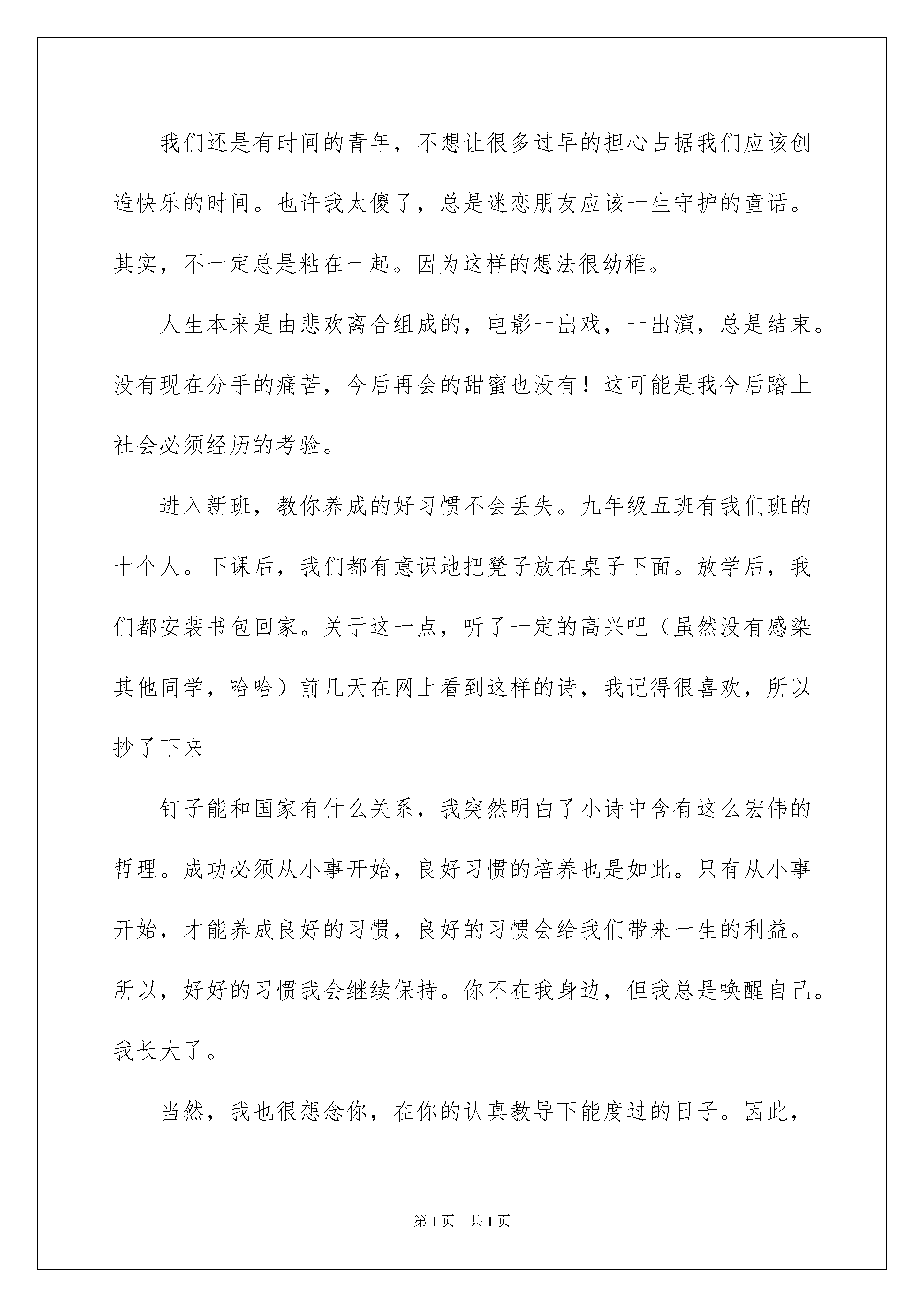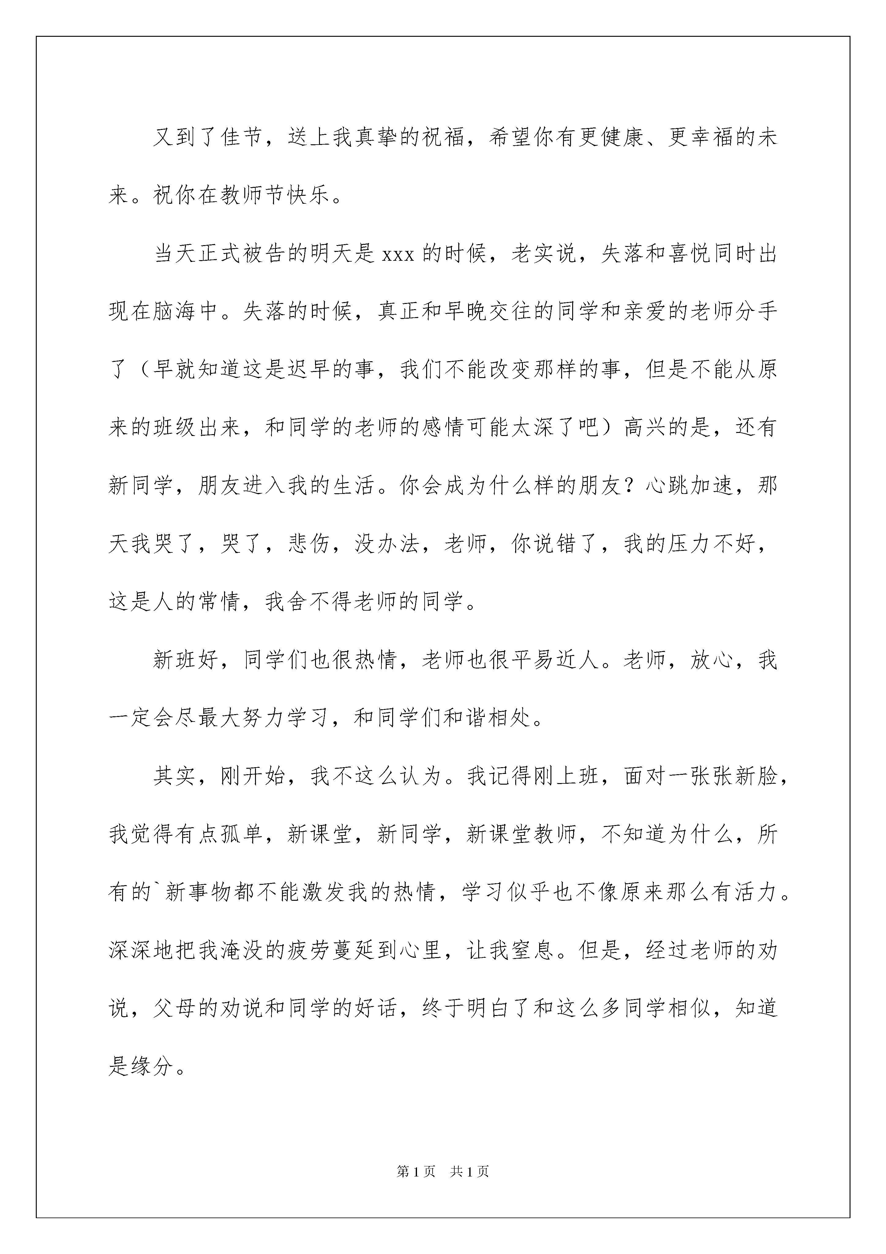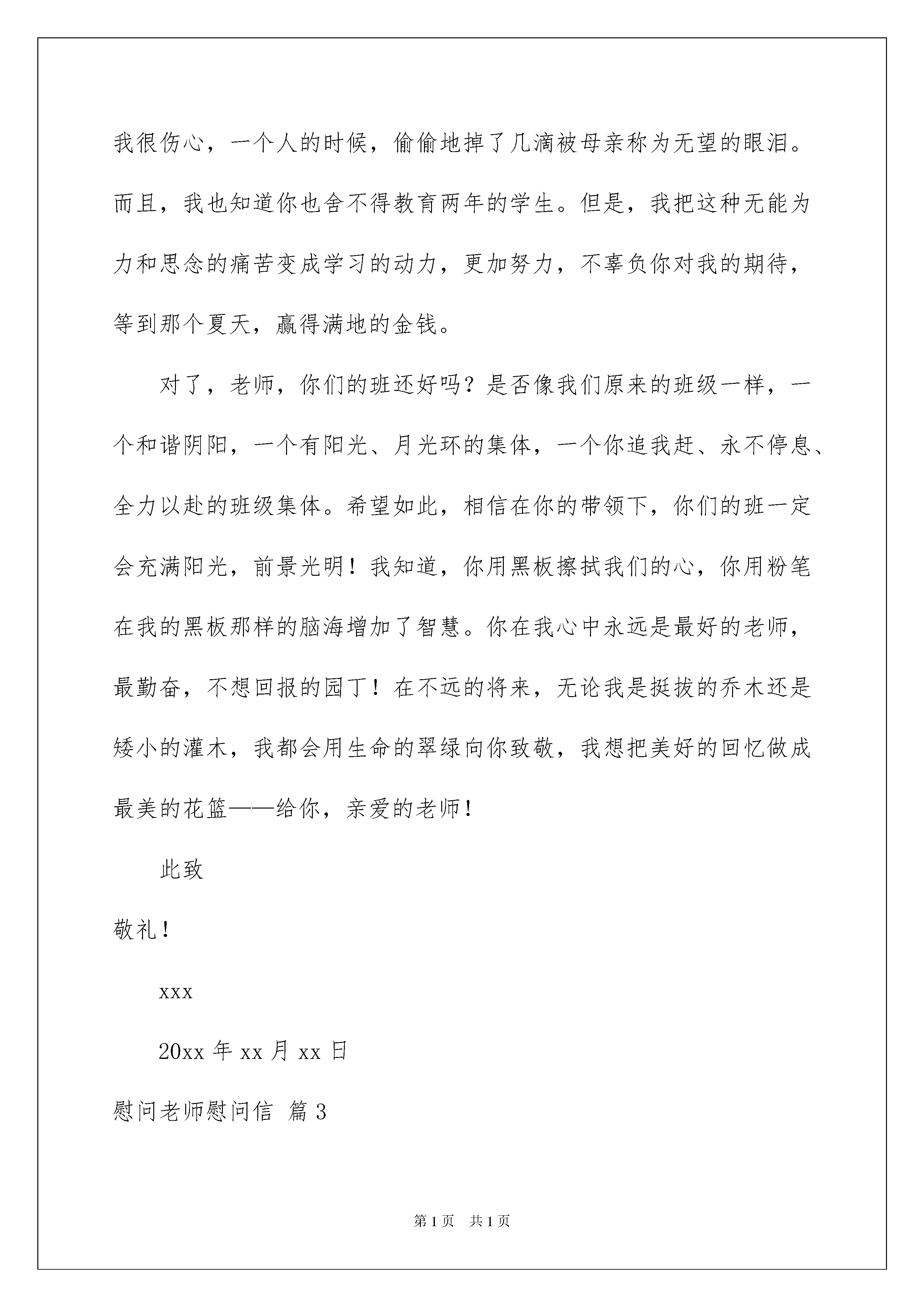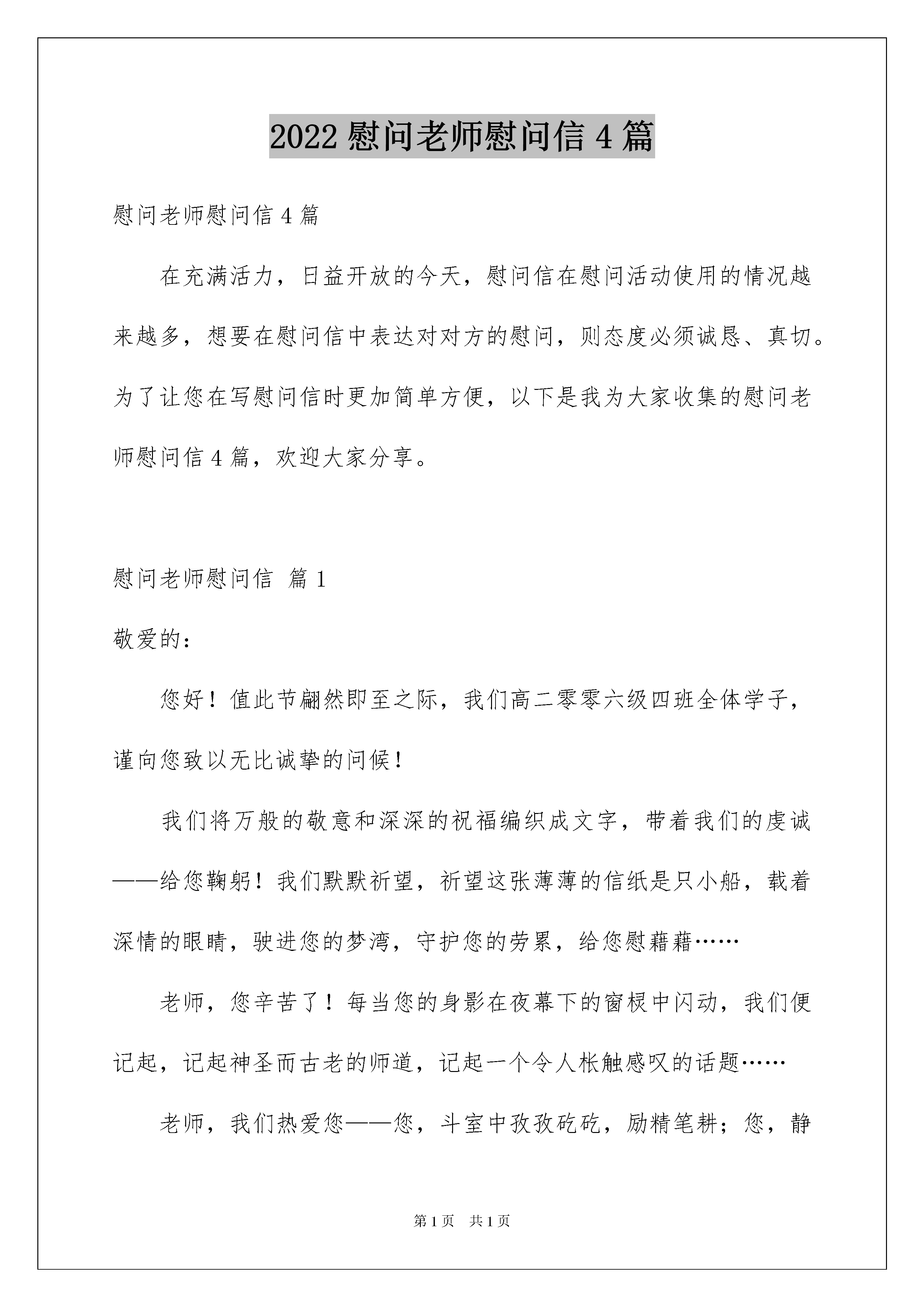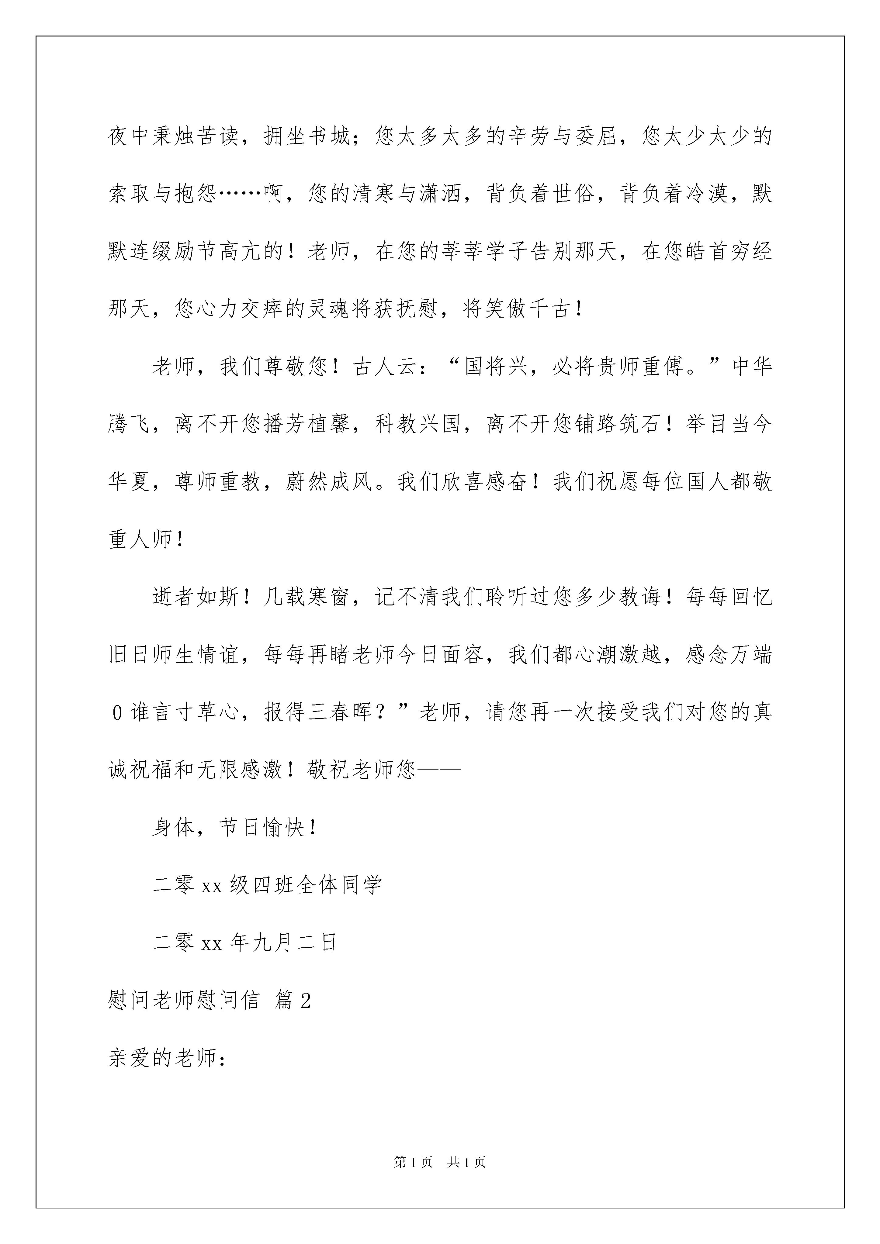 2022慰问老师慰问信4篇慰问老师慰问信4篇在充满活力,日益开放的今天,慰问信在慰问活动使用的情况越来越多,想要在慰问信中表达对对方的慰问,则态度必须诚恳、真切。为了让您在写慰问信时更加简单方便,以下是我为大家收集的慰问老师慰问信4篇,欢迎大家分享。慰问老师慰问信篇1敬爱的:您好!值此节翩然即至之际,我们高二零零六级四班全体学子,谨向您致以无比诚挚的问候!我们将万般的敬意和深深的祝福编织成文字,带着我们的虔诚——给您鞠躬!我们默默祈望,祈望这张薄薄的信纸是只小船,载着深情的眼睛,驶进您的梦湾,守护您的劳累,给您慰藉藉……老师,您辛苦了!每当您的身影在夜幕下的窗棂中闪动,我们便记起,记起神圣而古老的师道,记起一个令人枨触感叹的话题……老师,我们热爱您——您,斗室中孜孜矻矻,励精笔耕;您,静夜中秉烛苦读,拥坐书城;您太多太多的辛劳与委屈,您太少太少的索取与抱怨……啊,您的清寒与潇洒,背负着世俗,背负着冷漠,默默连缀励节高亢的!老师,在您的莘莘学子告别那天,在您皓首穷经那天,您心力交瘁的灵魂将获抚慰,将笑傲千古!老师,我们尊敬您!古人云:“国将兴,必将贵师重傅。”中华腾飞,离不开您播芳植馨,科教兴国,离不开您铺路筑石!举目当今华夏,尊师重教,蔚然成风。我们欣喜感奋!我们祝愿每位国人都敬重人师!逝者如斯!几载寒窗,记不清我们聆听过您多少教诲!每每回忆旧日师生情谊,每每再睹老师今日面容,我们都心潮激越,感念万端0谁言寸草心,报得三春晖?”老师,请您再一次接受我们对您的真诚祝福和无限感激!敬祝老师您——身体,节日愉快!二零xx级四班全体同学二零xx年九月二日慰问老师慰问信篇2亲爱的老师:又到了佳节,送上我真挚的祝福,希望你有更健康、更幸福的未来。祝你在教师节快乐。当天正式被告的明天是xxx的时候,老实说,失落和喜悦同时出现在脑海中。失落的时候,真正和早晚交往的同学和亲爱的老师分手了(早就知道这是迟早的事,我们不能改变那样的事,但是不能从原来的班级出来,和同学的老师的感情可能太深了吧)高兴的是,还有新同学,朋友进入我的生活。你会成为什么样的朋友?心跳加速,那天我哭了,哭了,悲伤,没办法,老师,你说错了,我的压力不好,这是人的常情,我舍不得老师的同学。新班好,同学们也很热情,老师也很平易近人。老师,放心,我一定会尽最大努力学习,和同学们和谐相处。其实,刚开始,我不这么认为。我记得刚上班,面对一张张新脸,我觉得有点孤单,新课堂,新同学,新课堂教师,不知道为什么,所有的`新事物都不能激发我的热情,学习似乎也不像原来那么有活力。深深地把我淹没的疲劳蔓延到心里,让我窒息。但是,经过老师的劝说,父母的劝说和同学的好话,终于明白了和这么多同学相似,知道是缘分。我们还是有时间的青年,不想让很多过早的担心占据我们应该创造快乐的时间。也许我太傻了,总是迷恋朋友应该一生守护的童话。其实,不一定总是粘在一起。因为这样的想法很幼稚。人生本来是由悲欢离合组成的,电影一出戏,一出演,总是结束。没有现在分手的痛苦,今后再会的甜蜜也没有!这可能是我今后踏上社会必须经历的考验。进入新班,教你养成的好习惯不会丢失。九年级五班有我们班的十个人。下课后,我们都有意识地把凳子放在桌子下面。放学后,我们都安装书包回家。关于这一点,听了一定的高兴吧(虽然没有感染其他同学,哈哈)前几天在网上看到这样的诗,我记得很喜欢,所以抄了下来钉子能和国家有什么关系,我突然明白了小诗中含有这么宏伟的哲理。成功必须从小事开始,良好习惯的培养也是如此。只有从小事开始,才能养成良好的习惯,良好的习惯会给我们带来一生的利益。所以,好好的习惯我会继续保持。你不在我身边,但我总是唤醒自己。我长大了。当然,我也很想念你,在你的认真教导下能度过的日子。因此,我很伤心,一个人的时候,偷偷地掉了几滴被母亲称为无望的眼泪。而且,我也知道你也舍不得教育两年的学生。但是,我把这种无能为力和思念的痛苦变成学习的动力,更加努力,不辜负你对我的期待,等到那个夏天,赢得满地的金钱。对了,老师,你们的班还好吗?是否像我们原来的班级一样,一个和谐阴阳,一个有阳光、月光环的集体,一个你追我赶、永不停息、全力以赴的班级集体。希望如此,相信在你的带领下,你们的班一定会充满阳光,前景光明!我知道,你用黑板擦拭我们的心,你用粉笔在我的黑板那样的脑海增加了智慧。你在我心中永远是最好的老师,最勤奋,不想回报的园丁!在不远的将来,无论我是挺拔的乔木还是矮小的灌木,我都会用生命的翠绿向你致敬,我想把美好的回忆做成最美的花篮——给你,亲爱的老师!此致敬礼!xxx20xx年xx月xx日慰问老师慰问信篇3敬爱