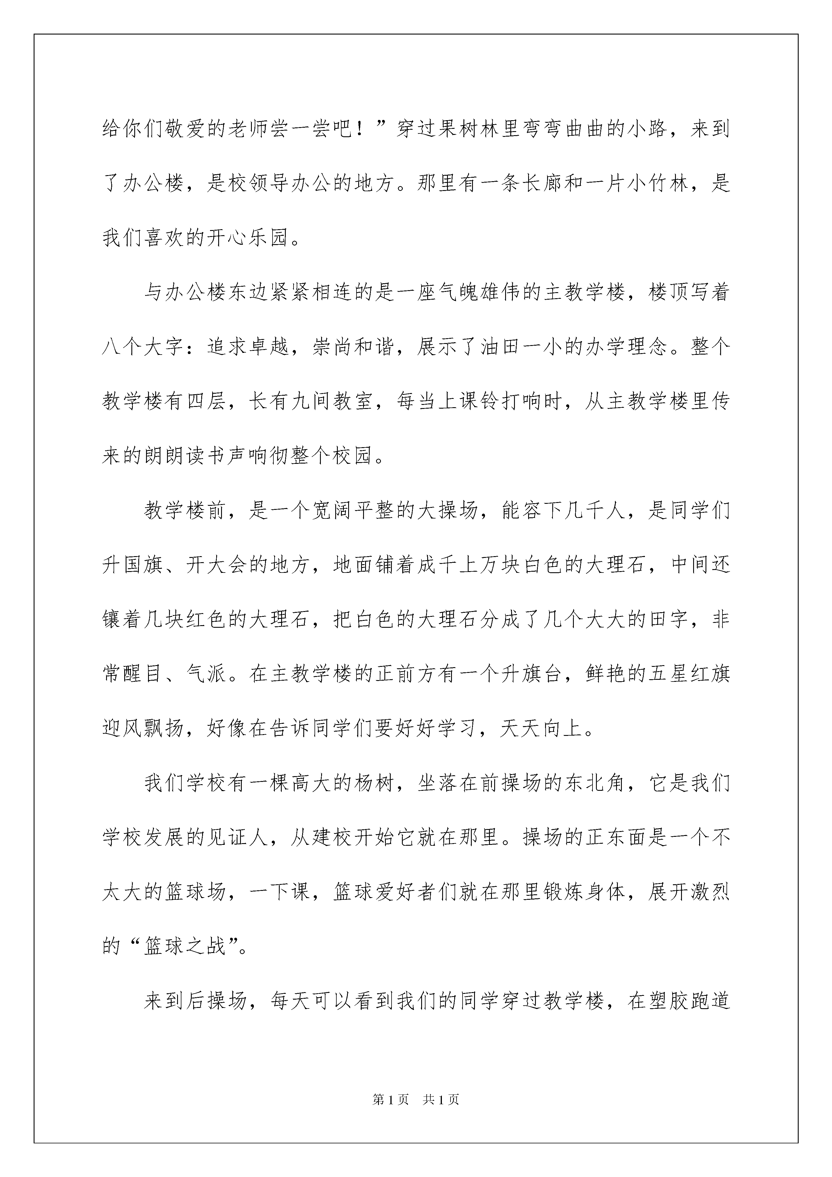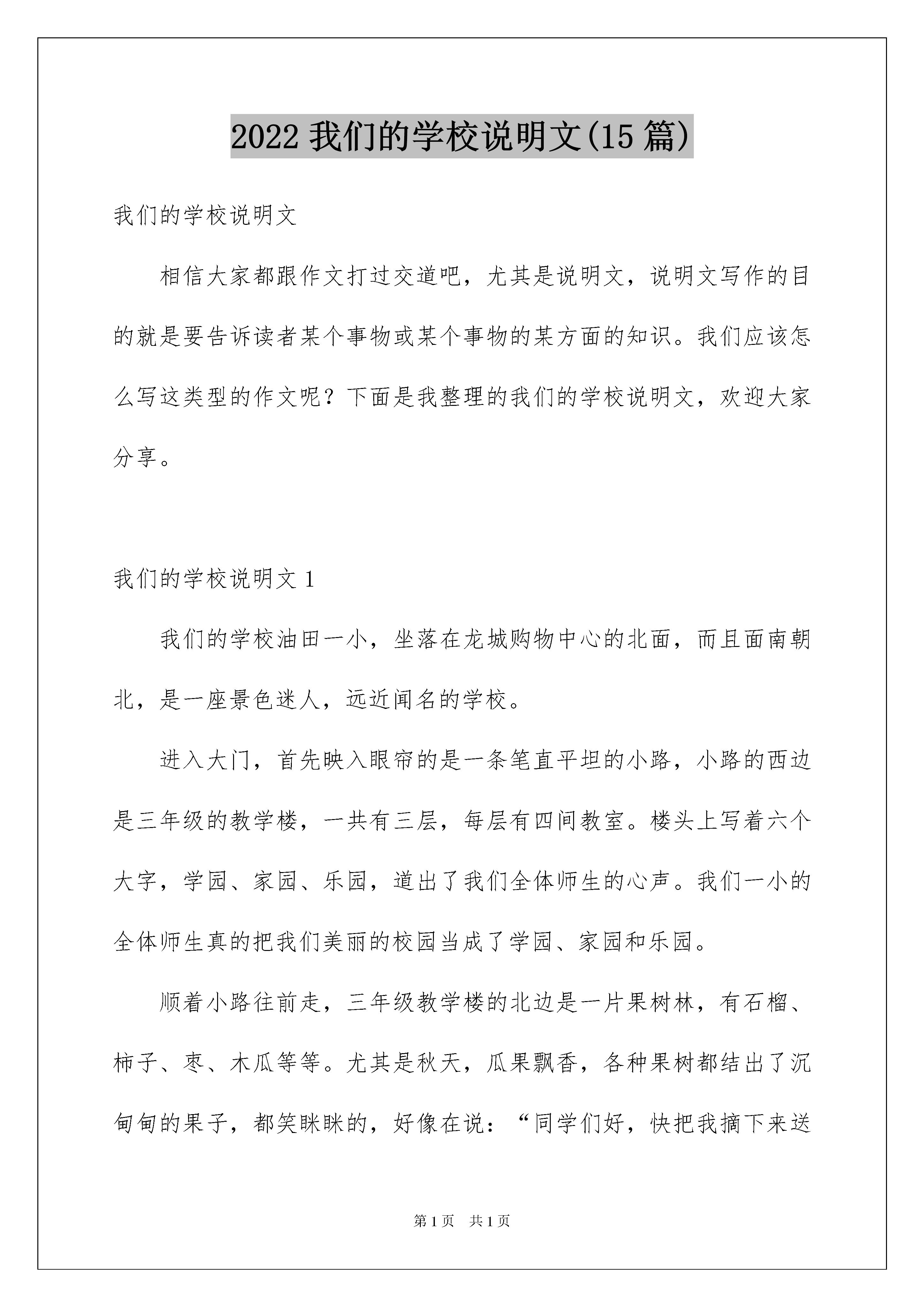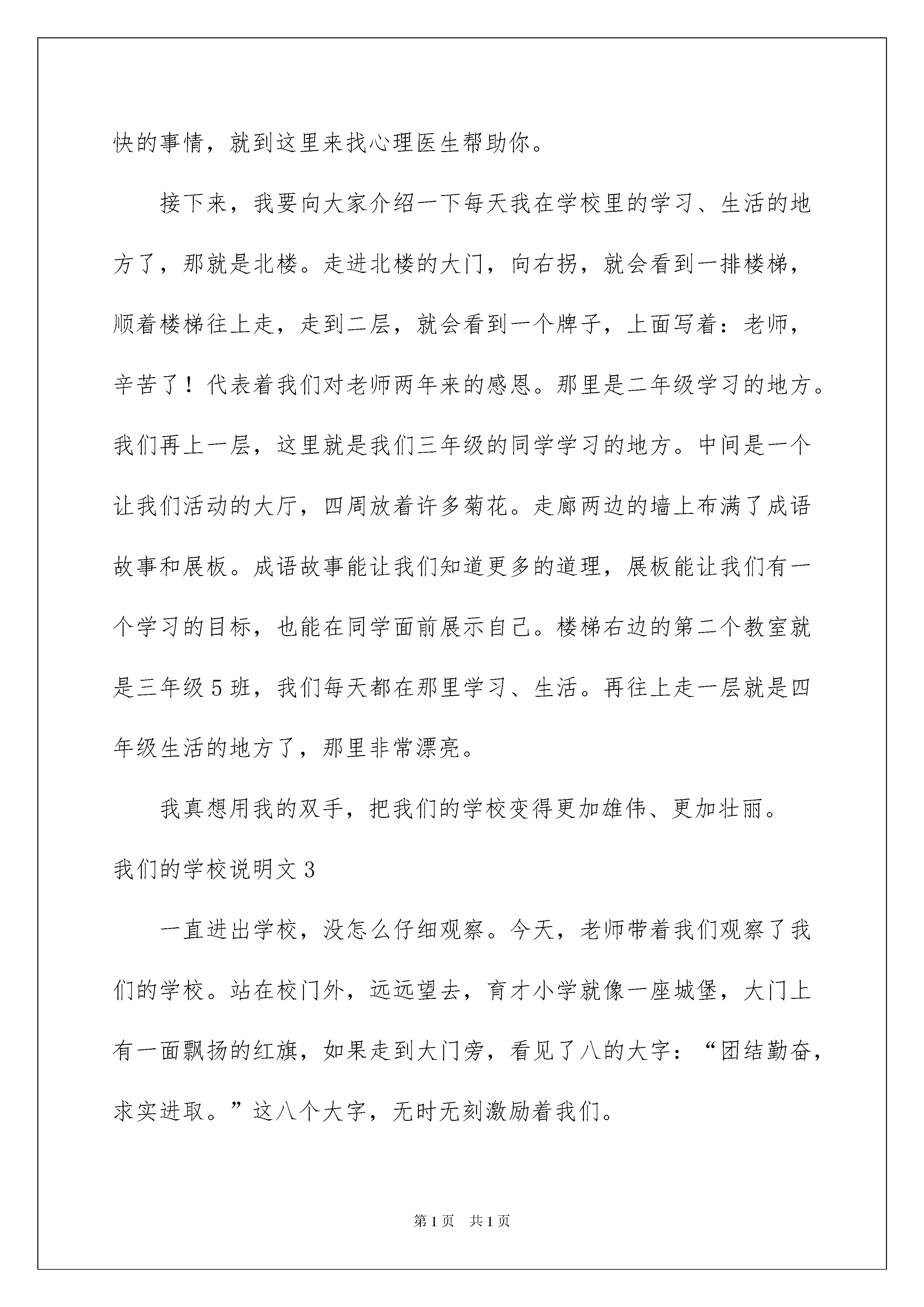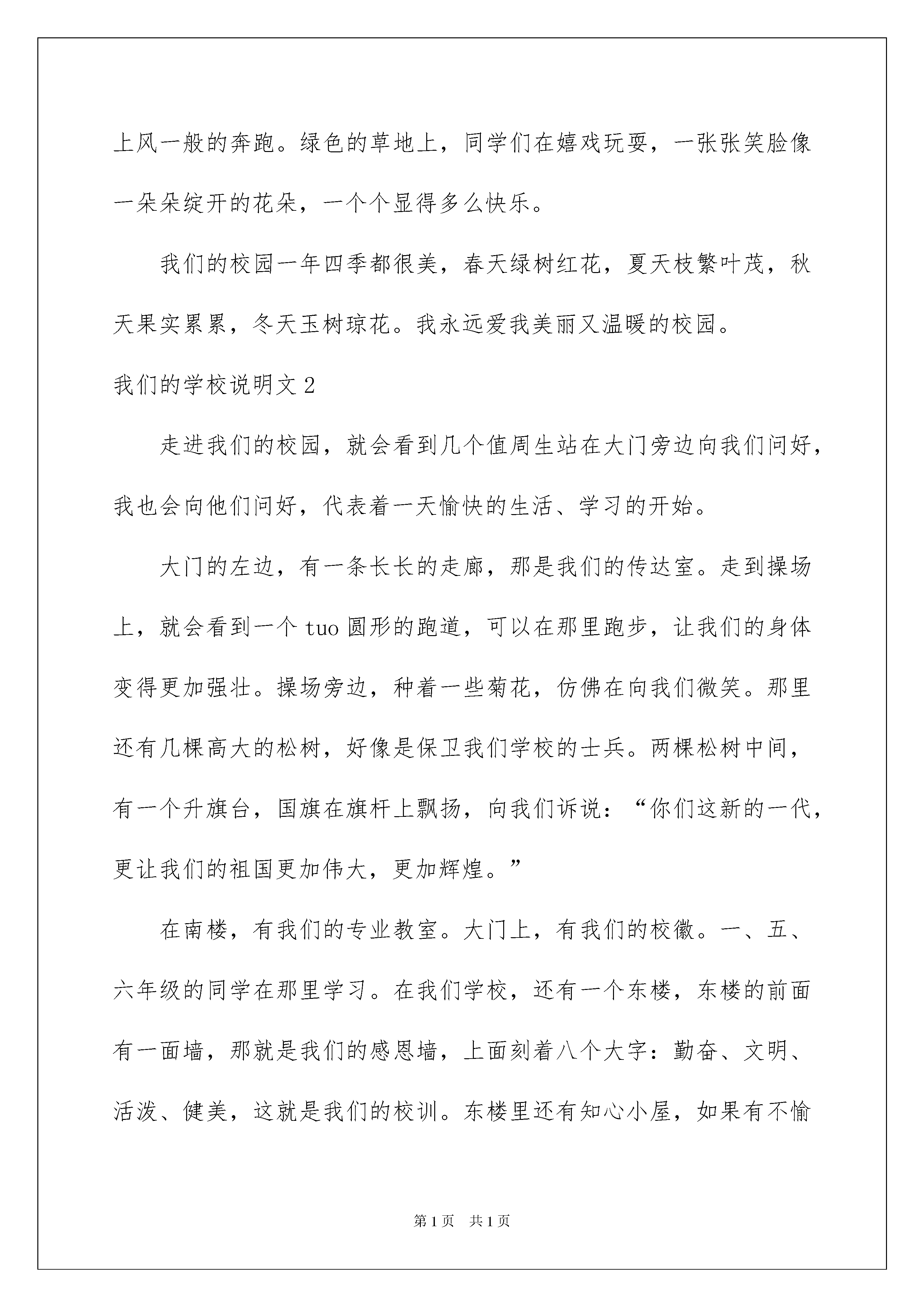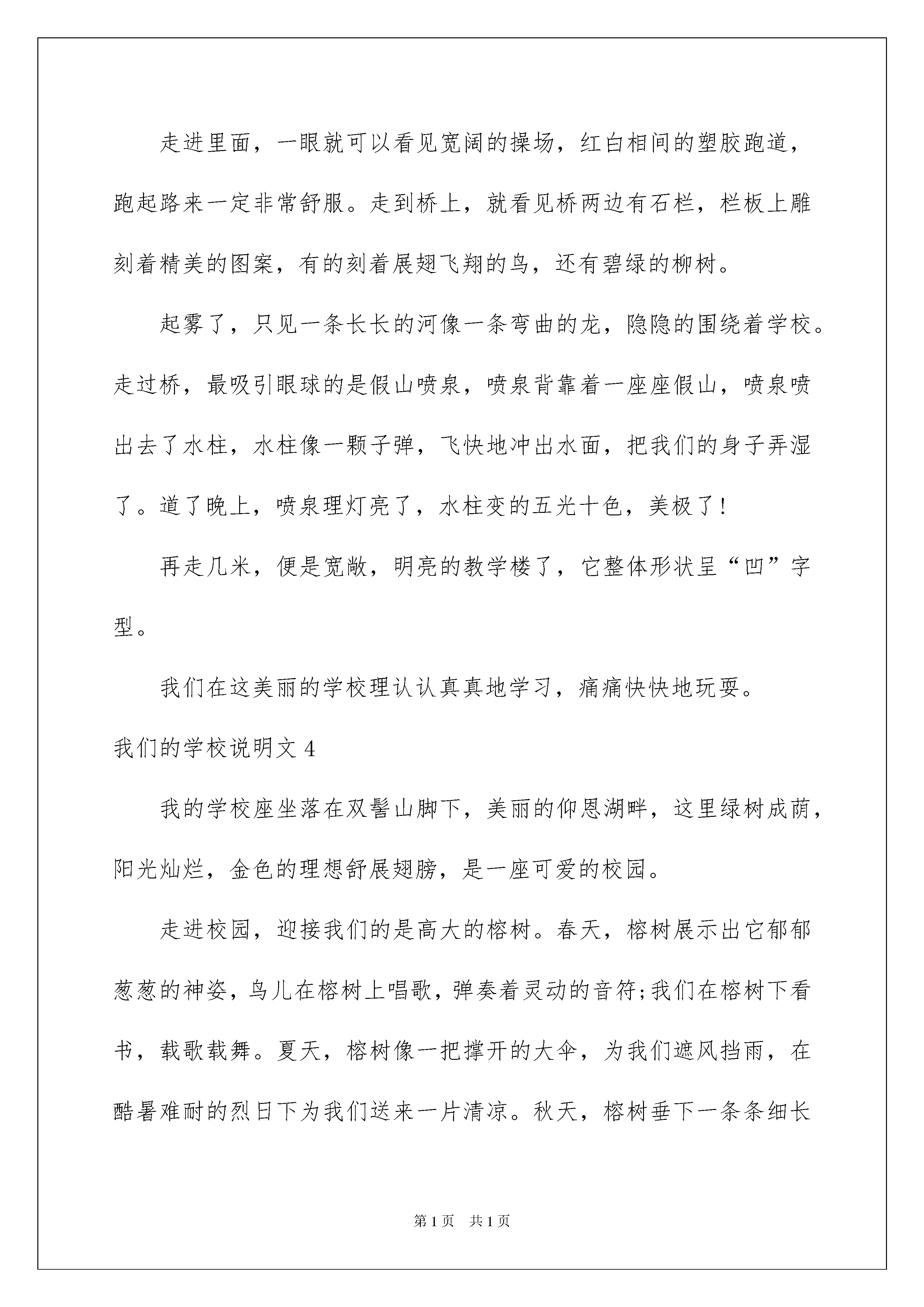 2022我们的学校说明文(15篇)我们的学校说明文相信大家都跟作文打过交道吧,尤其是说明文,说明文写作的目的就是要告诉读者某个事物或某个事物的某方面的知识。我们应该怎么写这类型的作文呢?下面是我整理的我们的学校说明文,欢迎大家分享。我们的学校说明文1我们的学校油田一小,坐落在龙城购物中心的北面,而且面南朝北,是一座景色迷人,远近闻名的学校。进入大门,首先映入眼帘的是一条笔直平坦的小路,小路的西边是三年级的教学楼,一共有三层,每层有四间教室。楼头上写着六个大字,学园、家园、乐园,道出了我们全体师生的心声。我们一小的全体师生真的把我们美丽的校园当成了学园、家园和乐园。顺着小路往前走,三年级教学楼的北边是一片果树林,有石榴、柿子、枣、木瓜等等。尤其是秋天,瓜果飘香,各种果树都结出了沉甸甸的果子,都笑眯眯的,好像在说:“同学们好,快把我摘下来送给你们敬爱的老师尝一尝吧!”穿过果树林里弯弯曲曲的小路,来到了办公楼,是校领导办公的地方。那里有一条长廊和一片小竹林,是我们喜欢的开心乐园。与办公楼东边紧紧相连的是一座气魄雄伟的主教学楼,楼顶写着八个大字:追求卓越,崇尚和谐,展示了油田一小的办学理念。整个教学楼有四层,长有九间教室,每当上课铃打响时,从主教学楼里传来的朗朗读书声响彻整个校园。教学楼前,是一个宽阔平整的大操场,能容下几千人,是同学们升国旗、开大会的地方,地面铺着成千上万块白色的大理石,中间还镶着几块红色的大理石,把白色的大理石分成了几个大大的田字,非常醒目、气派。在主教学楼的正前方有一个升旗台,鲜艳的五星红旗迎风飘扬,好像在告诉同学们要好好学习,天天向上。我们学校有一棵高大的杨树,坐落在前操场的东北角,它是我们学校发展的见证人,从建校开始它就在那里。操场的正东面是一个不太大的篮球场,一下课,篮球爱好者们就在那里锻炼身体,展开激烈的“篮球之战”。来到后操场,每天可以看到我们的同学穿过教学楼,在塑胶跑道上风一般的奔跑。绿色的草地上,同学们在嬉戏玩耍,一张张笑脸像一朵朵绽开的花朵,一个个显得多么快乐。我们的校园一年四季都很美,春天绿树红花,夏天枝繁叶茂,秋天果实累累,冬天玉树琼花。我永远爱我美丽又温暖的校园。我们的学校说明文2走进我们的校园,就会看到几个值周生站在大门旁边向我们问好,我也会向他们问好,代表着一天愉快的生活、学习的开始。大门的左边,有一条长长的走廊,那是我们的传达室。走到操场上,就会看到一个tuo圆形的跑道,可以在那里跑步,让我们的身体变得更加强壮。操场旁边,种着一些菊花,仿佛在向我们微笑。那里还有几棵高大的松树,好像是保卫我们学校的士兵。两棵松树中间,有一个升旗台,国旗在旗杆上飘扬,向我们诉说:“你们这新的一代,更让我们的祖国更加伟大,更加辉煌。”在南楼,有我们的专业教室。大门上,有我们的校徽。一、五、六年级的同学在那里学习。在我们学校,还有一个东楼,东楼的前面有一面墙,那就是我们的感恩墙,上面刻着八个大字:勤奋、文明、活泼、健美,这就是我们的校训。东楼里还有知心小屋,如果有不愉快的事情,就到这里来找心理医生帮助你。接下来,我要向大家介绍一下每天我在学校里的学习、生活的地方了,那就是北楼。走进北楼的大门,向右拐,就会看到一排楼梯,顺着楼梯往上走,走到二层,就会看到一个牌子,上面写着:老师,辛苦了!代表着我们对老师两年来的感恩。那里是二年级学习的地方。我们再上一层,这里就是我们三年级的同学学习的地方。中间是一个让我们活动的大厅,四周放着许多菊花。走廊两边的墙上布满了成语故事和展板。成语故事能让我们知道更多的道理,展板能让我们有一个学习的目标,也能在同学面前展示自己。楼梯右边的第二个教室就是三年级5班,我们每天都在那里学习、生活。再往上走一层就是四年级生活的地方了,那里非常漂亮。我真想用我的双手,把我们的学校变得更加雄伟、更加壮丽。我们的学校说明文3一直进出学校,没怎么仔细观察。今天,老师带着我们观察了我们的学校。站在校门外,远远望去,育才小学就像一座城堡,大门上有一面飘扬的红旗,如果走到大门旁,看见了八的大字:“团结勤奋,求实进取。”这八个大字,无时无刻激励着我们。走进里面,一眼就可以看见宽阔的操场,红白相间的塑胶跑道,跑起路来一定非常舒服。走到桥上,就看见桥两边有石栏,栏板上雕刻着精美的图案,有的刻着展翅飞翔的鸟,还有碧绿的柳树。起雾了,只见一条长长的河像一条弯曲的龙,隐隐的围绕着学校。走过桥,最吸引眼球的是假山喷泉,喷泉背靠着一座座假山,喷泉喷出去了水柱,水柱像一颗子弹,飞快地冲出水面,把我们的身子弄湿了。道了晚上,喷泉理灯亮了,水柱变的五光十色,美极了!再走几米