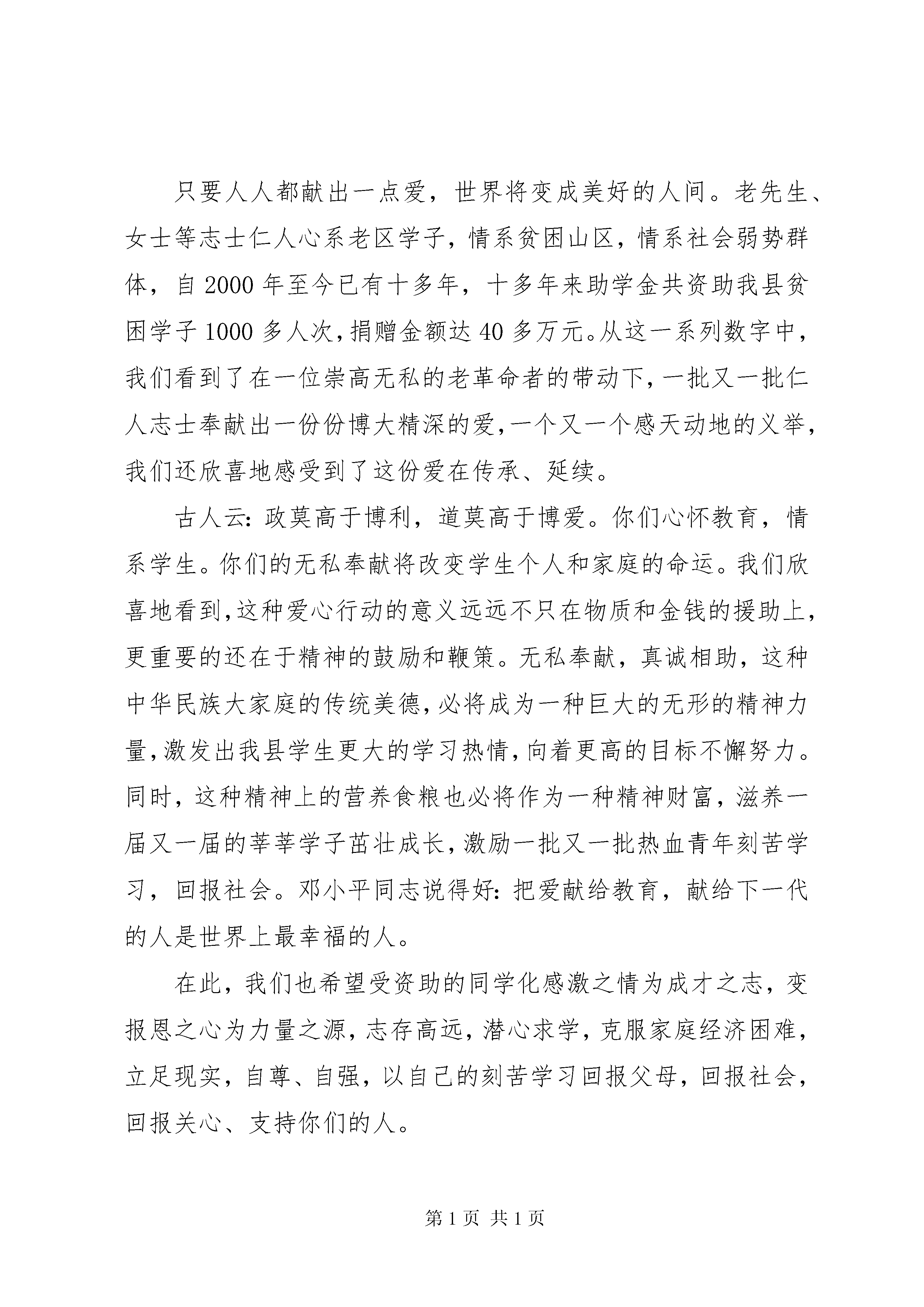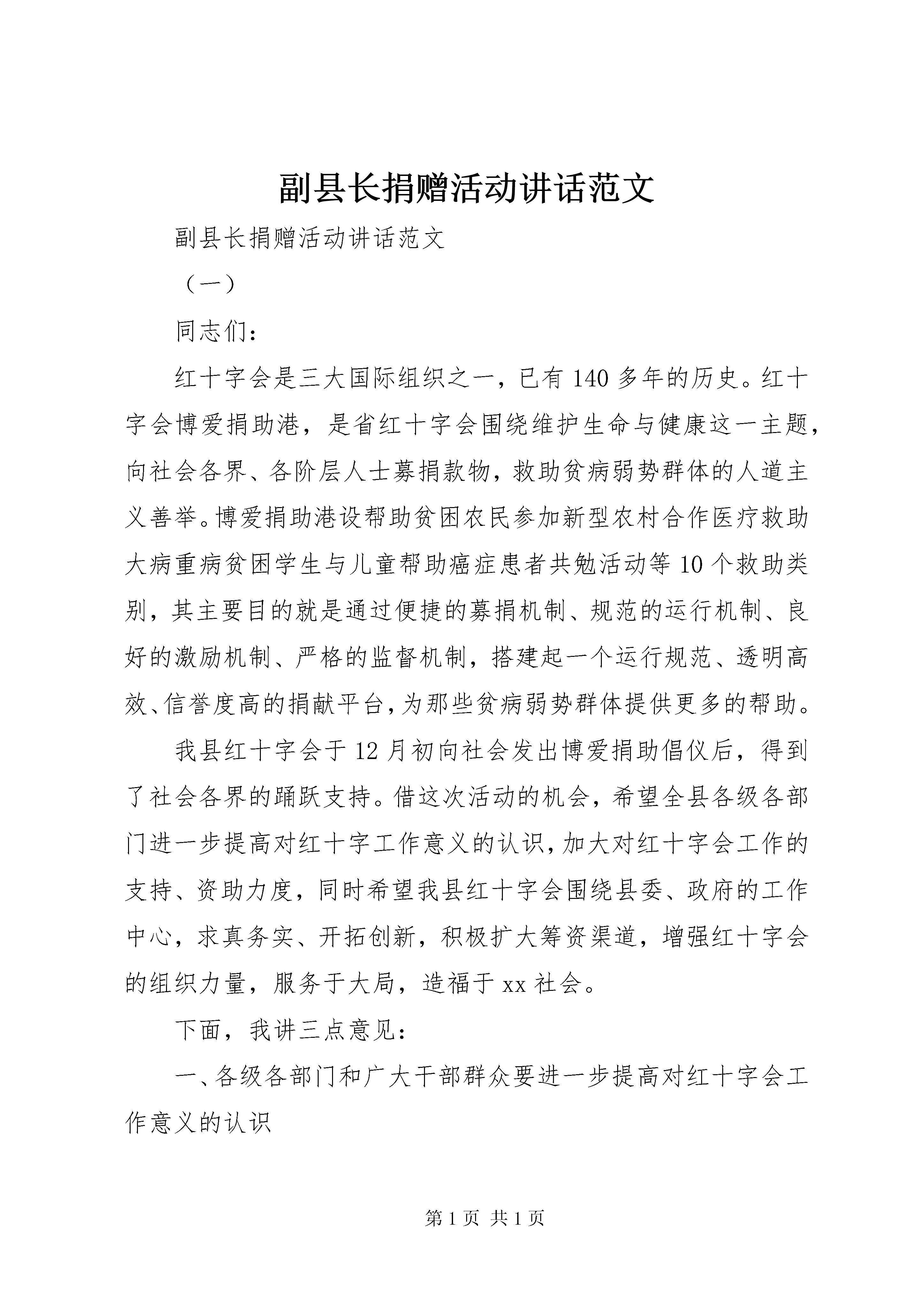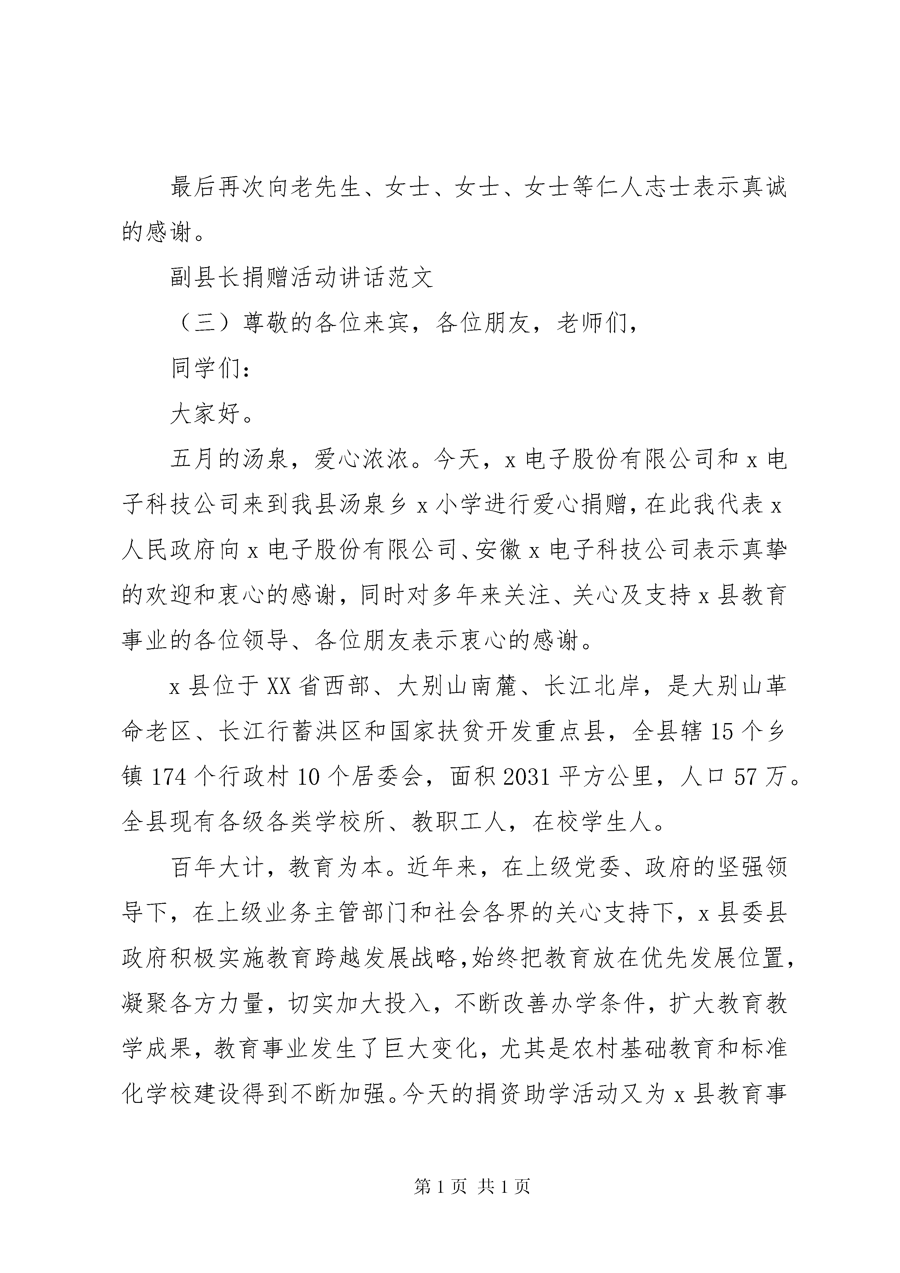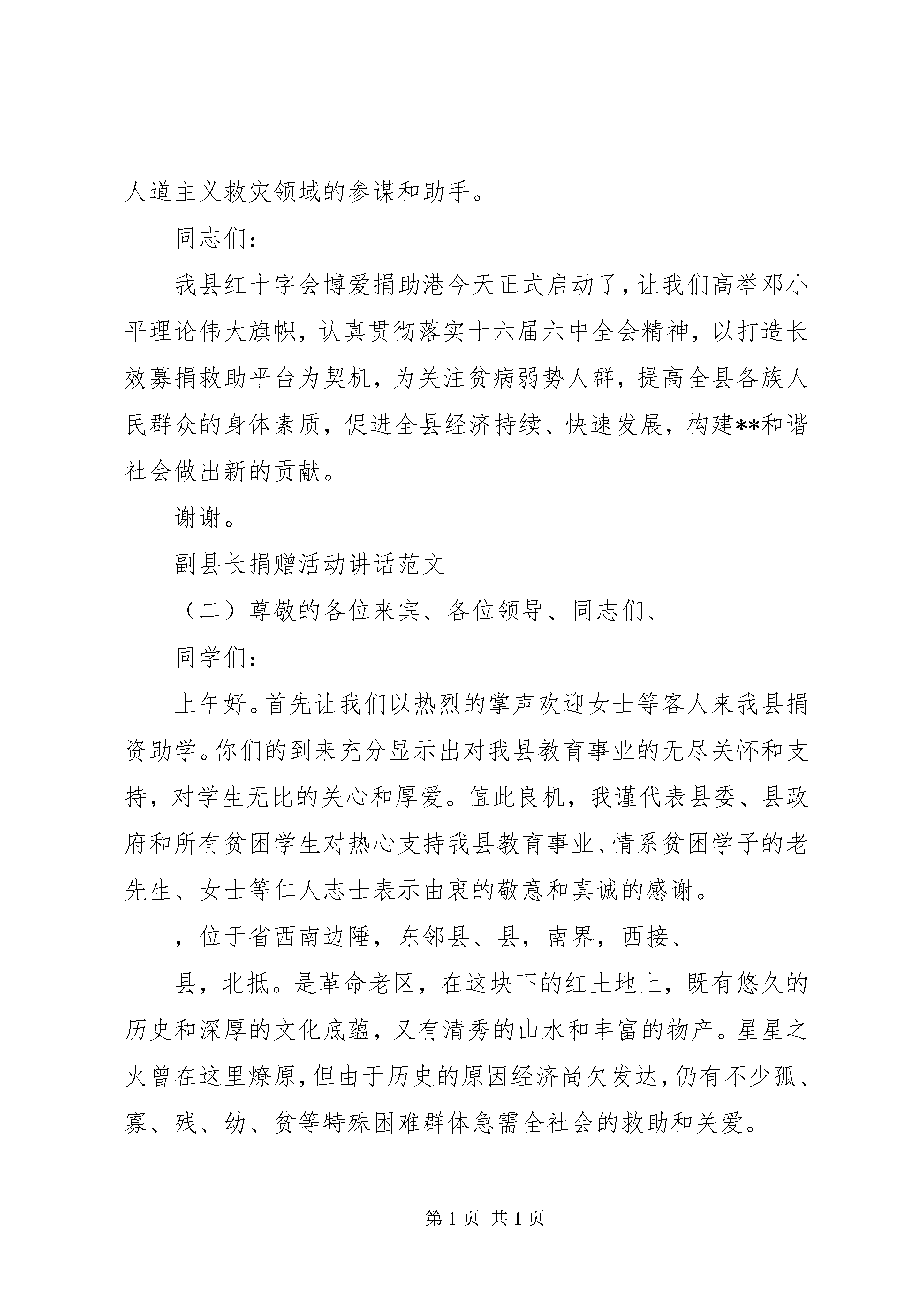 副县长捐赠活动讲话范文副县长捐赠活动讲话范文(一)同志们:红十字会是三大国际组织之一,已有140多年的历史。红十字会博爱捐助港,是省红十字会围绕维护生命与健康这一主题,向社会各界、各阶层人士募捐款物,救助贫病弱势群体的人道主义善举。博爱捐助港设帮助贫困农民参加新型农村合作医疗救助大病重病贫困学生与儿童帮助癌症患者共勉活动等10个救助类别,其主要目的就是通过便捷的募捐机制、规范的运行机制、良好的激励机制、严格的监督机制,搭建起一个运行规范、透明高效、信誉度高的捐献平台,为那些贫病弱势群体提供更多的帮助。我县红十字会于12月初向社会发出博爱捐助倡仪后,得到了社会各界的踊跃支持。借这次活动的机会,希望全县各级各部门进一步提高对红十字工作意义的认识,加大对红十字会工作的支持、资助力度,同时希望我县红十字会围绕县委、政府的工作中心,求真务实、开拓创新,积极扩大筹资渠道,增强红十字会的组织力量,服务于大局,造福于xx社会。下面,我讲三点意见:一、各级各部门和广大干部群众要进一步提高对红十字会工作意义的认识各级各部门要认真学习贯彻十六届六中全会精神,大力弘扬人道、博爱、奉献精神,努力成为构建和谐社会的重要力量;要把学习贯彻《红十字会法》和相关法律法规作为一项重要任务,不断开创红十字事业发展的新局面;县红十字会要理顺体制,增强独立开展工作的能力,积极做好备灾救灾工作,成为我县公益事业的响亮品牌;各级各部门要高度重视、支持红十字会的工作,使其永葆生机与活力,充分发挥其作为政府部门助手的重要作用。二、各级各部门、社会各界要依法加强对红十字会的支持、资助、保障和监督各级各部门要进一步认清形势、明确任务,认真学习贯彻《中华人民共和国红十字会法》,并将其纳入议事日程;人大会认真做好《红十字会法》执行的监督工作;各新闻单位要积极宣传《红十字会法》,大力弘扬红十字精神,积极动员社会各界和广大干部群众支持搞好红十字工作;红十字会要按照有关章程和指导思想继续做好备灾救灾、防治艾滋病等工作,不断开创红十字工作的新局面,共同推进全县红十字会事业的发展。三、县红十字会要抓住机遇,发扬成绩,克服困难,不断开创红十字会事业的新局面一是要统一思想、提高认识,认真贯彻落实《红十字会法》,促进我县红十字事业长足发展;二是加强红十字会队伍建设,为全县红十字事业发展提供保障;三是红十字会要当好政府部门在人道主义救灾领域的参谋和助手。同志们:我县红十字会博爱捐助港今天正式启动了,让我们高举邓小平理论伟大旗帜,认真贯彻落实十六届六中全会精神,以打造长效募捐救助平台为契机,为关注贫病弱势人群,提高全县各族人民群众的身体素质,促进全县经济持续、快速发展,构建**和谐社会做出新的贡献。谢谢。副县长捐赠活动讲话范文(二)尊敬的各位来宾、各位领导、同志们、同学们:上午好。首先让我们以热烈的掌声欢迎女士等客人来我县捐资助学。你们的到来充分显示出对我县教育事业的无尽关怀和支持,对学生无比的关心和厚爱。值此良机,我谨代表县委、县政府和所有贫困学生对热心支持我县教育事业、情系贫困学子的老先生、女士等仁人志士表示由衷的敬意和真诚的感谢。,位于省西南边陲,东邻县、县,南界,西接、县,北抵。是革命老区,在这块下的红土地上,既有悠久的历史和深厚的文化底蕴,又有清秀的山水和丰富的物产。星星之火曾在这里燎原,但由于历史的原因经济尚欠发达,仍有不少孤、寡、残、幼、贫等特殊困难群体急需全社会的救助和关爱。只要人人都献出一点爱,世界将变成美好的人间。老先生、女士等志士仁人心系老区学子,情系贫困山区,情系社会弱势群体,自2000年至今已有十多年,十多年来助学金共资助我县贫困学子1000多人次,捐赠金额达40多万元。从这一系列数字中,我们看到了在一位崇高无私的老革命者的带动下,一批又一批仁人志士奉献出一份份博大精深的爱,一个又一个感天动地的义举,我们还欣喜地感受到了这份爱在传承、延续。古人云:政莫高于博利,道莫高于博爱。你们心怀教育,情系学生。你们的无私奉献将改变学生个人和家庭的命运。我们欣喜地看到,这种爱心行动的意义远远不只在物质和金钱的援助上,更重要的还在于精神的鼓励和鞭策。无私奉献,真诚相助,这种中华民族大家庭的传统美德,必将成为一种巨大的无形的精神力量,激发出我县学生更大的学习热情,向着更高的目标不懈努力。同时,这种精神上的营养食粮也必将作为一种精神财富,滋养一届又一届的莘莘学子茁壮成长,激励一批又一批热血青年刻苦学习,回报社会。邓小平同志说得好:把爱献给教育,献给下一代的人是世界上最幸福的人。在此,我们也希望受资助的同学化感激之情为成才之志,变报恩之心为力量之源,志存高远,潜心求学,克服家庭经济困难,立足现实,自尊、自强,以自己的刻苦学习回报父母,回报社会,回报关心、支持你们的人。最后再