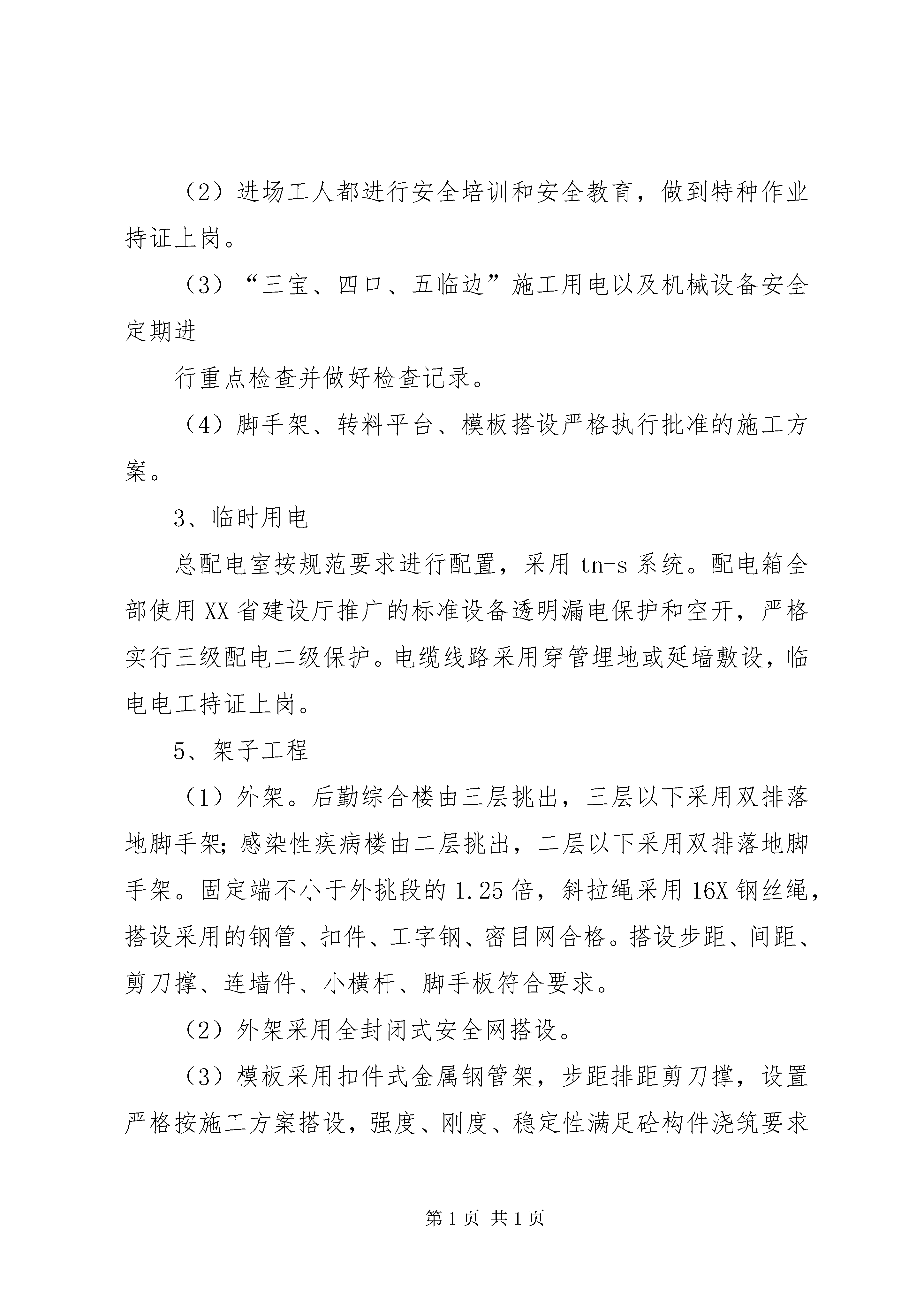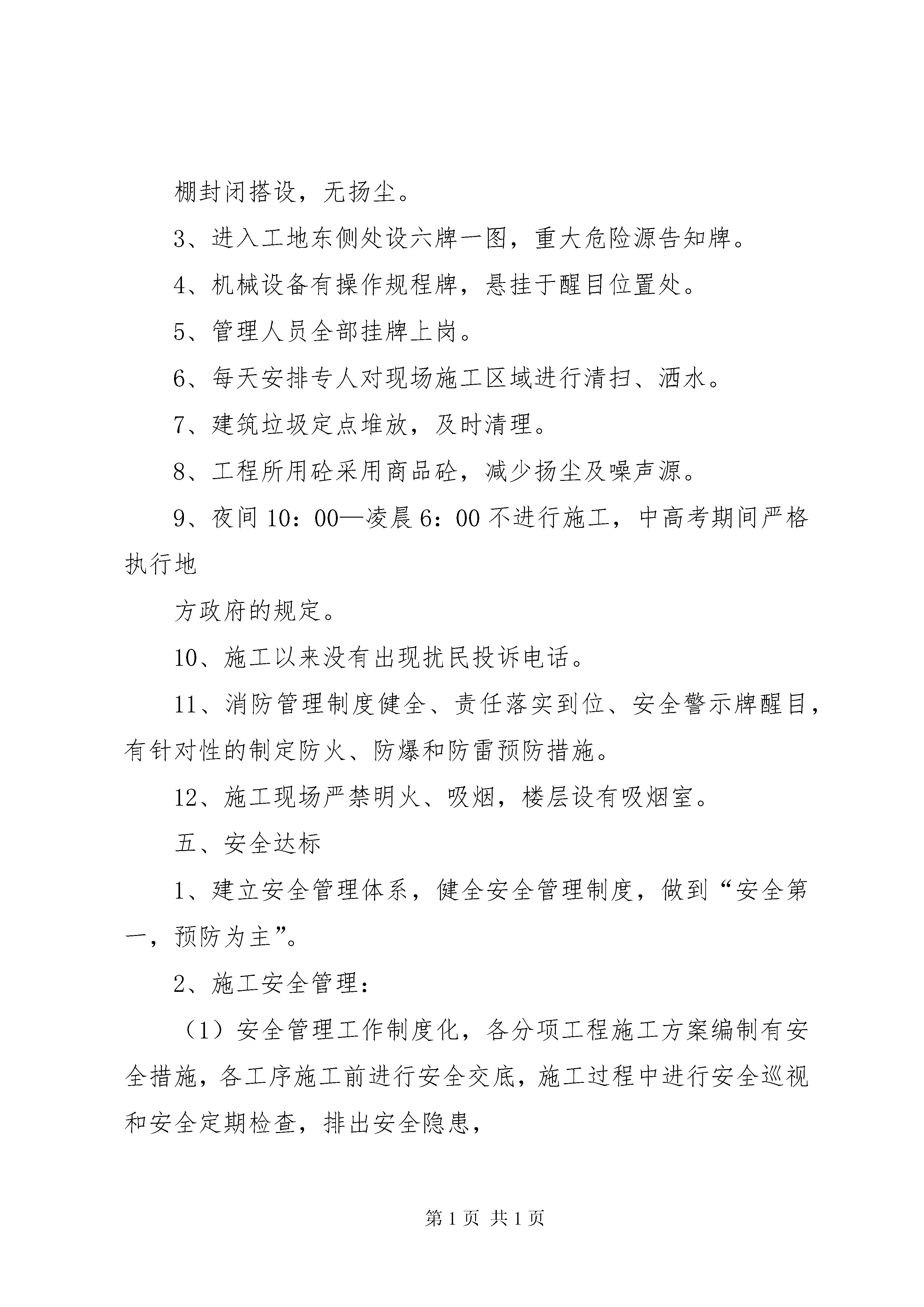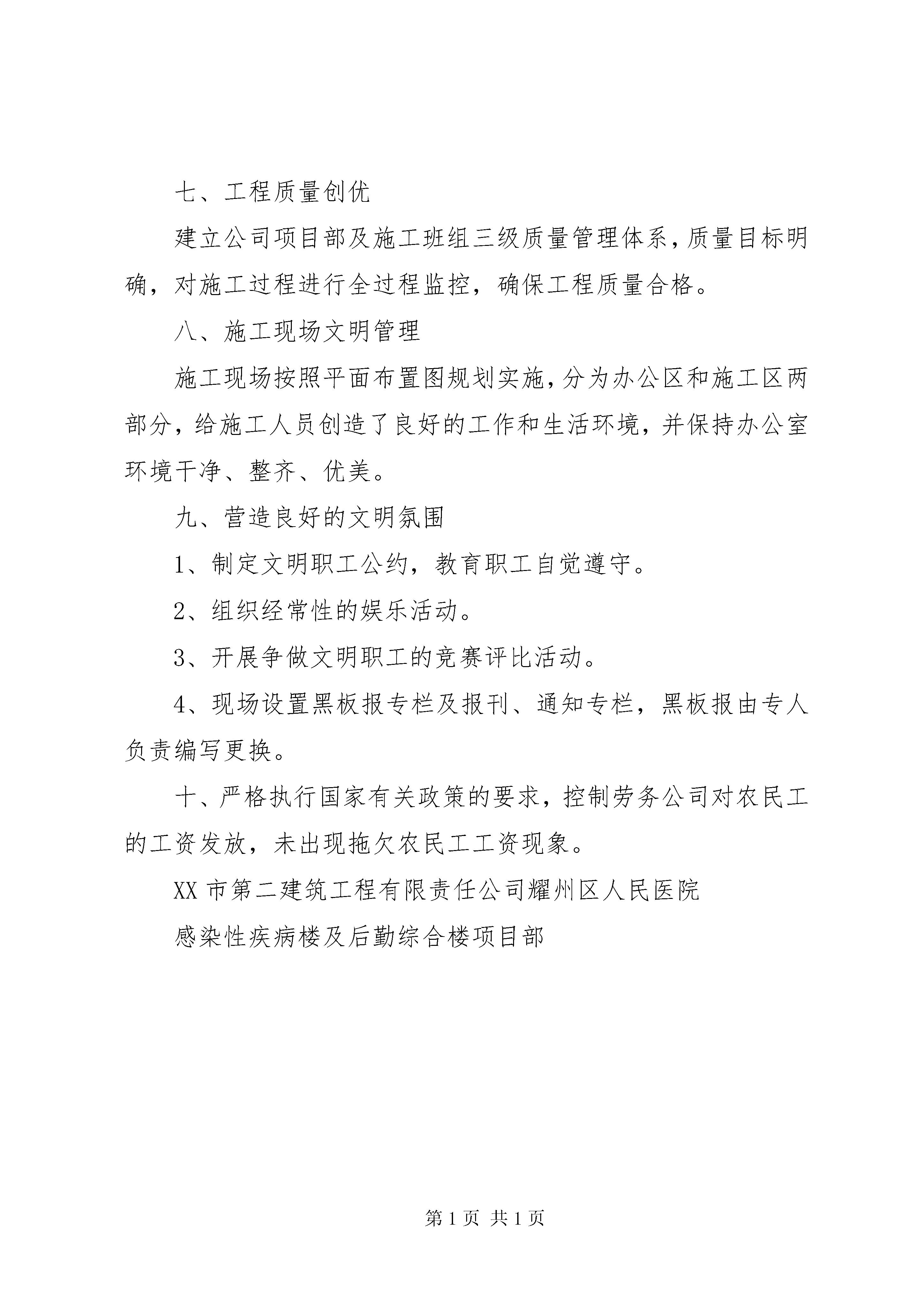 创建文明工地汇报材料耀州区人民医院感染性疾病楼及后勤综合楼创建文明工地汇报材料XX市第二建筑工程有限责任公司耀州区人民医院感染性疾病楼及后勤综合楼项目部目录一、工程概况二、文明工地创建目标三、创建文明工地目的四、文明工地管理体系五、文明工地管理措施六、安全达标七、工程质量创优八、施工现场文明管理九、营造良好的文明氛围十、防尘、防噪措施十一、工人工资支付创建文明工地汇报材料一、工程概况XX市耀州区人民医院感染性疾病楼、后勤综合楼工程位于XX市耀州仿古街西段北侧,感染性疾病楼3574.51m2,后勤综合楼5128.71m2,地下车库6355.5m2,感染性疾病楼地上三层,后勤综合楼地上五层,建筑总高度:感染性疾病楼为12.45米,后勤综合楼为20.55米,框架结构。建筑耐火等级为一级,建筑结构安全等级为二级,抗震设防烈度为7度。设计使用年限为50年。本工程由耀州区质量安全监督站监督;建设单位为耀州区人民医院;设计单位为XX市中泰华翰建筑设计有限公司;监理单位为陕西信远建设项目管理集团有限公司;施工单位为XX市第二建筑工程有限责任公司。二、文明工地创建目标:创建市级文明工地三、创建文明工地目的:通过创建文明工地活动,进一步明确项目管理人员的认识,提高管理人员的职业素质和安全生产、质量创优的管理水平,创造良好的文明施工氛围,树立“安全第一,质量是根本”的理念。四、文明工地管理措施与环境保护1、由于客观原因,使我项目部无法实施全封闭式施工,施工大门、门房及临边围护无法实施,直到现在现场内还有三户为搬迁,增加了现场管理难度,我们采取增加门卫、安全巡视人员,并安装红外线监控设备等措施,加强现场安全管理。2、现场施工道路用砼硬化,水泥库有防雨、防潮措施,搅拌机棚封闭搭设,无扬尘。3、进入工地东侧处设六牌一图,重大危险源告知牌。4、机械设备有操作规程牌,悬挂于醒目位置处。5、管理人员全部挂牌上岗。6、每天安排专人对现场施工区域进行清扫、洒水。7、建筑垃圾定点堆放,及时清理。8、工程所用砼采用商品砼,减少扬尘及噪声源。9、夜间10:00—凌晨6:00不进行施工,中高考期间严格执行地方政府的规定。10、施工以来没有出现扰民投诉电话。11、消防管理制度健全、责任落实到位、安全警示牌醒目,有针对性的制定防火、防爆和防雷预防措施。12、施工现场严禁明火、吸烟,楼层设有吸烟室。五、安全达标1、建立安全管理体系,健全安全管理制度,做到“安全第一,预防为主”。2、施工安全管理:(1)安全管理工作制度化,各分项工程施工方案编制有安全措施,各工序施工前进行安全交底,施工过程中进行安全巡视和安全定期检查,排出安全隐患,(2)进场工人都进行安全培训和安全教育,做到特种作业持证上岗。(3)“三宝、四口、五临边”施工用电以及机械设备安全定期进行重点检查并做好检查记录。(4)脚手架、转料平台、模板搭设严格执行批准的施工方案。3、临时用电总配电室按规范要求进行配置,采用tn-s系统。配电箱全部使用XX省建设厅推广的标准设备透明漏电保护和空开,严格实行三级配电二级保护。电缆线路采用穿管埋地或延墙敷设,临电电工持证上岗。5、架子工程(1)外架。后勤综合楼由三层挑出,三层以下采用双排落地脚手架;感染性疾病楼由二层挑出,二层以下采用双排落地脚手架。固定端不小于外挑段的1.25倍,斜拉绳采用16X钢丝绳,搭设采用的钢管、扣件、工字钢、密目网合格。搭设步距、间距、剪刀撑、连墙件、小横杆、脚手板符合要求。(2)外架采用全封闭式安全网搭设。(3)模板采用扣件式金属钢管架,步距排距剪刀撑,设置严格按施工方案搭设,强度、刚度、稳定性满足砼构件浇筑要求七、工程质量创优建立公司项目部及施工班组三级质量管理体系,质量目标明确,对施工过程进行全过程监控,确保工程质量合格。八、施工现场文明管理施工现场按照平面布置图规划实施,分为办公区和施工区两部分,给施工人员创造了良好的工作和生活环境,并保持办公室环境干净、整齐、优美。九、营造良好的文明氛围1、制定文明职工公约,教育职工自觉遵守。2、组织经常性的娱乐活动。3、开展争做文明职工的竞赛评比活动。4、现场设置黑板报专栏及报刊、通知专栏,黑板报由专人负责编写更换。十、严格执行国家有关政策的要求,控制劳务公司对农民工的工资发放,未出现拖欠农民工工资现象。XX市第二建筑工程有限责任公司耀州区人民医院感染性疾病楼及后勤综合楼项目部