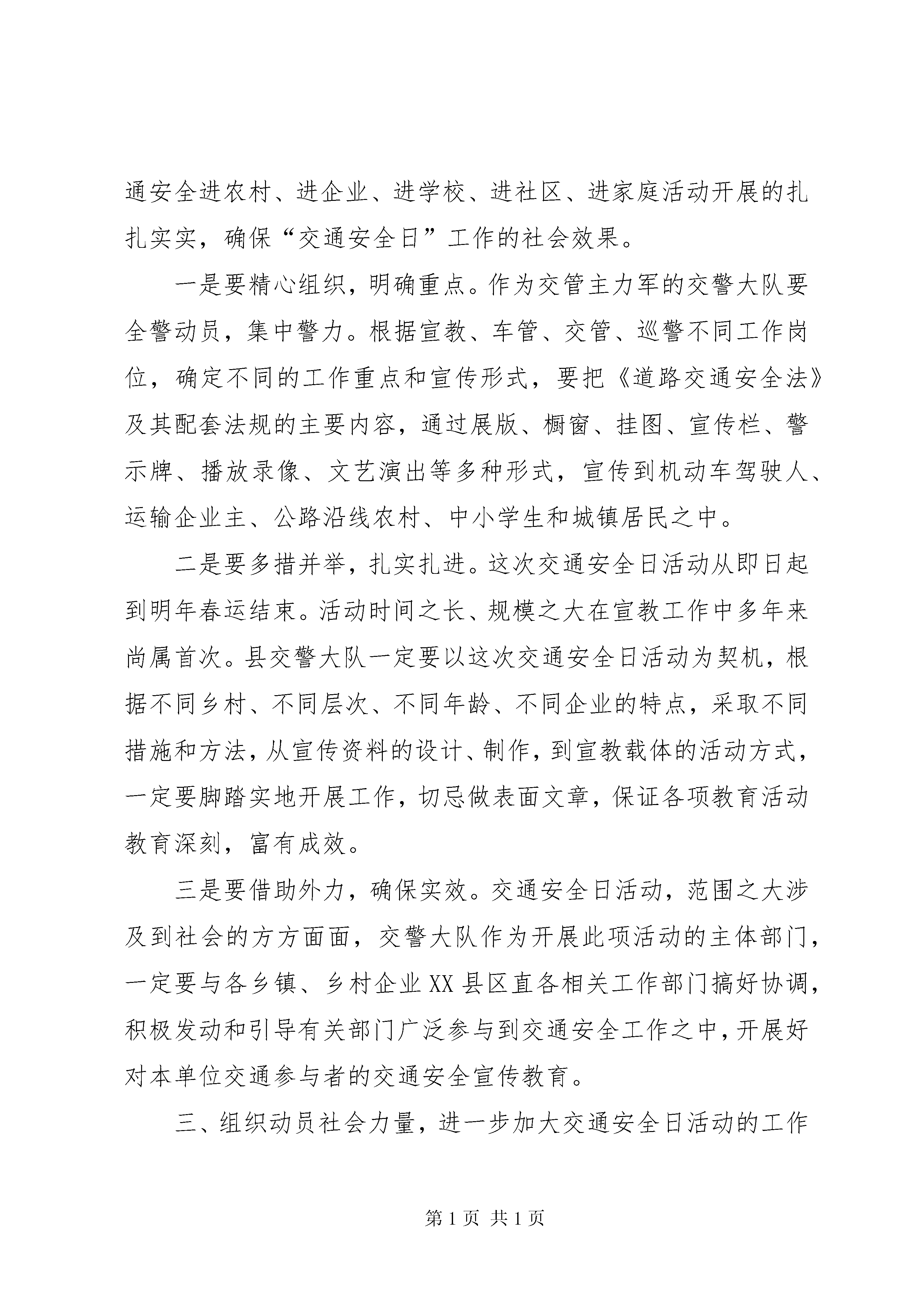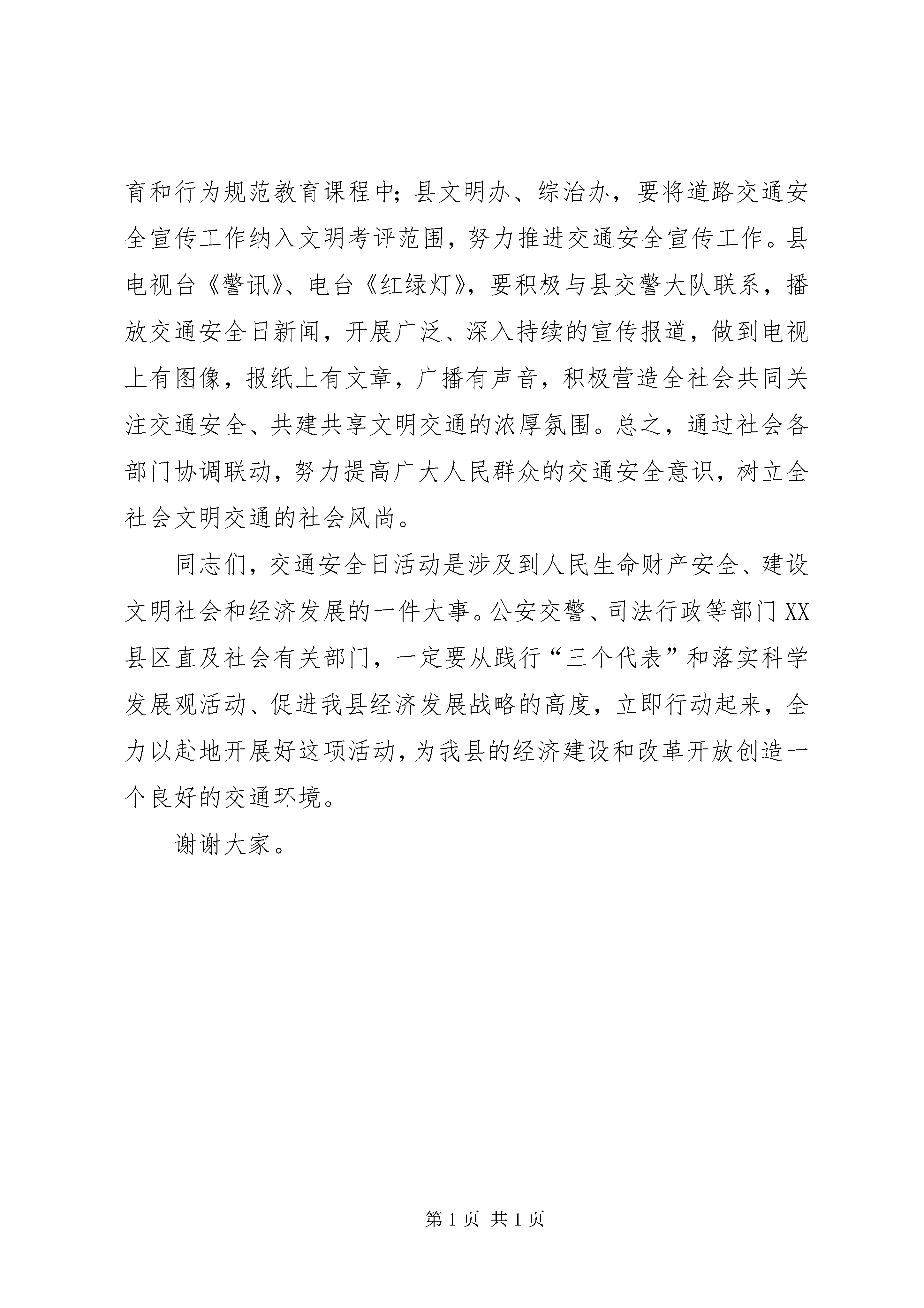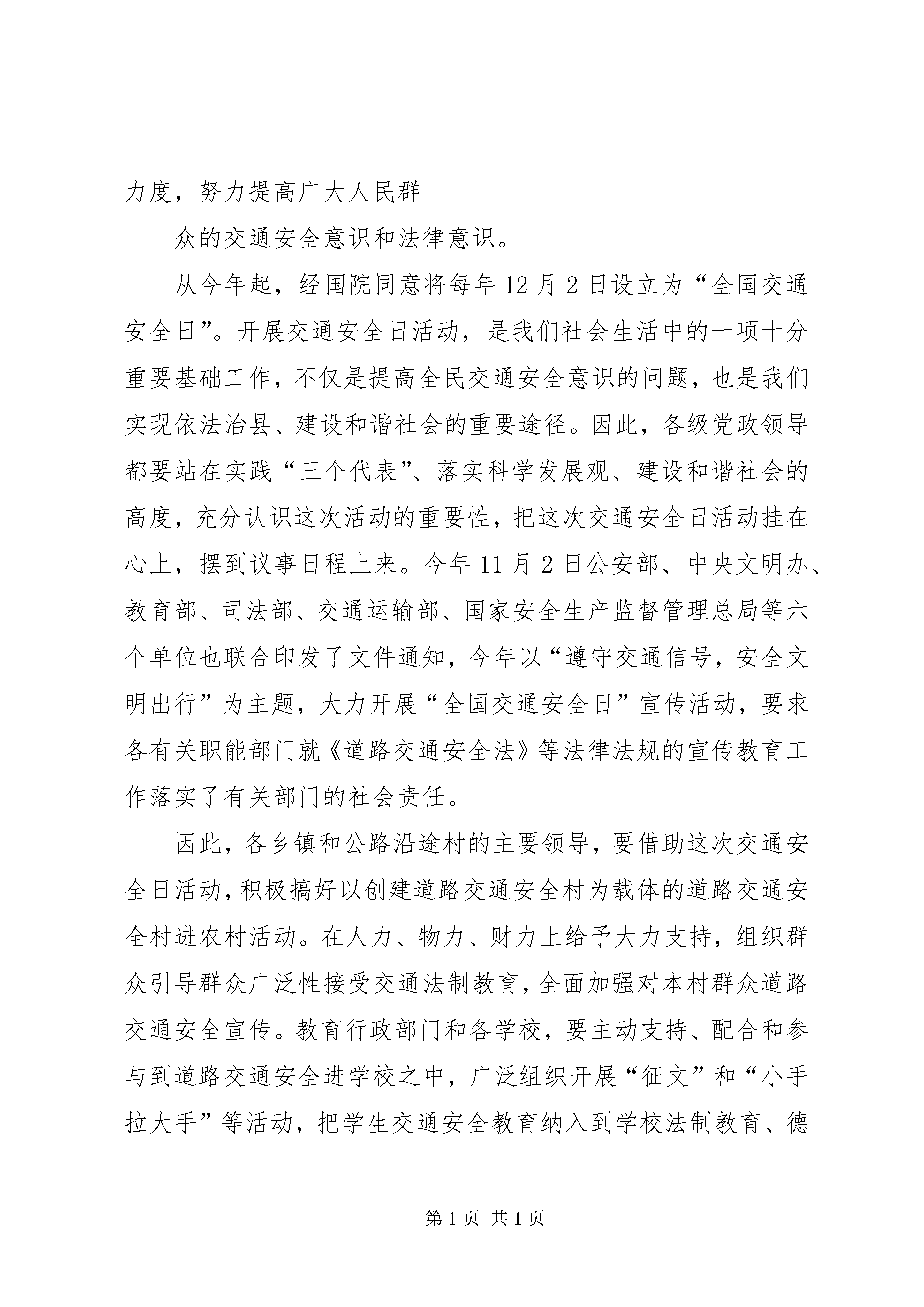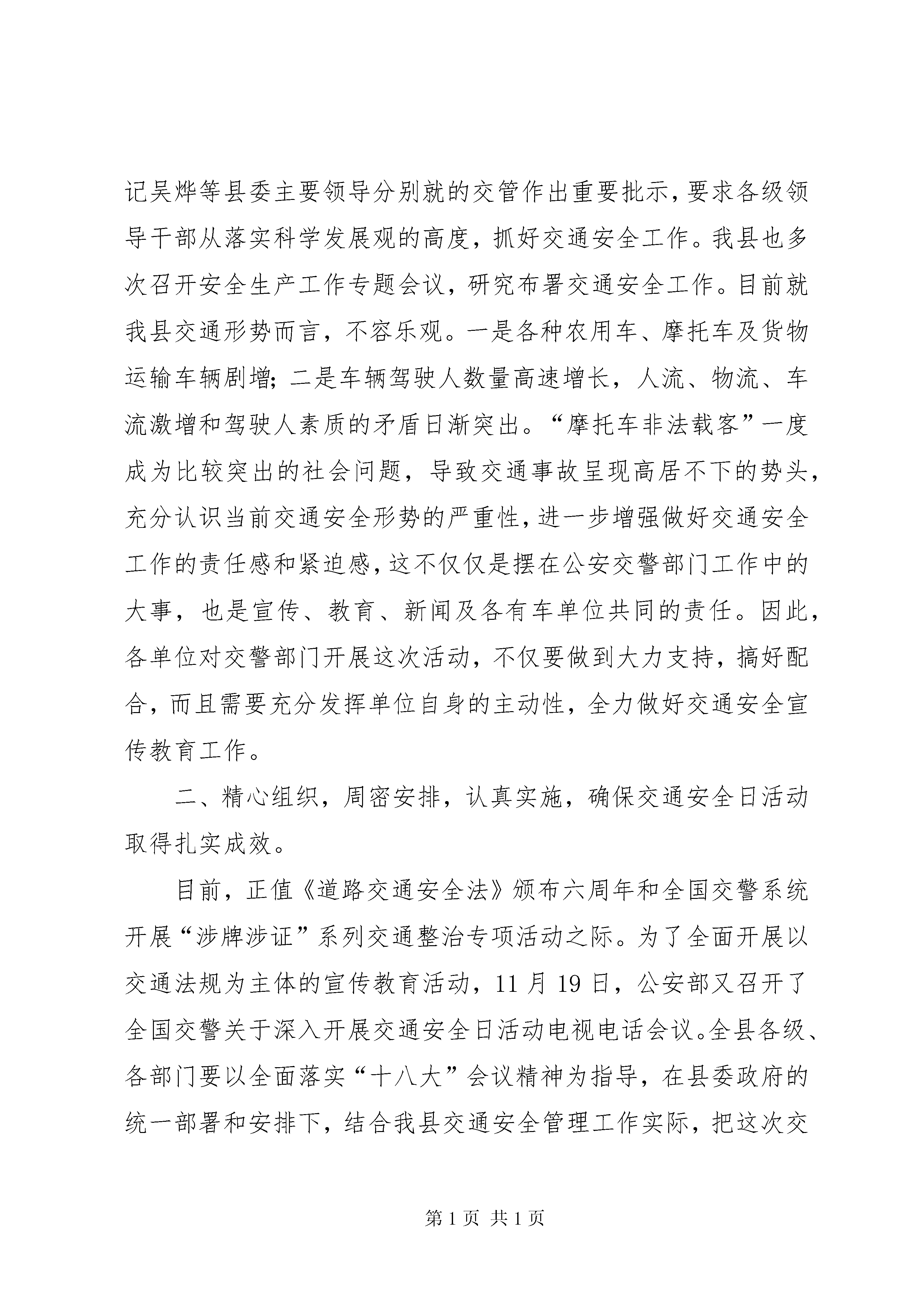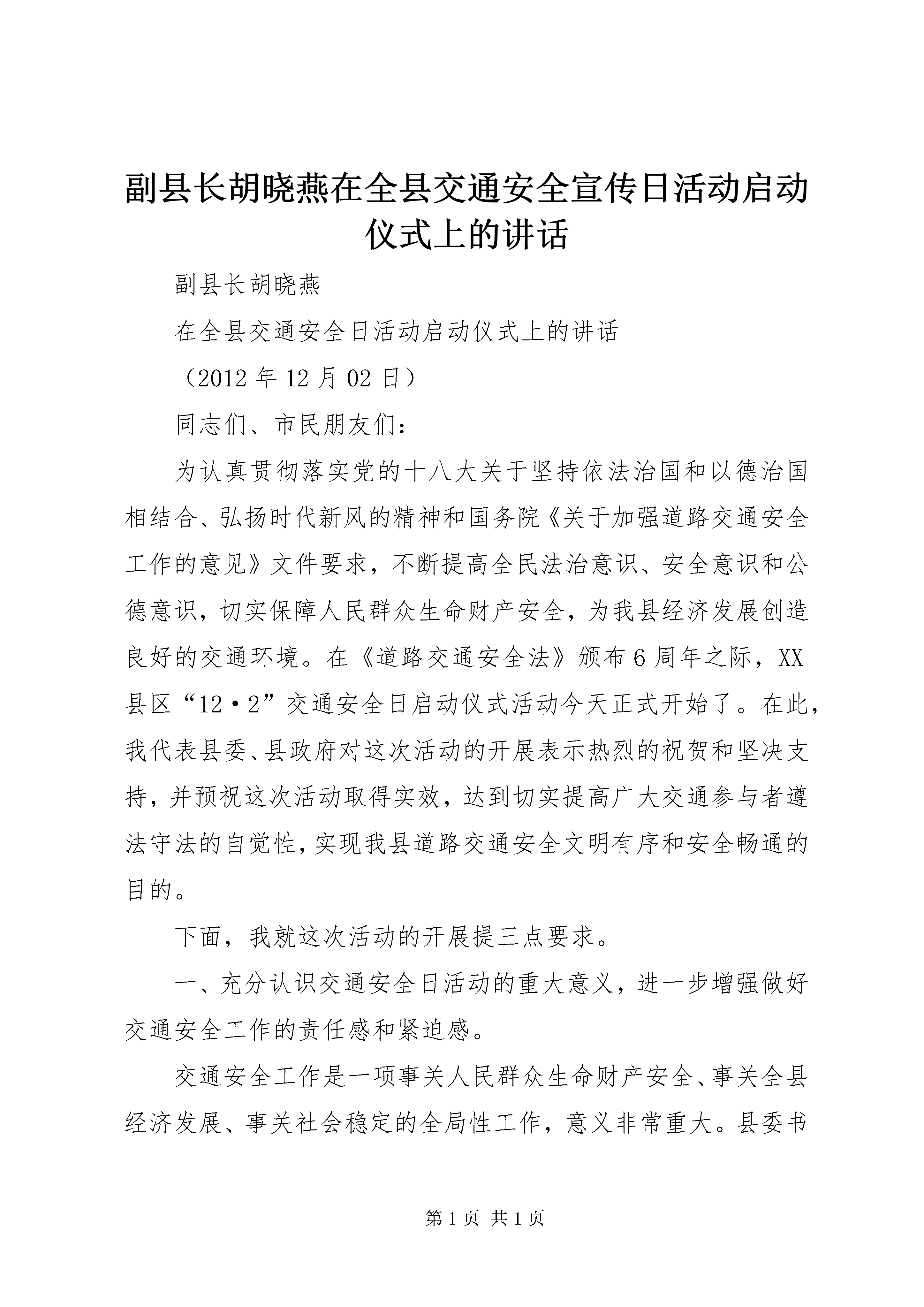 副县长胡晓燕在全县交通安全宣传日活动启动仪式上的讲话副县长胡晓燕在全县交通安全日活动启动仪式上的讲话(2012年12月02日)同志们、市民朋友们:为认真贯彻落实党的十八大关于坚持依法治国和以德治国相结合、弘扬时代新风的精神和国务院《关于加强道路交通安全工作的意见》文件要求,不断提高全民法治意识、安全意识和公德意识,切实保障人民群众生命财产安全,为我县经济发展创造良好的交通环境。在《道路交通安全法》颁布6周年之际,XX县区“12·2”交通安全日启动仪式活动今天正式开始了。在此,我代表县委、县政府对这次活动的开展表示热烈的祝贺和坚决支持,并预祝这次活动取得实效,达到切实提高广大交通参与者遵法守法的自觉性,实现我县道路交通安全文明有序和安全畅通的目的。下面,我就这次活动的开展提三点要求。一、充分认识交通安全日活动的重大意义,进一步增强做好交通安全工作的责任感和紧迫感。交通安全工作是一项事关人民群众生命财产安全、事关全县经济发展、事关社会稳定的全局性工作,意义非常重大。县委书记吴烨等县委主要领导分别就的交管作出重要批示,要求各级领导干部从落实科学发展观的高度,抓好交通安全工作。我县也多次召开安全生产工作专题会议,研究布署交通安全工作。目前就我县交通形势而言,不容乐观。一是各种农用车、摩托车及货物运输车辆剧增;二是车辆驾驶人数量高速增长,人流、物流、车流激增和驾驶人素质的矛盾日渐突出。“摩托车非法载客”一度成为比较突出的社会问题,导致交通事故呈现高居不下的势头,充分认识当前交通安全形势的严重性,进一步增强做好交通安全工作的责任感和紧迫感,这不仅仅是摆在公安交警部门工作中的大事,也是宣传、教育、新闻及各有车单位共同的责任。因此,各单位对交警部门开展这次活动,不仅要做到大力支持,搞好配合,而且需要充分发挥单位自身的主动性,全力做好交通安全宣传教育工作。二、精心组织,周密安排,认真实施,确保交通安全日活动取得扎实成效。目前,正值《道路交通安全法》颁布六周年和全国交警系统开展“涉牌涉证”系列交通整治专项活动之际。为了全面开展以交通法规为主体的宣传教育活动,11月19日,公安部又召开了全国交警关于深入开展交通安全日活动电视电话会议。全县各级、各部门要以全面落实“十八大”会议精神为指导,在县委政府的统一部署和安排下,结合我县交通安全管理工作实际,把这次交通安全进农村、进企业、进学校、进社区、进家庭活动开展的扎扎实实,确保“交通安全日”工作的社会效果。一是要精心组织,明确重点。作为交管主力军的交警大队要全警动员,集中警力。根据宣教、车管、交管、巡警不同工作岗位,确定不同的工作重点和宣传形式,要把《道路交通安全法》及其配套法规的主要内容,通过展版、橱窗、挂图、宣传栏、警示牌、播放录像、文艺演出等多种形式,宣传到机动车驾驶人、运输企业主、公路沿线农村、中小学生和城镇居民之中。二是要多措并举,扎实扎进。这次交通安全日活动从即日起到明年春运结束。活动时间之长、规模之大在宣教工作中多年来尚属首次。县交警大队一定要以这次交通安全日活动为契机,根据不同乡村、不同层次、不同年龄、不同企业的特点,采取不同措施和方法,从宣传资料的设计、制作,到宣教载体的活动方式,一定要脚踏实地开展工作,切忌做表面文章,保证各项教育活动教育深刻,富有成效。三是要借助外力,确保实效。交通安全日活动,范围之大涉及到社会的方方面面,交警大队作为开展此项活动的主体部门,一定要与各乡镇、乡村企业XX县区直各相关工作部门搞好协调,积极发动和引导有关部门广泛参与到交通安全工作之中,开展好对本单位交通参与者的交通安全宣传教育。三、组织动员社会力量,进一步加大交通安全日活动的工作力度,努力提高广大人民群众的交通安全意识和法律意识。从今年起,经国院同意将每年12月2日设立为“全国交通安全日”。开展交通安全日活动,是我们社会生活中的一项十分重要基础工作,不仅是提高全民交通安全意识的问题,也是我们实现依法治县、建设和谐社会的重要途径。因此,各级党政领导都要站在实践“三个代表”、落实科学发展观、建设和谐社会的高度,充分认识这次活动的重要性,把这次交通安全日活动挂在心上,摆到议事日程上来。今年11月2日公安部、中央文明办、教育部、司法部、交通运输部、国家安全生产监督管理总局等六个单位也联合印发了文件通知,今年以“遵守交通信号,安全文明出行”为主题,大力开展“全国交通安全日”宣传活动,要求各有关职能部门就《道路交通安全法》等法律法规的宣传教育工作落实了有关部门的社会责任。因此,各乡镇和公路沿途村的主要领导,要借助这次交通安全日活动,积极搞好以创建道路交通安全村为载体的道路交通安全村进农村活动。在人力、物力、财力上给予大力支持,组织群众引导群众广泛性接受交通法制教育,全面加强对本村群众道路交通