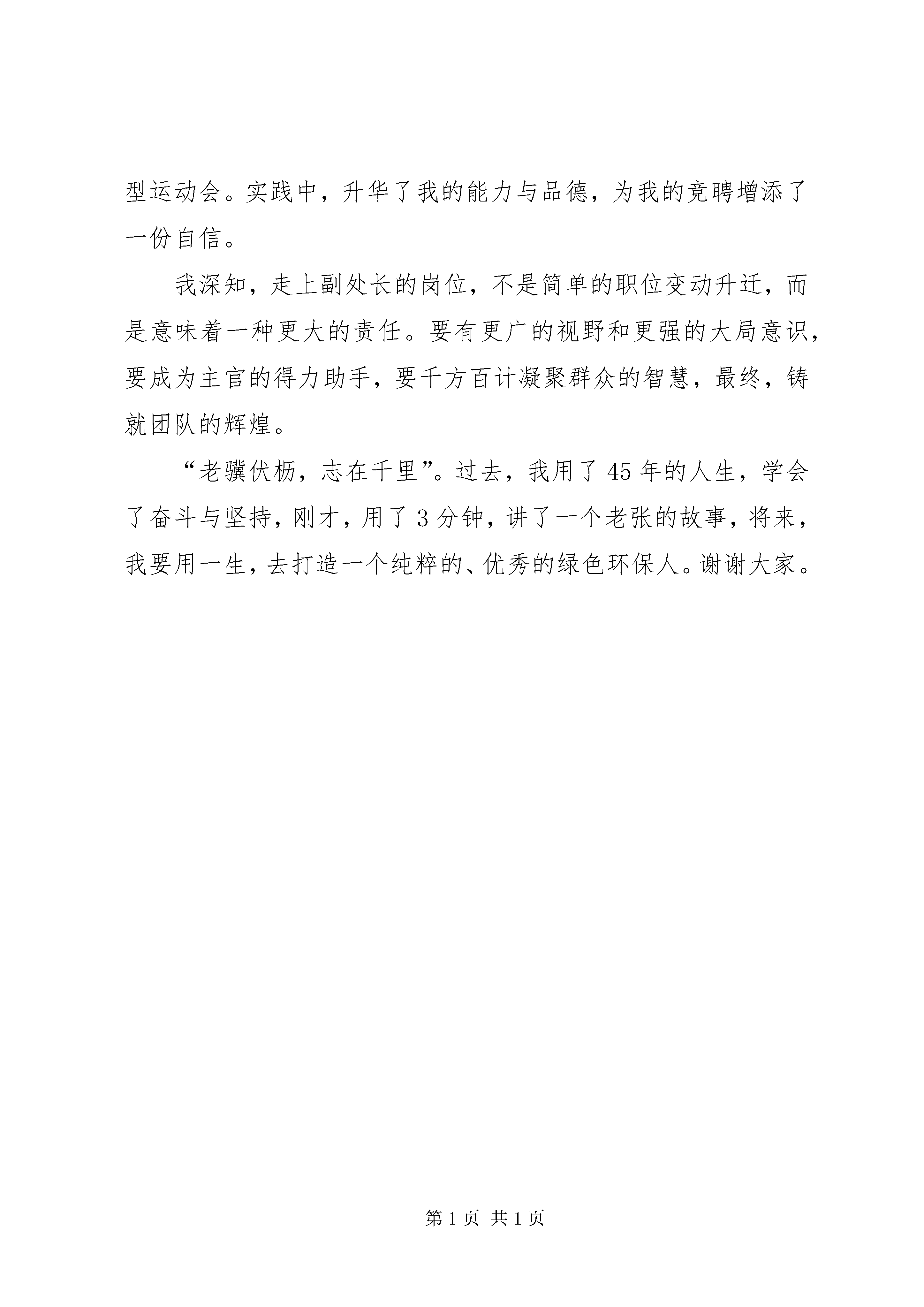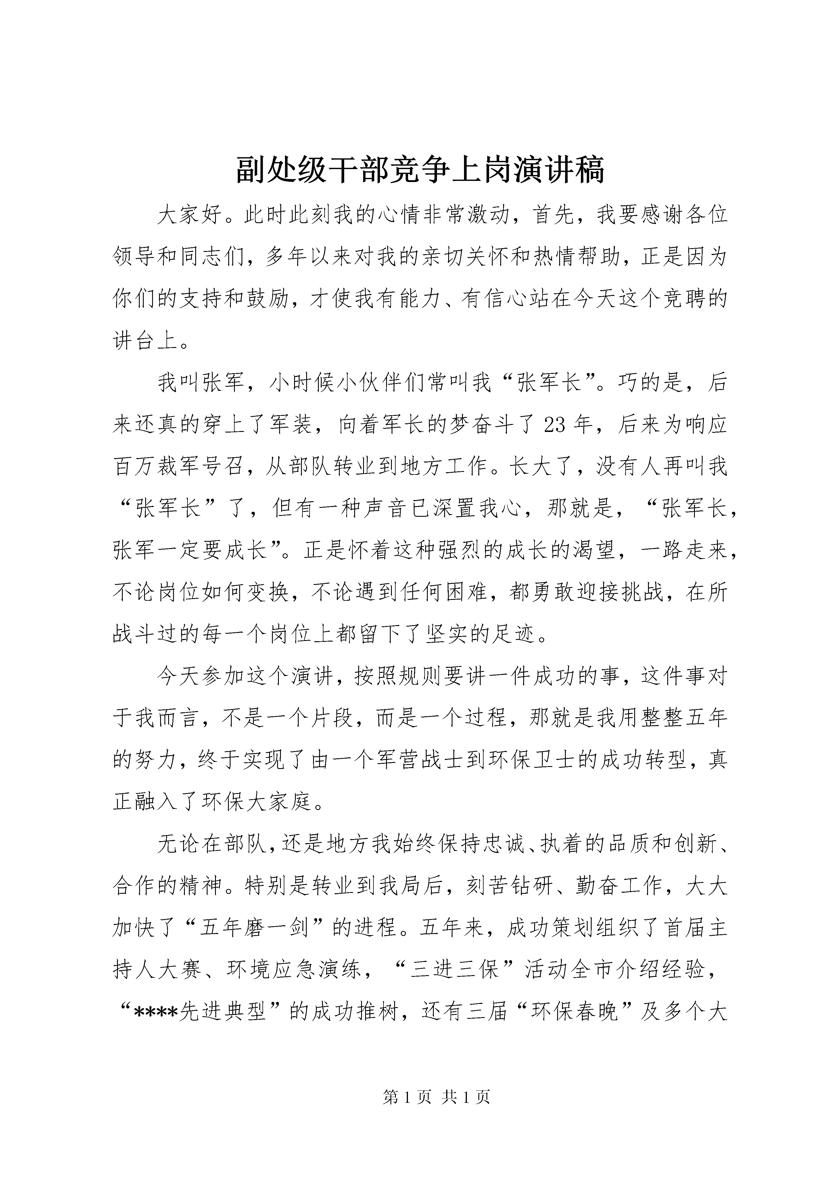 副处级干部竞争上岗演讲稿大家好。此时此刻我的心情非常激动,首先,我要感谢各位领导和同志们,多年以来对我的亲切关怀和热情帮助,正是因为你们的支持和鼓励,才使我有能力、有信心站在今天这个竞聘的讲台上。我叫张军,小时候小伙伴们常叫我“张军长”。巧的是,后来还真的穿上了军装,向着军长的梦奋斗了23年,后来为响应百万裁军号召,从部队转业到地方工作。长大了,没有人再叫我“张军长”了,但有一种声音已深置我心,那就是,“张军长,张军一定要成长”。正是怀着这种强烈的成长的渴望,一路走来,不论岗位如何变换,不论遇到任何困难,都勇敢迎接挑战,在所战斗过的每一个岗位上都留下了坚实的足迹。今天参加这个演讲,按照规则要讲一件成功的事,这件事对于我而言,不是一个片段,而是一个过程,那就是我用整整五年的努力,终于实现了由一个军营战士到环保卫士的成功转型,真正融入了环保大家庭。无论在部队,还是地方我始终保持忠诚、执着的品质和创新、合作的精神。特别是转业到我局后,刻苦钻研、勤奋工作,大大加快了“五年磨一剑”的进程。五年来,成功策划组织了首届主持人大赛、环境应急演练,“三进三保”活动全市介绍经验,“****先进典型”的成功推树,还有三届“环保春晚”及多个大型运动会。实践中,升华了我的能力与品德,为我的竞聘增添了一份自信。我深知,走上副处长的岗位,不是简单的职位变动升迁,而是意味着一种更大的责任。要有更广的视野和更强的大局意识,要成为主官的得力助手,要千方百计凝聚群众的智慧,最终,铸就团队的辉煌。“老骥伏枥,志在千里”。过去,我用了45年的人生,学会了奋斗与坚持,刚才,用了3分钟,讲了一个老张的故事,将来,我要用一生,去打造一个纯粹的、优秀的绿色环保人。谢谢大家。