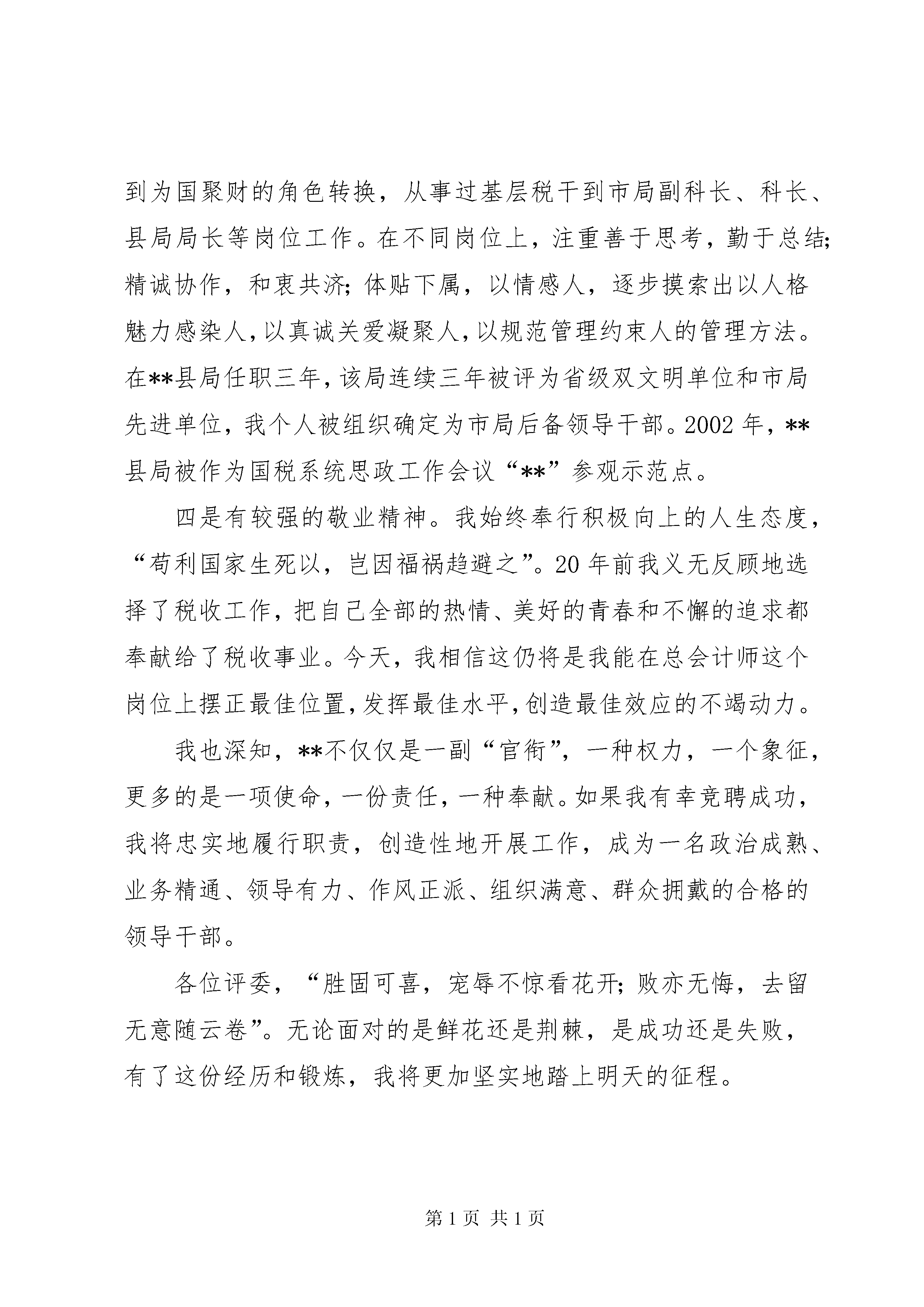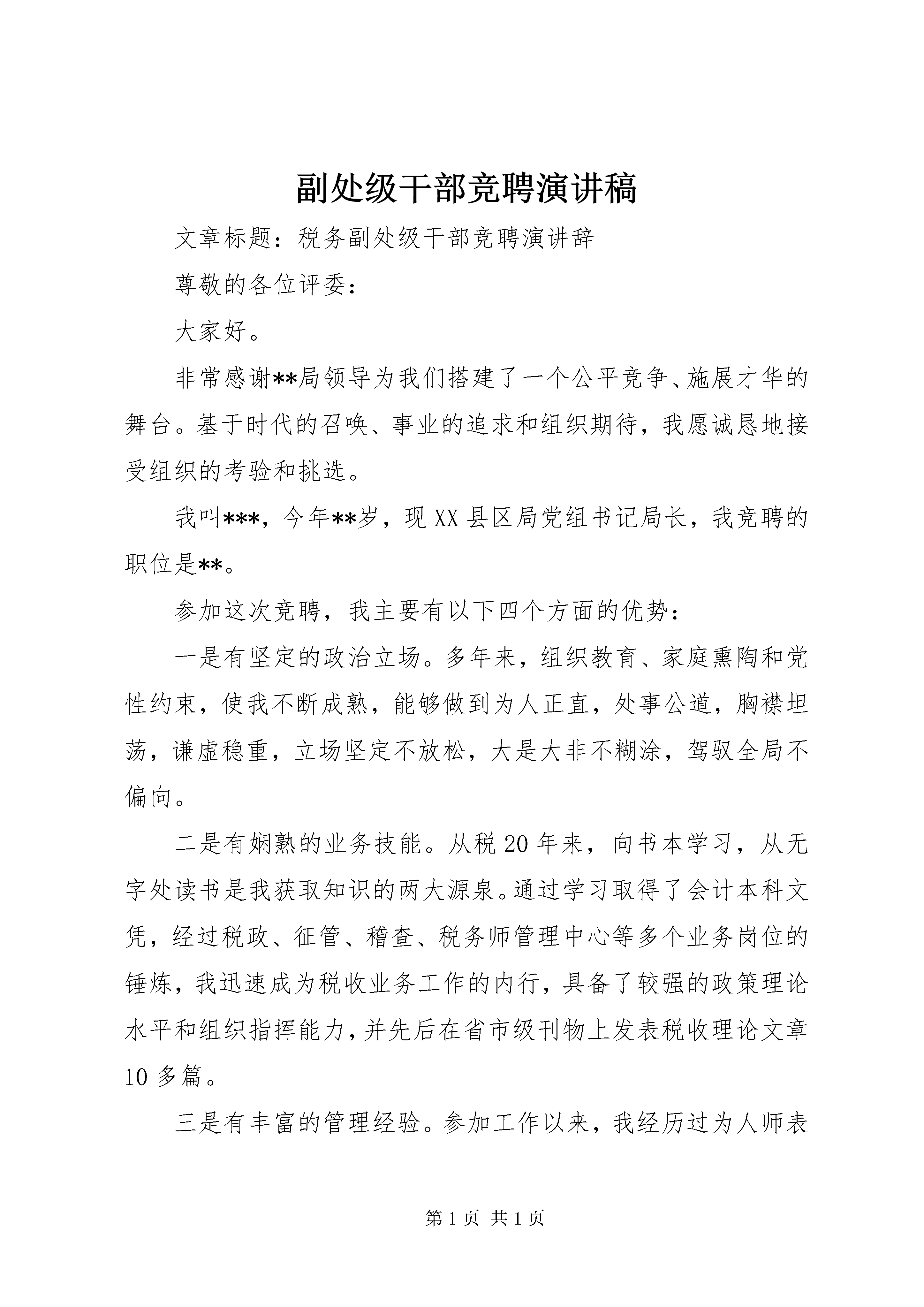 副处级干部竞聘演讲稿文章标题:税务副处级干部竞聘演讲辞尊敬的各位评委:大家好。非常感谢**局领导为我们搭建了一个公平竞争、施展才华的舞台。基于时代的召唤、事业的追求和组织期待,我愿诚恳地接受组织的考验和挑选。我叫***,今年**岁,现XX县区局党组书记局长,我竞聘的职位是**。参加这次竞聘,我主要有以下四个方面的优势:一是有坚定的政治立场。多年来,组织教育、家庭熏陶和党性约束,使我不断成熟,能够做到为人正直,处事公道,胸襟坦荡,谦虚稳重,立场坚定不放松,大是大非不糊涂,驾驭全局不偏向。二是有娴熟的业务技能。从税20年来,向书本学习,从无字处读书是我获取知识的两大源泉。通过学习取得了会计本科文凭,经过税政、征管、稽查、税务师管理中心等多个业务岗位的锤炼,我迅速成为税收业务工作的内行,具备了较强的政策理论水平和组织指挥能力,并先后在省市级刊物上发表税收理论文章10多篇。三是有丰富的管理经验。参加工作以来,我经历过为人师表到为国聚财的角色转换,从事过基层税干到市局副科长、科长、县局局长等岗位工作。在不同岗位上,注重善于思考,勤于总结;精诚协作,和衷共济;体贴下属,以情感人,逐步摸索出以人格魅力感染人,以真诚关爱凝聚人,以规范管理约束人的管理方法。在**县局任职三年,该局连续三年被评为省级双文明单位和市局先进单位,我个人被组织确定为市局后备领导干部。2002年,**县局被作为国税系统思政工作会议“**”参观示范点。四是有较强的敬业精神。我始终奉行积极向上的人生态度,“苟利国家生死以,岂因福祸趋避之”。20年前我义无反顾地选择了税收工作,把自己全部的热情、美好的青春和不懈的追求都奉献给了税收事业。今天,我相信这仍将是我能在总会计师这个岗位上摆正最佳位置,发挥最佳水平,创造最佳效应的不竭动力。我也深知,**不仅仅是一副“官衔”,一种权力,一个象征,更多的是一项使命,一份责任,一种奉献。如果我有幸竞聘成功,我将忠实地履行职责,创造性地开展工作,成为一名政治成熟、业务精通、领导有力、作风正派、组织满意、群众拥戴的合格的领导干部。各位评委,“胜固可喜,宠辱不惊看花开;败亦无悔,去留无意随云卷”。无论面对的是鲜花还是荆棘,是成功还是失败,有了这份经历和锻炼,我将更加坚实地踏上明天的征程。谢谢大家。