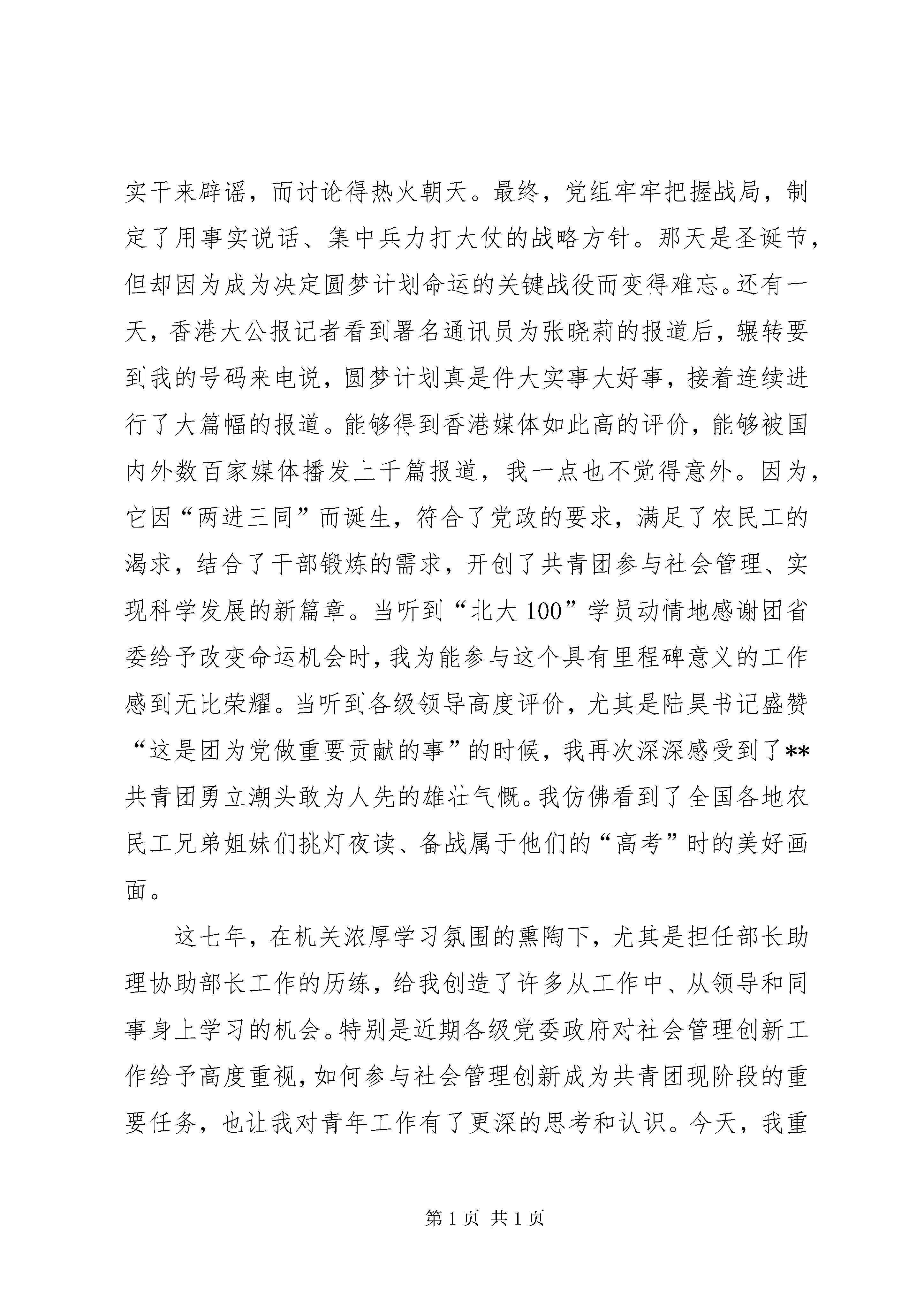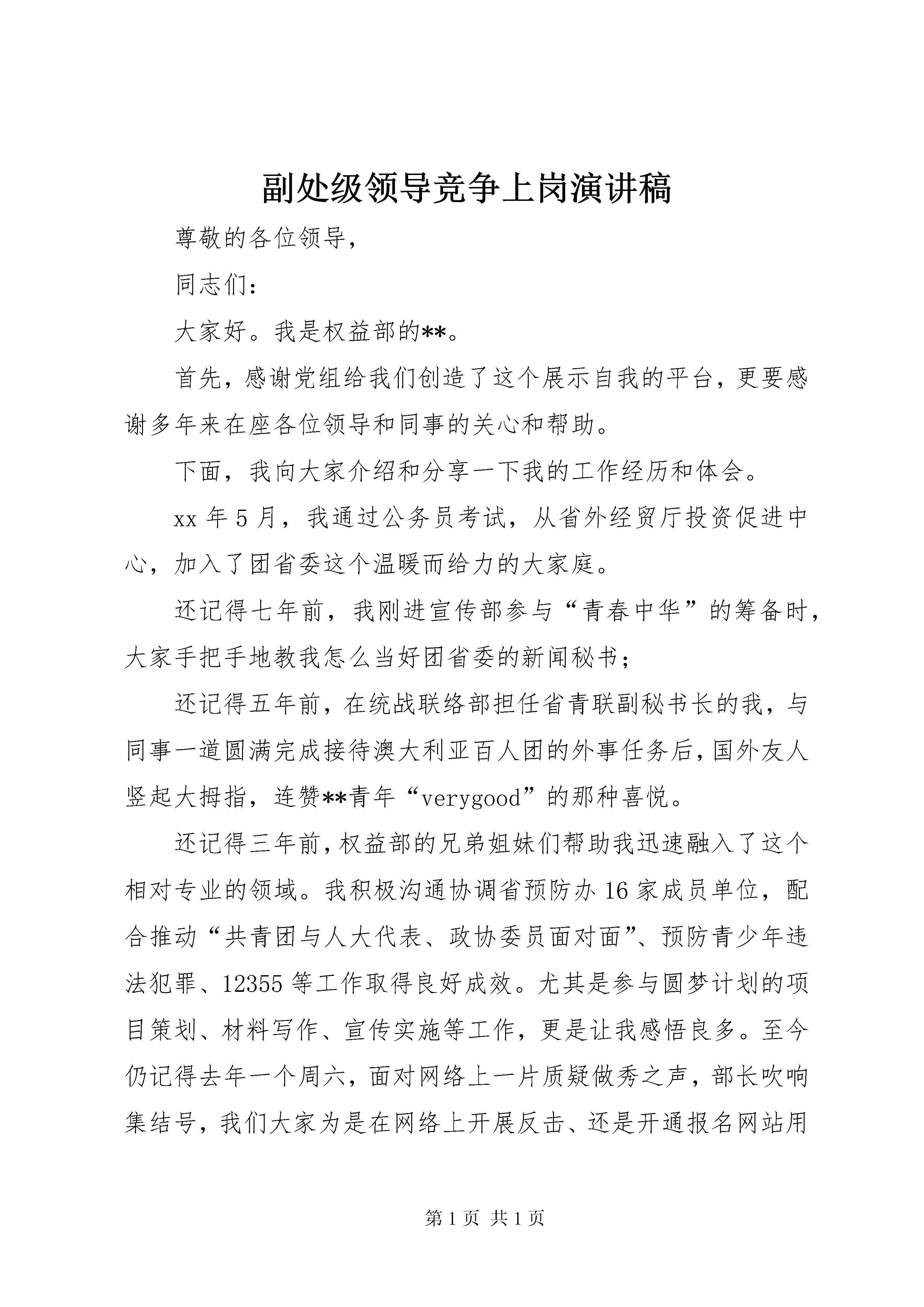 副处级领导竞争上岗演讲稿尊敬的各位领导,同志们:大家好。我是权益部的**。首先,感谢党组给我们创造了这个展示自我的平台,更要感谢多年来在座各位领导和同事的关心和帮助。下面,我向大家介绍和分享一下我的工作经历和体会。xx年5月,我通过公务员考试,从省外经贸厅投资促进中心,加入了团省委这个温暖而给力的大家庭。还记得七年前,我刚进宣传部参与“青春中华”的筹备时,大家手把手地教我怎么当好团省委的新闻秘书;还记得五年前,在统战联络部担任省青联副秘书长的我,与同事一道圆满完成接待澳大利亚百人团的外事任务后,国外友人竖起大拇指,连赞**青年“verygood”的那种喜悦。还记得三年前,权益部的兄弟姐妹们帮助我迅速融入了这个相对专业的领域。我积极沟通协调省预防办16家成员单位,配合推动“共青团与人大代表、政协委员面对面”、预防青少年违法犯罪、12355等工作取得良好成效。尤其是参与圆梦计划的项目策划、材料写作、宣传实施等工作,更是让我感悟良多。至今仍记得去年一个周六,面对网络上一片质疑做秀之声,部长吹响集结号,我们大家为是在网络上开展反击、还是开通报名网站用实干来辟谣,而讨论得热火朝天。最终,党组牢牢把握战局,制定了用事实说话、集中兵力打大仗的战略方针。那天是圣诞节,但却因为成为决定圆梦计划命运的关键战役而变得难忘。还有一天,香港大公报记者看到署名通讯员为张晓莉的报道后,辗转要到我的号码来电说,圆梦计划真是件大实事大好事,接着连续进行了大篇幅的报道。能够得到香港媒体如此高的评价,能够被国内外数百家媒体播发上千篇报道,我一点也不觉得意外。因为,它因“两进三同”而诞生,符合了党政的要求,满足了农民工的渴求,结合了干部锻炼的需求,开创了共青团参与社会管理、实现科学发展的新篇章。当听到“北大100”学员动情地感谢团省委给予改变命运机会时,我为能参与这个具有里程碑意义的工作感到无比荣耀。当听到各级领导高度评价,尤其是陆昊书记盛赞“这是团为党做重要贡献的事”的时候,我再次深深感受到了**共青团勇立潮头敢为人先的雄壮气慨。我仿佛看到了全国各地农民工兄弟姐妹们挑灯夜读、备战属于他们的“高考”时的美好画面。这七年,在机关浓厚学习氛围的熏陶下,尤其是担任部长助理协助部长工作的历练,给我创造了许多从工作中、从领导和同事身上学习的机会。特别是近期各级党委政府对社会管理创新工作给予高度重视,如何参与社会管理创新成为共青团现阶段的重要任务,也让我对青年工作有了更深的思考和认识。今天,我重点选择共青团组织参与社会管理创新谈点粗浅认识。一是组织建设上,要加强团的基层组织建设和基层工作,实施好这个“生命力工程”。要全面推进乡镇和街道团的组织格局创新,力求在城市社区打造团的工作网络,并且纳入到党政社会管理创新格局中去。二是工作内容设计上,要找准团的根本属性、根本任务和重点青少年群体普遍性诉求相结合的工作切入点,打造品牌,帮助他们成长成才。我感觉目前特别迫切的,是要围绕在校学生和农民工两个重点群体,尤其是新生代产业工人、农民工子女和留守儿童提供服务。要全力推进“圆梦计划”,帮助新生代产业工人圆他们的读书梦、婚恋梦和文学梦。要复制推广“北大100”模式,为党在新生代产业工人中培养基本可依靠力量。三是队伍建设上,要充分发挥团干部、青年社团组织骨干和志愿者三支队伍在社会管理创新中的作用。基层团干部要主动适应新形势,不断提升参与社会管理创新的素质和能力。要通过“社工+义工”的工作模式,积极承接政府公共服务外包、委托代理等工作职能。四是制度保障上,要坚持“重心下移”,将工作资源、活动载体和工作力量向基层一线倾斜。不断深化“两进三同”行动,继续实施“千万资金下基层”、团代表“双访”青年制度等,完善共青团参与社会管理创新的制度性安排。竞争上岗也是一次锻炼,我将以一颗平常心对待。总之,无论在哪个岗位,都恳请大家一如既往地关心我、帮助我、支持我。在共青团的岗位上,我将以“两家三者”为目标,坚定一个信念,就是:事不避难、勇于担当、奋勇向前。与大家一道,为共青团事业努力奋斗。