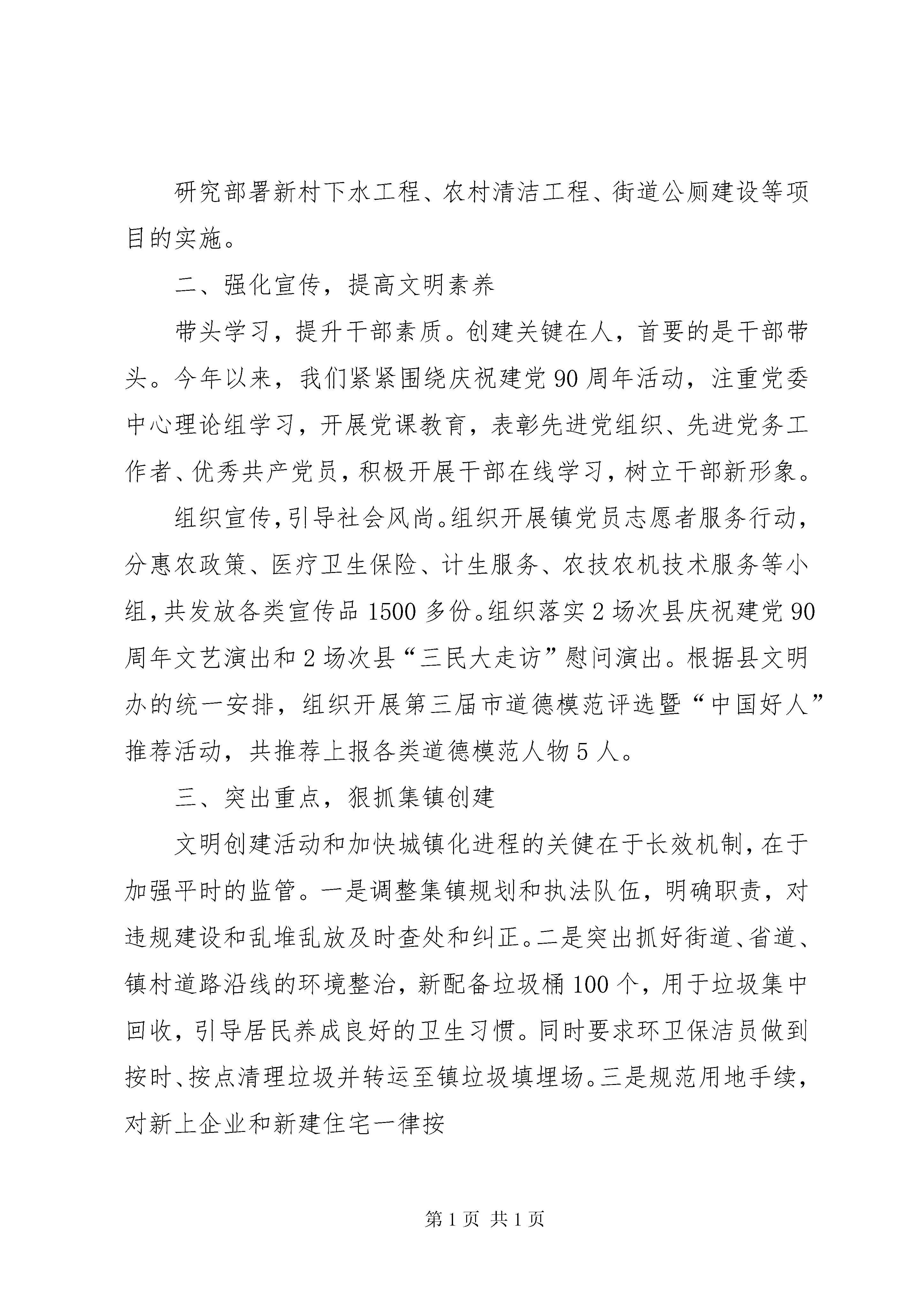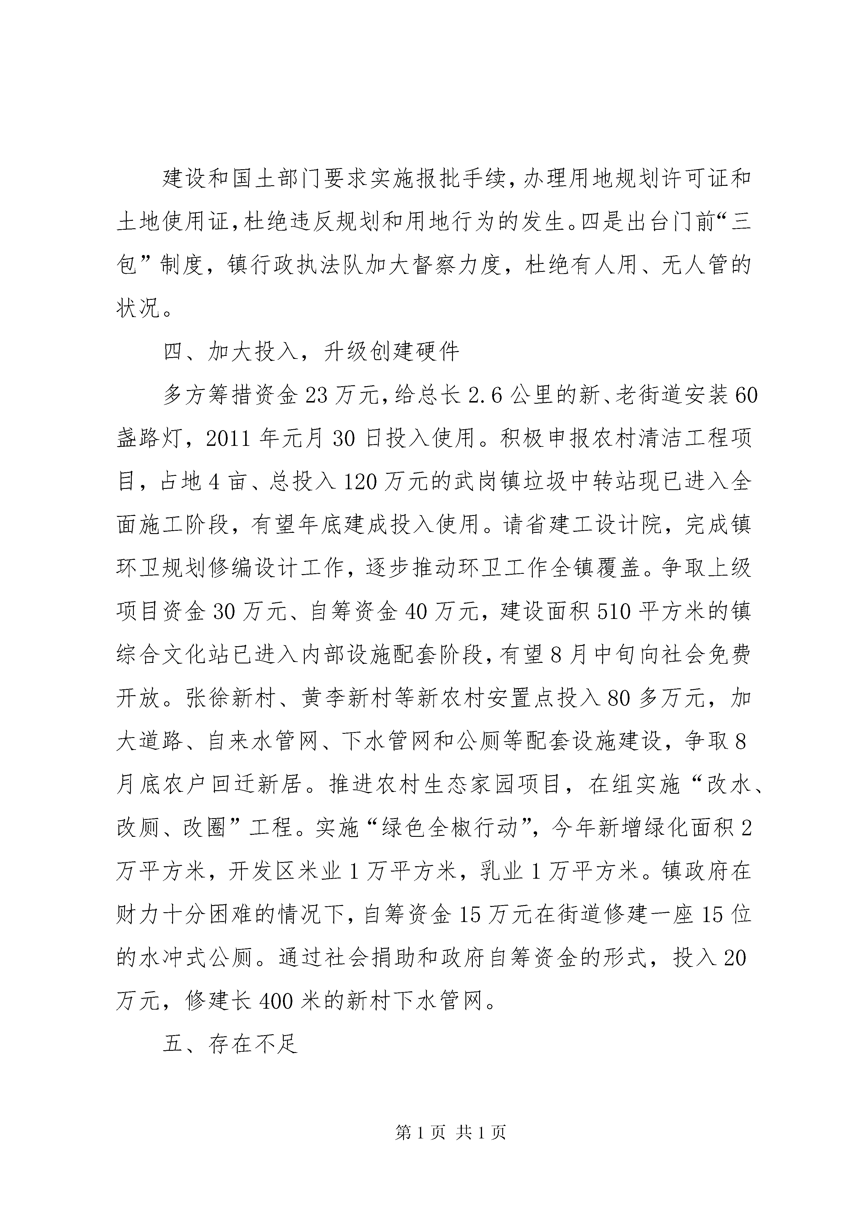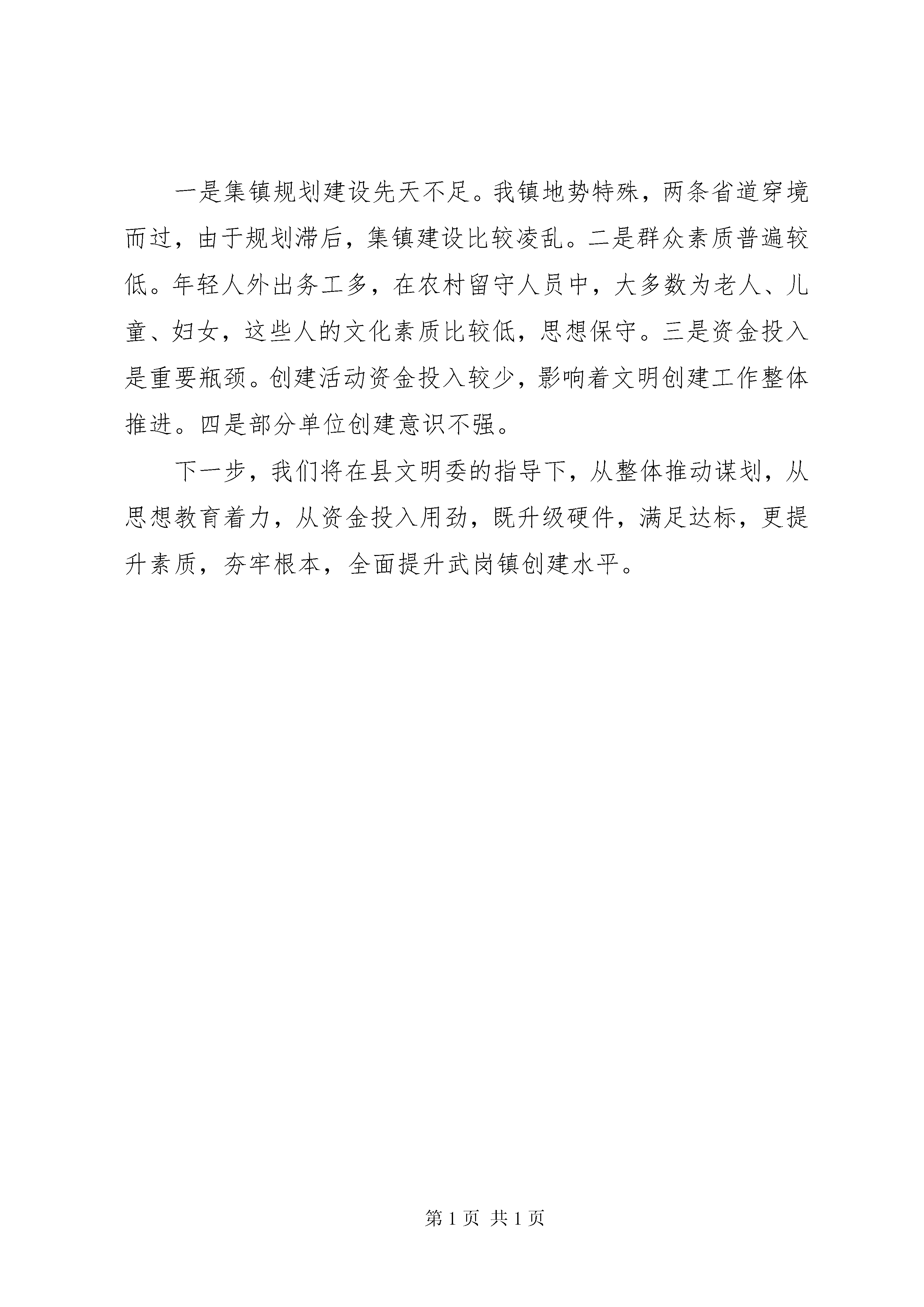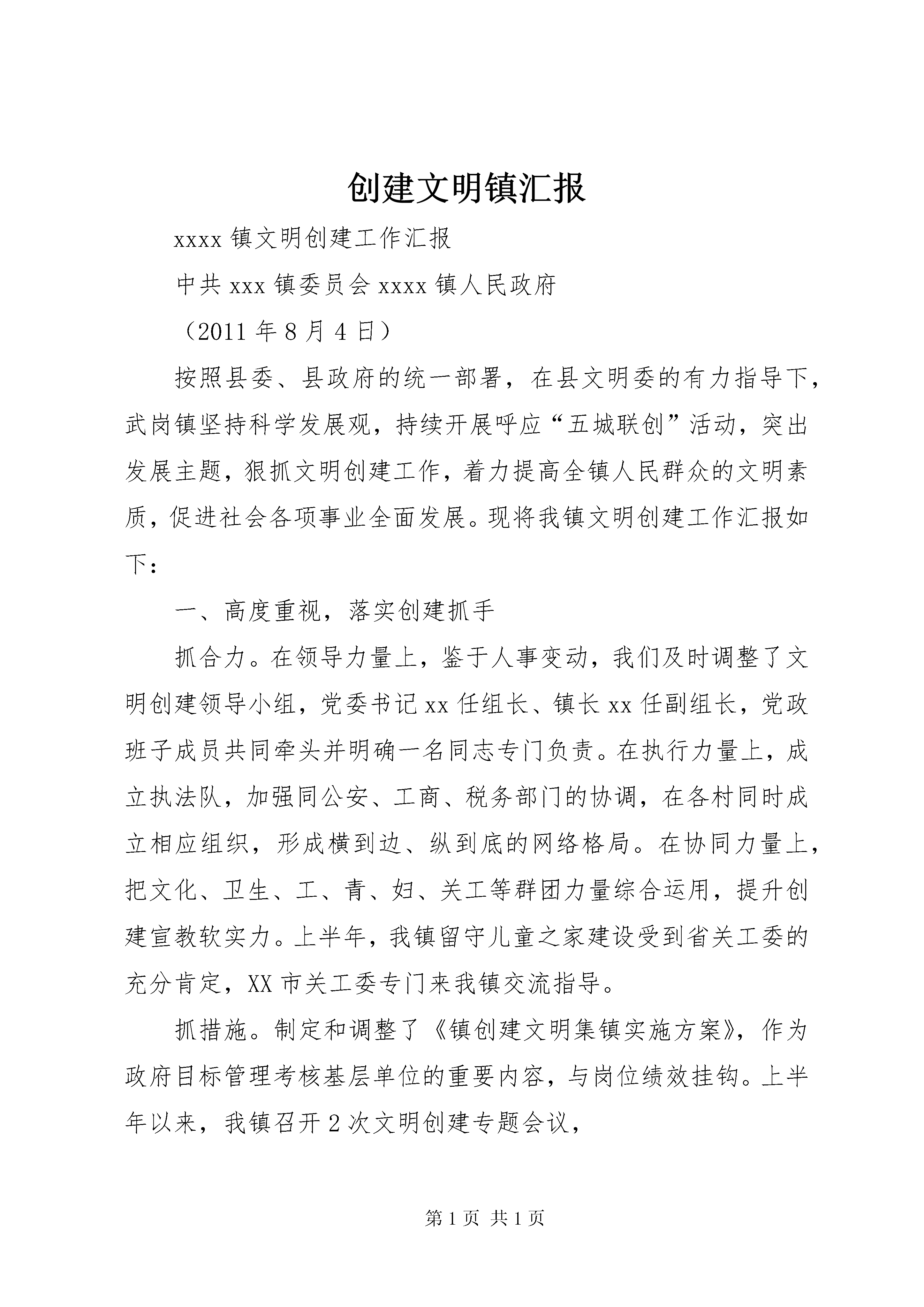 创建文明镇汇报xxxx镇文明创建工作汇报中共xxx镇委员会xxxx镇人民政府(2011年8月4日)按照县委、县政府的统一部署,在县文明委的有力指导下,武岗镇坚持科学发展观,持续开展呼应“五城联创”活动,突出发展主题,狠抓文明创建工作,着力提高全镇人民群众的文明素质,促进社会各项事业全面发展。现将我镇文明创建工作汇报如下:一、高度重视,落实创建抓手抓合力。在领导力量上,鉴于人事变动,我们及时调整了文明创建领导小组,党委书记xx任组长、镇长xx任副组长,党政班子成员共同牵头并明确一名同志专门负责。在执行力量上,成立执法队,加强同公安、工商、税务部门的协调,在各村同时成立相应组织,形成横到边、纵到底的网络格局。在协同力量上,把文化、卫生、工、青、妇、关工等群团力量综合运用,提升创建宣教软实力。上半年,我镇留守儿童之家建设受到省关工委的充分肯定,XX市关工委专门来我镇交流指导。抓措施。制定和调整了《镇创建文明集镇实施方案》,作为政府目标管理考核基层单位的重要内容,与岗位绩效挂钩。上半年以来,我镇召开2次文明创建专题会议,研究部署新村下水工程、农村清洁工程、街道公厕建设等项目的实施。二、强化宣传,提高文明素养带头学习,提升干部素质。创建关键在人,首要的是干部带头。今年以来,我们紧紧围绕庆祝建党90周年活动,注重党委中心理论组学习,开展党课教育,表彰先进党组织、先进党务工作者、优秀共产党员,积极开展干部在线学习,树立干部新形象。组织宣传,引导社会风尚。组织开展镇党员志愿者服务行动,分惠农政策、医疗卫生保险、计生服务、农技农机技术服务等小组,共发放各类宣传品1500多份。组织落实2场次县庆祝建党90周年文艺演出和2场次县“三民大走访”慰问演出。根据县文明办的统一安排,组织开展第三届市道德模范评选暨“中国好人”推荐活动,共推荐上报各类道德模范人物5人。三、突出重点,狠抓集镇创建文明创建活动和加快城镇化进程的关健在于长效机制,在于加强平时的监管。一是调整集镇规划和执法队伍,明确职责,对违规建设和乱堆乱放及时查处和纠正。二是突出抓好街道、省道、镇村道路沿线的环境整治,新配备垃圾桶100个,用于垃圾集中回收,引导居民养成良好的卫生习惯。同时要求环卫保洁员做到按时、按点清理垃圾并转运至镇垃圾填埋场。三是规范用地手续,对新上企业和新建住宅一律按建设和国土部门要求实施报批手续,办理用地规划许可证和土地使用证,杜绝违反规划和用地行为的发生。四是出台门前“三包”制度,镇行政执法队加大督察力度,杜绝有人用、无人管的状况。四、加大投入,升级创建硬件多方筹措资金23万元,给总长2.6公里的新、老街道安装60盏路灯,2011年元月30日投入使用。积极申报农村清洁工程项目,占地4亩、总投入120万元的武岗镇垃圾中转站现已进入全面施工阶段,有望年底建成投入使用。请省建工设计院,完成镇环卫规划修编设计工作,逐步推动环卫工作全镇覆盖。争取上级项目资金30万元、自筹资金40万元,建设面积510平方米的镇综合文化站已进入内部设施配套阶段,有望8月中旬向社会免费开放。张徐新村、黄李新村等新农村安置点投入80多万元,加大道路、自来水管网、下水管网和公厕等配套设施建设,争取8月底农户回迁新居。推进农村生态家园项目,在组实施“改水、改厕、改圈”工程。实施“绿色全椒行动”,今年新增绿化面积2万平方米,开发区米业1万平方米,乳业1万平方米。镇政府在财力十分困难的情况下,自筹资金15万元在街道修建一座15位的水冲式公厕。通过社会捐助和政府自筹资金的形式,投入20万元,修建长400米的新村下水管网。五、存在不足一是集镇规划建设先天不足。我镇地势特殊,两条省道穿境而过,由于规划滞后,集镇建设比较凌乱。二是群众素质普遍较低。年轻人外出务工多,在农村留守人员中,大多数为老人、儿童、妇女,这些人的文化素质比较低,思想保守。三是资金投入是重要瓶颈。创建活动资金投入较少,影响着文明创建工作整体推进。四是部分单位创建意识不强。下一步,我们将在县文明委的指导下,从整体推动谋划,从思想教育着力,从资金投入用劲,既升级硬件,满足达标,更提升素质,夯牢根本,全面提升武岗镇创建水平。