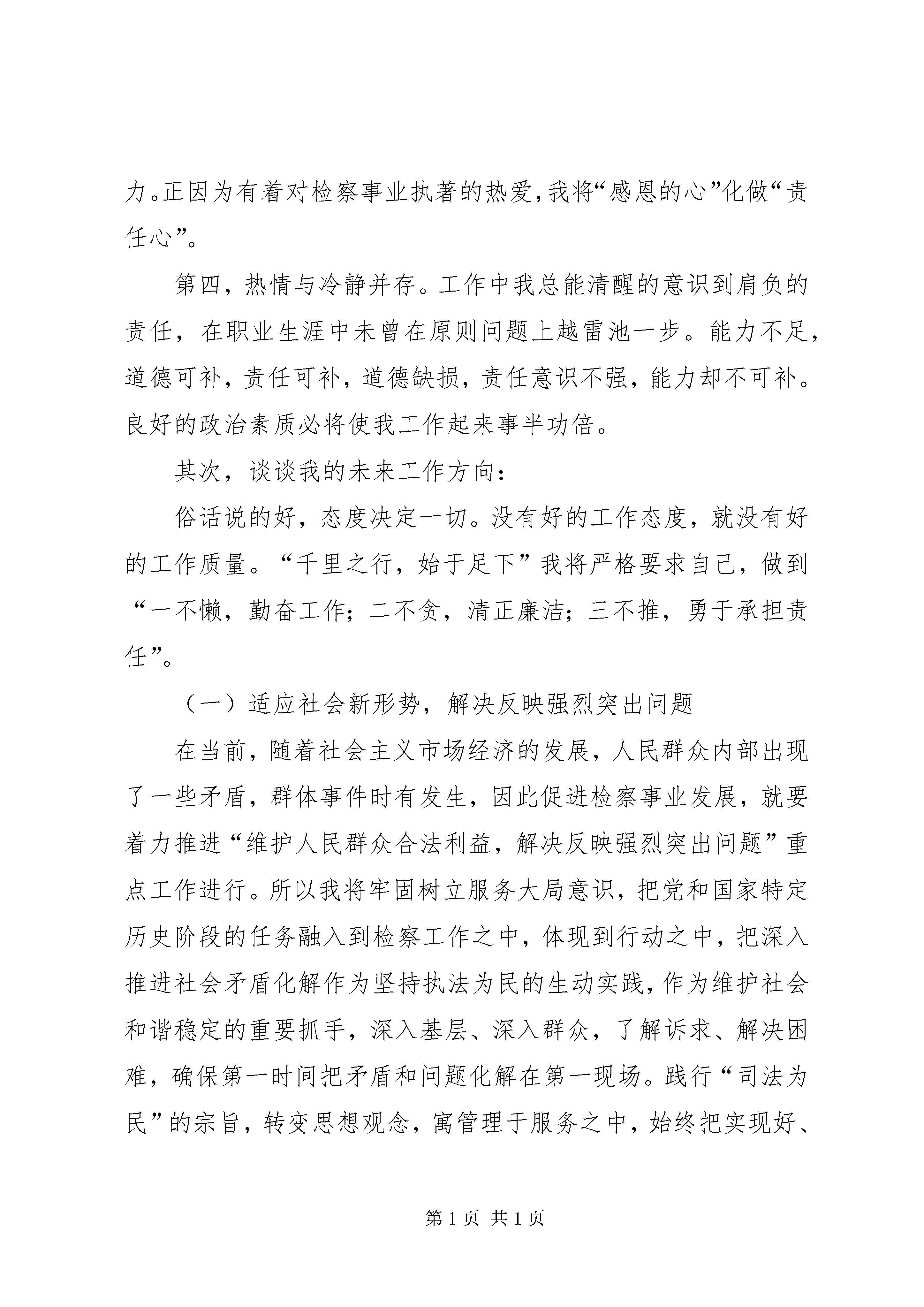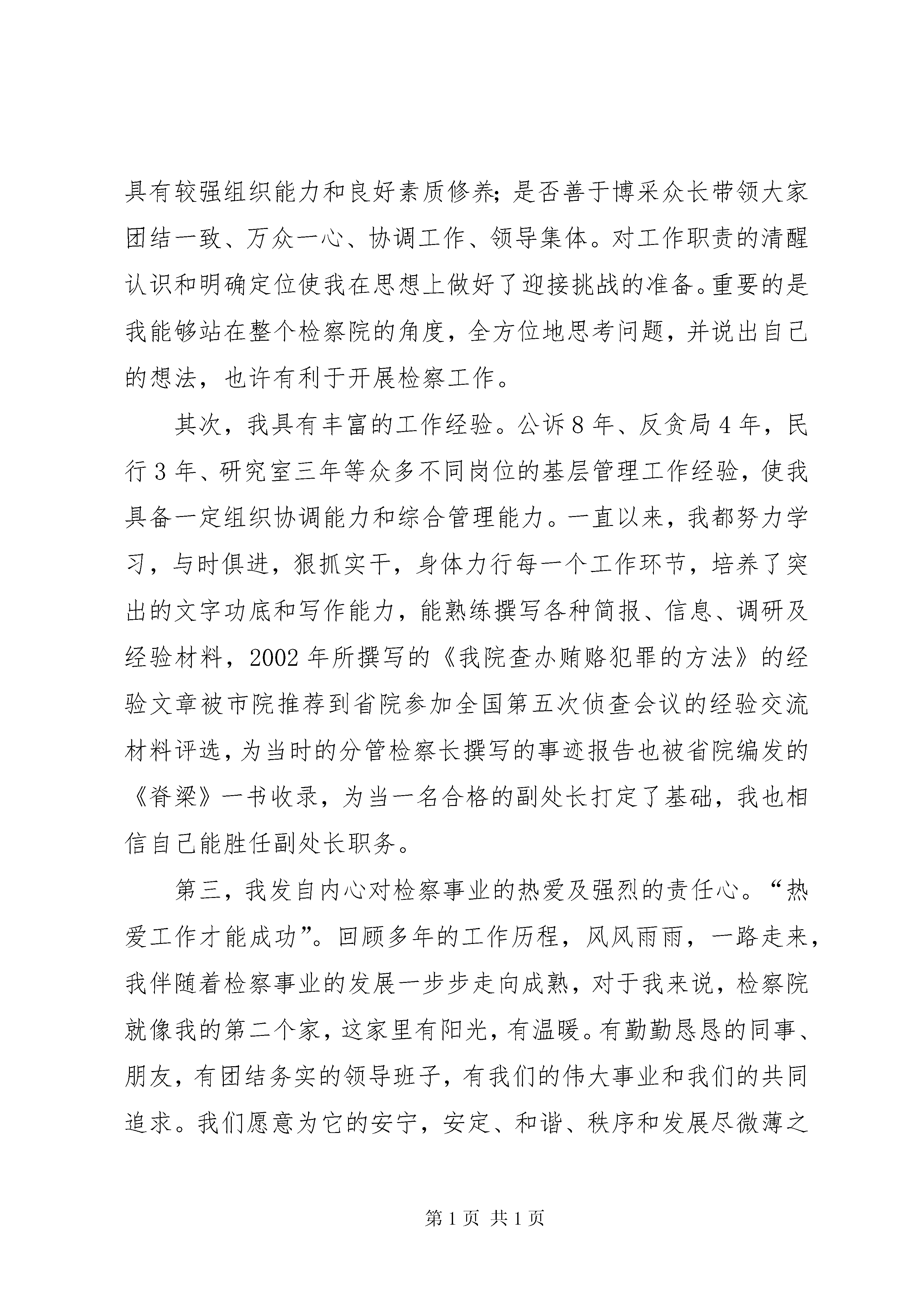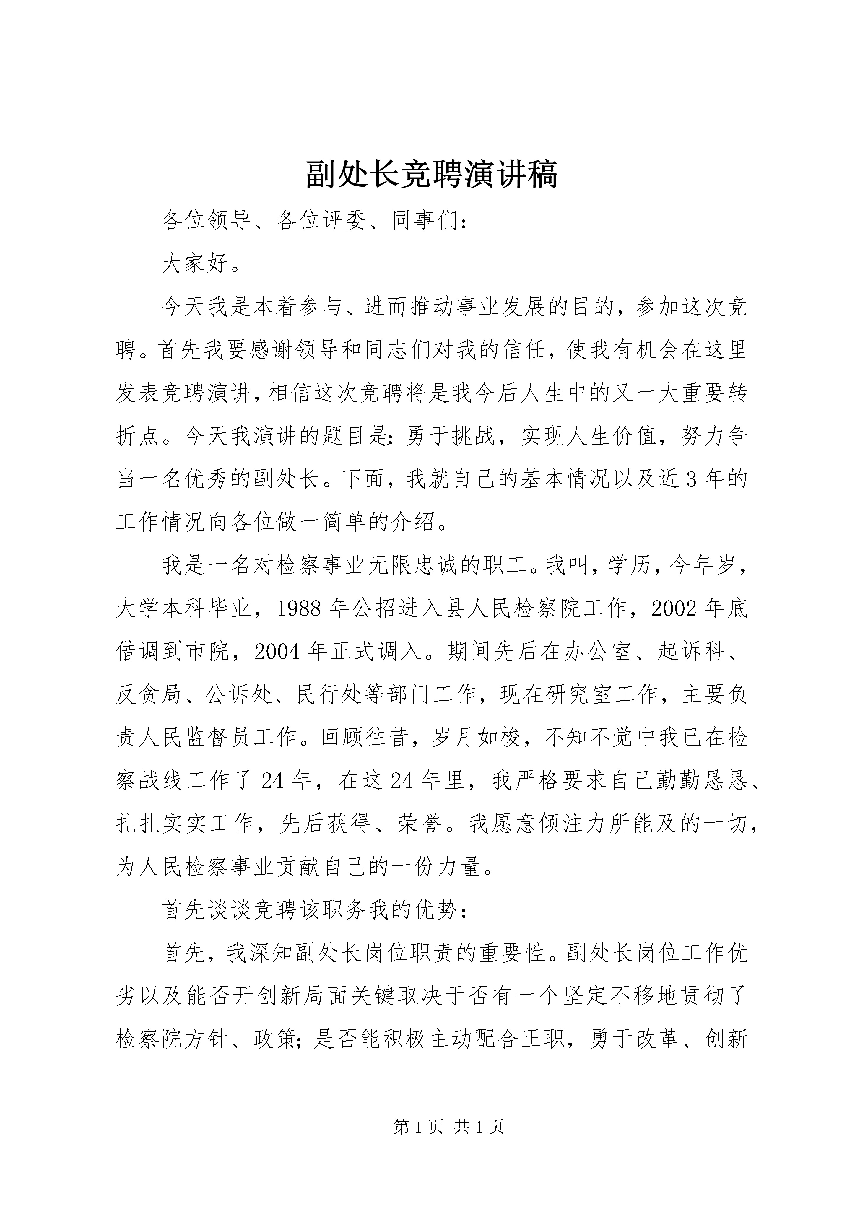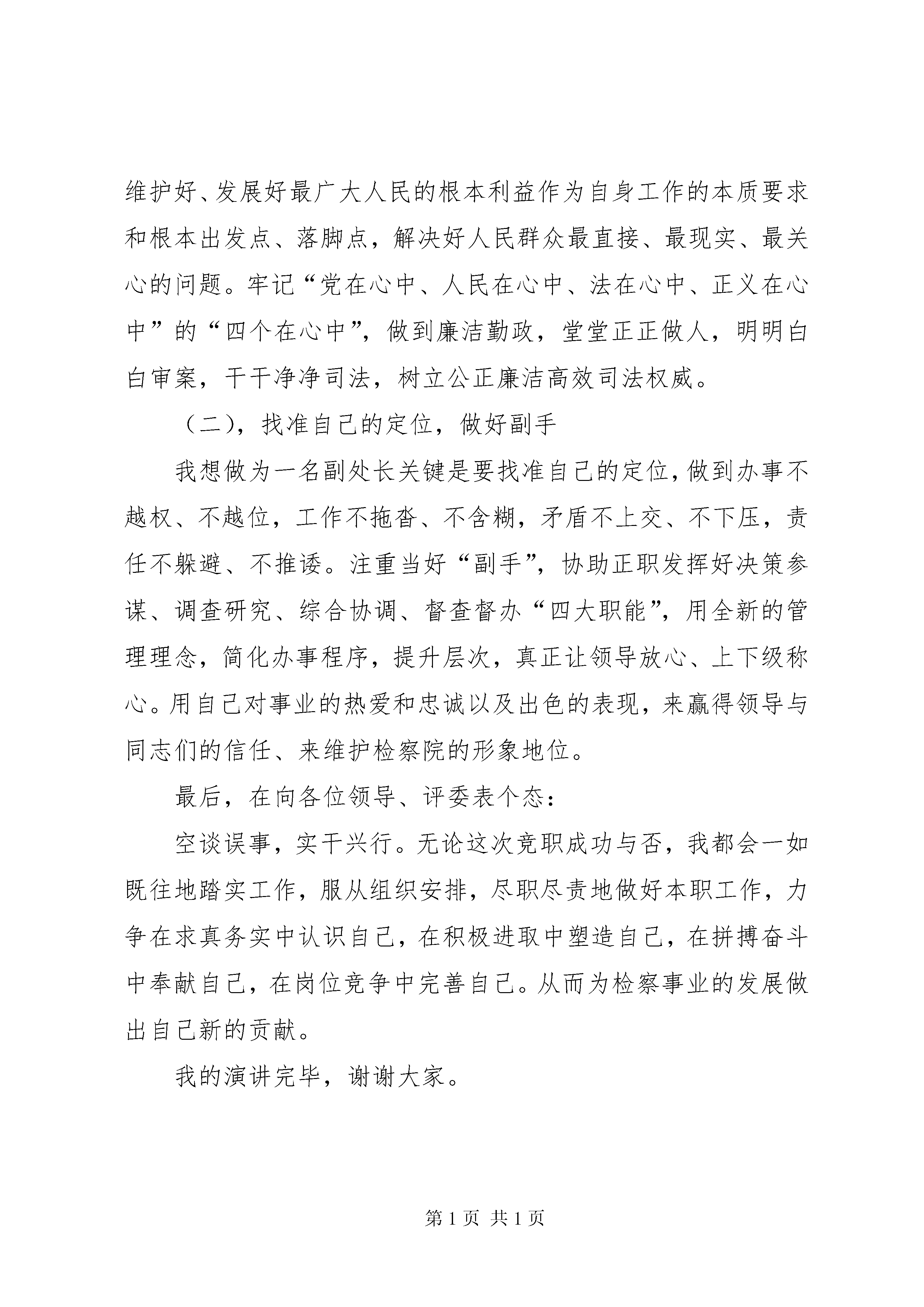 副处长竞聘演讲稿各位领导、各位评委、同事们:大家好。今天我是本着参与、进而推动事业发展的目的,参加这次竞聘。首先我要感谢领导和同志们对我的信任,使我有机会在这里发表竞聘演讲,相信这次竞聘将是我今后人生中的又一大重要转折点。今天我演讲的题目是:勇于挑战,实现人生价值,努力争当一名优秀的副处长。下面,我就自己的基本情况以及近3年的工作情况向各位做一简单的介绍。我是一名对检察事业无限忠诚的职工。我叫,学历,今年岁,大学本科毕业,1988年公招进入县人民检察院工作,2002年底借调到市院,2004年正式调入。期间先后在办公室、起诉科、反贪局、公诉处、民行处等部门工作,现在研究室工作,主要负责人民监督员工作。回顾往昔,岁月如梭,不知不觉中我已在检察战线工作了24年,在这24年里,我严格要求自己勤勤恳恳、扎扎实实工作,先后获得、荣誉。我愿意倾注力所能及的一切,为人民检察事业贡献自己的一份力量。首先谈谈竞聘该职务我的优势:首先,我深知副处长岗位职责的重要性。副处长岗位工作优劣以及能否开创新局面关键取决于否有一个坚定不移地贯彻了检察院方针、政策;是否能积极主动配合正职,勇于改革、创新具有较强组织能力和良好素质修养;是否善于博采众长带领大家团结一致、万众一心、协调工作、领导集体。对工作职责的清醒认识和明确定位使我在思想上做好了迎接挑战的准备。重要的是我能够站在整个检察院的角度,全方位地思考问题,并说出自己的想法,也许有利于开展检察工作。其次,我具有丰富的工作经验。公诉8年、反贪局4年,民行3年、研究室三年等众多不同岗位的基层管理工作经验,使我具备一定组织协调能力和综合管理能力。一直以来,我都努力学习,与时俱进,狠抓实干,身体力行每一个工作环节,培养了突出的文字功底和写作能力,能熟练撰写各种简报、信息、调研及经验材料,2002年所撰写的《我院查办贿赂犯罪的方法》的经验文章被市院推荐到省院参加全国第五次侦查会议的经验交流材料评选,为当时的分管检察长撰写的事迹报告也被省院编发的《脊梁》一书收录,为当一名合格的副处长打定了基础,我也相信自己能胜任副处长职务。第三,我发自内心对检察事业的热爱及强烈的责任心。“热爱工作才能成功”。回顾多年的工作历程,风风雨雨,一路走来,我伴随着检察事业的发展一步步走向成熟,对于我来说,检察院就像我的第二个家,这家里有阳光,有温暖。有勤勤恳恳的同事、朋友,有团结务实的领导班子,有我们的伟大事业和我们的共同追求。我们愿意为它的安宁,安定、和谐、秩序和发展尽微薄之力。正因为有着对检察事业执著的热爱,我将“感恩的心”化做“责任心”。第四,热情与冷静并存。工作中我总能清醒的意识到肩负的责任,在职业生涯中未曾在原则问题上越雷池一步。能力不足,道德可补,责任可补,道德缺损,责任意识不强,能力却不可补。良好的政治素质必将使我工作起来事半功倍。其次,谈谈我的未来工作方向:俗话说的好,态度决定一切。没有好的工作态度,就没有好的工作质量。“千里之行,始于足下”我将严格要求自己,做到“一不懒,勤奋工作;二不贪,清正廉洁;三不推,勇于承担责任”。(一)适应社会新形势,解决反映强烈突出问题在当前,随着社会主义市场经济的发展,人民群众内部出现了一些矛盾,群体事件时有发生,因此促进检察事业发展,就要着力推进“维护人民群众合法利益,解决反映强烈突出问题”重点工作进行。所以我将牢固树立服务大局意识,把党和国家特定历史阶段的任务融入到检察工作之中,体现到行动之中,把深入推进社会矛盾化解作为坚持执法为民的生动实践,作为维护社会和谐稳定的重要抓手,深入基层、深入群众,了解诉求、解决困难,确保第一时间把矛盾和问题化解在第一现场。践行“司法为民”的宗旨,转变思想观念,寓管理于服务之中,始终把实现好、维护好、发展好最广大人民的根本利益作为自身工作的本质要求和根本出发点、落脚点,解决好人民群众最直接、最现实、最关心的问题。牢记“党在心中、人民在心中、法在心中、正义在心中”的“四个在心中”,做到廉洁勤政,堂堂正正做人,明明白白审案,干干净净司法,树立公正廉洁高效司法权威。(二),找准自己的定位,做好副手我想做为一名副处长关键是要找准自己的定位,做到办事不越权、不越位,工作不拖沓、不含糊,矛盾不上交、不下压,责任不躲避、不推诿。注重当好“副手”,协助正职发挥好决策参谋、调查研究、综合协调、督查督办“四大职能”,用全新的管理理念,简化办事程序,提升层次,真正让领导放心、上下级称心。用自己对事业的热爱和忠诚以及出色的表现,来赢得领导与同志们的信任、来维护检察院的形象地位。最后,在向各位领导、评委表个态:空谈误事,实干兴行。无论这次竞职成功与否,我都会一如既往地踏实工作,服从组织安排,尽职尽责地做好本职工作,力争在求真务实中认识自己,在积极进取中塑造自己,