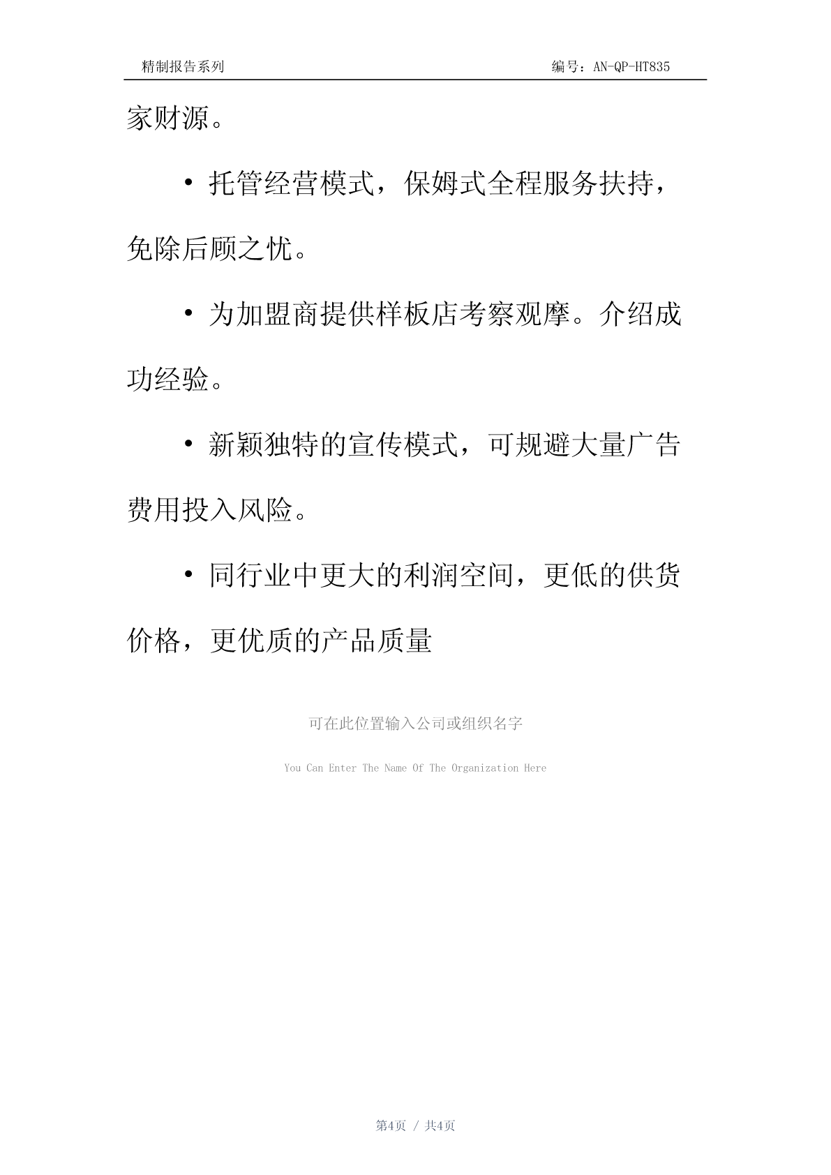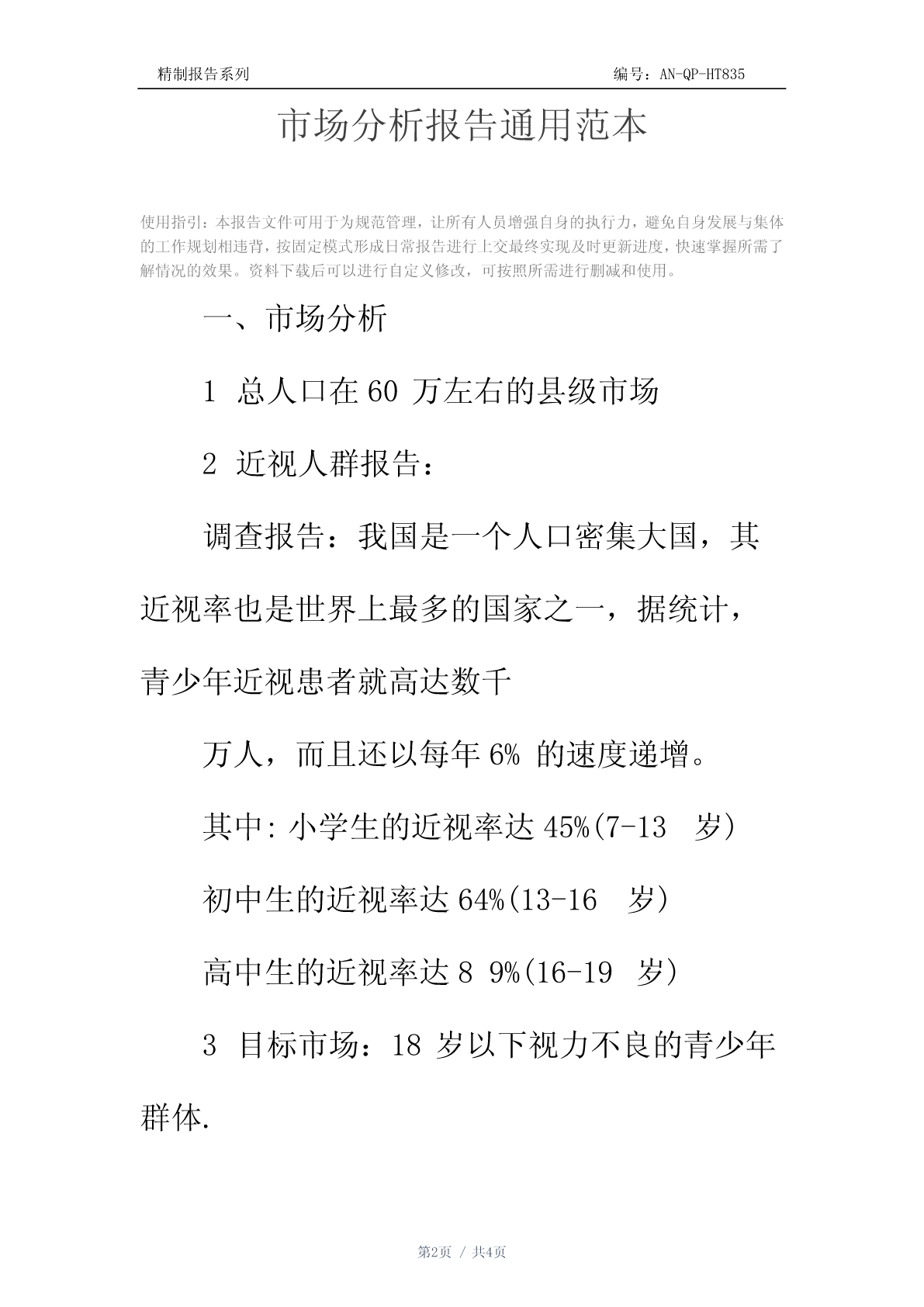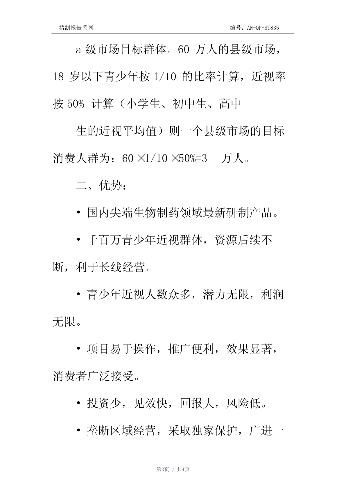 内部编号:AN-QP-HT835版本/修改状态:01/00市场分析报告通用范本InOrderToStandardizeTheManagement,LetAllPersonnelEnhanceTheExecutivePower,AvoidSelf-DevelopmentAndCollectiveWorkPlanningViolation,AccordingToTheFixedModeToFormDailyReportToHandIn,FinallyRealizeTheEffectOfTimelyUpdateProgress,QuicklyGraspTheRequiredSituation.编辑:__________________审核:__________________单位:__________________精制报告系列编号:AN-QP-HT835市场分析报告通用范本使用指引:本报告文件可用于为规范管理,让所有人员增强自身的执行力,避免自身发展与集体的工作规划相违背,按固定模式形成日常报告进行上交最终实现及时更新进度,快速掌握所需了解情况的效果。资料下载后可以进行自定义修改,可按照所需进行删减和使用。一、市场分析1总人口在60万左右的县级市场2近视人群报告:调查报告:我国是一个人口密集大国,其近视率也是世界上最多的国家之一,据统计,青少年近视患者就高达数千万人,而且还以每年6%的速度递增。其中:小学生的近视率达45%(7-13岁)初中生的近视率达64%(13-16岁)高中生的近视率达89%(16-19岁)3目标市场:18岁以下视力不良的青少年群体./精制报告系列编号:AN-QP-HT835a级市场目标群体。60万人的县级市场,18岁以下青少年按1/10的比率计算,近视率按50%计算(小学生、初中生、高中生的近视平均值)则一个县级市场的目标消费人群为:60×1/10×50%=3万人。二、优势:•国内尖端生物制药领域最新研制产品。•千百万青少年近视群体,资源后续不断,利于长线经营。•青少年近视人数众多,潜力无限,利润无限。•项目易于操作,推广便利,效果显著,消费者广泛接受。•投资少,见效快,回报大,风险低。•垄断区域经营,采取独家保护,广进一/精制报告系列编号:AN-QP-HT835家财源。•托管经营模式,保姆式全程服务扶持,免除后顾之忧。•为加盟商提供样板店考察观摩。介绍成功经验。•新颖独特的宣传模式,可规避大量广告费用投入风险。•同行业中更大的利润空间,更低的供货价格,更优质的产品质量可在此位置输入公司或组织名字YouCanEnterTheNameOfTheOrganizationHere/