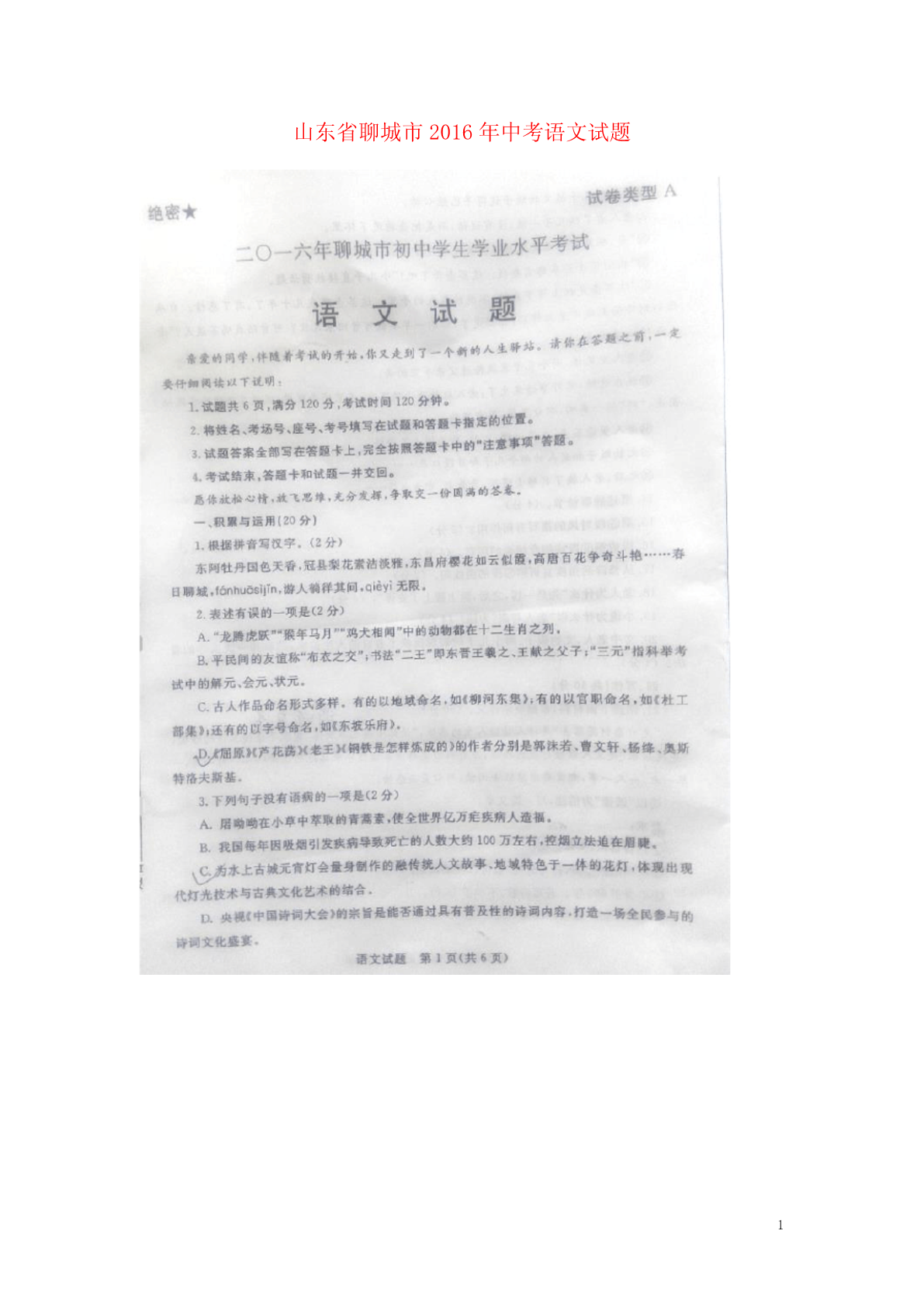 山东省聊城市2016年中考语文试题12345678