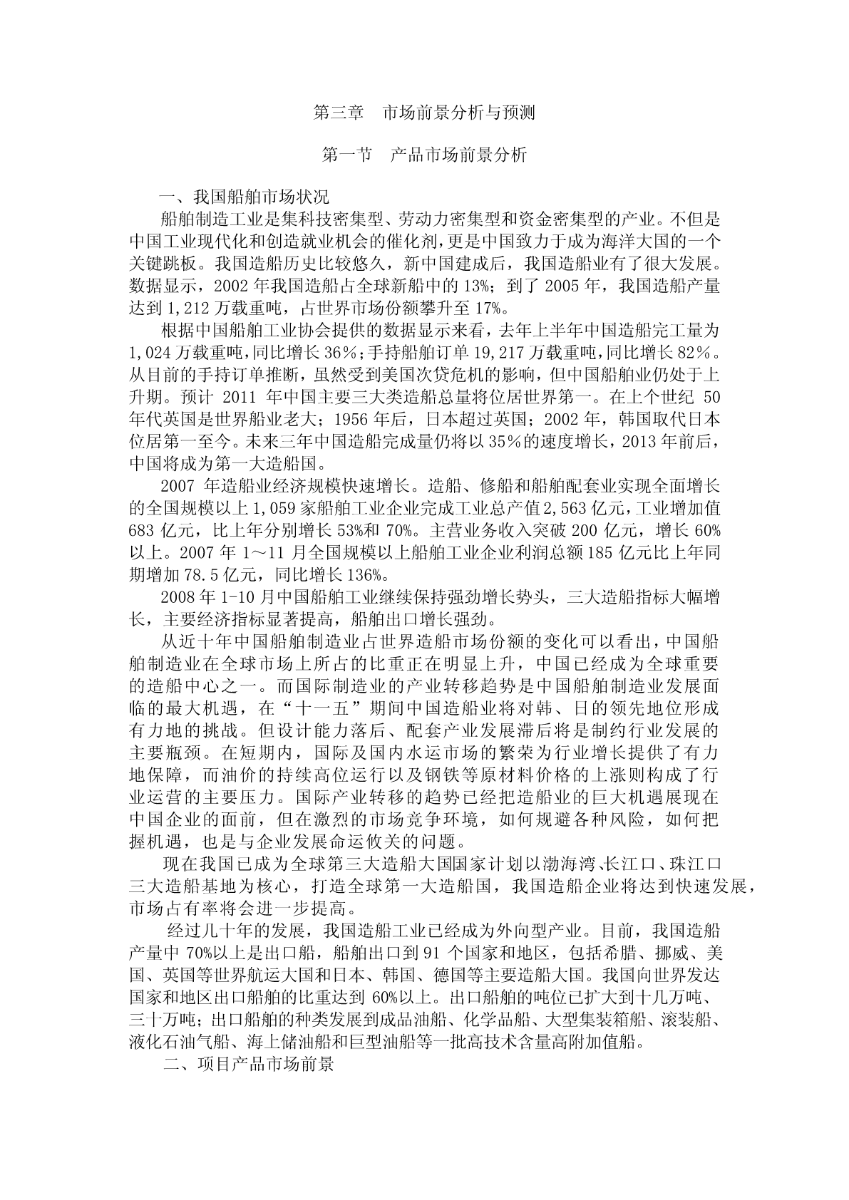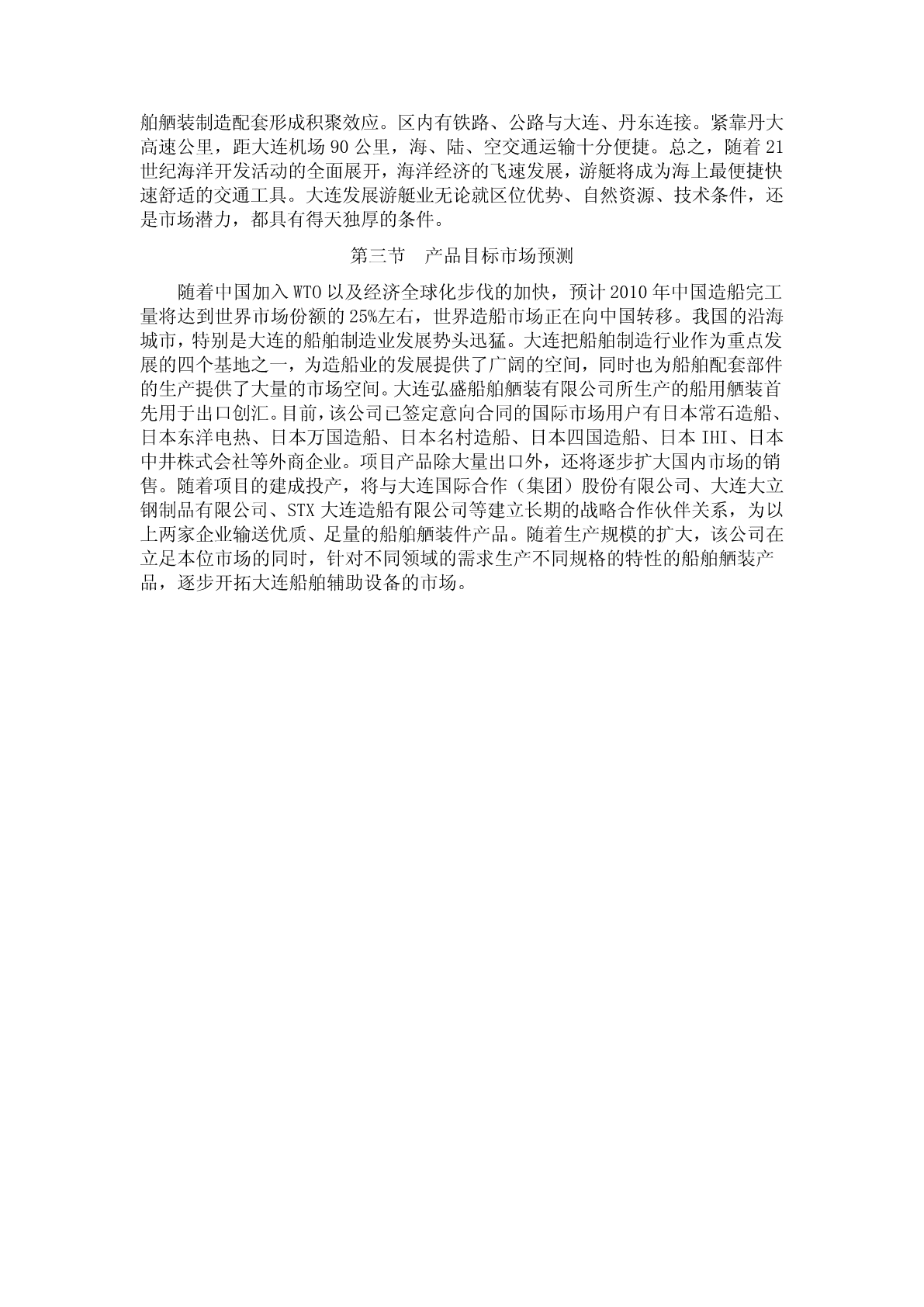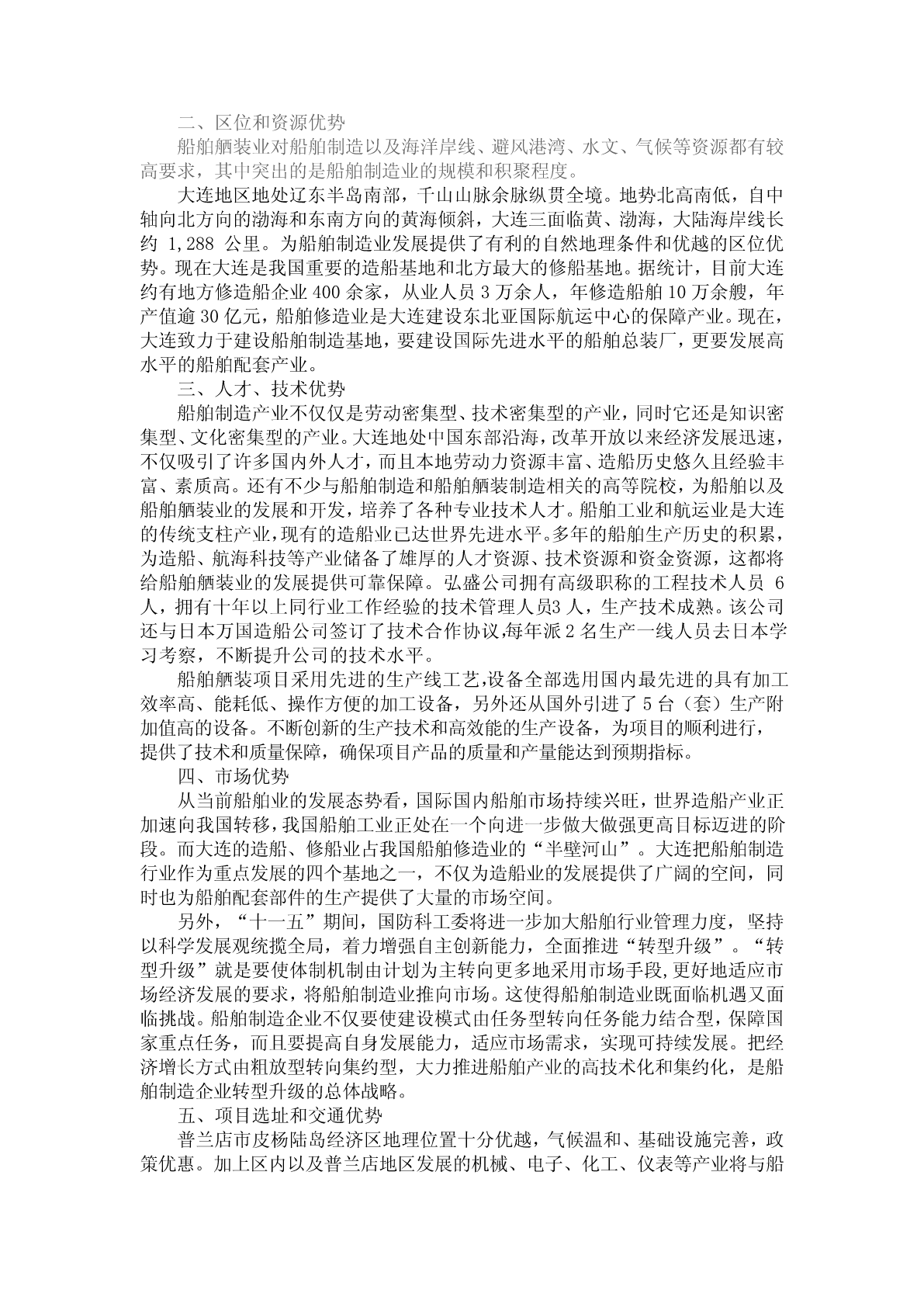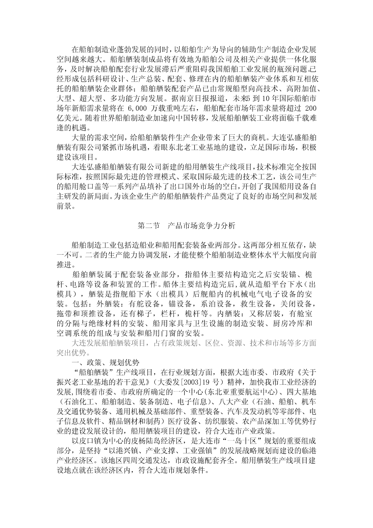 第三章市场前景分析与预测第一节产品市场前景分析一、我国船舶市场状况船舶制造工业是集科技密集型、劳动力密集型和资金密集型的产业。不但是中国工业现代化和创造就业机会的催化剂,更是中国致力于成为海洋大国的一个关键跳板。我国造船历史比较悠久,新中国建成后,我国造船业有了很大发展。数据显示,2002年我国造船占全球新船中的13%;到了2005年,我国造船产量达到1,212万载重吨,占世界市场份额攀升至17%。根据中国船舶工业协会提供的数据显示来看,去年上半年中国造船完工量为1,024万载重吨,同比增长36%;手持船舶订单19,217万载重吨,同比增长82%。从目前的手持订单推断,虽然受到美国次贷危机的影响,但中国船舶业仍处于上升期。预计2011年中国主要三大类造船总量将位居世界第一。在上个世纪50年代英国是世界船业老大;1956年后,日本超过英国;2002年,韩国取代日本位居第一至今。未来三年中国造船完成量仍将以35%的速度增长,2013年前后,中国将成为第一大造船国。2007年造船业经济规模快速增长。造船、修船和船舶配套业实现全面增长的全国规模以上1,059家船舶工业企业完成工业总产值2,563亿元,工业增加值683亿元,比上年分别增长53%和70%。主营业务收入突破200亿元,增长60%以上。2007年1~11月全国规模以上船舶工业企业利润总额185亿元比上年同期增加78.5亿元,同比增长136%。2008年1-10月中国船舶工业继续保持强劲增长势头,三大造船指标大幅增长,主要经济指标显著提高,船舶出口增长强劲。从近十年中国船舶制造业占世界造船市场份额的变化可以看出,中国船舶制造业在全球市场上所占的比重正在明显上升,中国已经成为全球重要的造船中心之一。而国际制造业的产业转移趋势是中国船舶制造业发展面临的最大机遇,在“十一五”期间中国造船业将对韩、日的领先地位形成有力地的挑战。但设计能力落后、配套产业发展滞后将是制约行业发展的主要瓶颈。在短期内,国际及国内水运市场的繁荣为行业增长提供了有力地保障,而油价的持续高位运行以及钢铁等原材料价格的上涨则构成了行业运营的主要压力。国际产业转移的趋势已经把造船业的巨大机遇展现在中国企业的面前,但在激烈的市场竞争环境,如何规避各种风险,如何把握机遇,也是与企业发展命运攸关的问题。现在我国已成为全球第三大造船大国。国家计划以渤海湾、长江口、珠江口三大造船基地为核心,打造全球第一大造船国,我国造船企业将达到快速发展,市场占有率将会进一步提高。经过几十年的发展,我国造船工业已经成为外向型产业。目前,我国造船产量中70%以上是出口船,船舶出口到91个国家和地区,包括希腊、挪威、美国、英国等世界航运大国和日本、韩国、德国等主要造船大国。我国向世界发达国家和地区出口船舶的比重达到60%以上。出口船舶的吨位已扩大到十几万吨、三十万吨;出口船舶的种类发展到成品油船、化学品船、大型集装箱船、滚装船、液化石油气船、海上储油船和巨型油船等一批高技术含量高附加值船。二、项目产品市场前景在船舶制造业蓬勃发展的同时,以船舶生产为导向的辅助生产制造企业发展空间越来越大。船舶舾装制成品将有效地为船舶公司及相关产业提供一体化服务,及时解决船舶配套行业发展滞后严重阻碍我国船舶工业发展的瓶颈问题。已经形成包括科研设计、生产总装、配套、修理在内的船舶舾装产业体系和互相依托的船舶舾装企业群体;船舶舾装配套产品已由常规船型向高技术、高附加值、大型、超大型、多功能方向发展。据南京日报报道,未来5到10年国际船舶市场年新船需求量将在6,000万载重吨左右,船舶配套市场年需求量将超过200亿美元。随着世界船舶制造业加速向中国转移,发展船舶舾装工业将面临千载难逢的机遇。大量的需求空间,给船舶舾装件生产企业带来了巨大的商机。大连弘盛船舶舾装有限公司紧抓市场机遇,着眼东北老工业基地的建设,立足国际市场,积极建设该项目。大连弘盛船舶舾装有限公司新建的船用舾装生产线项目,技术标准完全按国际标准,按照国际最先进的管理模式、采取国际最先进的技术工艺,该公司生产的船用舱口盖等一系列产品填补了出口国外市场的空白,开创了我国船用设备自主研发的新局面。为该企业生产的船舶舾装件产品奠定了良好的市场空间和发展前景。第二节产品市场竞争力分析船舶制造工业包括造船业和船用配套装备业两部分。这两部分相互依存,缺一不可。二者的生产能力协调发展,才能使整个船舶制造业整体水平大幅度向前推进。船舶舾装属于配套装备业部分,指船体主要结构造完之后安装锚、桅杆、电路等设备和装置的工作。船体主要结构造完后,就从造船平台下水(出模具),舾装是指舰船下水(出模具)后舰船内的机械电气电子设备的安装。包括:外舾装:有舵设备,锚设备,系泊设备,救生设备,关闭设备,拖带和顶推设备,还有梯子,栏杆,桅杆等。内舾