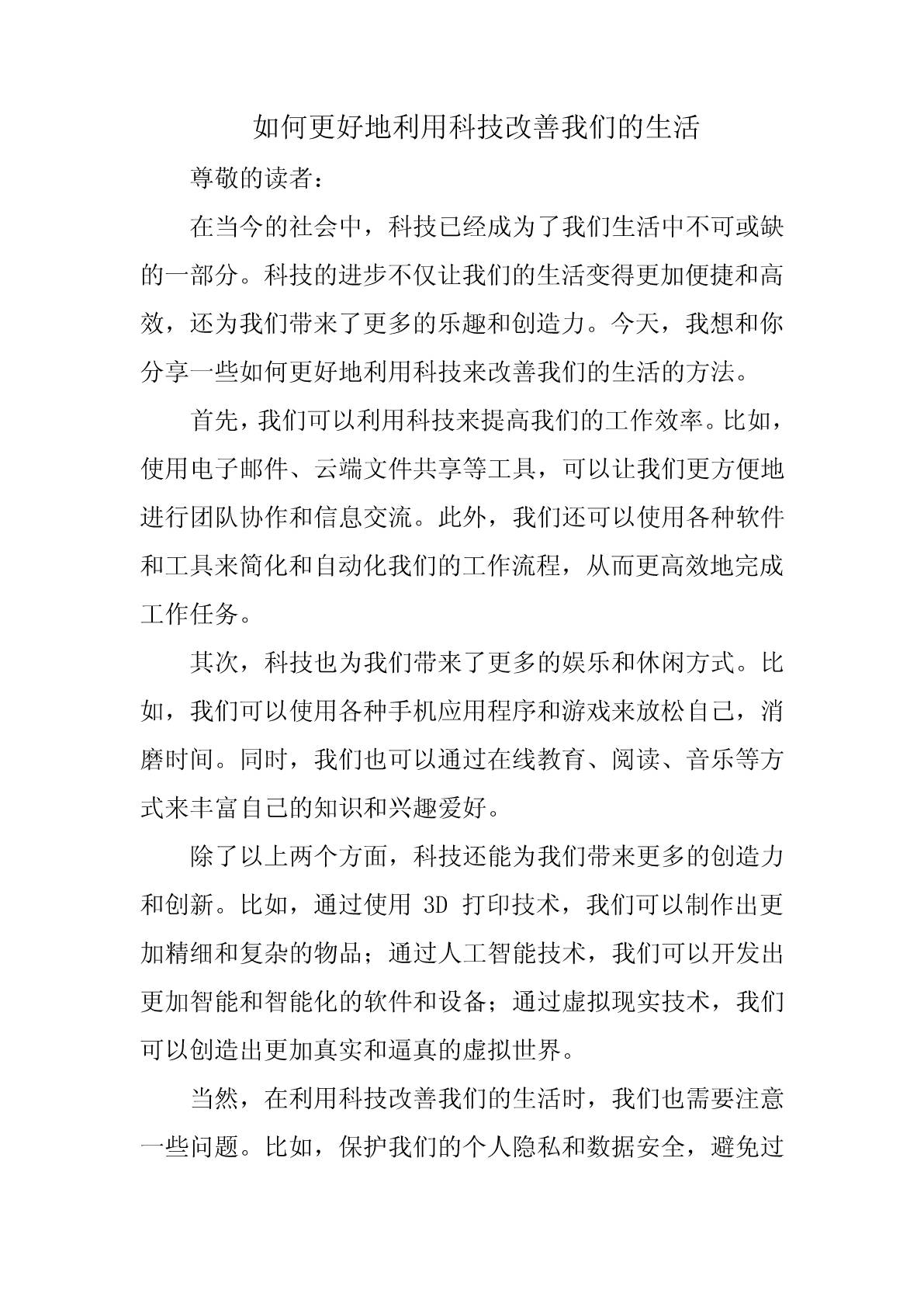 如何更好地利用科技改善我们的生活尊敬的读者:在当今的社会中,科技已经成为了我们生活中不可或缺的一部分。科技的进步不仅让我们的生活变得更加便捷和高效,还为我们带来了更多的乐趣和创造力。今天,我想和你分享一些如何更好地利用科技来改善我们的生活的方法。首先,我们可以利用科技来提高我们的工作效率。比如,使用电子邮件、云端文件共享等工具,可以让我们更方便地进行团队协作和信息交流。此外,我们还可以使用各种软件和工具来简化和自动化我们的工作流程,从而更高效地完成工作任务。其次,科技也为我们带来了更多的娱乐和休闲方式。比如,我们可以使用各种手机应用程序和游戏来放松自己,消磨时间。同时,我们也可以通过在线教育、阅读、音乐等方式来丰富自己的知识和兴趣爱好。除了以上两个方面,科技还能为我们带来更多的创造力和创新。比如,通过使用3D打印技术,我们可以制作出更加精细和复杂的物品;通过人工智能技术,我们可以开发出更加智能和智能化的软件和设备;通过虚拟现实技术,我们可以创造出更加真实和逼真的虚拟世界。当然,在利用科技改善我们的生活时,我们也需要注意一些问题。比如,保护我们的个人隐私和数据安全,避免过度沉迷于手机和互联网等等。只有合理、理性地使用科技,才能更好地享受科技带来的便利和创造力。总之,科技为我们带来了无限的可能性和机会。只要我们善加利用,就可以让我们的生活变得更加美好、更加便捷和更加丰富。让我们一起拥抱科技,创造更加美好的未来吧!