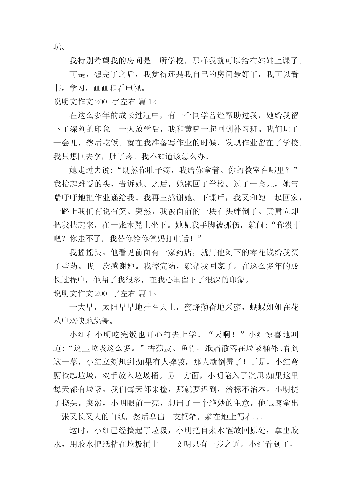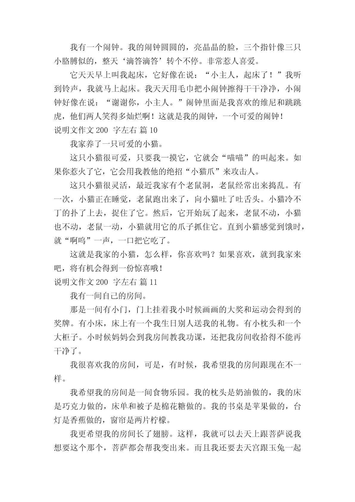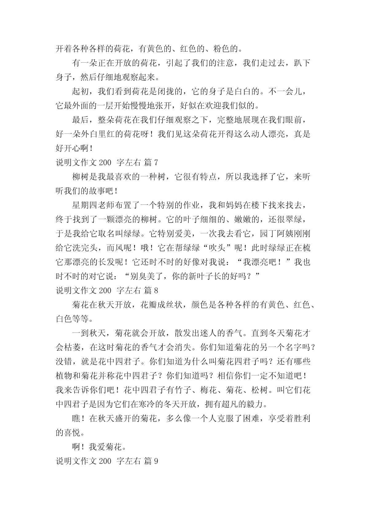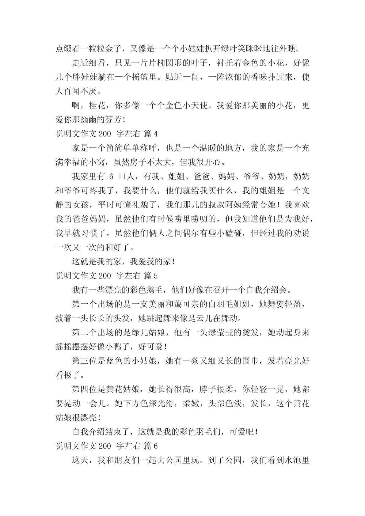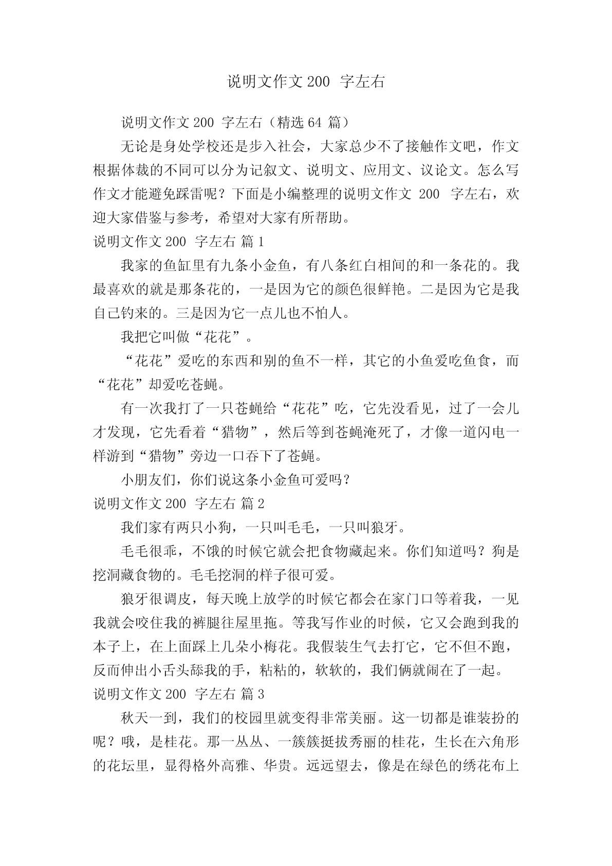说明文作文200字左右说明文作文200字左右(精选64篇)无论是身处学校还是步入社会,大家总少不了接触作文吧,作文根据体裁的不同可以分为记叙文、说明文、应用文、议论文。怎么写作文才能避免踩雷呢?下面是小编整理的说明文作文200字左右,欢迎大家借鉴与参考,希望对大家有所帮助。说明文作文200字左右篇1我家的鱼缸里有九条小金鱼,有八条红白相间的和一条花的。我最喜欢的就是那条花的,一是因为它的颜色很鲜艳。二是因为它是我自己钓来的。三是因为它一点儿也不怕人。我把它叫做“花花”。“花花”爱吃的东西和别的鱼不一样,其它的小鱼爱吃鱼食,而“花花”却爱吃苍蝇。有一次我打了一只苍蝇给“花花”吃,它先没看见,过了一会儿才发现,它先看着“猎物”,然后等到苍蝇淹死了,才像一道闪电一样游到“猎物”旁边一口吞下了苍蝇。小朋友们,你们说这条小金鱼可爱吗?说明文作文200字左右篇2我们家有两只小狗,一只叫毛毛,一只叫狼牙。毛毛很乖,不饿的时候它就会把食物藏起来。你们知道吗?狗是挖洞藏食物的。毛毛挖洞的样子很可爱。狼牙很调皮,每天晚上放学的时候它都会在家门口等着我,一见我就会咬住我的裤腿往屋里拖。等我写作业的时候,它又会跑到我的本子上,在上面踩上几朵小梅花。我假装生气去打它,它不但不跑,反而伸出小舌头舔我的手,粘粘的,软软的,我们俩就闹在了一起。说明文作文200字左右篇3秋天一到,我们的校园里就变得非常美丽。这一切都是谁装扮的呢?哦,是桂花。那一丛丛、一簇簇挺拔秀丽的桂花,生长在六角形的花坛里,显得格外高雅、华贵。远远望去,像是在绿色的绣花布上点缀着一粒粒金子,又像是一个个小娃娃扒开绿叶笑眯眯地往外瞧。走近细看,只见一片片椭圆形的叶子,衬托着金色的小花,好像几个胖娃娃躺在一个摇篮里。贴近一闻,一阵浓郁的香味扑过来,使人百闻不厌。啊,桂花,你多像一个个金色小天使。我爱你那美丽的小花,更爱你那幽幽的芬芳!说明文作文200字左右篇4家是一个简简单单称呼,也是一个温暖的地方,我的家是一个充满幸福的小窝,虽然房子不太大,但我很开心。我家里有6口人,有我、姐姐、爸爸、妈妈、爷爷、奶奶,奶奶和爷爷可疼我了,我要什么,他们就给我买什么,我的姐姐是一个文静的女孩,平时可懂礼貌了,我们那儿的叔叔阿姨经常夸她!我喜欢我的爸爸妈妈,虽然他们有时候唠里唠叨的,但我知道他们是为我好,我早就习惯了,虽然他们俩人之间偶尔有些小磕碰,但经过我的劝说一次又一次的和好了。这就是我的家,我爱我的家!说明文作文200字左右篇5我有一些漂亮的彩色鹅毛,他们好像在召开一个自我介绍会。第一个出场的是一支美丽和蔼可亲的白羽毛姐姐,她舞姿轻盈,披着一头长长的头发,她跳起舞来像是云儿在舞动。第二个出场的是绿儿姑娘,他有一头绿莹莹的烫发,她动起身来摇摇摆摆好像小鸭子,好可爱!第三位是蓝色的小姑娘,她有一条又细又长的围巾,发着亮光好看极了。第四位是黄花姑娘,她长得很高,脖子很柔,你轻轻一晃,她都要晃动一会儿。她下方色深光滑,柔嫩,头部色淡,发长,这个黄花姑娘很漂亮!自我介绍结束了,这就是我的彩色羽毛们,可爱吧!说明文作文200字左右篇6这天,我和朋友们一起去公园里玩。到了公园,我们看到水池里开着各种各样的荷花,有黄色的、红色的、粉色的。有一朵正在开放的荷花,引起了我们的注意,我们走过去,趴下身子,然后仔细地观察起来。起初,我们看到荷花是闭拢的,它的身子是白白的。不一会儿,它最外面的一层开始慢慢地张开,好似在欢迎我们似的。最后,整朵荷花在我们仔细观察之下,完整地展现在我们眼前,好一朵外白里红的荷花呀!我们见这朵荷花开得这么动人漂亮,真是好开心啊!说明文作文200字左右篇7柳树是我最喜欢的一种树,它很有特点,所以我选择了它,来听听我们的故事吧!星期四老师布置了一个特别的作业,我和妈妈在楼下找来找去,终于找到了一颗漂亮的柳树。它的叶子细细的、嫩嫩的,还很翠绿,于是我给它取名叫绿绿。它特别爱美,一次我去看它,园丁阿姨刚刚给它洗完头,而风呢!哦!它在帮绿绿“吹头”呢!此时绿绿正在梳它那漂亮的长发呢!它还时不时的好像对我说:“我漂亮吧!”我也时不时的对它说:“别臭美了,你的新叶子长的好吗?”说明文作文200字左右篇8菊花在秋天开放,花瓣成丝状,颜色是各种各样的有黄色、红色、白色等等。一到秋天,菊花就会开放,散发出迷人的香气。直到冬天菊花才会枯萎,在这时菊花的香气才会消失。你们知道菊花的另一个名字吗?没错,就是花中四君子。你们知道为什么叫菊花四君子吗?还有哪些植物和菊花并称花中四君子?你们知道吗?相信你们一定不知道吧!我来告诉你们吧!花中四君子有竹子、梅花、菊花、松树。叫它们花中四君子是因为它们在寒冷的冬天开放,拥有超凡的毅力。瞧!在秋天盛开的菊花,多么像一个人克服了困难,享受着胜利的喜悦。啊!我爱菊花。说明文作文200字左右篇9