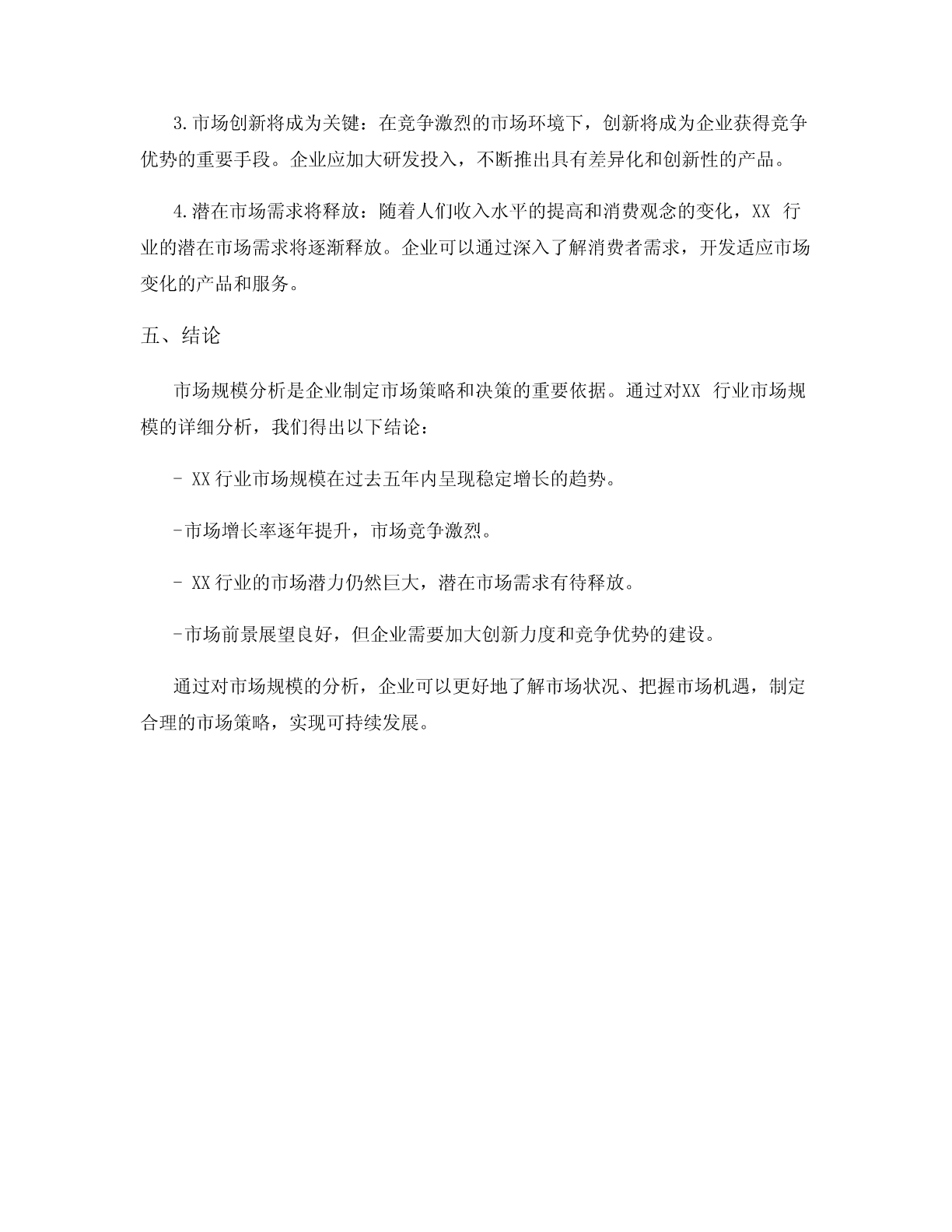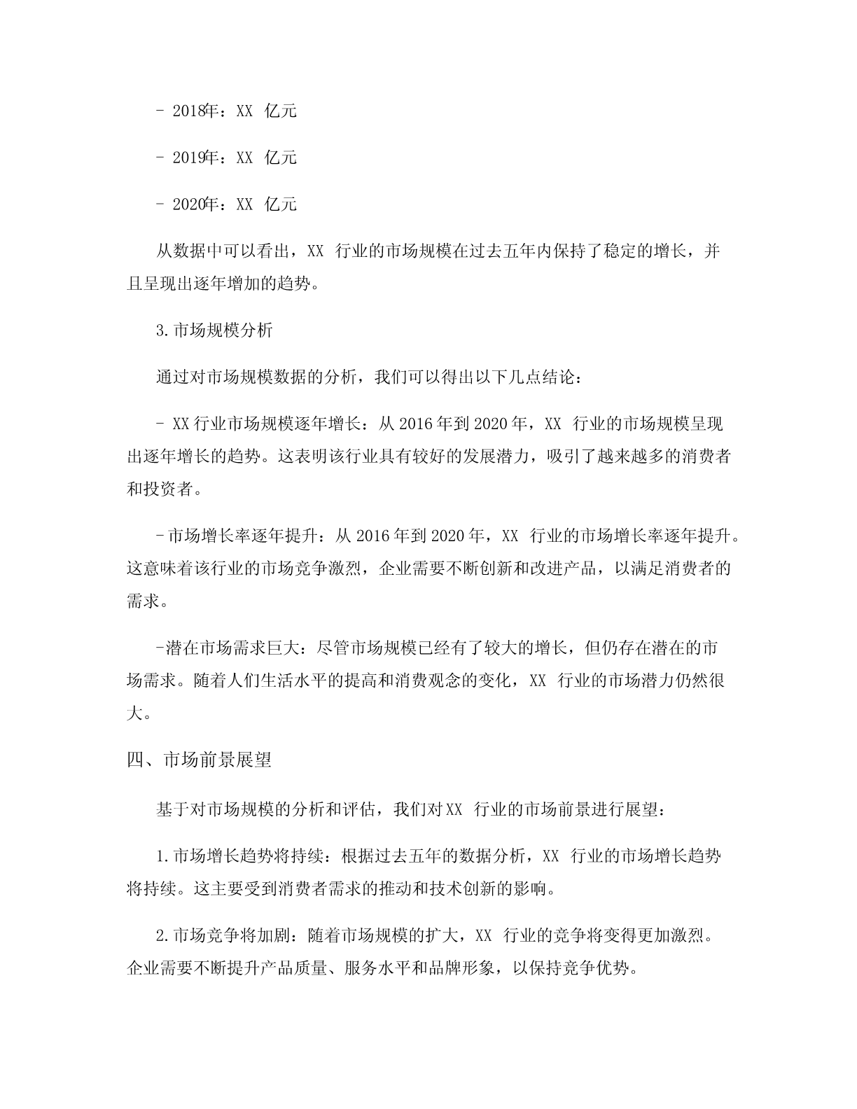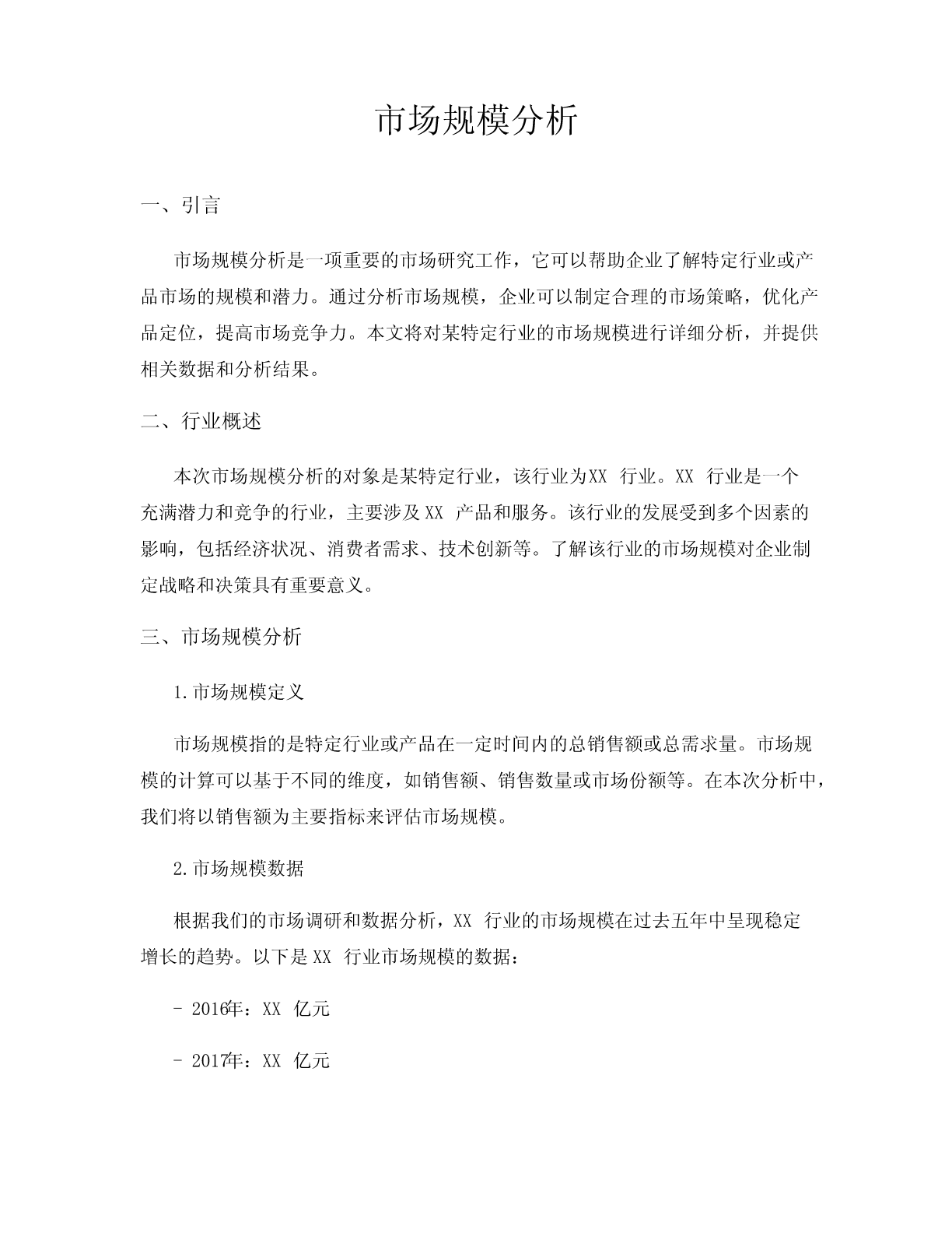 市场规模分析一、引言市场规模分析是一项重要的市场研究工作,它可以帮助企业了解特定行业或产品市场的规模和潜力。通过分析市场规模,企业可以制定合理的市场策略,优化产品定位,提高市场竞争力。本文将对某特定行业的市场规模进行详细分析,并提供相关数据和分析结果。二、行业概述本次市场规模分析的对象是某特定行业,该行业为XX行业。XX行业是一个充满潜力和竞争的行业,主要涉及XX产品和服务。该行业的发展受到多个因素的影响,包括经济状况、消费者需求、技术创新等。了解该行业的市场规模对企业制定战略和决策具有重要意义。三、市场规模分析1.市场规模定义市场规模指的是特定行业或产品在一定时间内的总销售额或总需求量。市场规模的计算可以基于不同的维度,如销售额、销售数量或市场份额等。在本次分析中,我们将以销售额为主要指标来评估市场规模。2.市场规模数据根据我们的市场调研和数据分析,XX行业的市场规模在过去五年中呈现稳定增长的趋势。以下是XX行业市场规模的数据:-2016年:XX亿元-2017年:XX亿元-2018年:XX亿元-2019年:XX亿元-2020年:XX亿元从数据中可以看出,XX行业的市场规模在过去五年内保持了稳定的增长,并且呈现出逐年增加的趋势。3.市场规模分析通过对市场规模数据的分析,我们可以得出以下几点结论:-XX行业市场规模逐年增长:从2016年到2020年,XX行业的市场规模呈现出逐年增长的趋势。这表明该行业具有较好的发展潜力,吸引了越来越多的消费者和投资者。-市场增长率逐年提升:从2016年到2020年,XX行业的市场增长率逐年提升。这意味着该行业的市场竞争激烈,企业需要不断创新和改进产品,以满足消费者的需求。-潜在市场需求巨大:尽管市场规模已经有了较大的增长,但仍存在潜在的市场需求。随着人们生活水平的提高和消费观念的变化,XX行业的市场潜力仍然很大。四、市场前景展望基于对市场规模的分析和评估,我们对XX行业的市场前景进行展望:1.市场增长趋势将持续:根据过去五年的数据分析,XX行业的市场增长趋势将持续。这主要受到消费者需求的推动和技术创新的影响。2.市场竞争将加剧:随着市场规模的扩大,XX行业的竞争将变得更加激烈。企业需要不断提升产品质量、服务水平和品牌形象,以保持竞争优势。3.市场创新将成为关键:在竞争激烈的市场环境下,创新将成为企业获得竞争优势的重要手段。企业应加大研发投入,不断推出具有差异化和创新性的产品。4.潜在市场需求将释放:随着人们收入水平的提高和消费观念的变化,XX行业的潜在市场需求将逐渐释放。企业可以通过深入了解消费者需求,开发适应市场变化的产品和服务。五、结论市场规模分析是企业制定市场策略和决策的重要依据。通过对XX行业市场规模的详细分析,我们得出以下结论:-XX行业市场规模在过去五年内呈现稳定增长的趋势。-市场增长率逐年提升,市场竞争激烈。-XX行业的市场潜力仍然巨大,潜在市场需求有待释放。-市场前景展望良好,但企业需要加大创新力度和竞争优势的建设。通过对市场规模的分析,企业可以更好地了解市场状况、把握市场机遇,制定合理的市场策略,实现可持续发展。