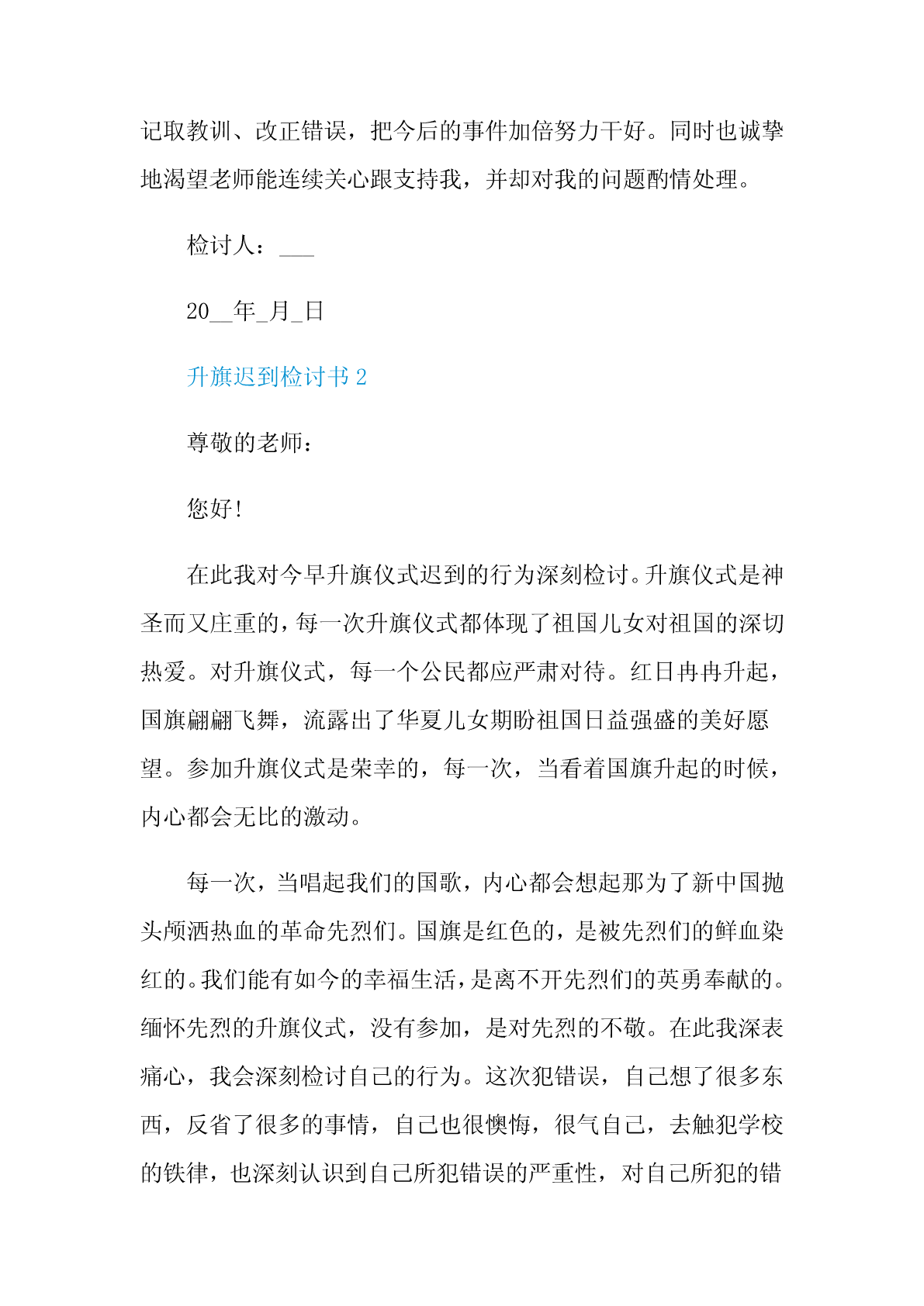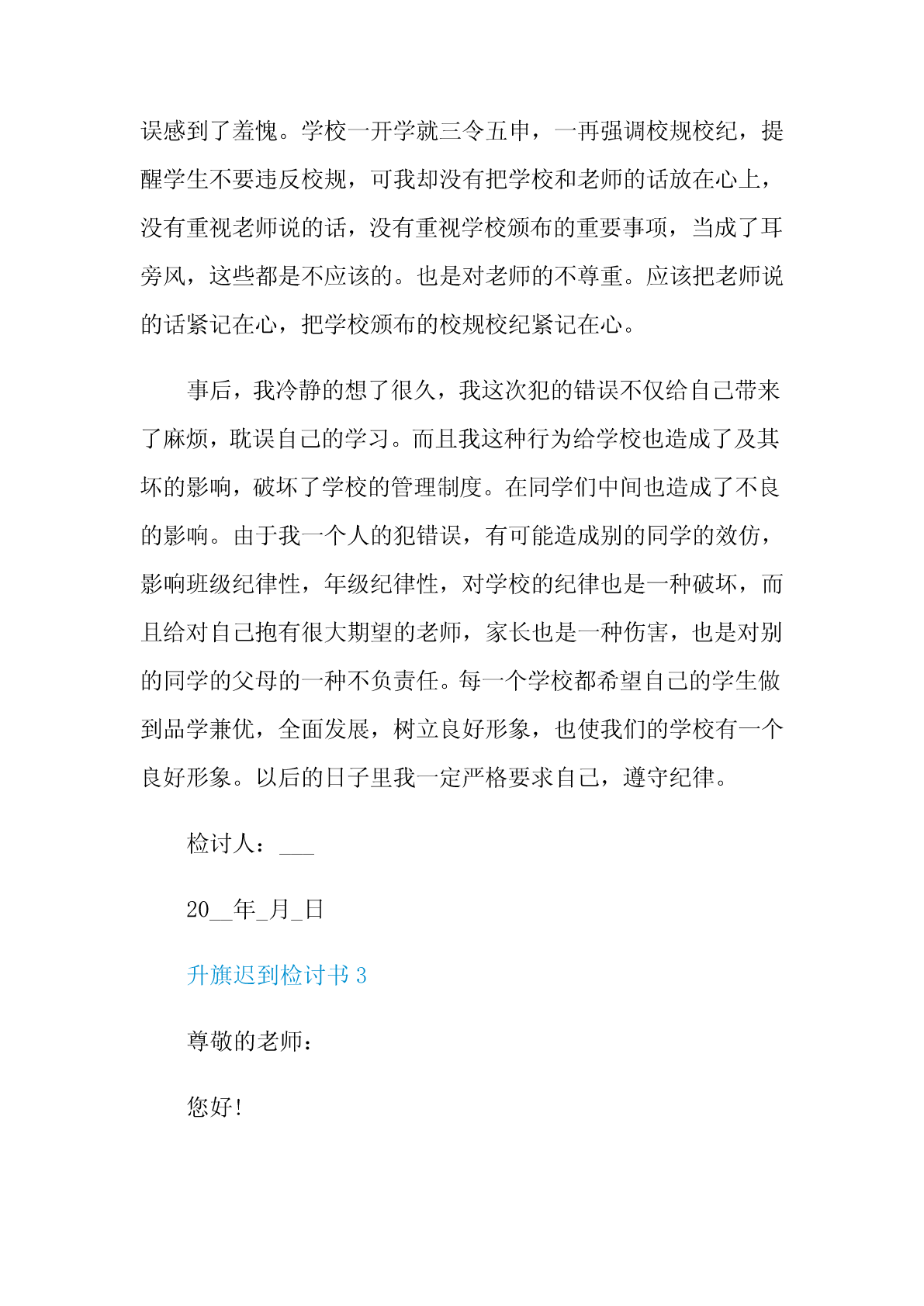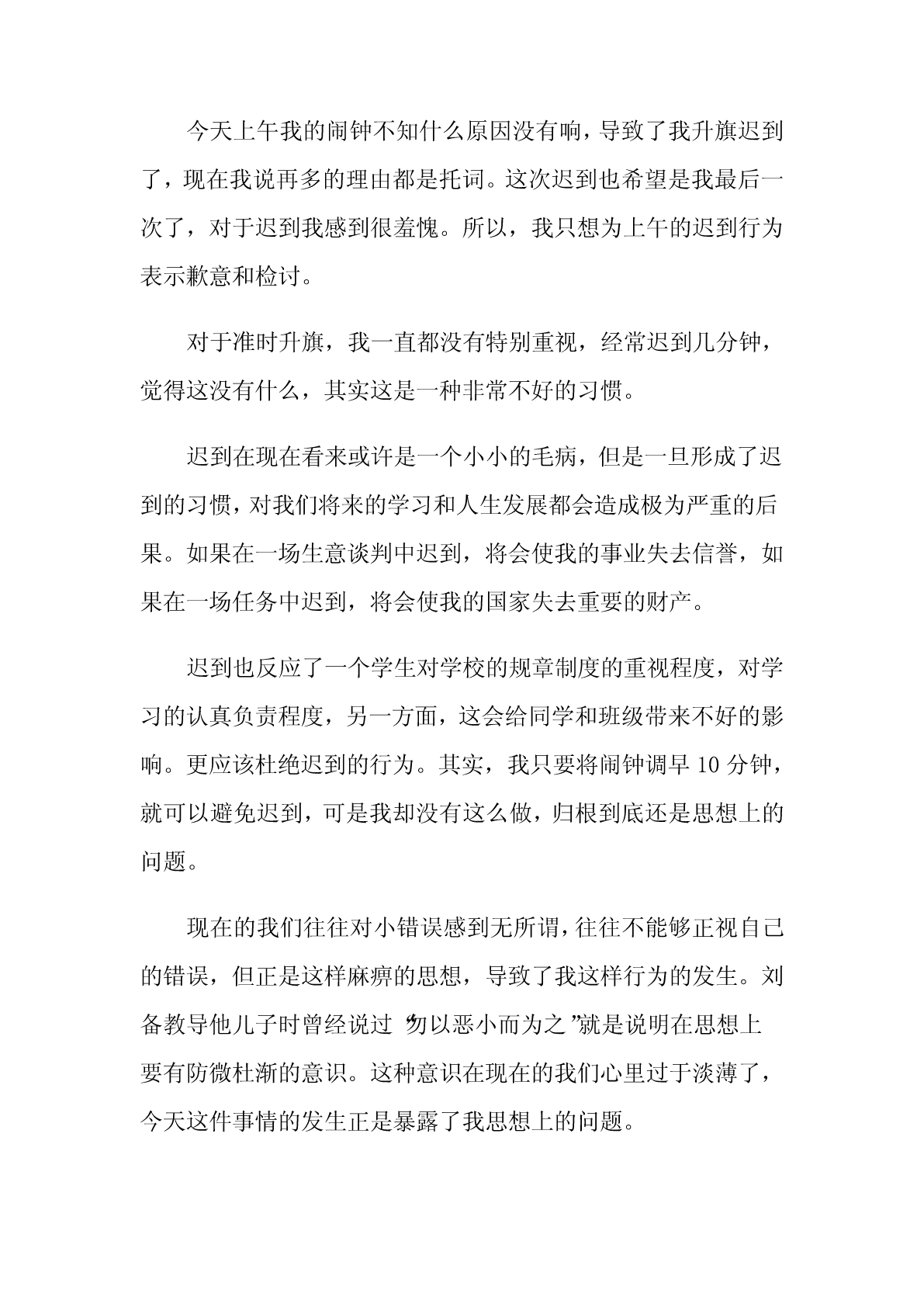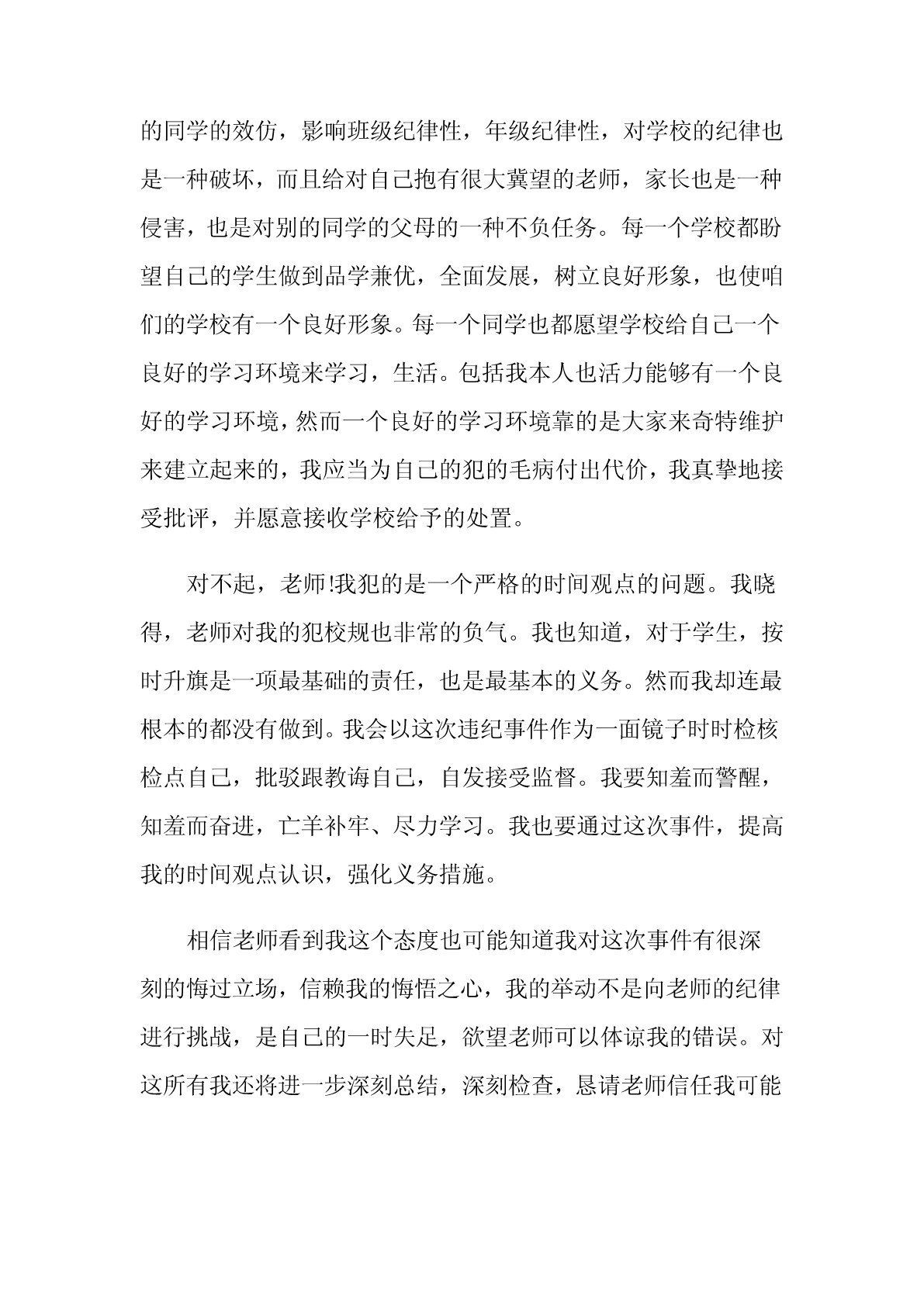 升旗迟到检讨书800字5篇每一次的升旗仪式也是为了让学生产生集体荣誉感,如果连这种最基本的事情都迟到,那么必须要写检讨。下面是为大家带来的升旗迟到检讨书,欢迎大家阅读!升旗迟到检讨书1尊敬的老师:您好!这次升旗迟到真的很不应该,我已经深刻意识到自己的错误,自己想了很多货色,检讨了很多的事件,自己也很懊悔,很气自己,做为一个学生连基本的时间概率都不,也深入意识到自己所犯弊病的重大性,对自己所犯的错误感到了愧疚。一个学校,学生都应遵照升旗时光是个不变的规定,而我始终没有引起重视,不重视学校这么平常的划定,这些都是不应该的。升旗迟到也是对老师的不尊重。事后,我冷静的想了很久,我这次犯的过错不仅给自己带来了麻烦,也给同学起了坏影响,如果每个人都像我这样升旗迟到那升旗的次序就会被捣蛋,老师无奈畸形教养,其余同学也不能畸形升旗。而且我这种行动给学校也造成了及其坏的影响,损坏了学校的管理制度,在同窗们旁边也造成了不良的影响。由于我一个人的犯错误,有可能造成别的同学的效仿,影响班级纪律性,年级纪律性,对学校的纪律也是一种破坏,而且给对自己抱有很大冀望的老师,家长也是一种侵害,也是对别的同学的父母的一种不负任务。每一个学校都盼望自己的学生做到品学兼优,全面发展,树立良好形象,也使咱们的学校有一个良好形象。每一个同学也都愿望学校给自己一个良好的学习环境来学习,生活。包括我本人也活力能够有一个良好的学习环境,然而一个良好的学习环境靠的是大家来奇特维护来建立起来的,我应当为自己的犯的毛病付出代价,我真挚地接受批评,并愿意接收学校给予的处置。对不起,老师!我犯的是一个严格的时间观点的问题。我晓得,老师对我的犯校规也非常的负气。我也知道,对于学生,按时升旗是一项最基础的责任,也是最基本的义务。然而我却连最根本的都没有做到。我会以这次违纪事件作为一面镜子时时检核检点自己,批驳跟教诲自己,自发接受监督。我要知羞而警醒,知羞而奋进,亡羊补牢、尽力学习。我也要通过这次事件,提高我的时间观点认识,强化义务措施。相信老师看到我这个态度也可能知道我对这次事件有很深刻的悔过立场,信赖我的悔悟之心,我的举动不是向老师的纪律进行挑战,是自己的一时失足,欲望老师可以体谅我的错误。对这所有我还将进一步深刻总结,深刻检查,恳请老师信任我可能记取教训、改正错误,把今后的事件加倍努力干好。同时也诚挚地渴望老师能连续关心跟支持我,并却对我的问题酌情处理。检讨人:___20__年_月_日升旗迟到检讨书2尊敬的老师:您好!在此我对今早升旗仪式迟到的行为深刻检讨。升旗仪式是神圣而又庄重的,每一次升旗仪式都体现了祖国儿女对祖国的深切热爱。对升旗仪式,每一个公民都应严肃对待。红日冉冉升起,国旗翩翩飞舞,流露出了华夏儿女期盼祖国日益强盛的美好愿望。参加升旗仪式是荣幸的,每一次,当看着国旗升起的时候,内心都会无比的激动。每一次,当唱起我们的国歌,内心都会想起那为了新中国抛头颅洒热血的革命先烈们。国旗是红色的,是被先烈们的鲜血染红的。我们能有如今的幸福生活,是离不开先烈们的英勇奉献的。缅怀先烈的升旗仪式,没有参加,是对先烈的不敬。在此我深表痛心,我会深刻检讨自己的行为。这次犯错误,自己想了很多东西,反省了很多的事情,自己也很懊悔,很气自己,去触犯学校的铁律,也深刻认识到自己所犯错误的严重性,对自己所犯的错误感到了羞愧。学校一开学就三令五申,一再强调校规校纪,提醒学生不要违反校规,可我却没有把学校和老师的话放在心上,没有重视老师说的话,没有重视学校颁布的重要事项,当成了耳旁风,这些都是不应该的。也是对老师的不尊重。应该把老师说的话紧记在心,把学校颁布的校规校纪紧记在心。事后,我冷静的想了很久,我这次犯的错误不仅给自己带来了麻烦,耽误自己的学习。而且我这种行为给学校也造成了及其坏的影响,破坏了学校的管理制度。在同学们中间也造成了不良的影响。由于我一个人的犯错误,有可能造成别的同学的效仿,影响班级纪律性,年级纪律性,对学校的纪律也是一种破坏,而且给对自己抱有很大期望的老师,家长也是一种伤害,也是对别的同学的父母的一种不负责任。每一个学校都希望自己的学生做到品学兼优,全面发展,树立良好形象,也使我们的学校有一个良好形象。以后的日子里我一定严格要求自己,遵守纪律。检讨人:___20__年_月_日升旗迟到检讨书3尊敬的老师:您好!今天上午我的闹钟不知什么原因没有响,导致了我升旗迟到了,现在我说再多的理由都是托词。这次迟到也希望是我最后一次了,对于迟到我感到很羞愧。所以,我只想为上午的迟到行为表示歉意和检讨。对于准时升旗,我一直都没有特别重视,经常迟到几分钟,觉得这没有什么,其实这是一种非常不好的习惯。迟到在现在看来或许是一个小小的毛病,但是一旦形成了迟到的习惯,对我们将来的学习和人生发展都会造成极为严重的后果。如