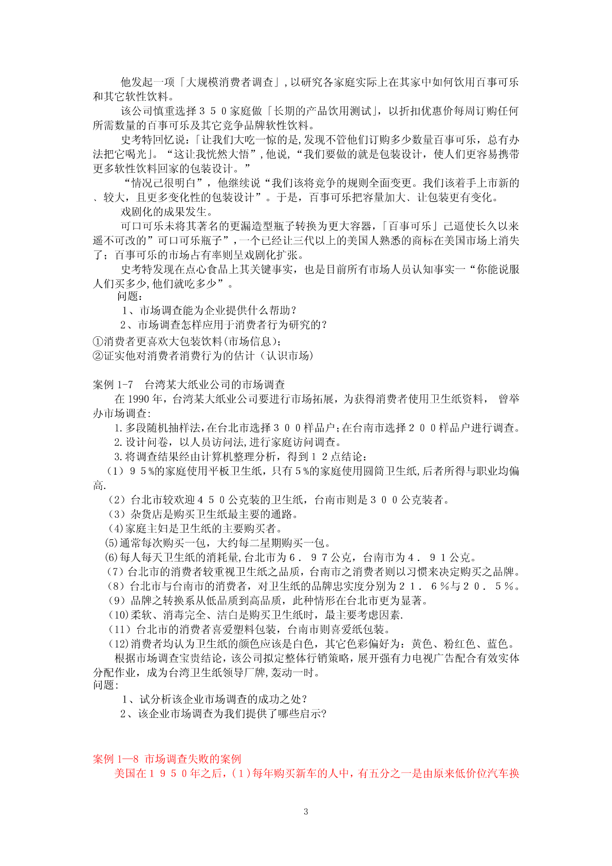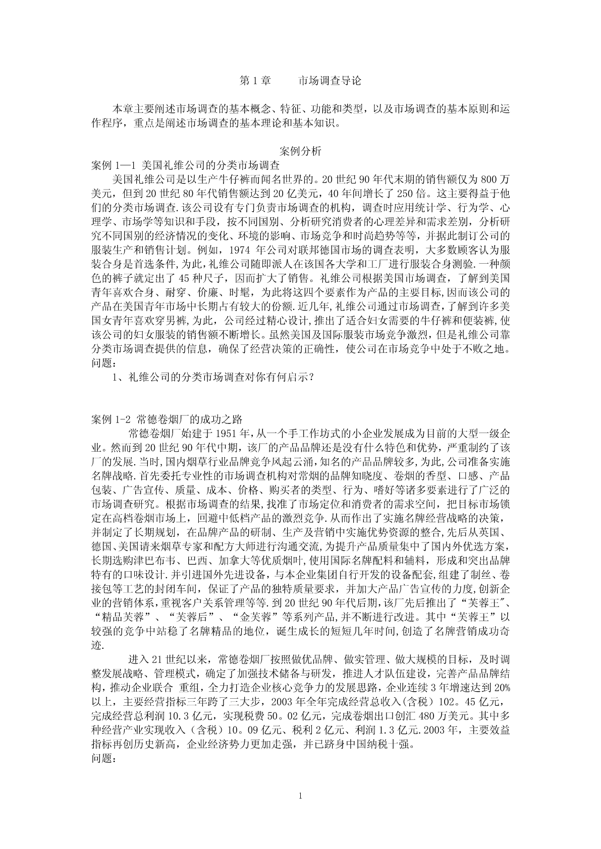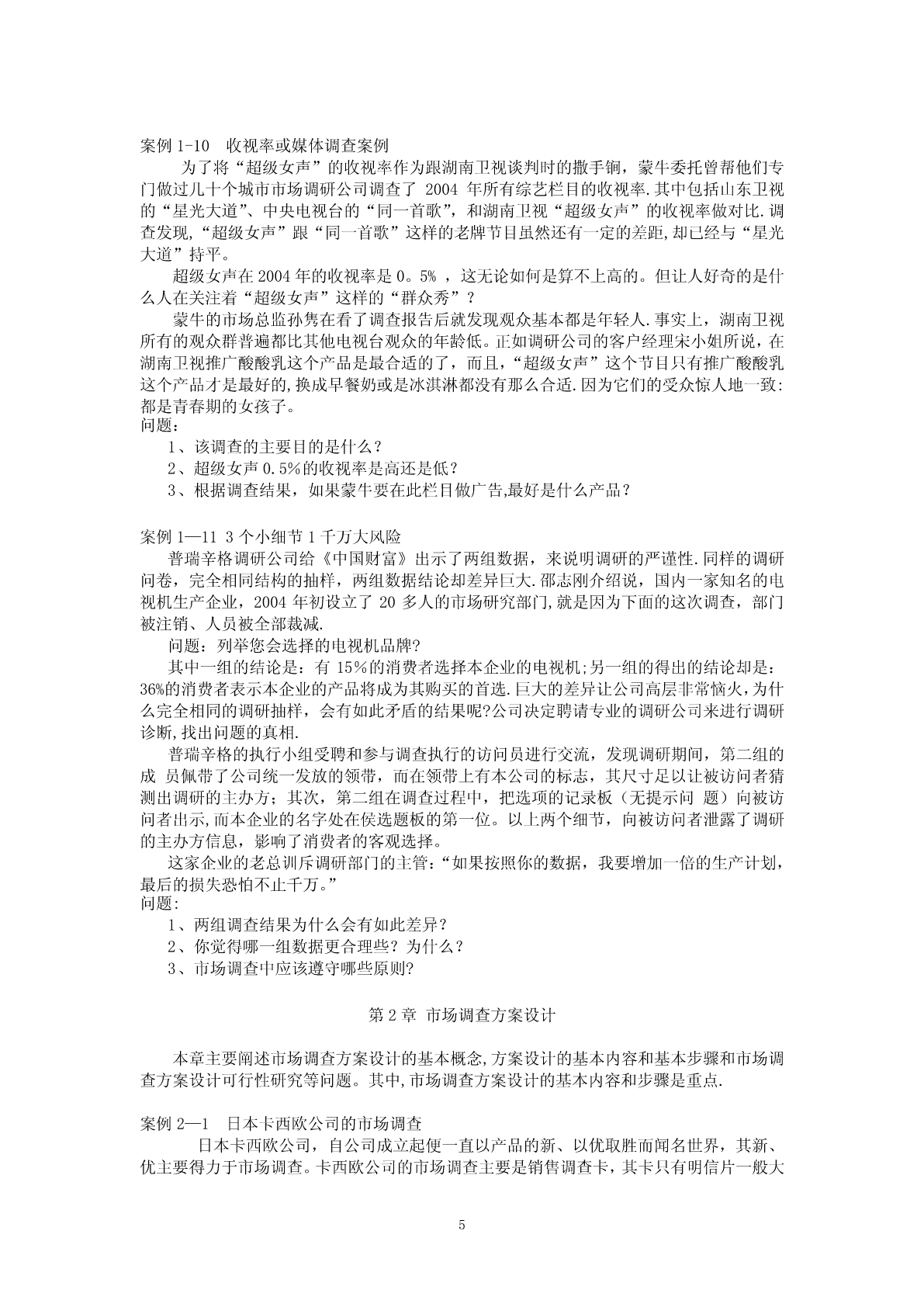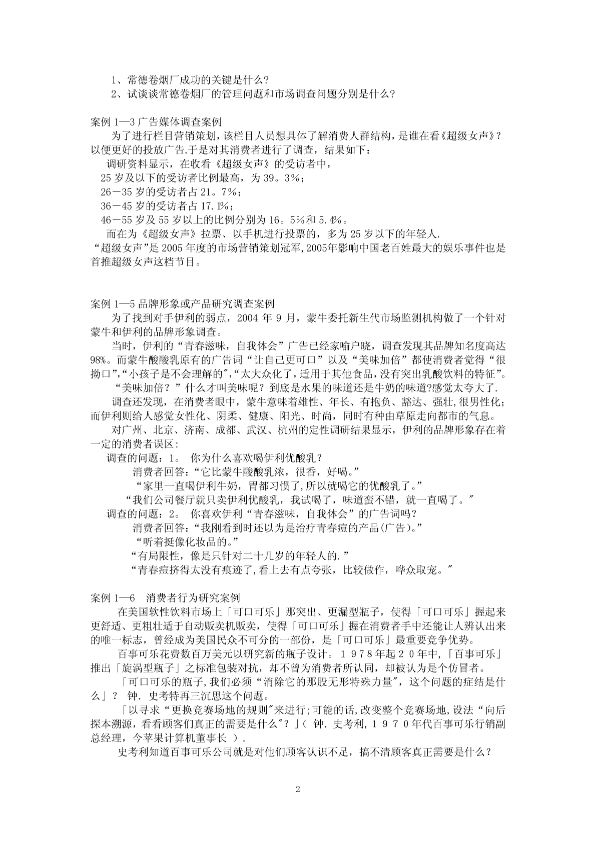 第1章市场调查导论本章主要阐述市场调查的基本概念、特征、功能和类型,以及市场调查的基本原则和运作程序,重点是阐述市场调查的基本理论和基本知识。案例分析案例1—1美国礼维公司的分类市场调查美国礼维公司是以生产牛仔裤而闻名世界的。20世纪90年代末期的销售额仅为800万美元,但到20世纪80年代销售额达到20亿美元,40年间增长了250倍。这主要得益于他们的分类市场调查.该公司设有专门负责市场调查的机构,调查时应用统计学、行为学、心理学、市场学等知识和手段,按不同国别、分析研究消费者的心理差异和需求差别,分析研究不同国别的经济情况的变化、环境的影响、市场竞争和时尚趋势等等,并据此制订公司的服装生产和销售计划。例如,1974年公司对联邦德国市场的调查表明,大多数顾客认为服装合身是首选条件,为此,礼维公司随即派人在该国各大学和工厂进行服装合身测验.一种颜色的裤子就定出了45种尺子,因而扩大了销售。礼维公司根据美国市场调查,了解到美国青年喜欢合身、耐穿、价廉、时髦,为此将这四个要素作为产品的主要目标,因而该公司的产品在美国青年市场中长期占有较大的份额.近几年,礼维公司通过市场调查,了解到许多美国女青年喜欢穿男裤,为此,公司经过精心设计,推出了适合妇女需要的牛仔裤和便装裤,使该公司的妇女服装的销售额不断增长。虽然美国及国际服装市场竞争激烈,但是礼维公司靠分类市场调查提供的信息,确保了经营决策的正确性,使公司在市场竞争中处于不败之地。问题:1、礼维公司的分类市场调查对你有何启示?案例1-2常德卷烟厂的成功之路常德卷烟厂始建于1951年,从一个手工作坊式的小企业发展成为目前的大型一级企业。然而到20世纪90年代中期,该厂的产品品牌还是没有什么特色和优势,严重制约了该厂的发展.当时,国内烟草行业品牌竞争风起云涌,知名的产品品牌较多,为此,公司准备实施名牌战略.首先委托专业性的市场调查机构对常烟的品牌知晓度、卷烟的香型、口感、产品包装、广告宣传、质量、成本、价格、购买者的类型、行为、嗜好等诸多要素进行了广泛的市场调查研究。根据市场调查的结果,找准了市场定位和消费者的需求空间,把目标市场锁定在高档卷烟市场上,回避中低档产品的激烈竞争.从而作出了实施名牌经营战略的决策,并制定了长期规划,在品牌产品的研制、生产及营销中实施优势资源的整合,先后从英国、德国、美国请来烟草专家和配方大师进行沟通交流,为提升产品质量集中了国内外优选方案,长期选购津巴布韦、巴西、加拿大等优质烟叶,使用国际名牌配料和辅料,形成和突出品牌特有的口味设计.并引进国外先进设备,与本企业集团自行开发的设备配套,组建了制丝、卷接包等工艺的封闭车间,保证了产品的独特质量要求,并加大产品广告宣传的力度,创新企业的营销体系,重视客户关系管理等等.到20世纪90年代后期,该厂先后推出了“芙蓉王"、“精品芙蓉”、“芙蓉后”、“金芙蓉”等系列产品,并不断进行改进。其中“芙蓉王”以较强的竞争中站稳了名牌精品的地位,诞生成长的短短几年时间,创造了名牌营销成功奇迹.进入21世纪以来,常德卷烟厂按照做优品牌、做实管理、做大规模的目标,及时调整发展战略、管理模式,确定了加强技术储备与研发,推进人才队伍建设,完善产品品牌结构,推动企业联合重组,全力打造企业核心竞争力的发展思路,企业连续3年增速达到20%以上,主要经营指标三年跨了三大步,2003年全年完成经营总收入(含税)102。45亿元,完成经营总利润10.3亿元,实现税费50。02亿元,完成卷烟出口创汇480万美元。其中多种经营产业实现收入(含税)10。09亿元、税利2亿元、利润1.3亿元.2003年,主要效益指标再创历史新高,企业经济势力更加走强,并已跻身中国纳税十强。问题:11、常德卷烟厂成功的关键是什么?2、试谈谈常德卷烟厂的管理问题和市场调查问题分别是什么?案例1—3广告媒体调查案例为了进行栏目营销策划,该栏目人员想具体了解消费人群结构,是谁在看《超级女声》?以便更好的投放广告.于是对其消费者进行了调查,结果如下:调研资料显示,在收看《超级女声》的受访者中,25岁及以下的受访者比例最高,为39。3%;26-35岁的受访者占21。7%;36-45岁的受访者占17.1%;46-55岁及55岁以上的比例分别为16。5%和5.4%。而在为《超级女声》拉票、以手机进行投票的,多为25岁以下的年轻人.“超级女声”是2005年度的市场营销策划冠军,2005年影响中国老百姓最大的娱乐事件也是首推超级女声这档节目。案例1—5品牌形象或产品研究调查案例为了找到对手伊利的弱点,2004年9月,蒙牛委托新生代市场监测机构做了一个针对蒙牛和伊利的品牌形象调查。当时,伊利的“青春滋味,自我体会”广告已经家喻户晓,调查发现其品牌知名度高达98%。而蒙牛酸酸乳原有的广告词“让自己更可