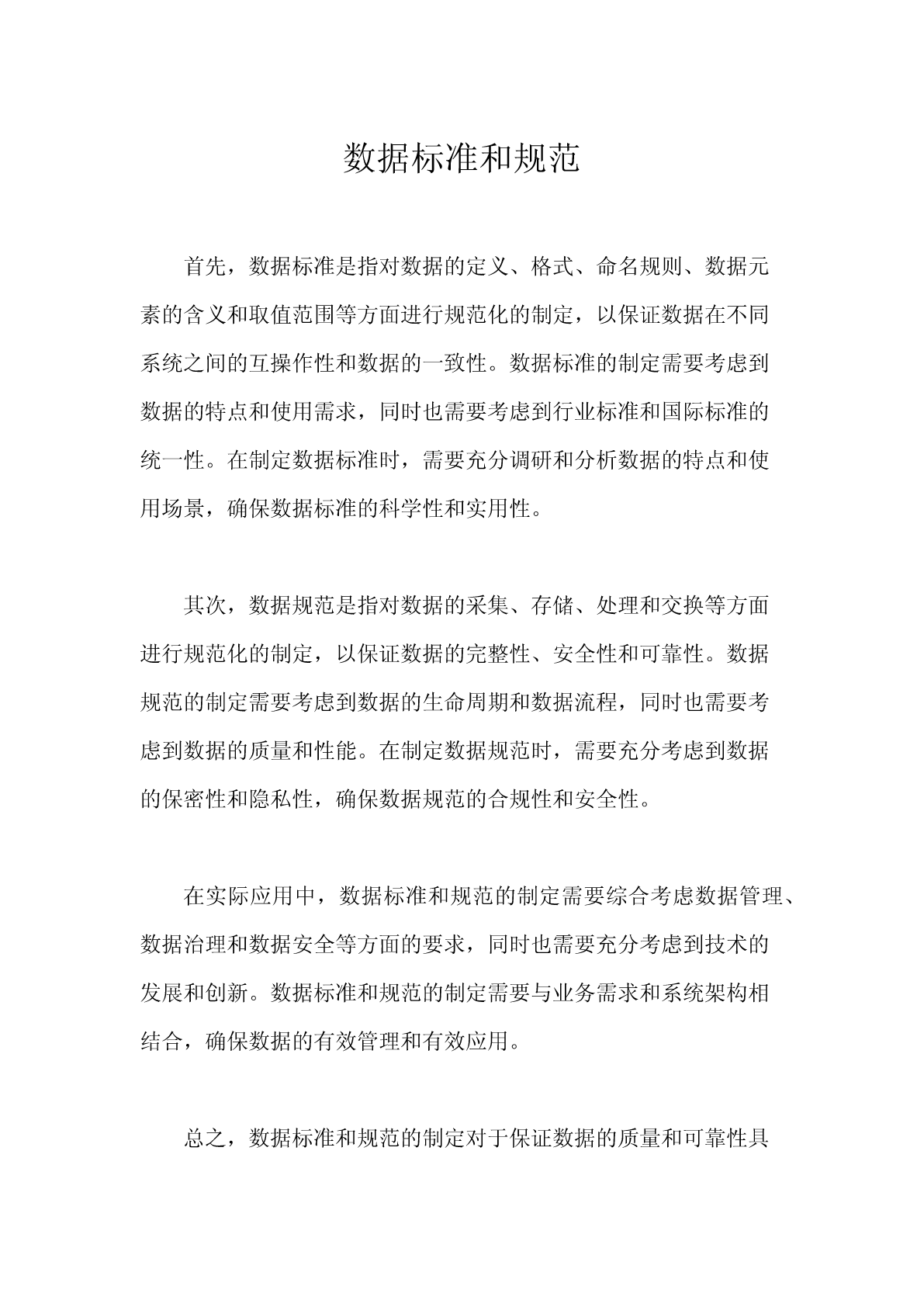 数据标准和规范首先,数据标准是指对数据的定义、格式、命名规则、数据元素的含义和取值范围等方面进行规范化的制定,以保证数据在不同系统之间的互操作性和数据的一致性。数据标准的制定需要考虑到数据的特点和使用需求,同时也需要考虑到行业标准和国际标准的统一性。在制定数据标准时,需要充分调研和分析数据的特点和使用场景,确保数据标准的科学性和实用性。其次,数据规范是指对数据的采集、存储、处理和交换等方面进行规范化的制定,以保证数据的完整性、安全性和可靠性。数据规范的制定需要考虑到数据的生命周期和数据流程,同时也需要考虑到数据的质量和性能。在制定数据规范时,需要充分考虑到数据的保密性和隐私性,确保数据规范的合规性和安全性。在实际应用中,数据标准和规范的制定需要综合考虑数据管理、数据治理和数据安全等方面的要求,同时也需要充分考虑到技术的发展和创新。数据标准和规范的制定需要与业务需求和系统架构相结合,确保数据的有效管理和有效应用。总之,数据标准和规范的制定对于保证数据的质量和可靠性具有重要意义,对于推动数据化转型和数字化发展也具有重要意义。希望各行各业能够重视数据标准和规范的制定,加强数据管理和数据治理,推动数据的有效应用,为社会发展和经济增长提供更多的支持和保障。