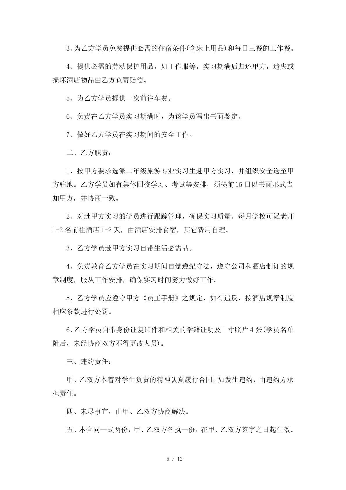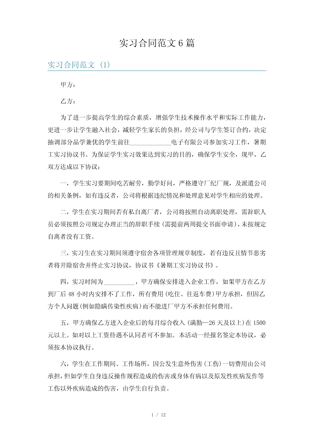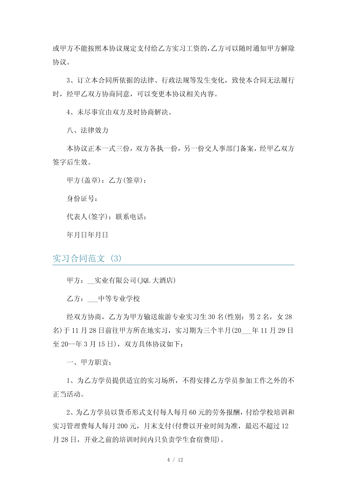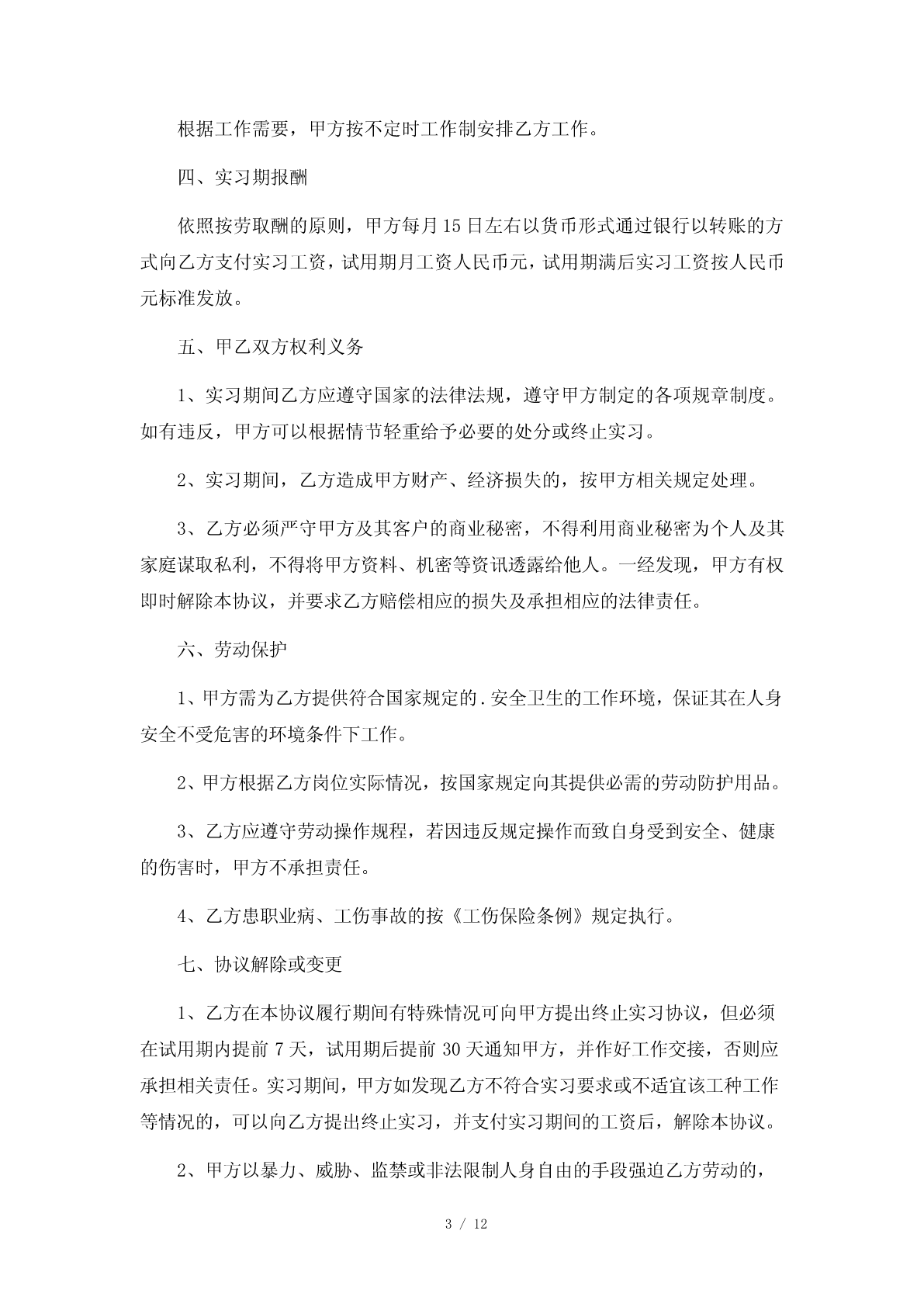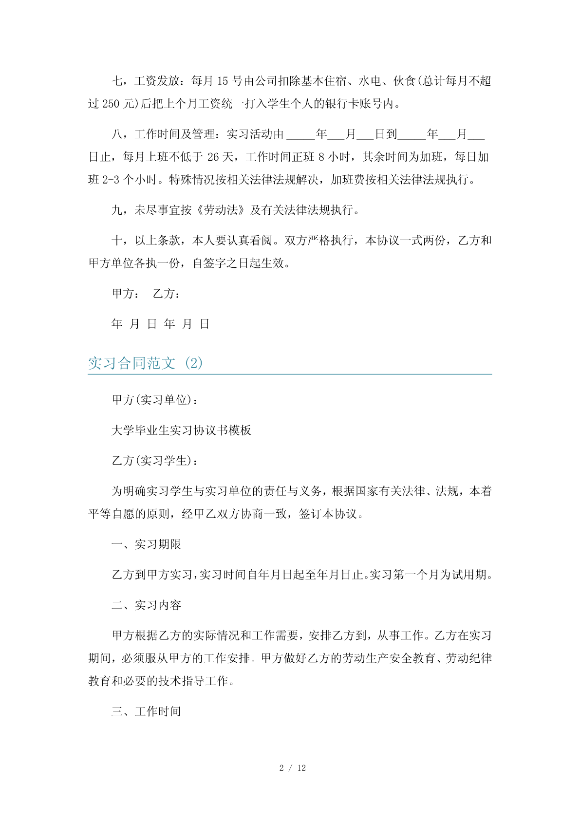 实习合同范文6篇实习合同范文(1)甲方:乙方:为了进一步提高学生的综合素质,增强学生技术操作水平和实际工作能力,更进一步让学生融入社会,减轻学生家长的负担,经公司与学生签订合约,决定抽调部分品学兼优的学生前往_____________电子有限公司参加实习工作,暑期工实习协议书。为保证学生实习效果达到实习的目的,确保学生安全,现甲,乙双方达成以下协议:一,学生实习要期间吃苦耐劳,勤学好问,严格遵守厂纪厂规,及派遣公司的相关条例,如有违反者,公司将根据违纪情况和处理意见对学生相应的处理。二,学生在实习期间若有私自离厂者,公司将按照自动离职处理,需辞职人员必须按照公司规定办理正当的辞职手续(需提前两周提交书面申请),未按规定自离者没有工资。三,实习生在实习期间须遵守宿舍各项管理规章制度,若有违反且情节恶劣者将开除宿舍并终止实习协议,协议书《暑期工实习协议书》。四,实习时间为__________,甲方确保安排进入企业工作,如果甲方在乙方到厂后48小时内安排不了工作,所有费用(吃住、往返车费)甲方承担,但因乙方个人问题(例如隐瞒传染性疾病)而不能进厂甲方不承担任何费用。五,甲方确保乙方进入企业后的每月综合收入(满勤—26天及以上)在1500元以上。如对以上工资待遇不认同者可不参加。本活动一经报名签定本协议,必须按本协议执行。六,学生在工作期间、工作场所,因公发生意外伤害(工伤)一切费用由公司承担,但如学生自身违反操作规程造成的伤害或身体有病以及原发性疾病发作等工伤以外疾病造成的伤害,由学生自行负责。1/12七,工资发放:每月15号由公司扣除基本住宿、水电、伙食(总计每月不超过250元)后把上个月工资统一打入学生个人的银行卡账号内。八,工作时间及管理:实习活动由_____年___月___日到_____年___月___日止,每月上班不低于26天,工作时间正班8小时,其余时间为加班,每日加班2-3个小时。特殊情况按相关法律法规解决,加班费按相关法律法规执行。九,未尽事宜按《劳动法》及有关法律法规执行。十,以上条款,本人要认真看阅。双方严格执行,本协议一式两份,乙方和甲方单位各执一份,自签字之日起生效。甲方:乙方:年月日年月日实习合同范文(2)甲方(实习单位):大学毕业生实习协议书模板乙方(实习学生):为明确实习学生与实习单位的责任与义务,根据国家有关法律、法规,本着平等自愿的原则,经甲乙双方协商一致,签订本协议。一、实习期限乙方到甲方实习,实习时间自年月日起至年月日止。实习第一个月为试用期。二、实习内容甲方根据乙方的实际情况和工作需要,安排乙方到,从事工作。乙方在实习期间,必须服从甲方的工作安排。甲方做好乙方的劳动生产安全教育、劳动纪律教育和必要的技术指导工作。三、工作时间2/12根据工作需要,甲方按不定时工作制安排乙方工作。四、实习期报酬依照按劳取酬的原则,甲方每月15日左右以货币形式通过银行以转账的方式向乙方支付实习工资,试用期月工资人民币元,试用期满后实习工资按人民币元标准发放。五、甲乙双方权利义务1、实习期间乙方应遵守国家的法律法规,遵守甲方制定的各项规章制度。如有违反,甲方可以根据情节轻重给予必要的处分或终止实习。2、实习期间,乙方造成甲方财产、经济损失的,按甲方相关规定处理。3、乙方必须严守甲方及其客户的商业秘密,不得利用商业秘密为个人及其家庭谋取私利,不得将甲方资料、机密等资讯透露给他人。一经发现,甲方有权即时解除本协议,并要求乙方赔偿相应的损失及承担相应的法律责任。六、劳动保护1、甲方需为乙方提供符合国家规定的.安全卫生的工作环境,保证其在人身安全不受危害的环境条件下工作。2、甲方根据乙方岗位实际情况,按国家规定向其提供必需的劳动防护用品。3、乙方应遵守劳动操作规程,若因违反规定操作而致自身受到安全、健康的伤害时,甲方不承担责任。4、乙方患职业病、工伤事故的按《工伤保险条例》规定执行。七、协议解除或变更1、乙方在本协议履行期间有特殊情况可向甲方提出终止实习协议,但必须在试用期内提前7天,试用期后提前30天通知甲方,并作好工作交接,否则应承担相关责任。实习期间,甲方如发现乙方不符合实习要求或不适宜该工种工作等情况的,可以向乙方提出终止实习,并支付实习期间的工资后,解除本协议。2、甲方以暴力、威胁、监禁或非法限制人身自由的手段强迫乙方劳动的,3/12或甲方不能按照本协议规定支付给乙方实习工资的,乙方可以随时通知甲方解除协议。3、订立本合同所依据的法律、行政法规等发生变化,致使本合同无法履行时,经甲乙双方协商同意,可以变更本协议相关内容。4、未尽事宜由双方及时协商解决。八、法律效力本协议正本一式三份,双方各执一份,另一份交人事部门备案,经甲乙双方签字后生效。甲方(盖章):乙方(签章):身份证号:代表人(签字):联系电话:年月日年月日