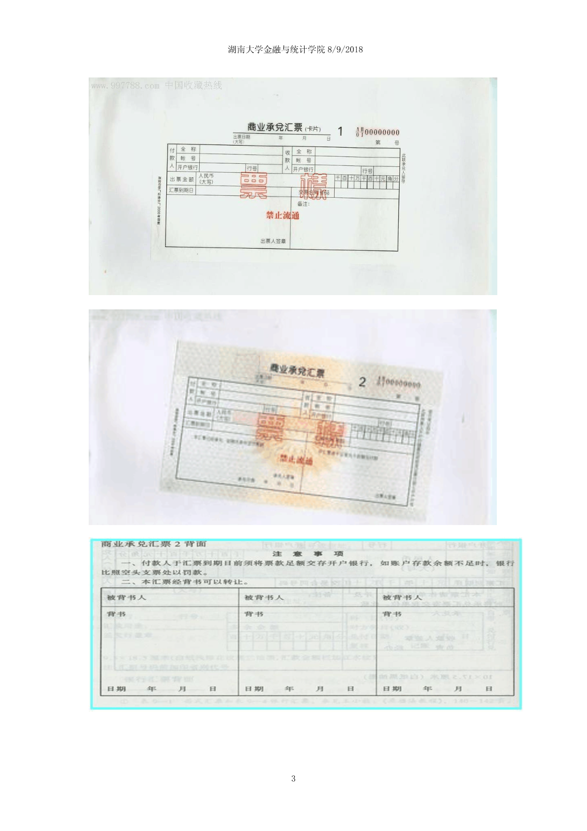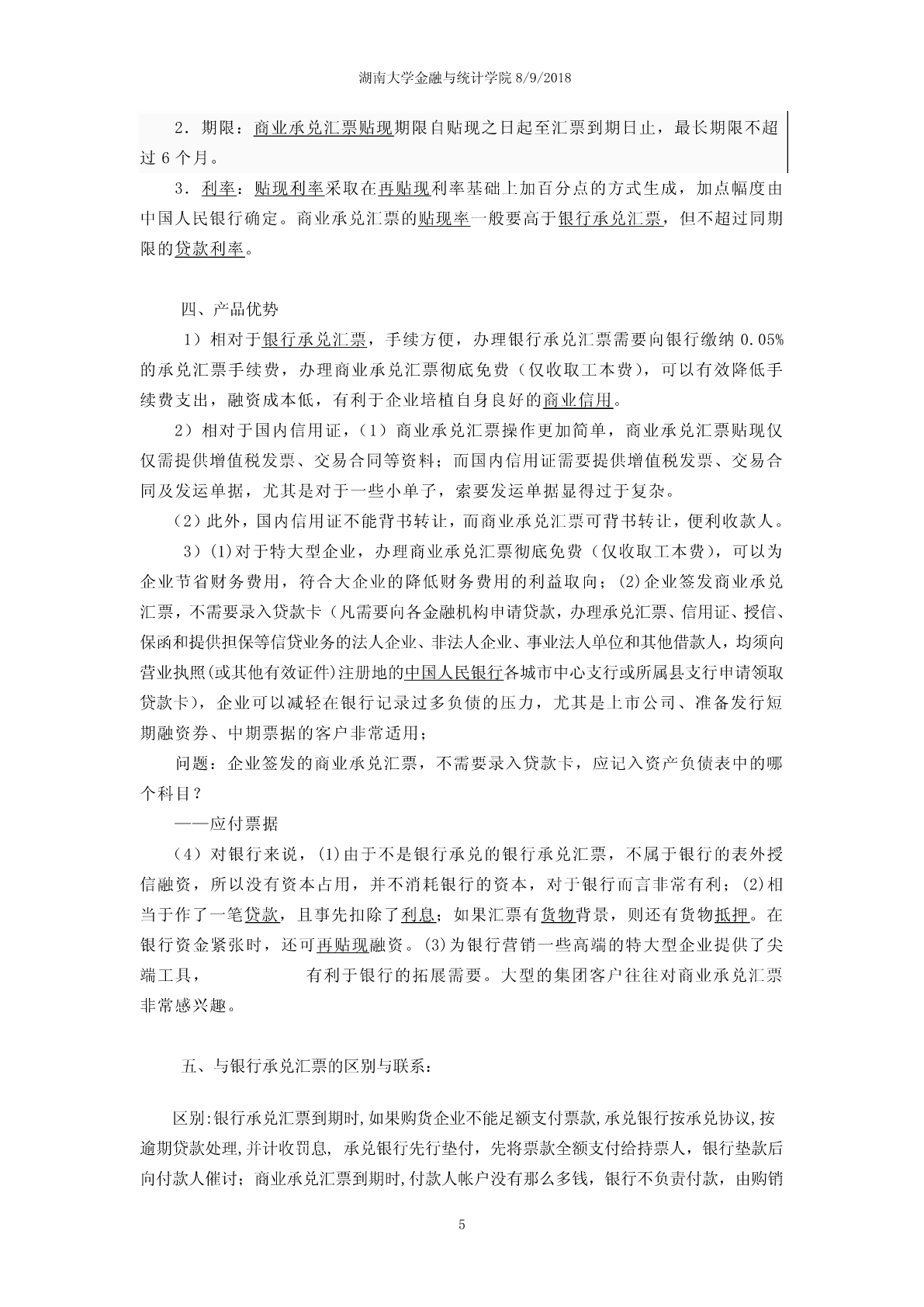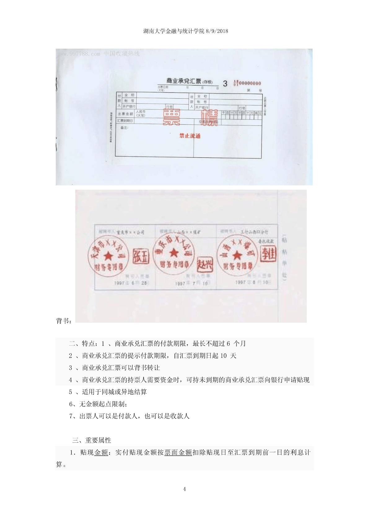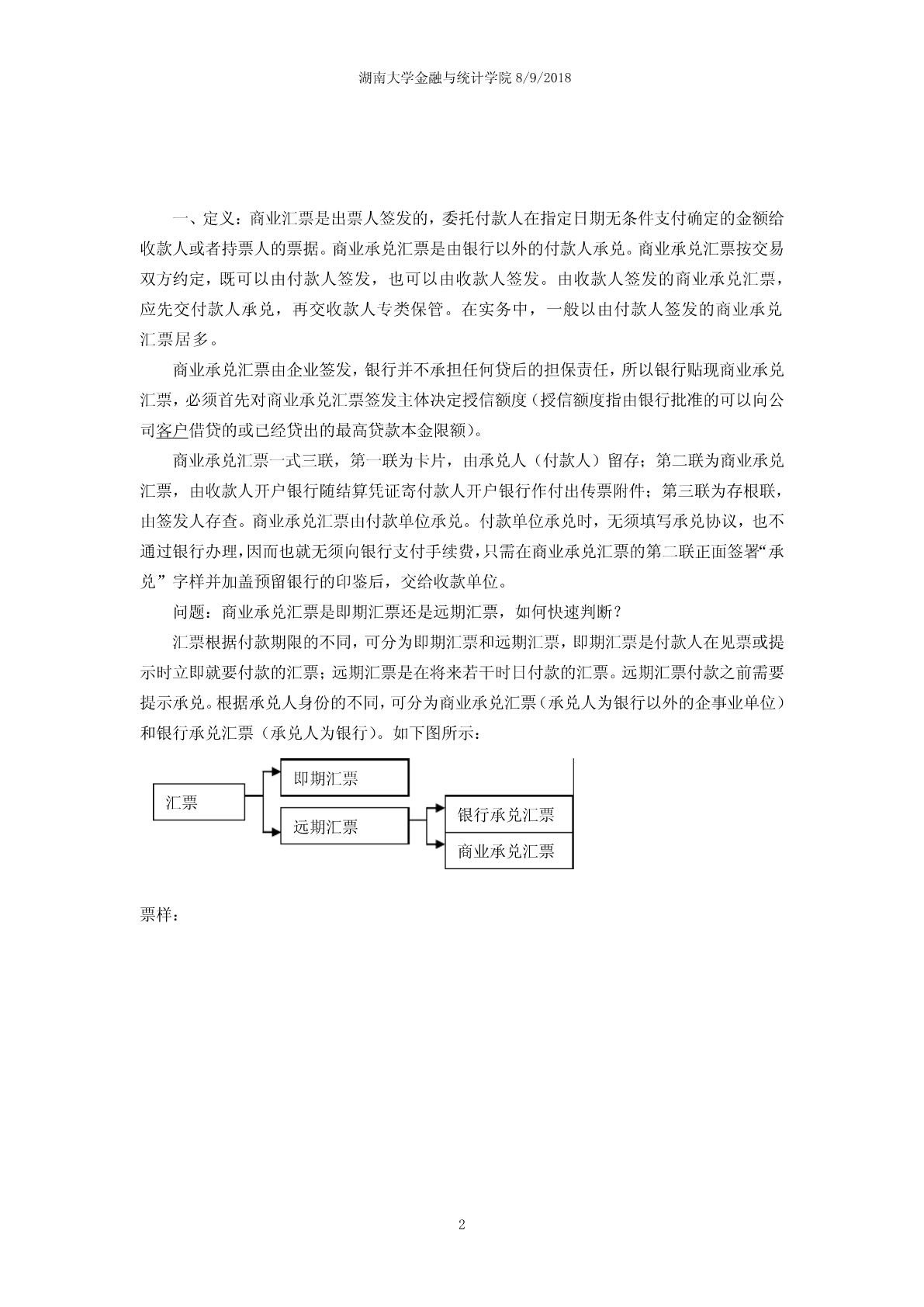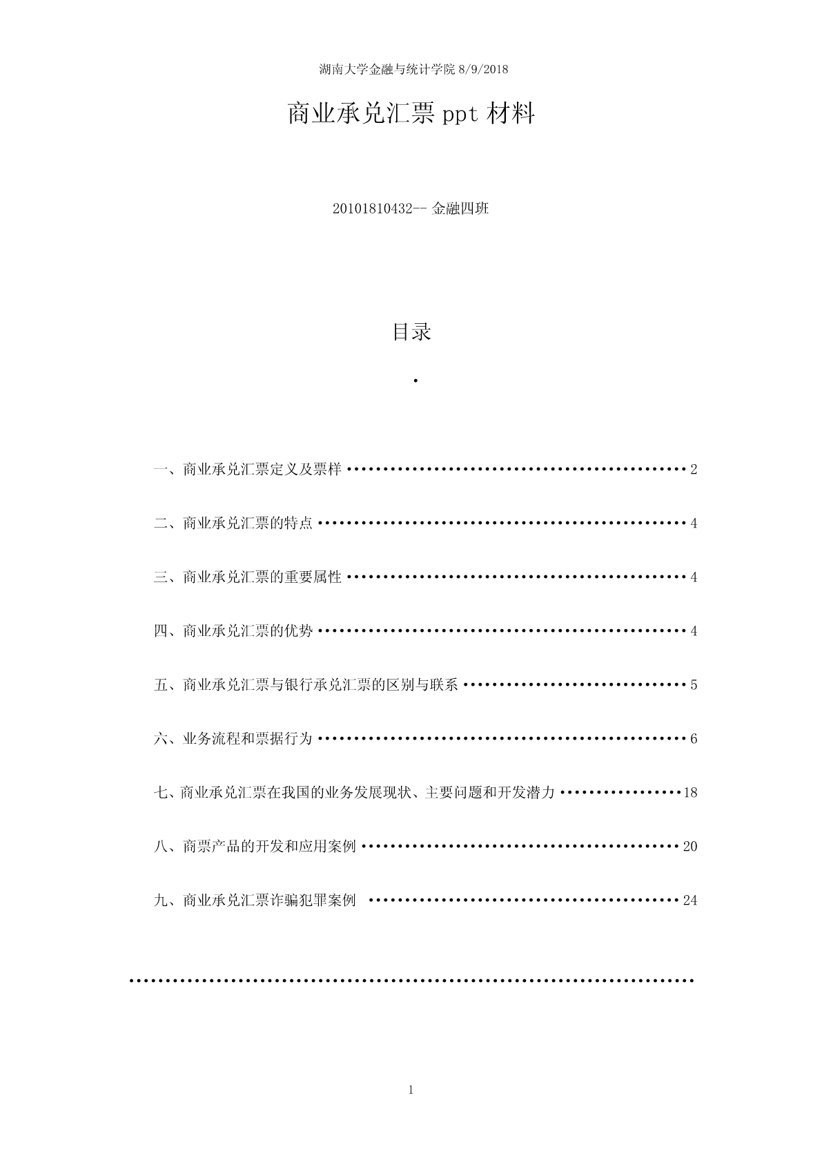湖南大学金融与统计学院8/9/2018商业承兑汇票ppt材料20101810432--金融四班目录·一、商业承兑汇票定义及票样···············································2二、商业承兑汇票的特点···················································4三、商业承兑汇票的重要属性···············································4四、商业承兑汇票的优势···················································4五、商业承兑汇票与银行承兑汇票的区别与联系·······························5六、业务流程和票据行为···················································6七、商业承兑汇票在我国的业务发展现状、主要问题和开发潜力·················18八、商票产品的开发和应用案例············································20九、商业承兑汇票诈骗犯罪案例···········································24··············································································1湖南大学金融与统计学院8/9/2018一、定义:商业汇票是出票人签发的,委托付款人在指定日期无条件支付确定的金额给收款人或者持票人的票据。商业承兑汇票是由银行以外的付款人承兑。商业承兑汇票按交易双方约定,既可以由付款人签发,也可以由收款人签发。由收款人签发的商业承兑汇票,应先交付款人承兑,再交收款人专类保管。在实务中,一般以由付款人签发的商业承兑汇票居多。商业承兑汇票由企业签发,银行并不承担任何贷后的担保责任,所以银行贴现商业承兑汇票,必须首先对商业承兑汇票签发主体决定授信额度(授信额度指由银行批准的可以向公司客户借贷的或已经贷出的最高贷款本金限额)。商业承兑汇票一式三联,第一联为卡片,由承兑人(付款人)留存;第二联为商业承兑汇票,由收款人开户银行随结算凭证寄付款人开户银行作付出传票附件;第三联为存根联,由签发人存查。商业承兑汇票由付款单位承兑。付款单位承兑时,无须填写承兑协议,也不通过银行办理,因而也就无须向银行支付手续费,只需在商业承兑汇票的第二联正面签署“承兑”字样并加盖预留银行的印鉴后,交给收款单位。问题:商业承兑汇票是即期汇票还是远期汇票,如何快速判断?汇票根据付款期限的不同,可分为即期汇票和远期汇票,即期汇票是付款人在见票或提示时立即就要付款的汇票;远期汇票是在将来若干时日付款的汇票。远期汇票付款之前需要提示承兑。根据承兑人身份的不同,可分为商业承兑汇票(承兑人为银行以外的企事业单位)和银行承兑汇票(承兑人为银行)。如下图所示:即期汇票汇票银行承兑汇票远期汇票商业承兑汇票票样:2湖南大学金融与统计学院8/9/20183湖南大学金融与统计学院8/9/2018背书:二、特点:1、商业承兑汇票的付款期限,最长不超过6个月2、商业承兑汇票的提示付款期限,自汇票到期日起10天3、商业承兑汇票可以背书转让4、商业承兑汇票的持票人需要资金时,可持未到期的商业承兑汇票向银行申请贴现5、适用于同城或异地结算6、无金额起点限制;7、出票人可以是付款人,也可以是收款人三、重要属性1.贴现金额:实付贴现金额按票面金额扣除贴现日至汇票到期前一日的利息计算。4湖南大学金融与统计学院8/9/20182.期限:商业承兑汇票贴现期限自贴现之日起至汇票到期日止,最长期限不超过6个月。3.利率:贴现利率采取在再贴现利率基础上加百分点的方式生成,加点幅度由中国人民银行确定。商业承兑汇票的贴现率一般要高于银行承兑汇票,但不超过同期限的贷款利率。四、产品优势1)相对于银行承兑汇票,手续方便,办理银行承兑汇票需要向银行缴纳0.05%的承兑汇票手续费,办理商业承兑汇票彻底免费(仅收取工本费),可以有效降低手续费支出,融资成本低,有利于企业培植自身良好的商业信用。2)相对于国内信用证,(1)商业承兑汇票操作更加简单,商业承兑汇票贴现仅仅需提供增值税发票、交易合同等资料;而国内信用证需要提供增值税发票、交易合同及发运单据,尤其是对于一些小单子,索要发运单据显得过于复杂。(2)此外,国内信用证不能背书转让,而商业承兑汇票可背书转让,便利收款人。3)(1)对于特大型企业,办理商业承兑汇票彻底免费(仅收取工本费),可以为企业节省财务费用,符合大企业的降低财务费用的利益取向;(2)