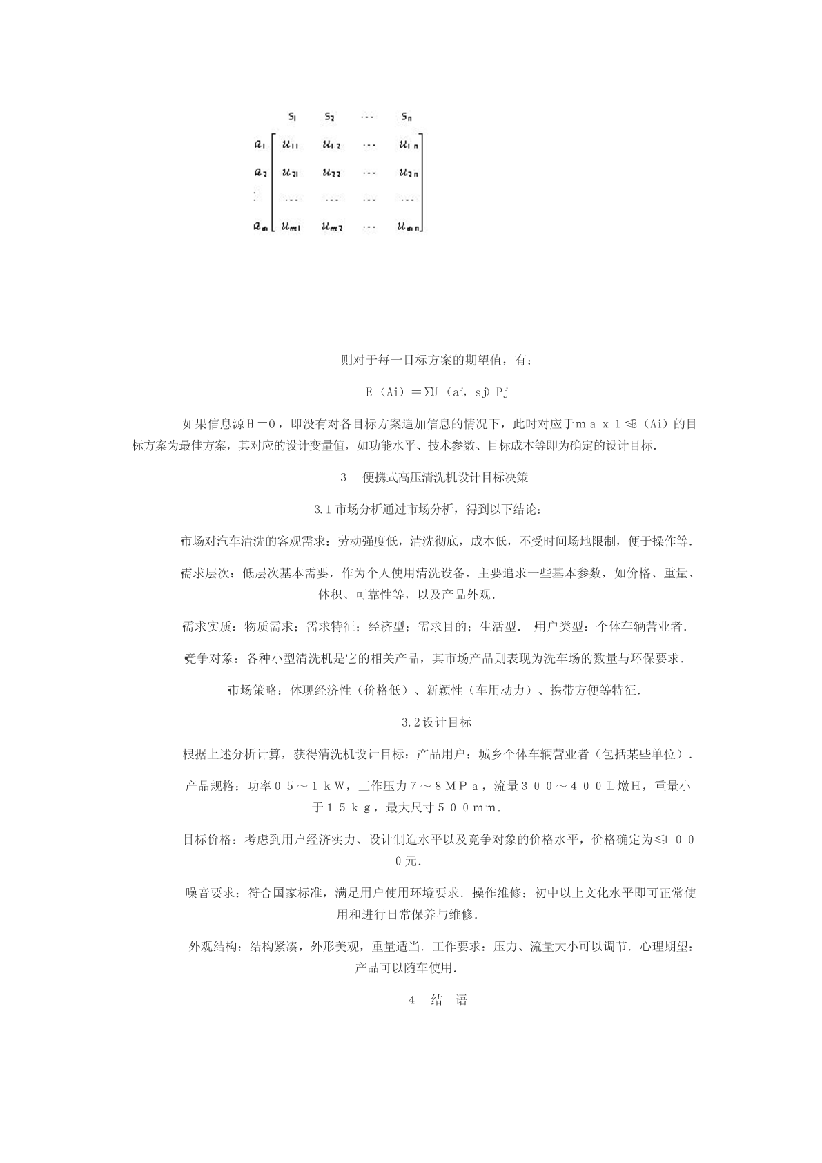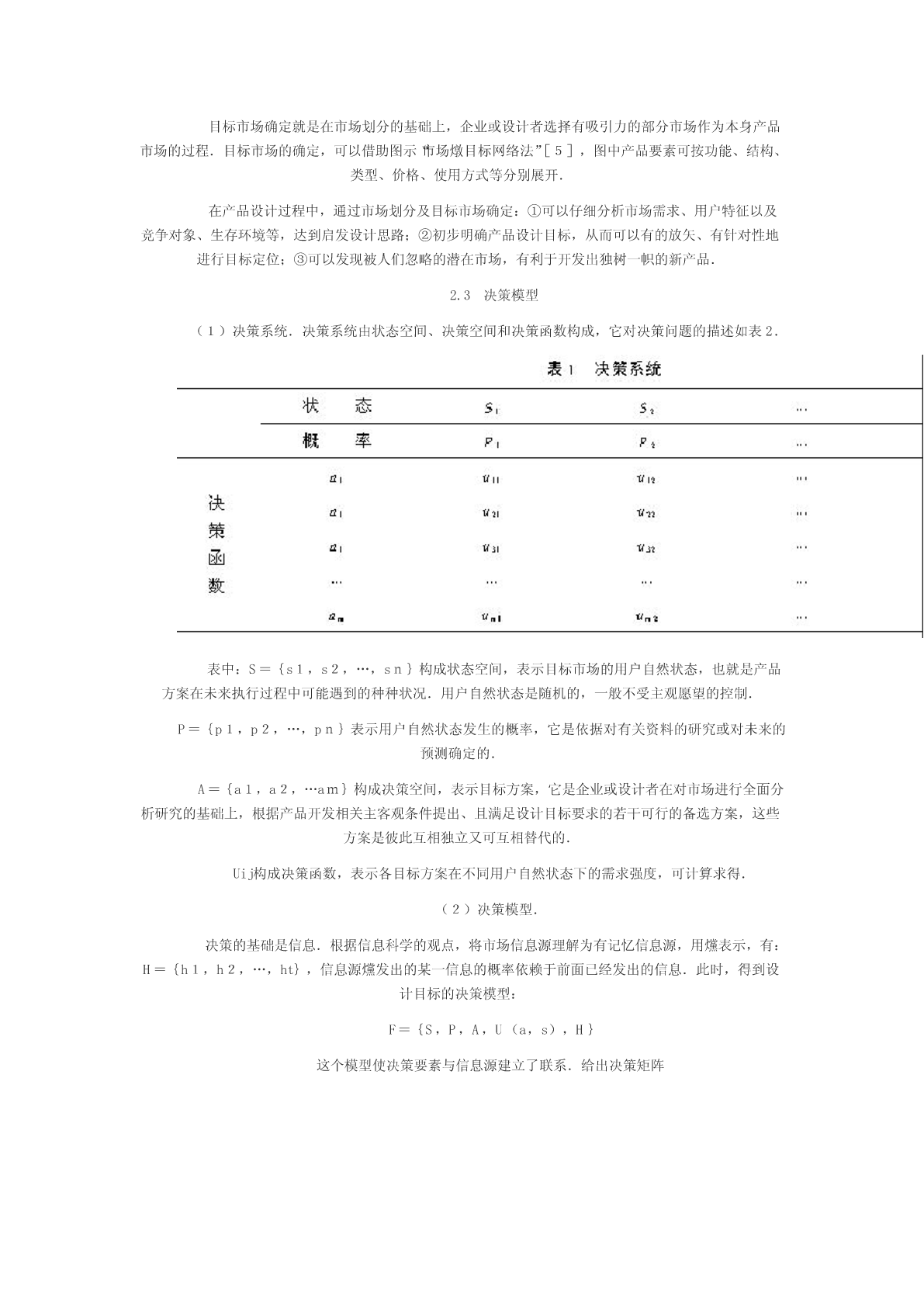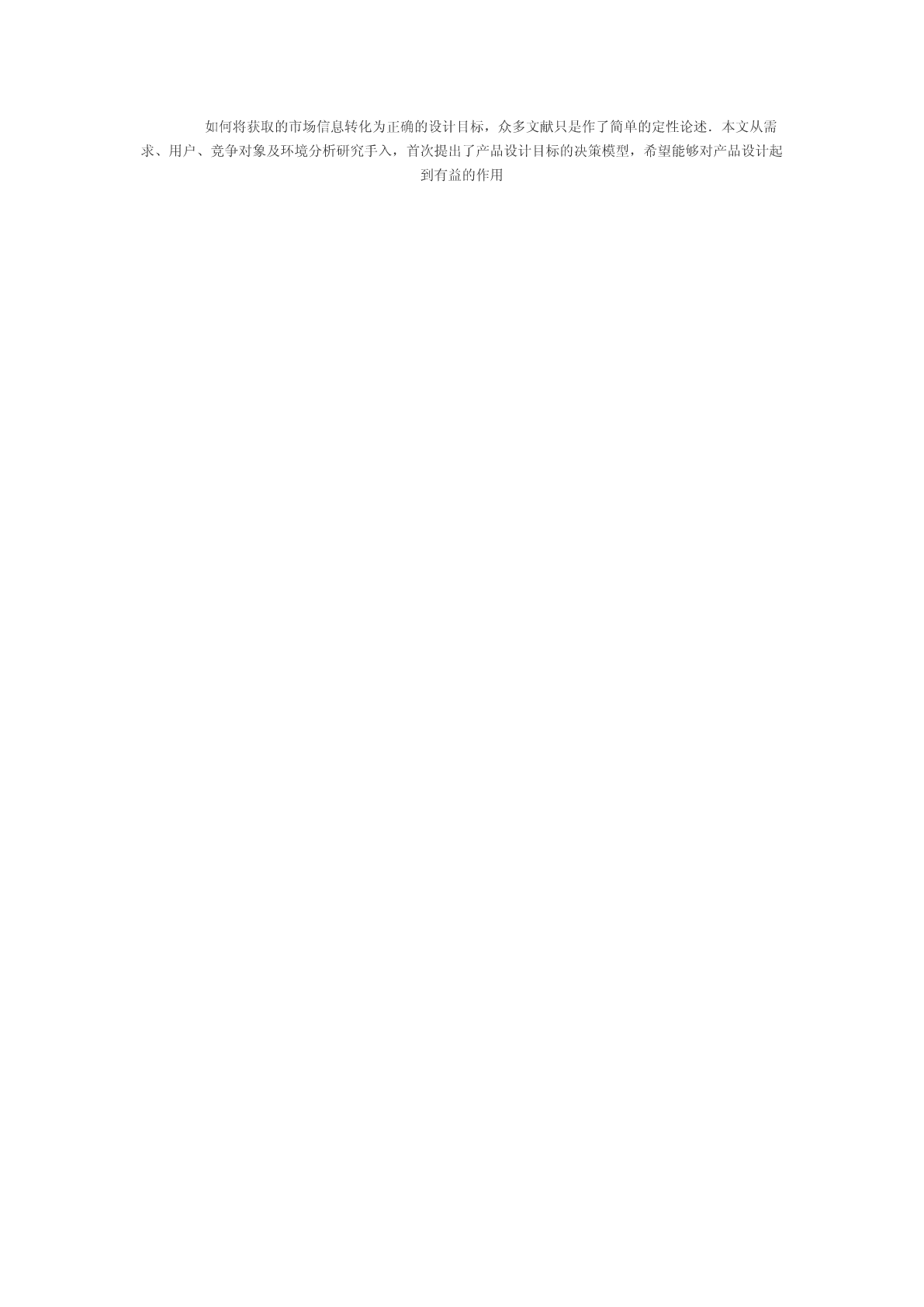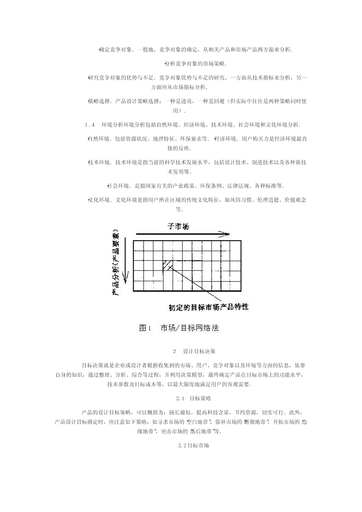 如何进行市场分析理论指导2007-07-2312:40:32阅读24评论0字号:大中小订阅在市场分析(需求分析、用户分析、竞争对象分析及环境分析)的基础上,探讨了产品设计目标决策的方法及步骤,并以实例说明其有效性.分析市场,设计市场需要的产品,是每个设计者都明白的道理.文献[1]中,把设计活动不再看成是一种产品活动,不再是封闭的自我包含的活动,而是在市场竞争中和设计互相联系的开发活动.它要求设计部门在产品开发的过程中就要与销售及生产部门密切配合,以便得到既有良好性能又能适合市场的、便于制造销售的优良产品.文献[2]指出,对于顾客(用户)的融入,最重要的是阶段1“阐明并精确规定任务书”与其工作结果“要求表”的结合点,该要求表始终作为实际工作基础伴随整个工作过程.文献[3]在总结英语地区设计进程时认为:它们对“问题的确定”都很重视,在确定之前还要经过分析与识别,在总结德语地区设计进程时认为其“对明确课题都很重视,大都列为专门的阶段”.文献[4]在分析产品设计目标确定时指出,最重要的,也是当前设计部分经常忽略的是市场调查和可行性研究.由此可以看出,市场分析作为产品设计的首要环节,是设计目标决策的重要依据,具有非常重要的地位.但是,在这些研究中,市场分析以及产品设计目标的决策始终是一个薄弱环节,仅见到一些表面的叙述,尚未进行深入研究,这种状态严重阻碍了产品的商品化,本文的工作正基于此展开1市场分析在产品设计过程中,市场分析就是通过市场调查,对当前市场需求、用户状态、竞争对象及环境进行分析研究,为设计目标决策提供依据.1.1需求分析需求是人类对客观世界的某种不满足,体现为人类生产或生活活动中的物质和精神需要,在市场经济条件下,需求表现为用户具有支付能力的客观需要,它是产品赖以生存的基础.需求分析包括需求层次分析、需求特征分析、需求分类及需求强度计算等.在产品设计中,通过需求分析,可以确定不同类型用户的需求状况,是产品市场定位的重要依据.1.2用户分析用户的思想决定用户的行为,一切行为总是由具体的需要或欲望引起的.在产品设计中对用户进行分析,将有助于确立产品的目标用户,使设计目标明确,产品适销对路,达到商品化的目的.用户分析包括:·用户特征分析.涉及市场、经济、心理、社会及文化等五个方面.·用户分类.从地理位置、需求目的、属性及社会经济地位四个方面进行划分.·用户价值分析.用户价值是用户根据自身需要和偏好情况,按照主观标准对产品的评价价值,是用户对产品选择的主要依据.产品设计必须使设计价值与用户价值协调一致,才能在激烈的市场竞争中求得生存和发展.1.3竞争对象分析为了有效分析竞争对象,首先要明确本产品的竞争者是谁?然后分析它们的市场策略、优势和弱点,最后根据产品同竞争对象的力量对比,进行策略选择.归纳起来,有如下步骤:·确定竞争对象.一般地,竞争对象的确定,从相关产品和市场产品两方面来分析.·分析竞争对象的市场策略.·研究竞争对象的优势与不足.竞争对象优势与不足的研究,一方面从技术指标来分析,另一方面应从市场指标分析.·策略选择.产品设计策略选择:一种是进攻,一种是回避(但实际中往往是两种策略同时使用).1.4环境分析环境分析包括自然环境、经济环境、技术环境、社会环境和文化环境分析.·自然环境.包括资源状况、地理特征、环保要求等.·经济环境.用户购买力是经济环境最直接的反映.·技术环境.技术环境是指当前的科学技术发展水平,包括设计技术、制造技术以及各种新技术发明等.·社会环境.是指国家有关的产业政策、环保条例、法律法规、各种标准等.·文化环境.文化环境是指用户所在区域的传统文化特征,如风俗习惯、伦理道德、价值观念等.2设计目标决策目标决策就是企业或设计者根据收集到的市场、用户、竞争对象以及环境等方面的信息,依靠自身的知识,通过整理、分析、综合等过程,并利用决策模型,最终确定产品在目标市场上的功能水平,技术参数及目标成本等,以最大限度地满足用户的客观需要.2.1目标策略产品的设计目标策略,可以概括为:扬长避短,提高科技含量,节约资源,切实可行.此外,产品设计目标确定时,应注意如下策略,如寻求市场的“空白地带”,弥补市场的“断裂地带”,开拓市场的“边缘地带”,突击市场的“落后地带”等.2.2目标市场目标市场确定就是在市场划分的基础上,企业或设计者选择有吸引力的部分市场作为本身产品市场的过程.目标市场的确定,可以借助图示“市场燉目标网络法”[5],图中产品要素可按功能、结构、类型、价格、使用方式等分别展开.在产品设计过程中,通过市场划分及目标市场确定:①可以仔细分析市场需求、用户特征以及竞争对象、生存环境等,达到启发设计思路;②初步明确产品设计目标,从而可以有的放矢、有针对性地进行目标定位;③可以发现被人们忽略的潜在市场,有利于开发出独树一帜的