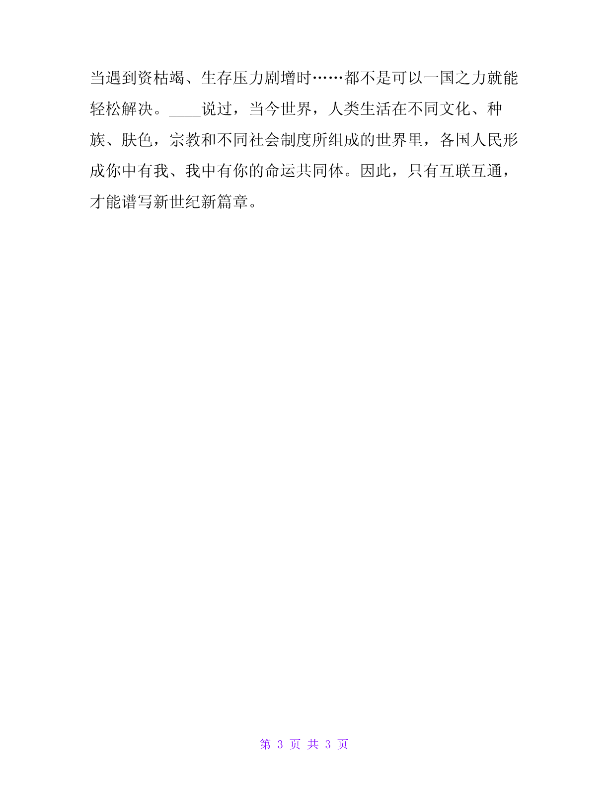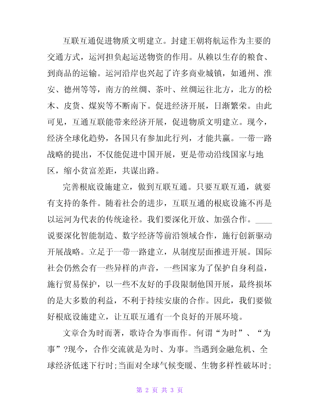 申论:互通互联,共谋开展申论:互通互联,共谋开展假设无水殿龙舟事,共禹论功不较多——南起余杭北到涿郡的大运河,联通南北,让沿线城市地区有了互相交流的时机。大运河使中国经济中心南移,带动沿线城市的开展——文化的交流,经济的繁荣。当前,应对共同挑战、迈向美妙将来,既需要经济科技力量,也需要文化文明力量,这一切都离不开各国各地区的互通互联。互联互通促进精神文明建立。运河的开通,无疑可以加强沿线城市的文明交流沟通,本身就是一种文化符号,昔日运河上的“十里红妆”、头尾相接的乌篷船……象征着中华民族的运河文化、时至今日仍然发挥着重要作用,对国内外的文化开展意义深远。明末清初,国外的天文学、医学涌入中国,也带来了西方的价值观念,冲击着传统封建文明,才有了今天的中华文化;孔子学院的兴起传播着中华优秀传统文化,将文明古国的生活方式、行为习惯、思想观念传播交流。文化价值多元的今天,各民族文化在不断交流借鉴中开展,更需要这种互通互联。互联互通促进物质文明建立。封建王朝将航运作为主要的交通方式,运河担负起运送物资的作用。从赖以生存的粮食、到商品的运输。运河沿岸也兴起了许多商业城镇,如通州、淮安、德州等等,南方的丝绸、茶叶、丝绸运往北方,北方的松木、皮货、煤炭等不断南下。促进经济开展,日渐繁荣。由此可见,互通互联能带来经济开展,促进物质文明建立。现今,经济全球化趋势,各国只有参加此行列,才能共赢。一带一路战略的提出,不仅能促进中国开展,更是带动沿线国家与地区,缩小贫富差距,共谋出路。完善根底设施建立,做到互联互通。只要互联互通,就要有支持的条件。随着社会的进步,互联互通的根底设施不再是以运河为代表的传统途径。我们要深化开放、加强合作。____说要深化智能制造、数字经济等前沿领域合作,施行创新驱动开展战略。立足于一带一路建立,从制度层面推进开展。国际社会仍然会有一些异样的声音,一些国家为了保护自身利益,施行贸易保护,以一些不友好的手段限制他国开展,最终损坏的是大多数的利益,不利于持续安康的合作。因此,我们要做好根底设施建立,让互联互通有一个良好的开展环境。文章合为时而著,歌诗合为事而作。何谓“为时”、“为事”?现今,合作交流就是为时、为事。当遇到金融危机、全球经济低迷下行时;当面对全球气候变暖、生物多样性破坏时;当遇到资枯竭、生存压力剧增时……都不是可以一国之力就能轻松解决。____说过,当今世界,人类生活在不同文化、种族、肤色,宗教和不同社会制度所组成的世界里,各国人民形成你中有我、我中有你的命运共同体。因此,只有互联互通,才能谱写新世纪新篇章。