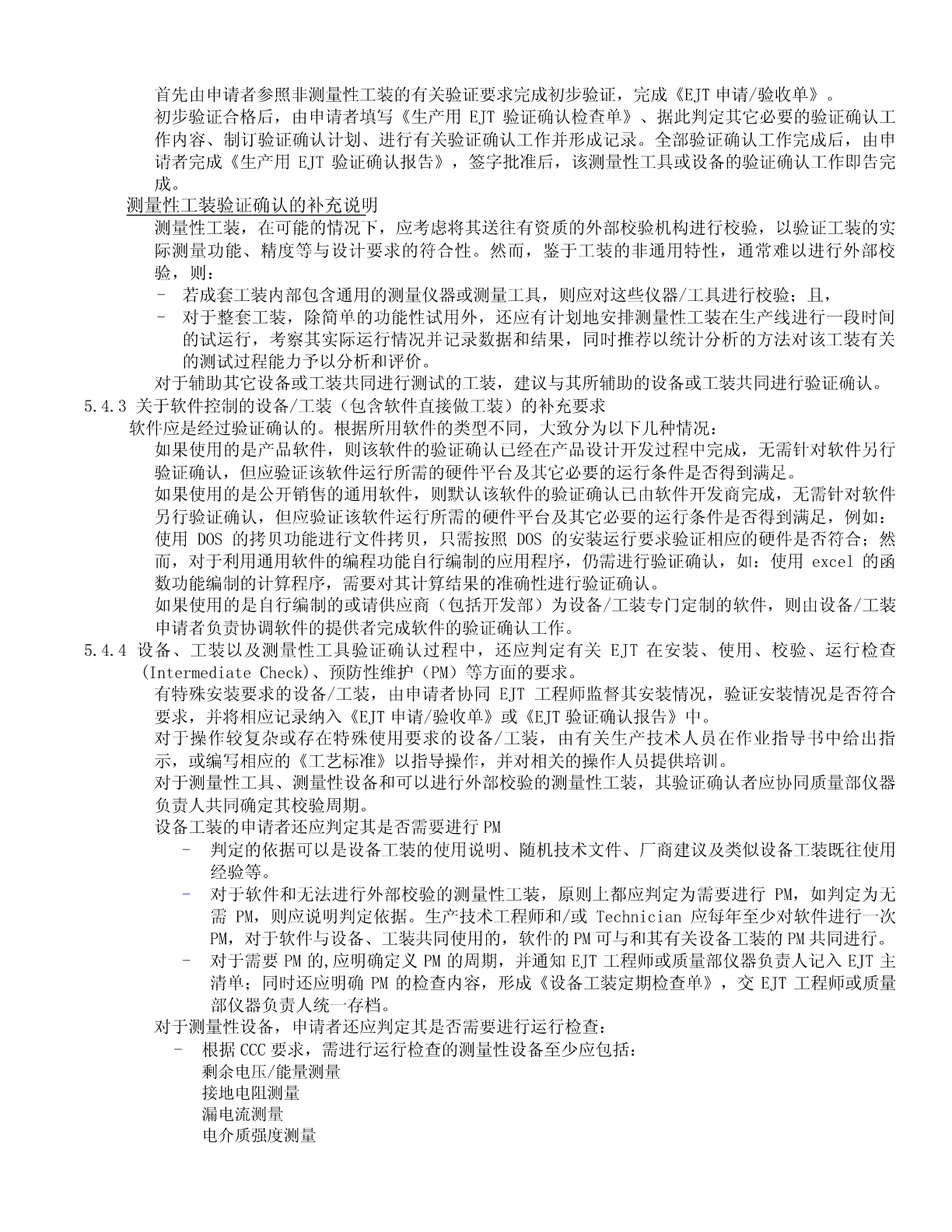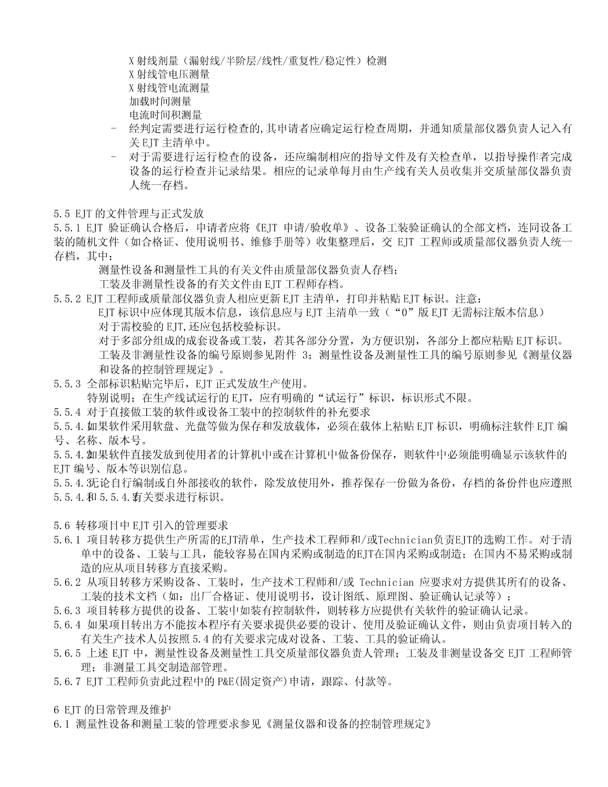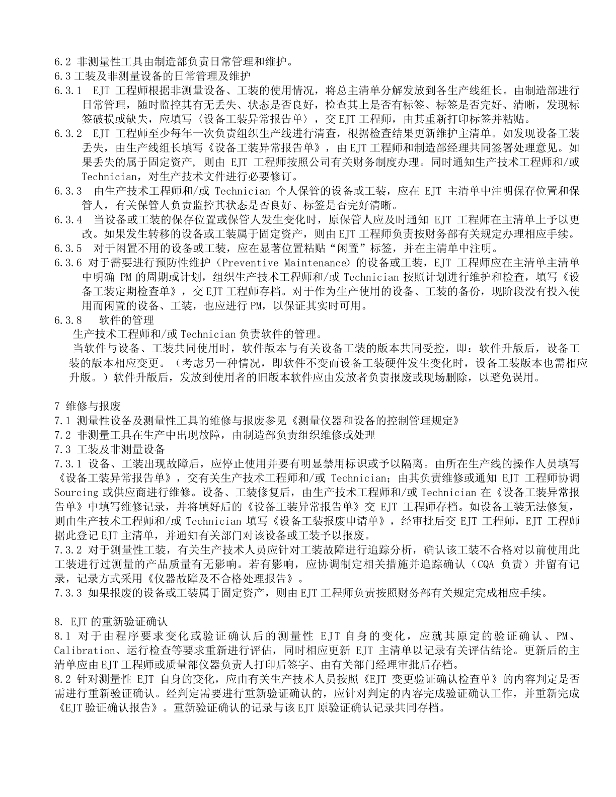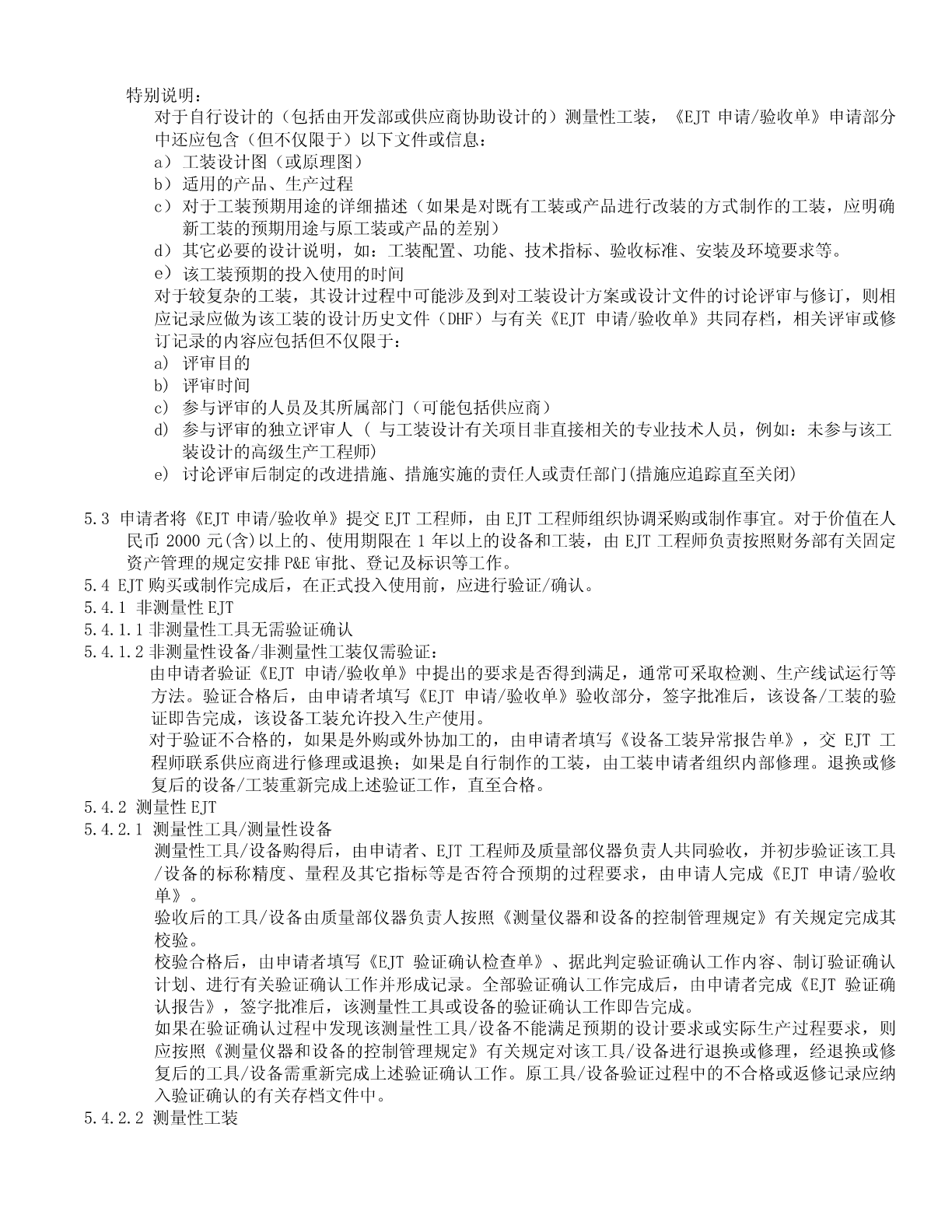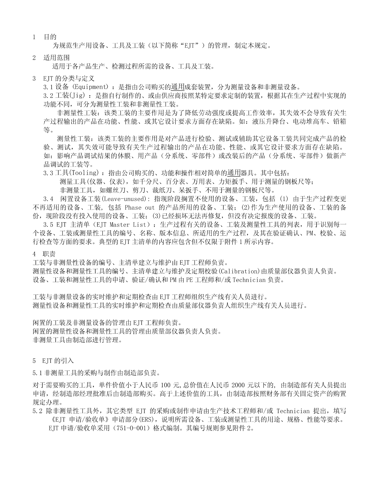 1目的为规范生产用设备、工具及工装(以下简称“EJT”)的管理,制定本规定。2适用范围适用于各产品生产、检测过程所需的设备、工具及工装。3EJT的分类与定义3.1设备(Equipment):是指由公司购买的通用成套装置,分为测量设备和非测量设备。3.2工装(Jig):是指自行制作的、或由供应商按照某特定要求定制的装置,根据其在生产过程中实现的功能不同,可分为测量性工装和非测量性工装。非测量性工装:该类工装的主要作用是为了降低劳动强度或提高工作效率,其失效不会导致有关生产过程输出的产品在功能、性能、或其它设计要求方面存在缺陷。如:液压升降台、电动堆高车、铅箱等。测量性工装:该类工装的主要作用是对产品进行检验、测试或辅助其它设备工装共同完成产品的检验、测试,其失效可能导致有关生产过程输出的产品在功能、性能、或其它设计要求方面存在缺陷。如:影响产品调试结果的体膜、用产品(分系统、零部件)或改装后的产品(分系统、零部件)做新产品调试的工装等。3.3工具(Tooling):指由公司购买的、功能和操作相对简单的通用器具。其中包括:测量工具(仪器、仪表),如千分尺、百分表、万用表、力矩扳手、用于测量的钢板尺等;非测量工具,如螺丝刀、剪刀、裁纸刀、呆扳手、不用于测量的钢板尺等。3.4闲置设备工装(Leave-unused):指现阶段搁置不使用的设备、工装,包括(1)由于生产过程变更不再适用的设备、工装,包括Phaseout的产品所用的设备、工装;(2)作为生产使用的设备、工装的备份,现阶段没有投入使用的设备、工装;(3)已经损坏无法再修复,但没有决定报废的设备、工装。3.5EJT主清单(EJTMasterList):生产过程有关的设备、工装及测量性工具的列表,用于识别每一个设备、工装或测量性工具的编号、名称、版本信息、所适用的生产过程,及其在验证确认、PM、校验、运行检查等方面的要求。典型的EJT主清单的内容应包含但不仅限于附件1所示内容。4职责工装与非测量性设备的编号、主清单建立与维护由EJT工程师负责。测量性设备和测量性工具的编号、主清单建立与维护及定期校验(Calibration)由质量部仪器负责人负责。设备、工装和测量性工具的申请、验证/确认和PM由PE工程师和/或Technician负责。工装与非测量设备的实时维护和定期检查由EJT工程师组织生产线有关人员进行。测量性设备和测量性工具的实时维护和定期检查由质量部仪器负责人组织生产线有关人员进行。闲置的工装及非测量设备的管理由EJT工程师负责。闲置的测量性设备和测量性工具的管理由质量部仪器负责人负责。非测量工具由制造部进行管理。5EJT的引入5.1非测量工具的采购与制作由制造部负责。对于需要购买的工具,单件价值小于人民币100元,总价值在人民币2000元以下的,由制造部有关人员提出申请,经制造部经理批准后由制造部购买。高于上述价值的工具,由制造部按照财务部有关固定资产的购置规定办理。5.2除非测量性工具外,其它类型EJT的采购或制作申请由生产技术工程师和/或Technician提出,填写《EJT申请/验收单》申请部分(ERS),说明所需设备、工装或测量性工具的用途、规格、性能等要求。EJT申请/验收单采用(751-O-001)格式编制。其编号规则参见附件2。特别说明:▪对于自行设计的(包括由开发部或供应商协助设计的)测量性工装,《EJT申请/验收单》申请部分中还应包含(但不仅限于)以下文件或信息:a)工装设计图(或原理图)b)适用的产品、生产过程c)对于工装预期用途的详细描述(如果是对既有工装或产品进行改装的方式制作的工装,应明确新工装的预期用途与原工装或产品的差别)d)其它必要的设计说明,如:工装配置、功能、技术指标、验收标准、安装及环境要求等。e)该工装预期的投入使用的时间▪对于较复杂的工装,其设计过程中可能涉及到对工装设计方案或设计文件的讨论评审与修订,则相应记录应做为该工装的设计历史文件(DHF)与有关《EJT申请/验收单》共同存档,相关评审或修订记录的内容应包括但不仅限于:a)评审目的b)评审时间c)参与评审的人员及其所属部门(可能包括供应商)d)参与评审的独立评审人(与工装设计有关项目非直接相关的专业技术人员,例如:未参与该工装设计的高级生产工程师)e)讨论评审后制定的改进措施、措施实施的责任人或责任部门(措施应追踪直至关闭)5.3申请者将《EJT申请/验收单》提交EJT工程师,由EJT工程师组织协调采购或制作事宜。对于价值在人民币2000元(含)以上的、使用期限在1年以上的设备和工装,由EJT工程师负责按照财务部有关固定资产管理的规定安排P&E审批、登记及标识等工作。5.4EJT购买或制作完成后,在正式投入使用前,应进行验证/确认。5.4.1非测量性EJT5.4.1.1非
