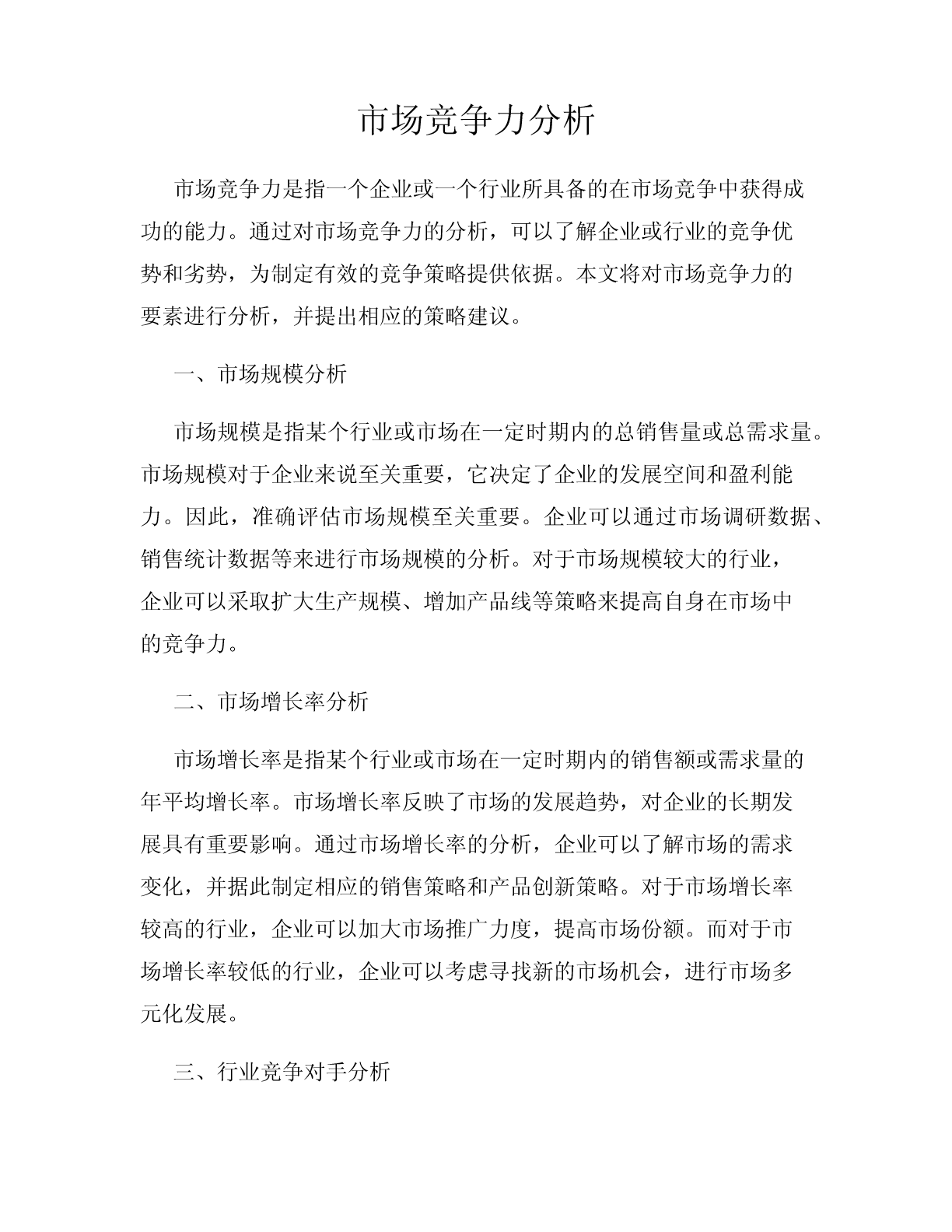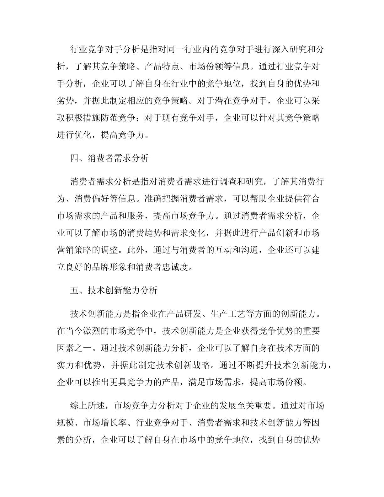市场竞争力分析市场竞争力是指一个企业或一个行业所具备的在市场竞争中获得成功的能力。通过对市场竞争力的分析,可以了解企业或行业的竞争优势和劣势,为制定有效的竞争策略提供依据。本文将对市场竞争力的要素进行分析,并提出相应的策略建议。一、市场规模分析市场规模是指某个行业或市场在一定时期内的总销售量或总需求量。市场规模对于企业来说至关重要,它决定了企业的发展空间和盈利能力。因此,准确评估市场规模至关重要。企业可以通过市场调研数据、销售统计数据等来进行市场规模的分析。对于市场规模较大的行业,企业可以采取扩大生产规模、增加产品线等策略来提高自身在市场中的竞争力。二、市场增长率分析市场增长率是指某个行业或市场在一定时期内的销售额或需求量的年平均增长率。市场增长率反映了市场的发展趋势,对企业的长期发展具有重要影响。通过市场增长率的分析,企业可以了解市场的需求变化,并据此制定相应的销售策略和产品创新策略。对于市场增长率较高的行业,企业可以加大市场推广力度,提高市场份额。而对于市场增长率较低的行业,企业可以考虑寻找新的市场机会,进行市场多元化发展。三、行业竞争对手分析行业竞争对手分析是指对同一行业内的竞争对手进行深入研究和分析,了解其竞争策略、产品特点、市场份额等信息。通过行业竞争对手分析,企业可以了解自身在行业中的竞争地位,找到自身的优势和劣势,并据此制定相应的竞争策略。对于潜在竞争对手,企业可以采取积极措施防范竞争;对于现有竞争对手,企业可以针对其竞争策略进行优化,提高竞争力。四、消费者需求分析消费者需求分析是指对消费者需求进行调查和研究,了解其消费行为、消费偏好等信息。准确把握消费者需求,可以帮助企业提供符合市场需求的产品和服务,提高市场竞争力。通过消费者需求分析,企业可以了解市场的消费趋势和需求变化,并据此进行产品创新和市场营销策略的调整。此外,通过与消费者的互动和沟通,企业还可以建立良好的品牌形象和消费者忠诚度。五、技术创新能力分析技术创新能力是指企业在产品研发、生产工艺等方面的创新能力。在当今激烈的市场竞争中,技术创新能力是企业获得竞争优势的重要因素之一。通过技术创新能力分析,企业可以了解自身在技术方面的实力和优势,并据此制定技术创新战略。通过不断提升技术创新能力,企业可以推出更具竞争力的产品,满足市场需求,提高市场份额。综上所述,市场竞争力分析对于企业的发展至关重要。通过对市场规模、市场增长率、行业竞争对手、消费者需求和技术创新能力等因素的分析,企业可以了解自身在市场中的竞争地位,找到自身的优势和劣势,并制定相应的竞争策略。只有不断提高市场竞争力,企业才能在激烈的市场竞争中立于不败之地。