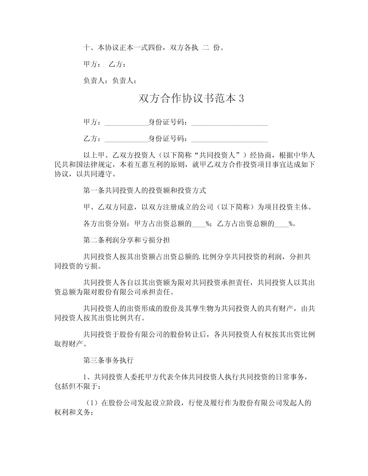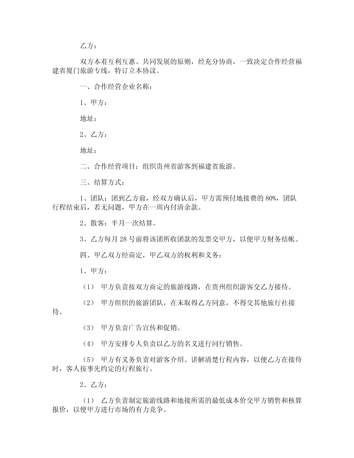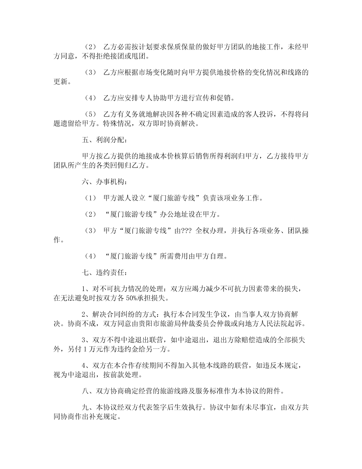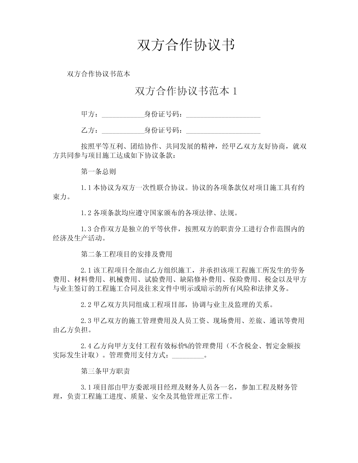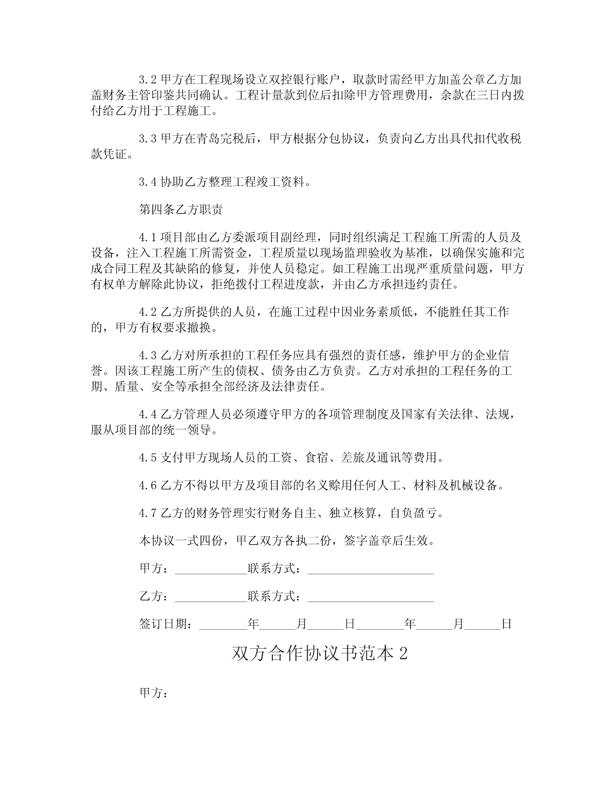 双方合作协议书双方合作协议书范本双方合作协议书范本1甲方:____________身份证号码:_____________________乙方:____________身份证号码:_____________________按照平等互利、团结协作、共同发展的精神,经甲乙双方友好协商,就双方共同参与项目施工达成如下协议条款:第一条总则1.1本协议为双方一次性联合协议。协议的各项条款仅对项目施工具有约束力。1.2各项条款均应遵守国家颁布的各项法律、法规。1.3合作双方是独立的平等伙伴,按照双方的职责分工进行合作范围内的经济及生产活动。第二条工程项目的安排及费用2.1该工程项目全部由乙方组织施工,并承担该项工程施工所发生的劳务费用、材料费用、机械费用、试验费用、缺陷修补费用、保险费用、税金以及甲方与业主签订的工程施工合同及往来文件中明示或暗示的所有风险和法律义务。2.2甲乙双方共同组成工程项目部,协调与业主及监理的关系。2.3甲乙双方的施工管理费用及人员工资、现场费用、差旅、通讯等费用由乙方负担。2.4乙方向甲方支付工程有效标价%的管理费用(不含税金、暂定金额按实际发生计取)。管理费用支付方式:_________。第三条甲方职责3.1项目部由甲方委派项目经理及财务人员各一名,参加工程及财务管理,负责工程施工进度、质量、安全及其他管理正常工作。3.2甲方在工程现场设立双控银行账户,取款时需经甲方加盖公章乙方加盖财务主管印鉴共同确认。工程计量款到位后扣除甲方管理费用,余款在三日内拨付给乙方用于工程施工。3.3甲方在青岛完税后,甲方根据分包协议,负责向乙方出具代扣代收税款凭证。3.4协助乙方整理工程竣工资料。第四条乙方职责4.1项目部由乙方委派项目副经理,同时组织满足工程施工所需的人员及设备,注入工程施工所需资金,工程质量以现场监理验收为基准,以确保实施和完成合同工程及其缺陷的修复,并使人员稳定。如工程施工出现严重质量问题,甲方有权单方解除此协议,拒绝拨付工程进度款,并由乙方承担违约责任。4.2乙方所提供的人员,在施工过程中因业务素质低,不能胜任其工作的,甲方有权要求撤换。4.3乙方对所承担的工程任务应具有强烈的责任感,维护甲方的企业信誉。因该工程施工所产生的债权、债务由乙方负责。乙方对承担的工程任务的工期、盾量、安全等承担全部经济及法律责任。4.4乙方管理人员必须遵守甲方的各项管理制度及国家有关法律、法规,服从项目部的统一领导。4.5支付甲方现场人员的工资、食宿、差旅及通讯等费用。4.6乙方不得以甲方及项目部的名义赊用任何人工、材料及机械设备。4.7乙方的财务管理实行财务自主、独立核算,自负盈亏。本协议一式四份,甲乙双方各执二份,签字盖章后生效。甲方:____________联系方式:_____________________乙方:____________联系方式:_____________________签订日期:________年______月______日________年______月______日双方合作协议书范本2甲方:乙方:双方本着互利互惠、共同发展的原则,经充分协商,一致决定合作经营福建省厦门旅游专线,特订立本协议。一、合作经营企业名称:1、甲方:地址:2、乙方:地址:二、合作经营项目:组织贵州省游客到福建省旅游。三、结算方式:1、团队:团到乙方前,经双方确认后,甲方需预付地接费的80%,团队行程结束后,若无问题,甲方在一周内付清余款。2、散客:半月一次结算。3、乙方每月28号前将该团所收团款的发票交甲方,以便甲方财务结帐。四、甲乙双方经商定,甲乙双方的权利和义务:1、甲方:(1)甲方负责按双方商定的旅游线路,在贵州组织游客交乙方接待。(2)甲方组织的旅游团队,在未取得乙方同意,不得交其他旅行社接待。(3)甲方负责广告宣传和促销。(4)甲方安排专人负责以乙方的名义进行同行销售。(5)甲方有义务负责对游客介绍、讲解清楚行程内容,以便乙方在接待时,客人按事先约定的行程旅行。2、乙方:(1)乙方负责制定旅游线路和地接所需的最低成本价交甲方销售和核算报价,以便甲方进行市场的有力竞争。(2)乙方必需按计划要求保质保量的做好甲方团队的地接工作,未经甲方同意,不得拒绝接团或甩团。(3)乙方应根据市场变化随时向甲方提供地接价格的变化情况和线路的更新。(4)乙方应安排专人协助甲方进行宣传和促销。(5)乙方有义务就地解决因各种不确定因素造成的客人投诉,不得将问题遗留给甲方。特殊情况,双方即时协商解决。五、利润分配:甲方按乙方提供的地接成本价核算后销售所得利润归甲方,乙方接待甲方团队所产生的各类回佣归乙方。六、办事机构:(1)甲方派人设立“厦门旅游专线”负责该项业务工作。(2)“厦门旅游专线”办公地址设在甲方。(3)甲方“厦门旅游专线”由???全