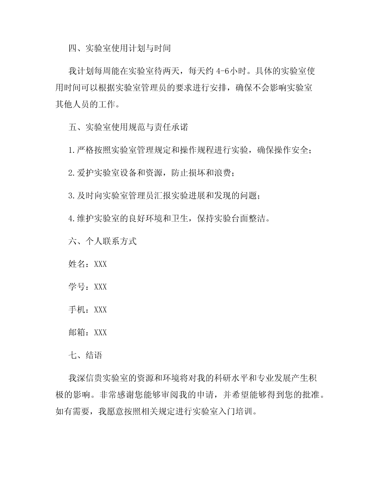 申请书格式范文(共7篇)1.申请书例句:请求实验室使用权限尊敬的实验室管理员:我是一名大学生,本科生在读。我对实验室科研领域有浓厚的兴趣,并希望能够利用实验室设备和资源进行学习与实践。因此,我特此向贵实验室提交实验室使用权限的申请。二、个人背景介绍我来自XX大学XX专业,目前正处于大学四年级阶段。我在专业课程中取得了较为优秀的成绩,对实验室科研工作有着浓厚的兴趣和热情。在大学期间,我积极参加各类科研讨论会和实践活动,提升自己的实验设计和数据分析能力。我也在辅修专业方面有一定的积累,掌握了部分相关实验技术操作和实验报告撰写能力。三、实验室使用意向与目的我希望能够申请使用贵实验室的XXX设备,以提升自己的科研能力并拓宽专业知识面。具体的使用意向如下:1.开展与我的毕业设计相关的实验,探究XXX现象;2.熟悉XXX设备的使用方法,并学习相关实验操作技巧;3.参与导师指导的课题研究,协助完成实验和数据收集工作;4.参与实验室举办的科研项目和学术讲座,拓宽学术视野。四、实验室使用计划与时间我计划每周能在实验室待两天,每天约4-6小时。具体的实验室使用时间可以根据实验室管理员的要求进行安排,确保不会影响实验室其他人员的工作。五、实验室使用规范与责任承诺1.严格按照实验室管理规定和操作规程进行实验,确保操作安全;2.爱护实验室设备和资源,防止损坏和浪费;3.及时向实验室管理员汇报实验进展和发现的问题;4.维护实验室的良好环境和卫生,保持实验台面整洁。六、个人联系方式姓名:XXX学号:XXX手机:XXX邮箱:XXX七、结语我深信贵实验室的资源和环境将对我的科研水平和专业发展产生积极的影响。非常感谢您能够审阅我的申请,并希望能够得到您的批准。如有需要,我愿意按照相关规定进行实验室入门培训。衷心期待您的回复。谢谢!申请人:XXX