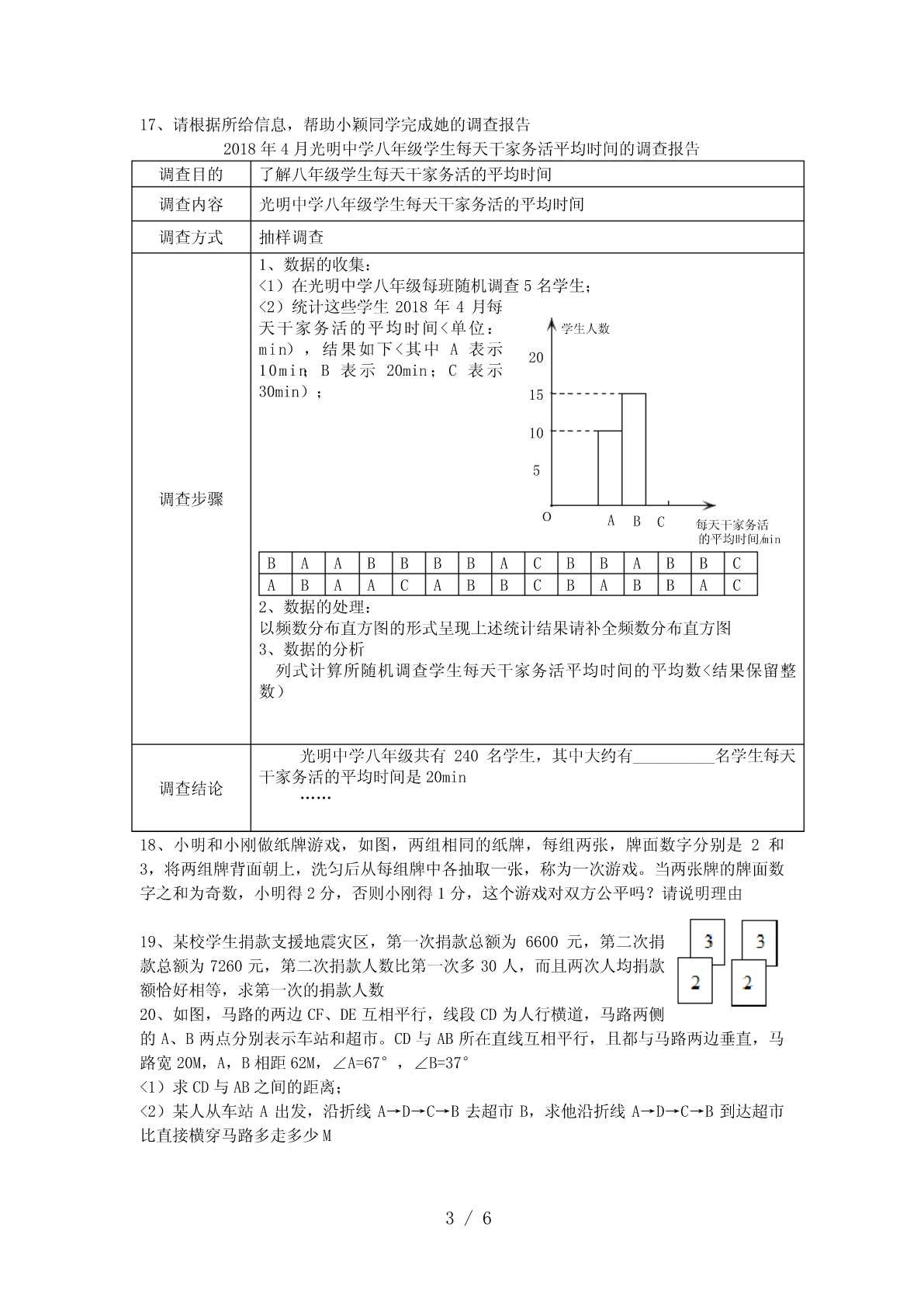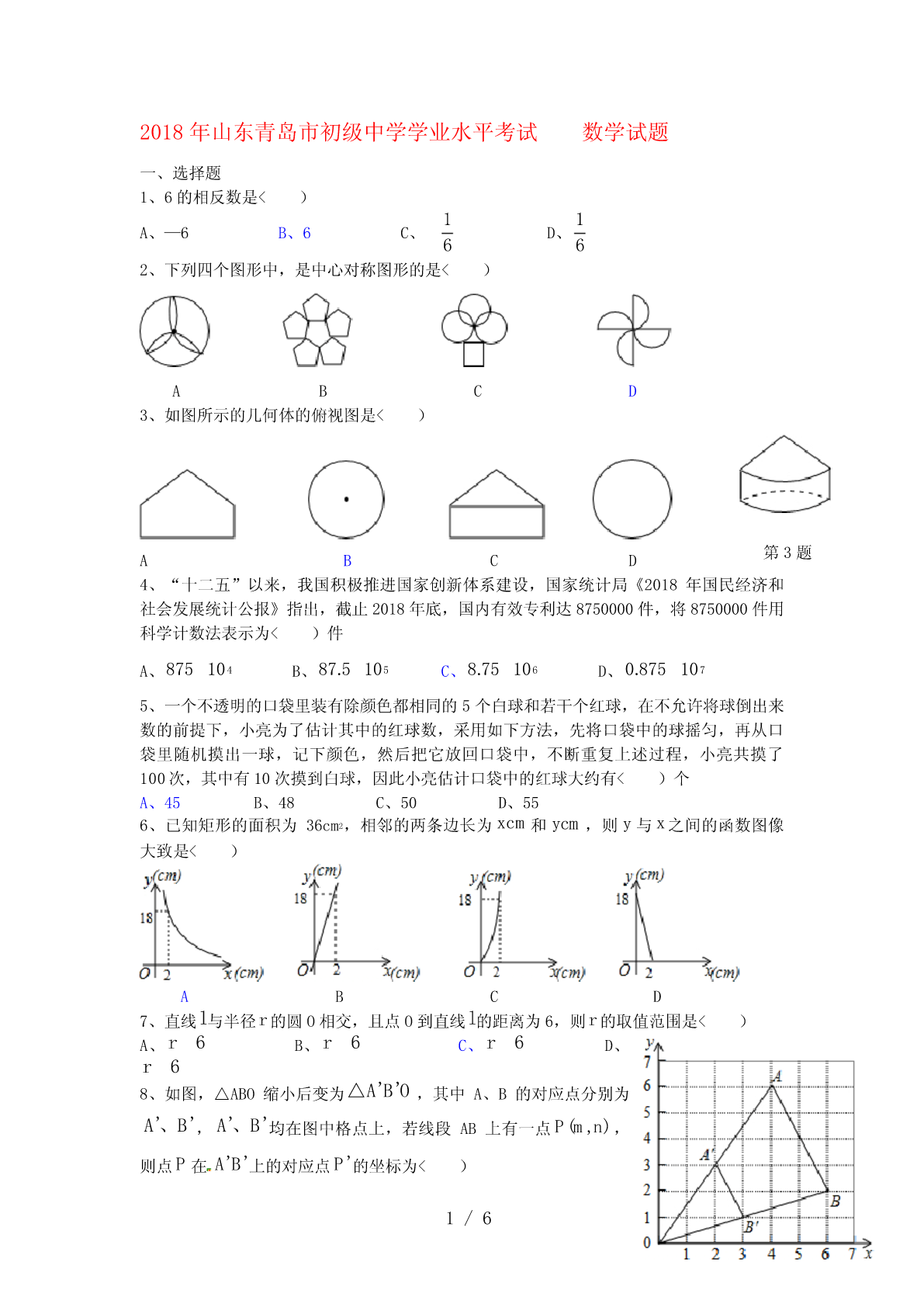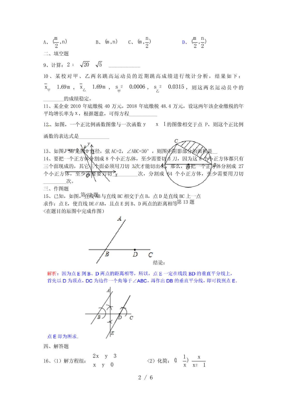 2018年山东青岛市初级中学学业水平考试数学试题一、选择题1、6的相反数是<)11A、—6B、6C、D、662、下列四个图形中,是中心对称图形的是<)ABCD3、如图所示的几何体的俯视图是<)第3题ABCD4、“十二五”以来,我国积极推进国家创新体系建设,国家统计局《2018年国民经济和社会发展统计公报》指出,截止2018年底,国内有效专利达8750000件,将8750000件用科学计数法表示为<)件A、875104B、87.5105C、8.75106D、0.8751075、一个不透明的口袋里装有除颜色都相同的5个白球和若干个红球,在不允许将球倒出来数的前提下,小亮为了估计其中的红球数,采用如下方法,先将口袋中的球摇匀,再从口袋里随机摸出一球,记下颜色,然后把它放回口袋中,不断重复上述过程,小亮共摸了100次,其中有10次摸到白球,因此小亮估计口袋中的红球大约有<)个A、45B、48C、50D、556、已知矩形的面积为36cm2,相邻的两条边长为xcm和ycm,则y与x之间的函数图像大致是<)ABCD7、直线l与半径r的圆O相交,且点O到直线l的距离为6,则r的取值范围是<)A、r6B、r6C、r6D、r68、如图,△ABO缩小后变为△A'B'O,其中A、B的对应点分别为A'、B',A'、B'均在图中格点上,若线段AB上有一点P(m,n),则点P在A'B'上的对应点P'的坐标为<)1/6mnmnA、(,n)B、(m,n)C、(m,)D、(,)2222二、填空题9、计算:21205___________10、某校对甲、乙两名跳高运动员的近期跳高成绩进行统计分析,结果如下:x1.69m,x1.69m,s20.0006,s20.0315,则这两名运动员中的甲乙甲乙________的成绩稳定。11、某企业2010年底缴税40万元,2018年底缴税48.4万元,设这两年该企业缴税的年平均增长率为x,根据题意,可得方程___________12、如图,一个正比例函数图像与一次函数yx1的图像相交于点P,则这个正比例函数的表达式是____________13、如图,AB是圆0直径,弦AC=2,∠ABC=30°,则图中阴影部分的面积是__14、要把一个正方体分割成8个小正方体,至少需要切3刀,因为这8个小正方体都只有三个面现成的,其它三个面必须用刀切3次才能切出来,那么,要把一个正方体分割成27个小正方体,至少需要要刀切__________次,分割成64个小正方体,至少需要用刀切_________次。三、作图题15、已知,如图,直第12线题AB与直线BC相交于点B,点D是直线BC上一点求作:点E,使直线DE∥AB,且点E到B、D两点的距离相等第13题<在题目的原图中完成作图)结论:四、解答题2xy31x16、<1)解方程组:<2)化简:(1)xy0xx212/617、请根据所给信息,帮助小颖同学完成她的调查报告2018年4月光明中学八年级学生每天干家务活平均时间的调查报告调查目的了解八年级学生每天干家务活的平均时间调查内容光明中学八年级学生每天干家务活的平均时间调查方式抽样调查1、数据的收集:<1)在光明中学八年级每班随机调查5名学生;<2)统计这些学生2018年4月每天干家务活的平均时间<单位:学生人数min),结果如下<其中A表示2010min;B表示20min;C表示30min);15105调查步骤oABC每天干家务活的平均时间/minBAABBBBACBBABBCABAACABBCBABBAC2、数据的处理:以频数分布直方图的形式呈现上述统计结果请补全频数分布直方图3、数据的分析列式计算所随机调查学生每天干家务活平均时间的平均数<结果保留整数)光明中学八年级共有240名学生,其中大约有__________名学生每天干家务活的平均时间是20min调查结论……18、小明和小刚做纸牌游戏,如图,两组相同的纸牌,每组两张,牌面数字分别是2和3,将两组牌背面朝上,洗匀后从每组牌中各抽取一张,称为一次游戏。当两张牌的牌面数字之和为奇数,小明得2分,否则小刚得1分,这个游戏对双方公平吗?请说明理由19、某校学生捐款支援地震灾区,第一次捐款总额为6600元,第二次捐款总额为7260元,第二次捐款人数比第一次多30人,而且两次人均捐款额恰好相等,求第一次的捐款人数20、如图,马路的两边CF、DE互相平行,线段CD为人行横道,马路两侧的A、B两点分别表示车站和超市。CD与AB所在直线互相平行,且都与马路两边垂直,马路宽20M,A,B相距62M,∠A=67°,∠B=37°<1)求CD与AB之间的距离;<2)某人从车站A出发,沿折线A→D→C→B去超市B,求他沿折线A→D→C→B到达超市比直接横穿马